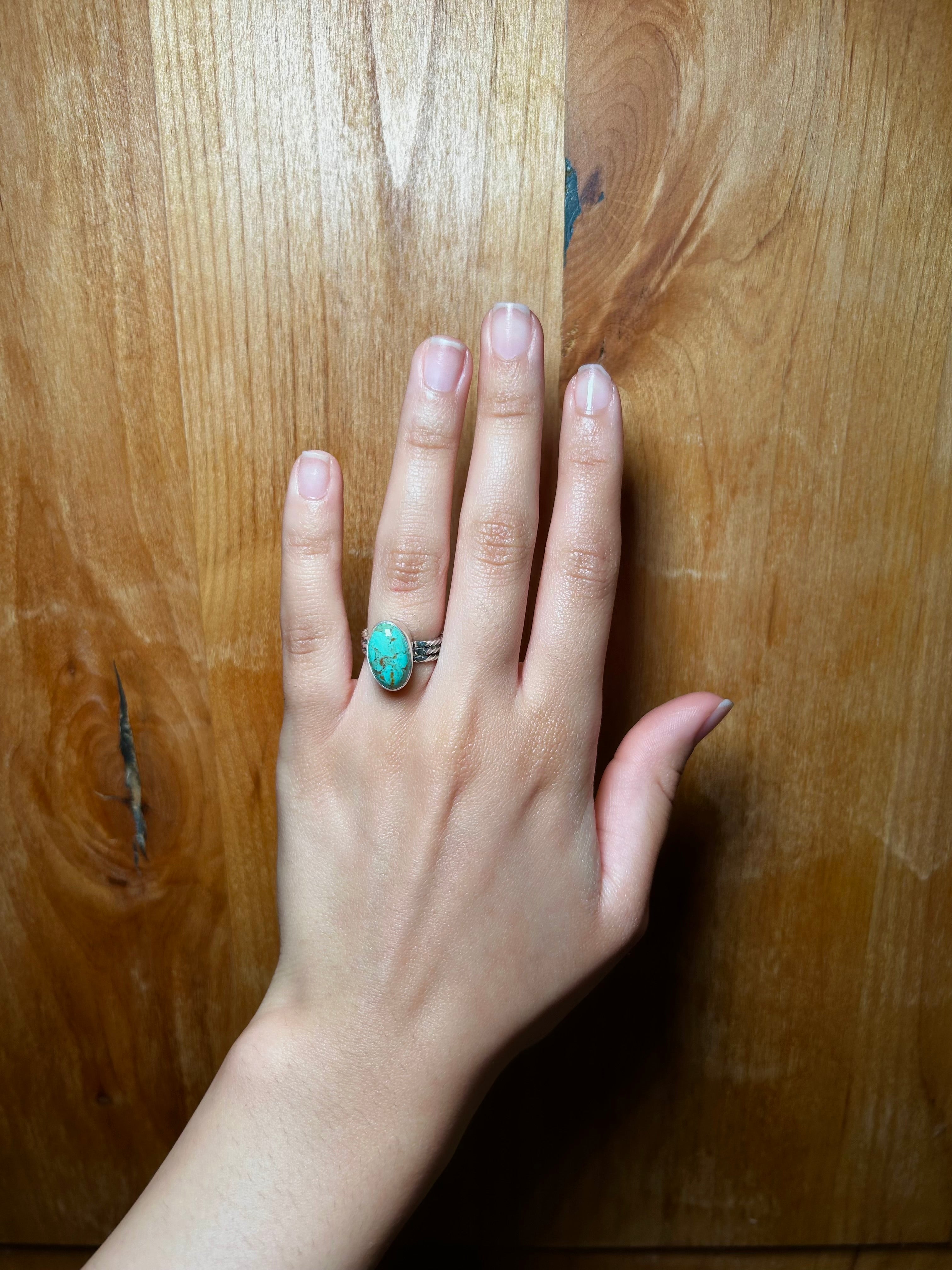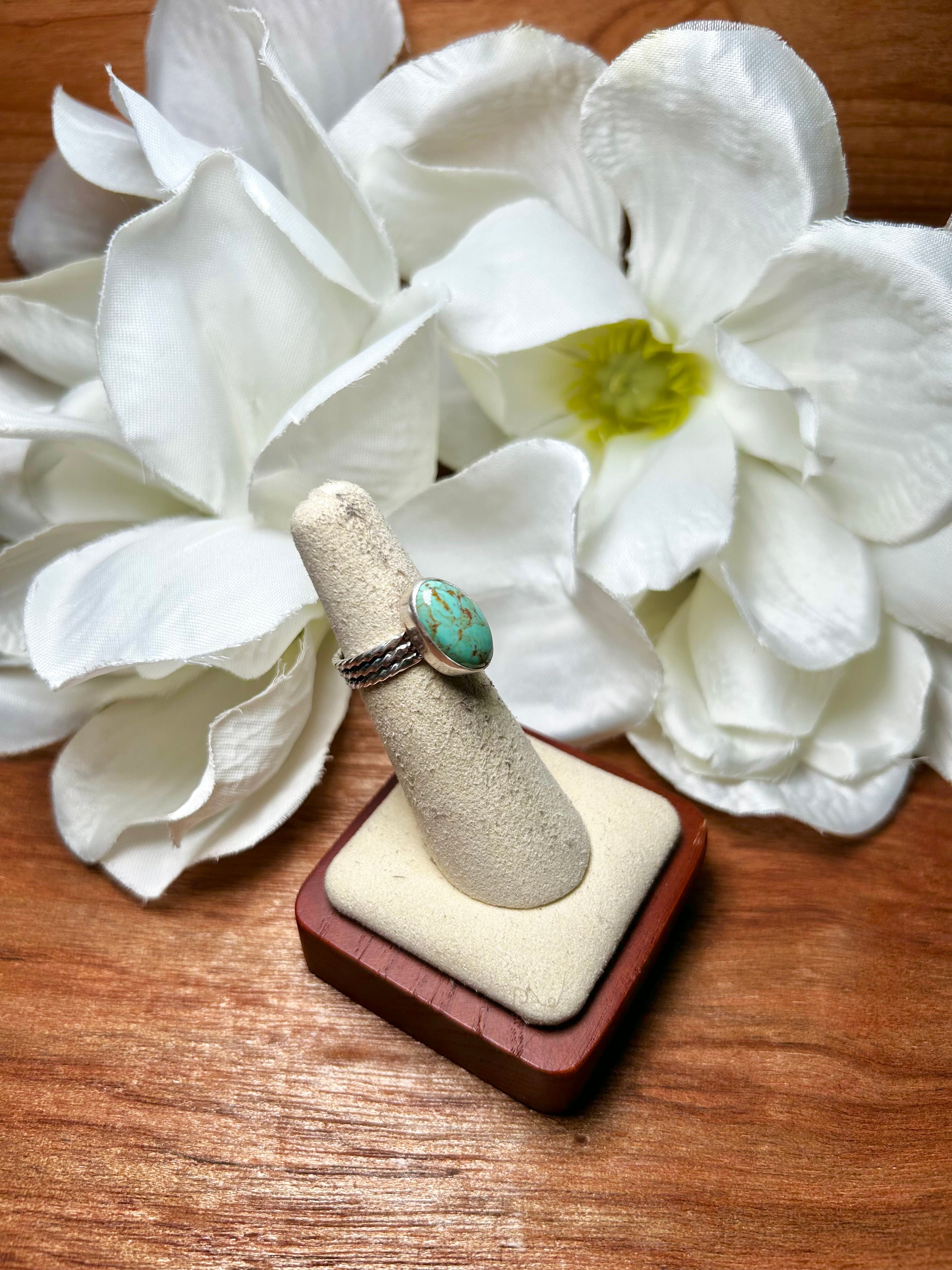 Navajo Made Green Turquoise & Sterling Silver Cluster Ring Size 4.5. It measures 5/8 of an inch long and it measures 3/8 of an inch wide. Signed by the artist and stamped sterling silver.