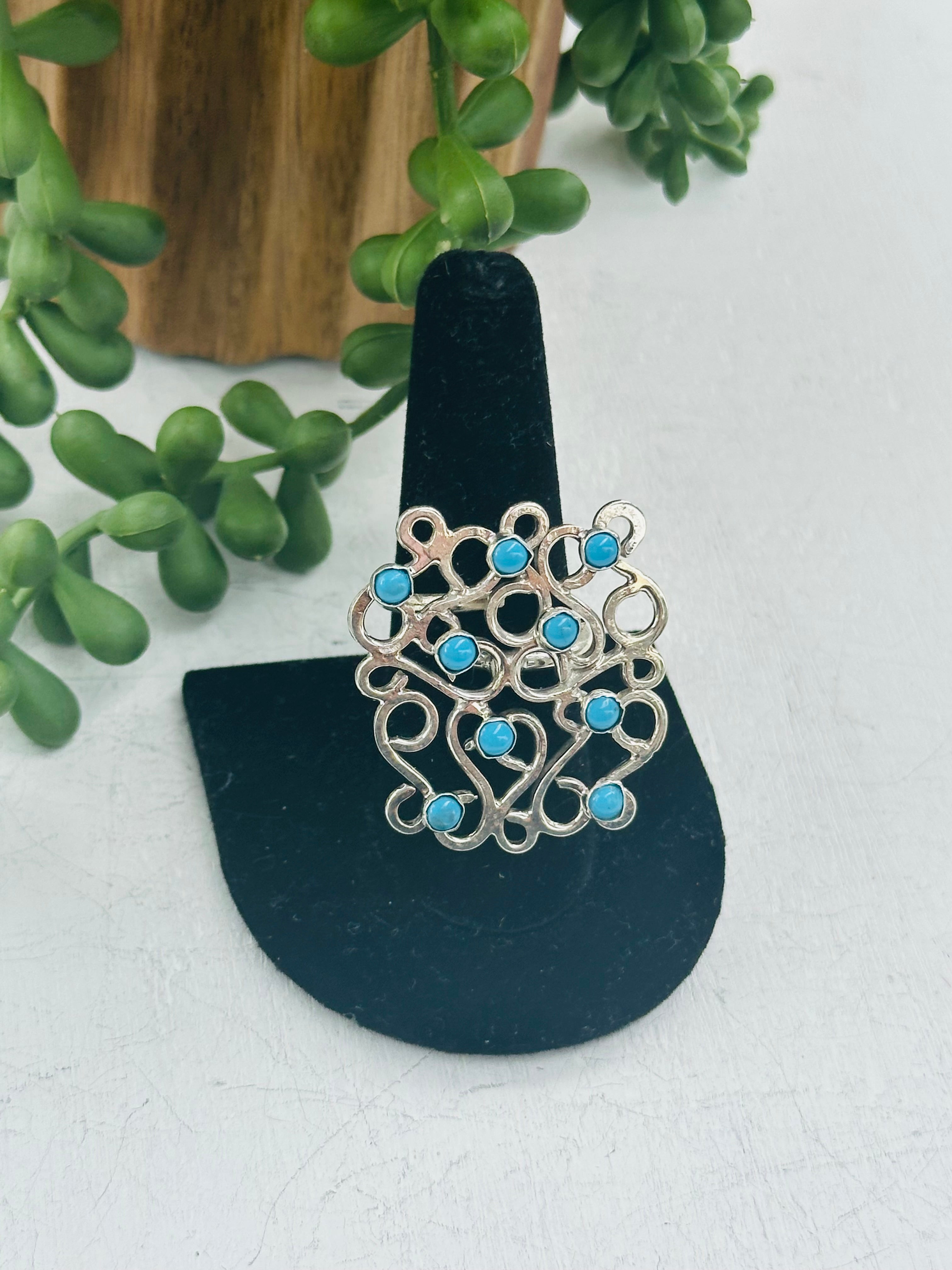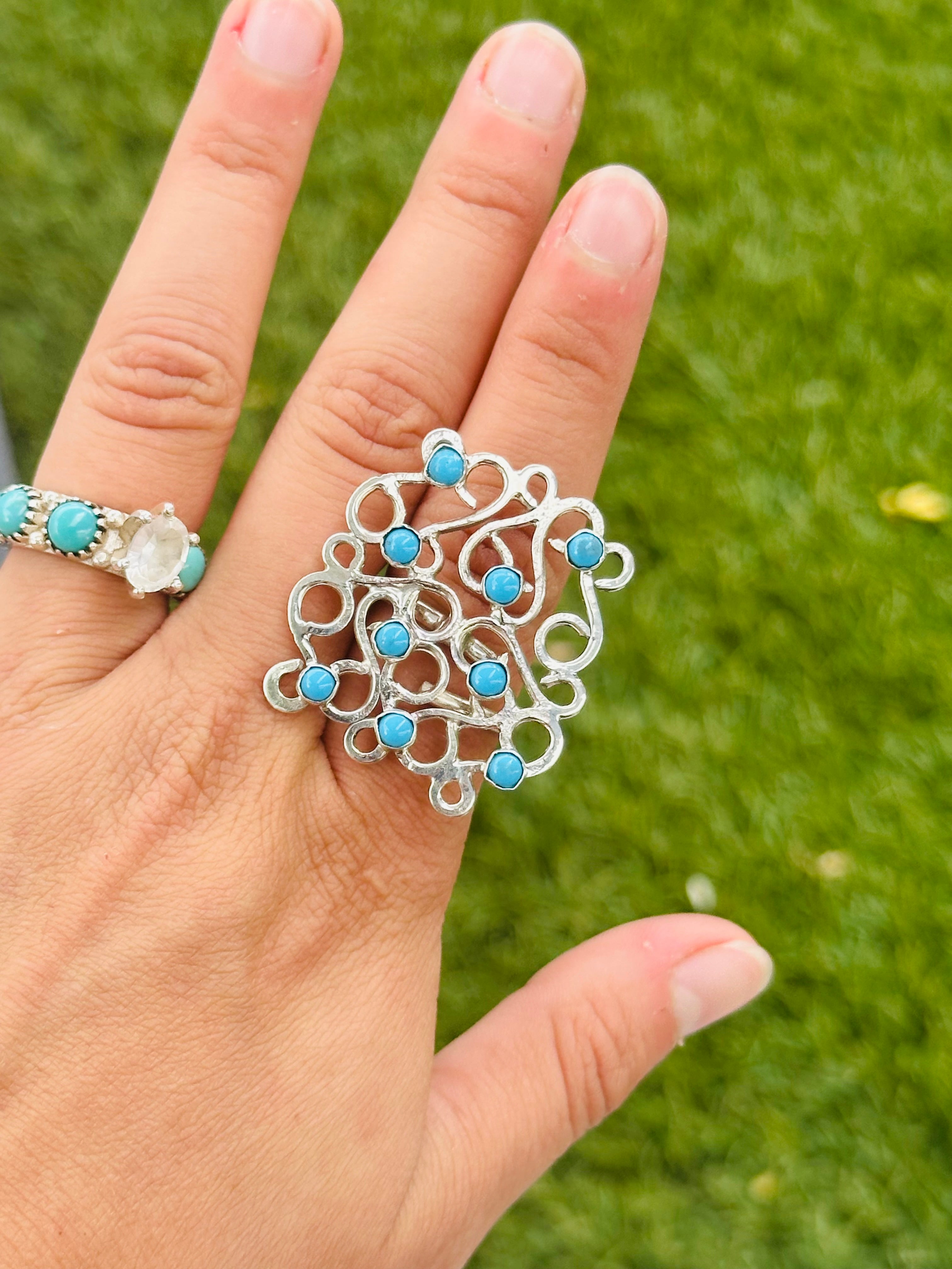 Navajo Made Kingman Turquoise & Sterling Silver Adjustable Ring. It measures 1 1/2 inches long and 1 1/4 inches wide.