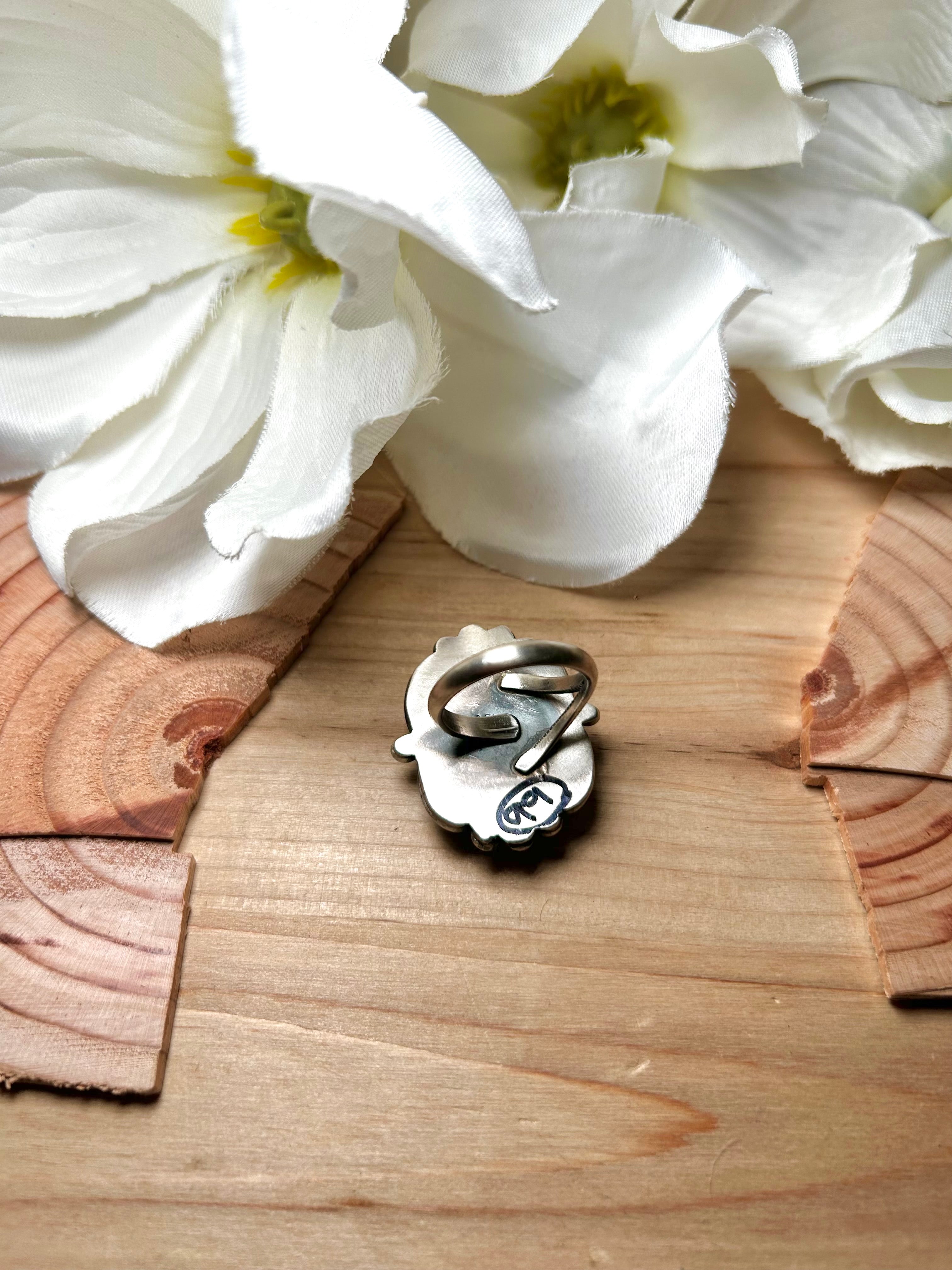 Navajo Made Sonoran Mountain Turquoise & Sterling Silver Adjustable Ring. It measures 1 1/4 inches long and 1 1/8 inches wide. Signed by the artist and stamped sterling silver.