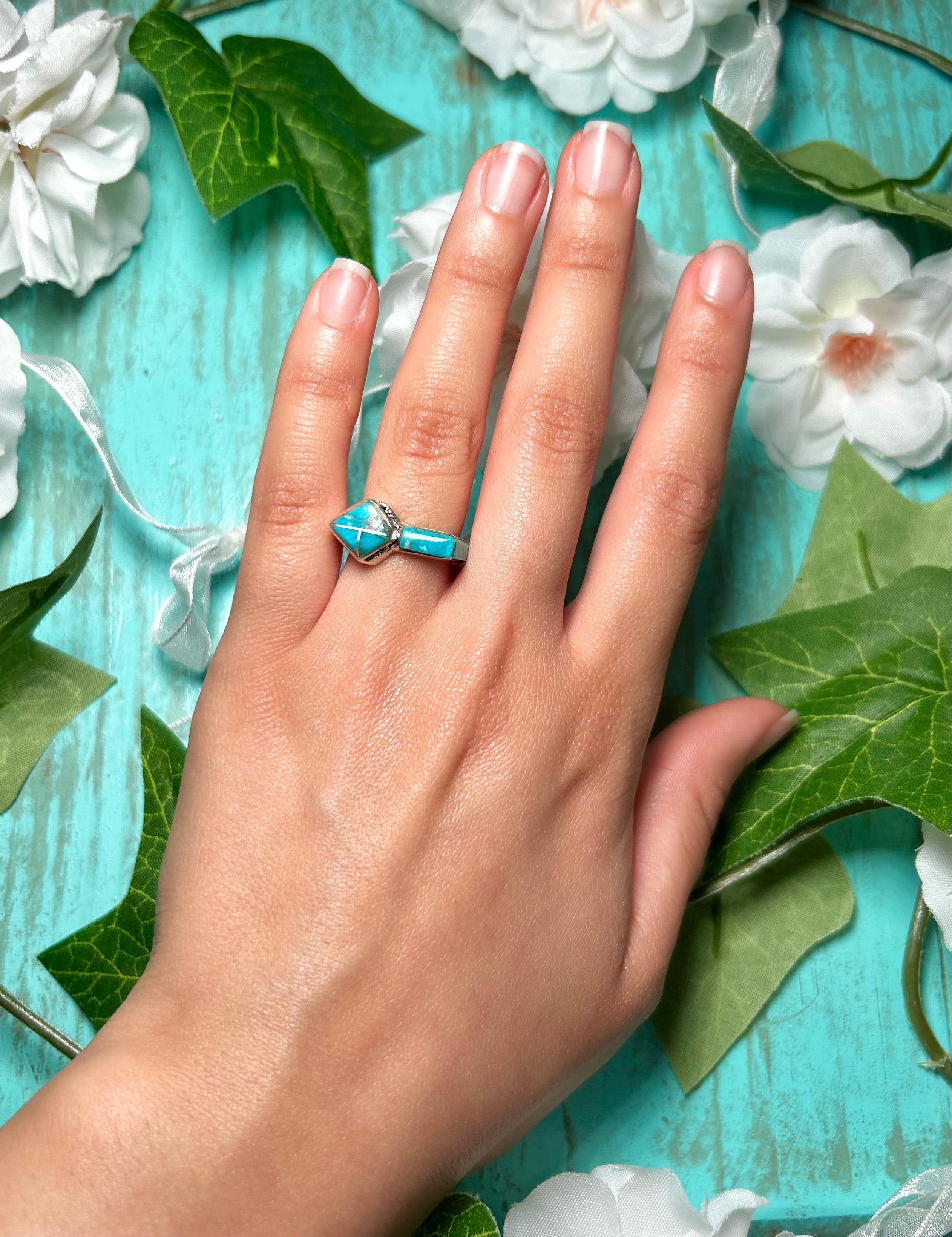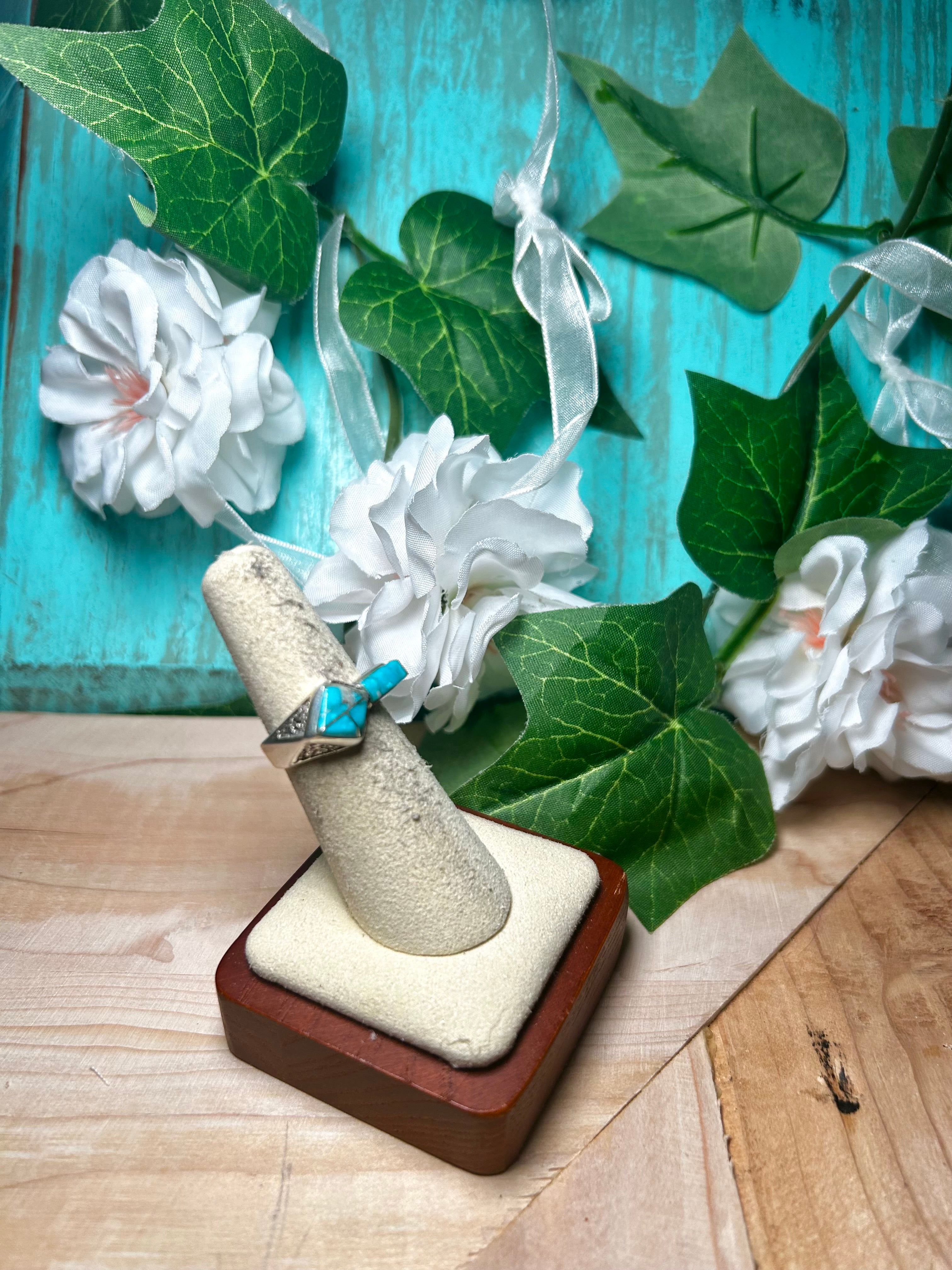 Navajo Made Kingman Turquoise & Sterling Silver Ring Size 5.5. It measures 3/8 of an inch long and 3/4 of an inch wide. Stamped sterling silver and signed. Stones will differ due to natural stones.d
