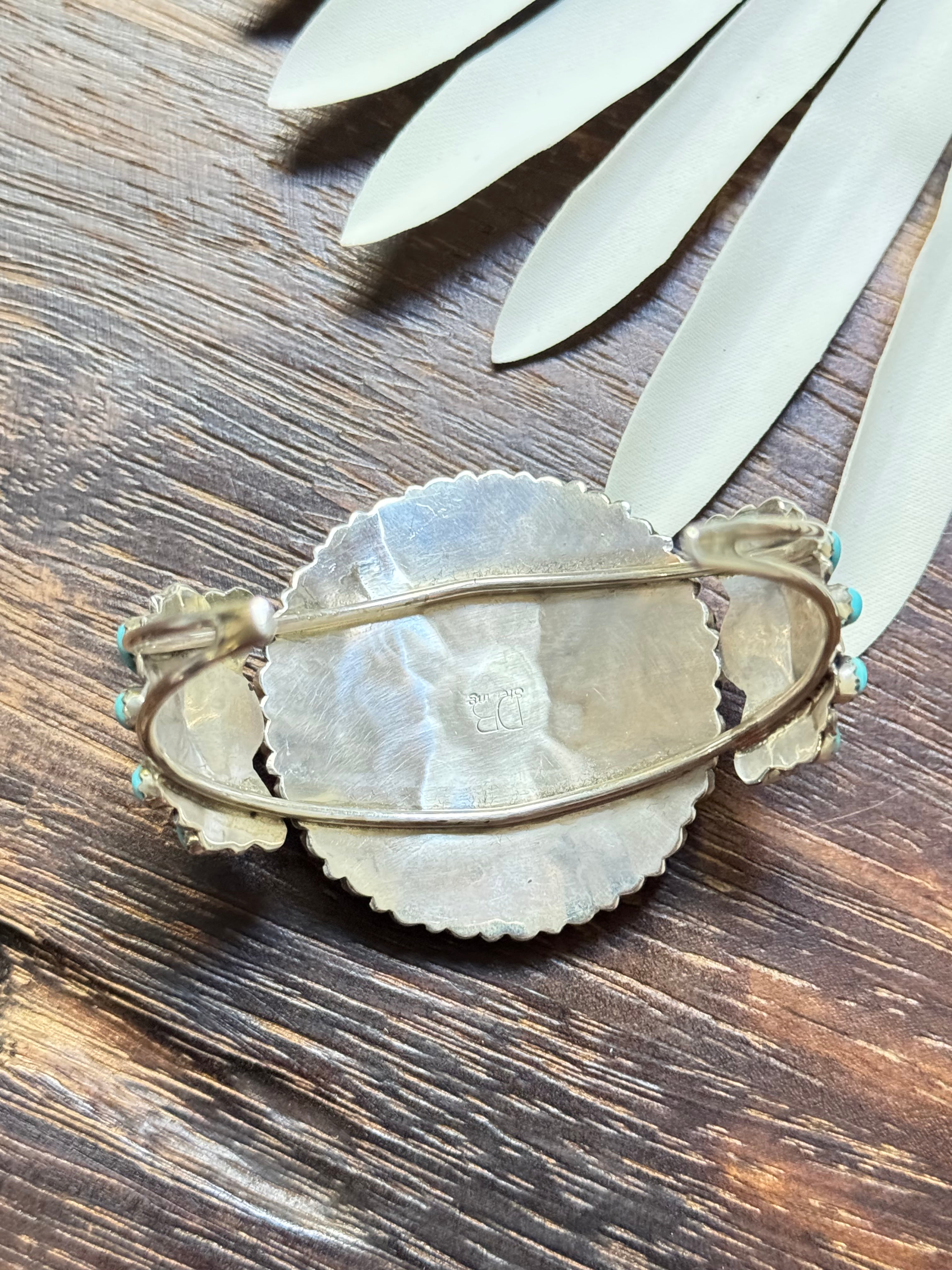 David Williams Kingman Turquoise & Sterling Silver Cluster Cuff Bracelet. It measures 1 7/8 inches wide with an inside circumference of 5 1/4 inches and a gap of 1 1/4 inches. Signed by the artist and stamped sterling silver.