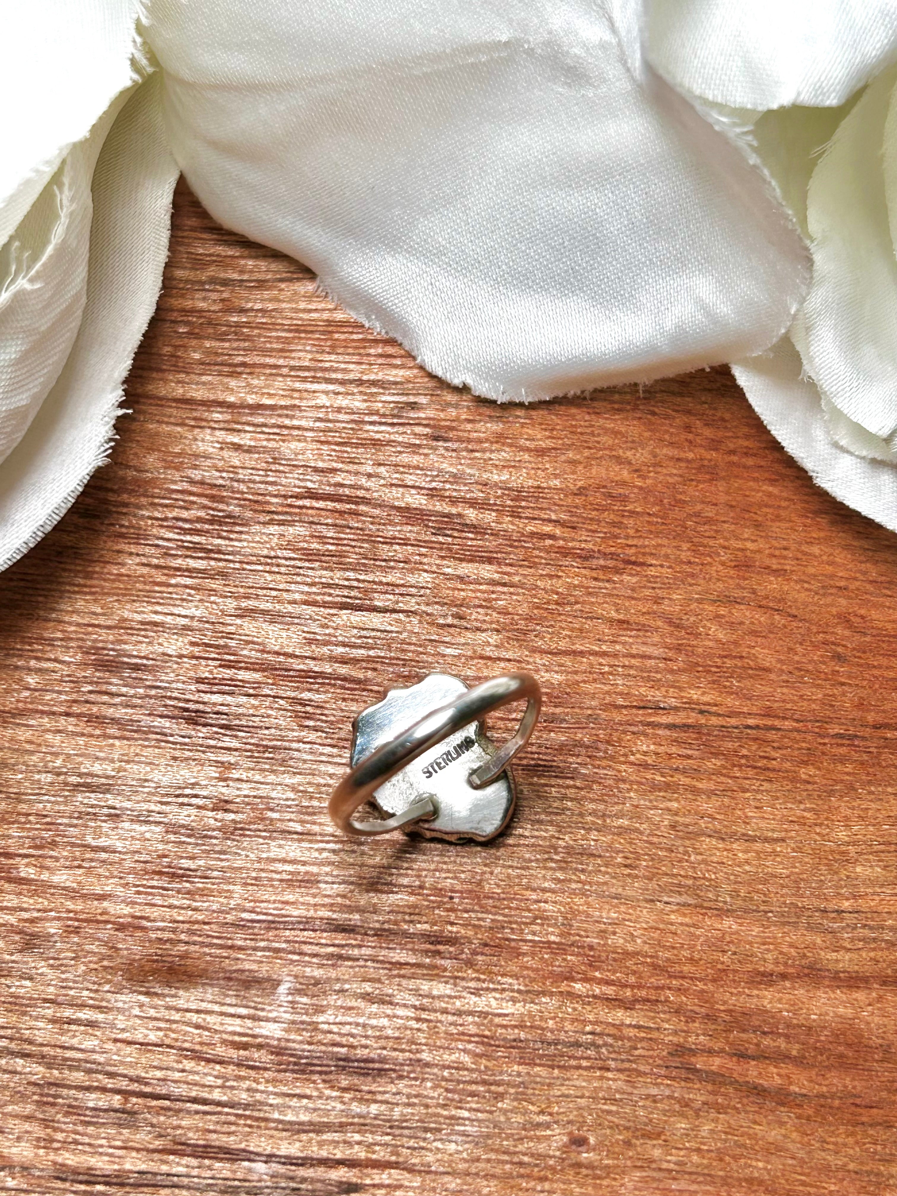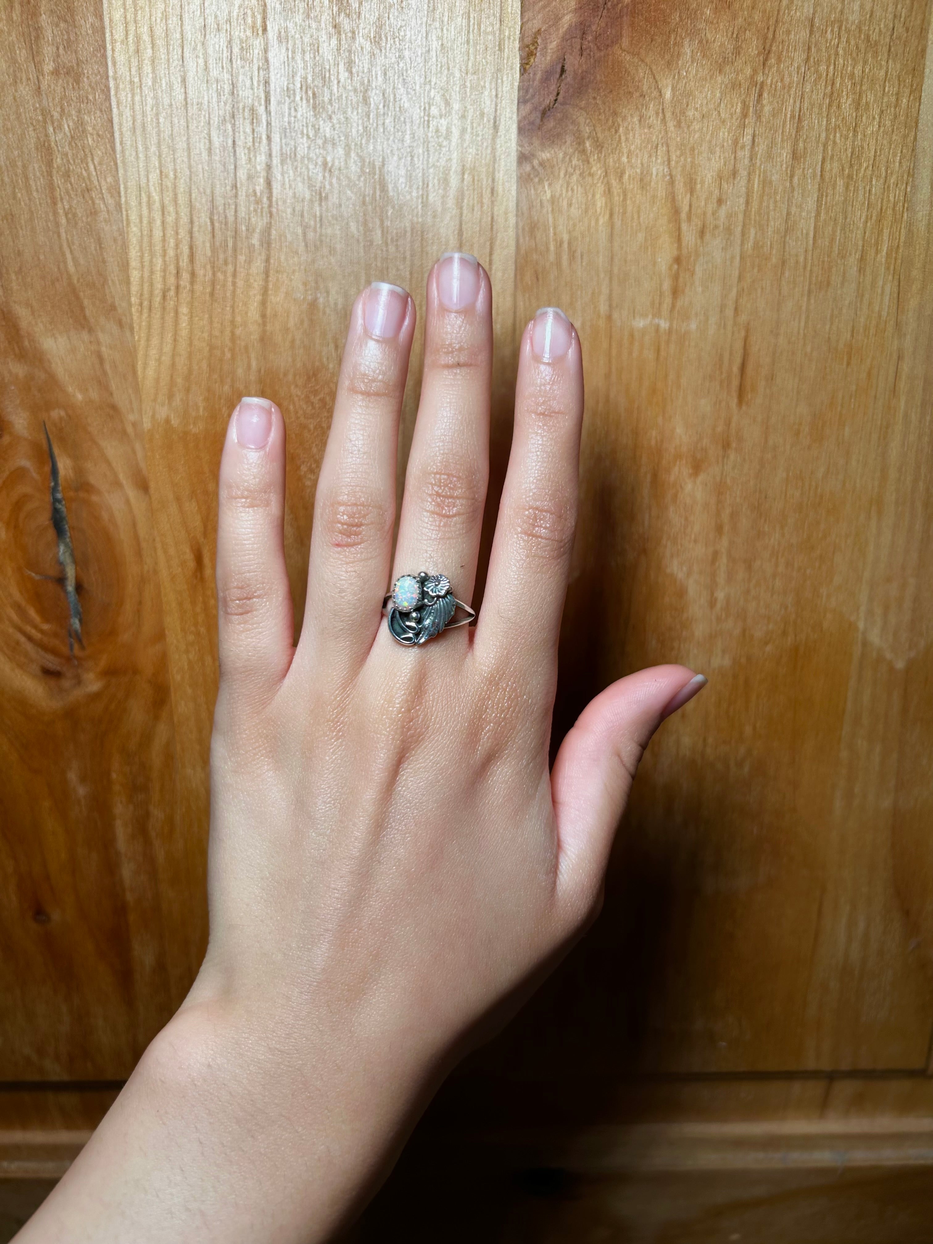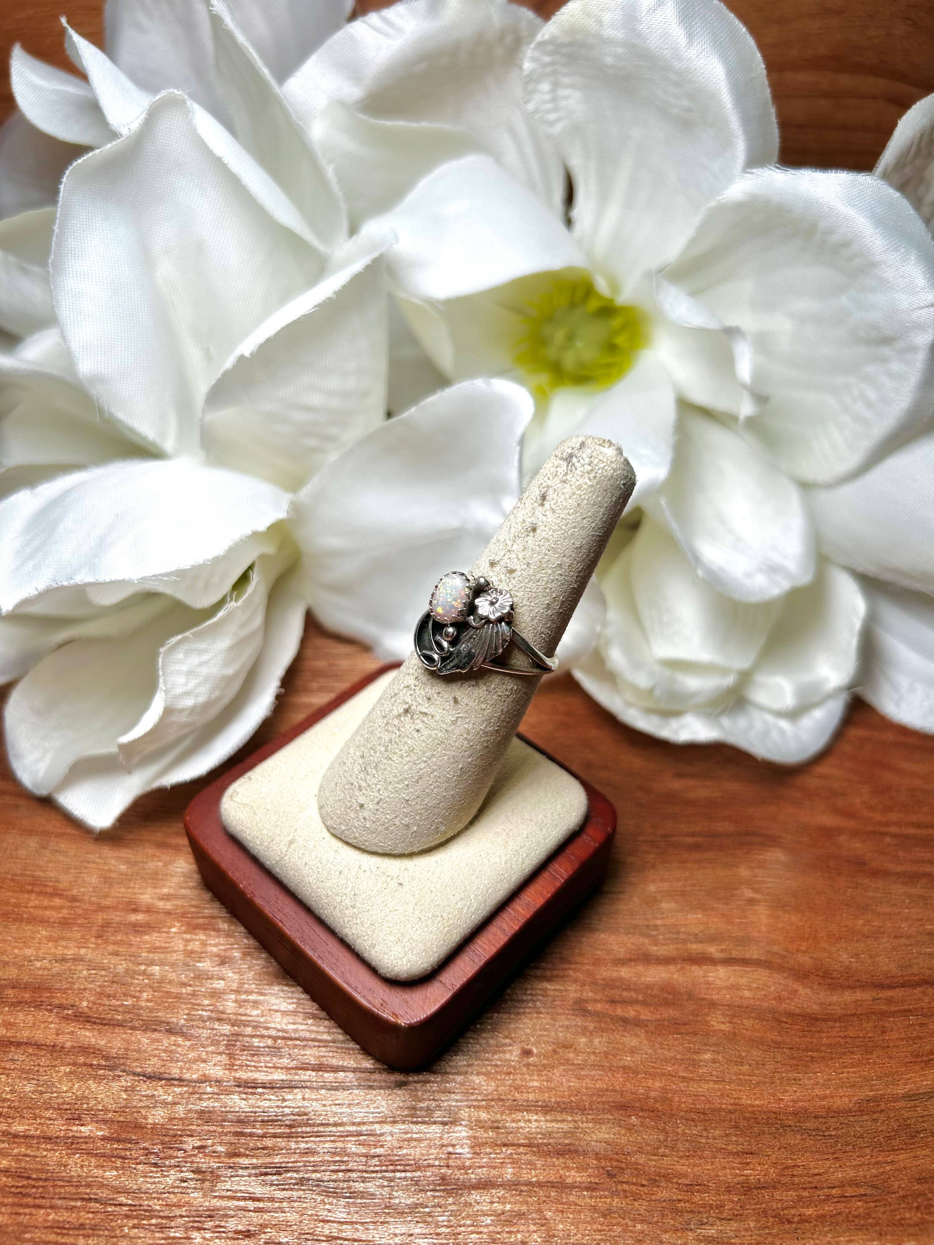 Navajo Made Opal & Sterling Silver Cluster Ring. It measures 5/8 of an inch long and it measures 1/2 of an inch wide. Signed by the artist and stamped sterling silver.
