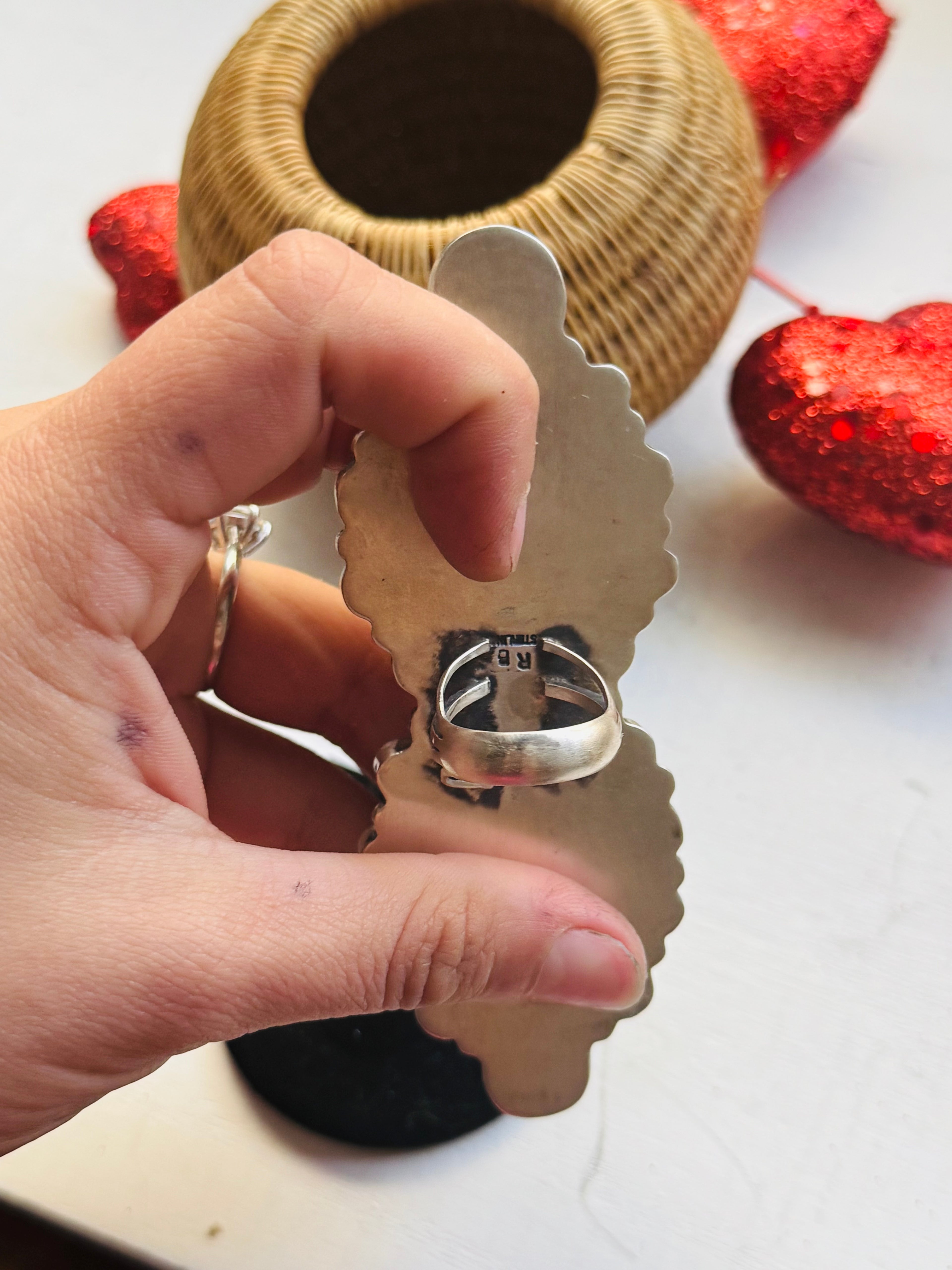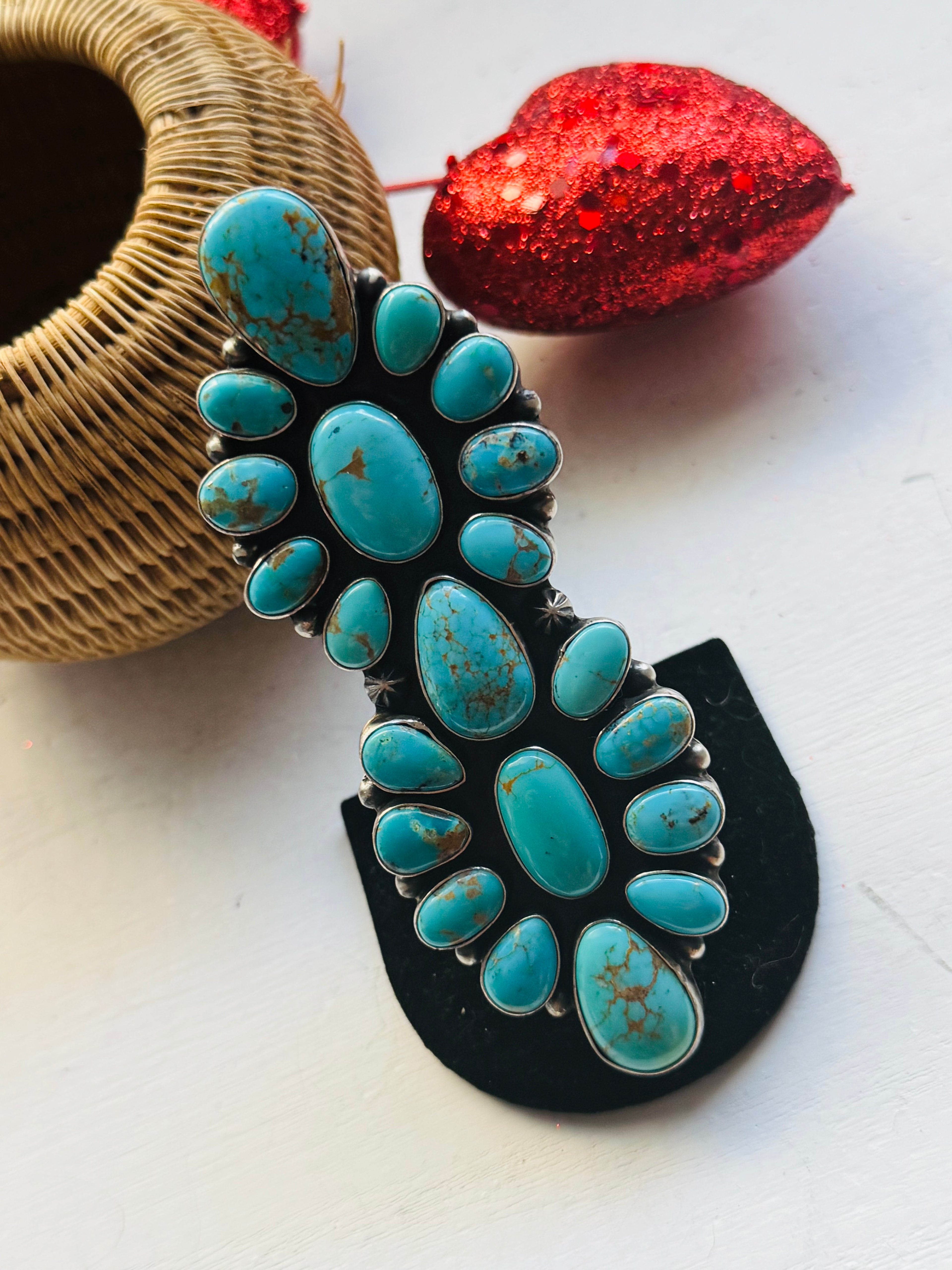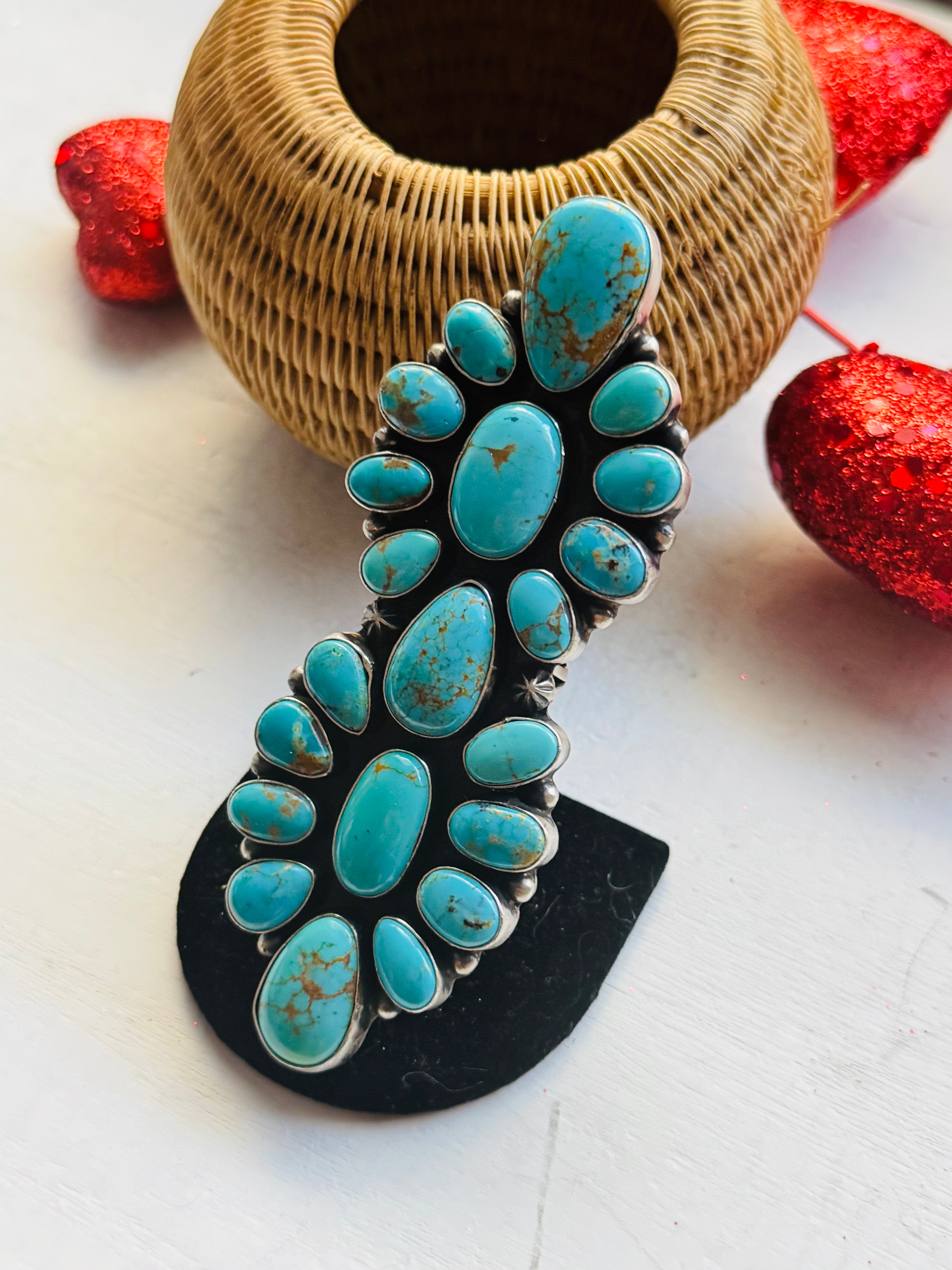 Beautiful ring.Navajo Made Kingman Turquoise & Sterling Silver Cluster Ring Size 7. It measures 4 3/8 inches long and 1 3/8 inches wide. Stamped sterling silver and signed.