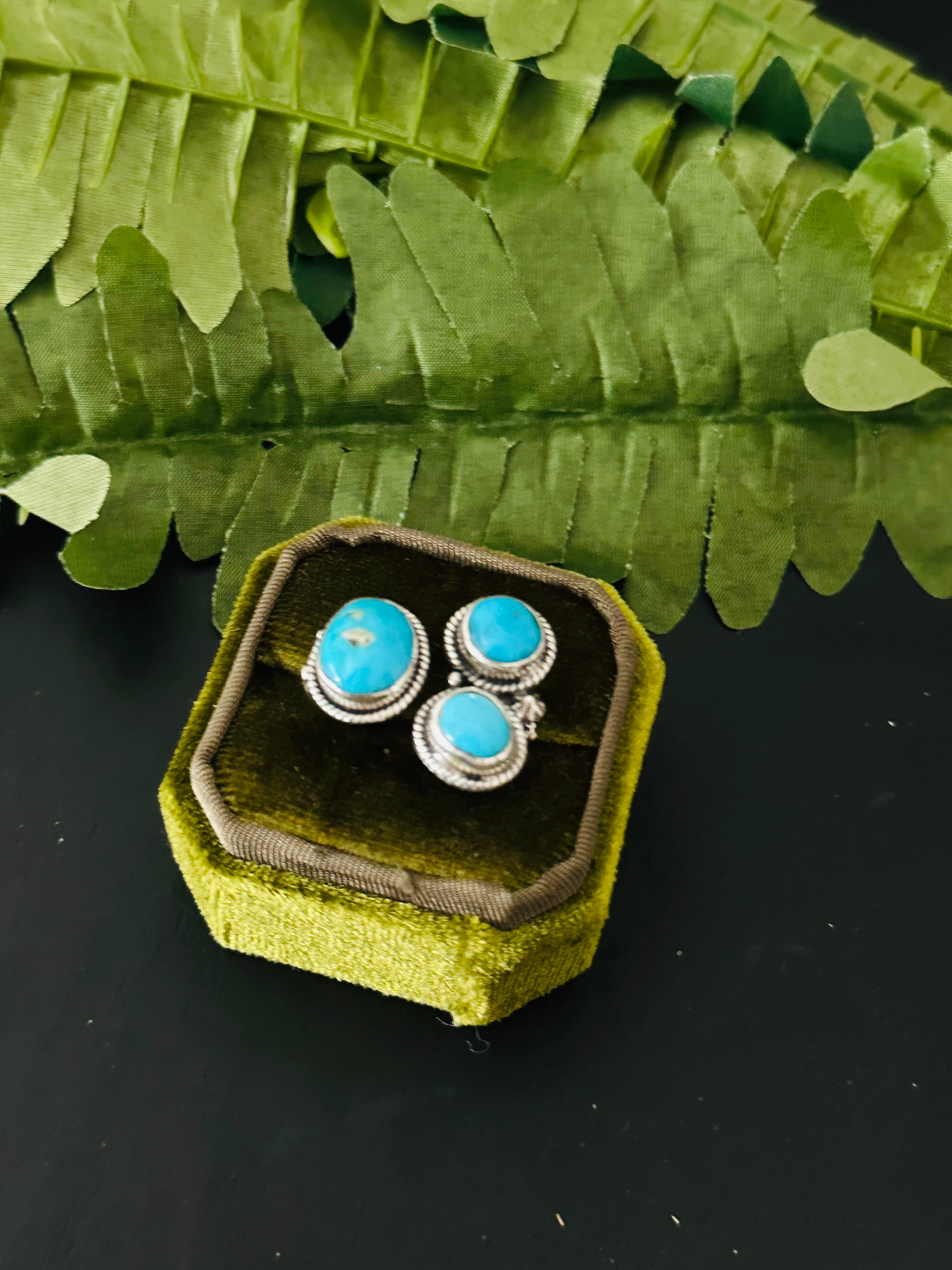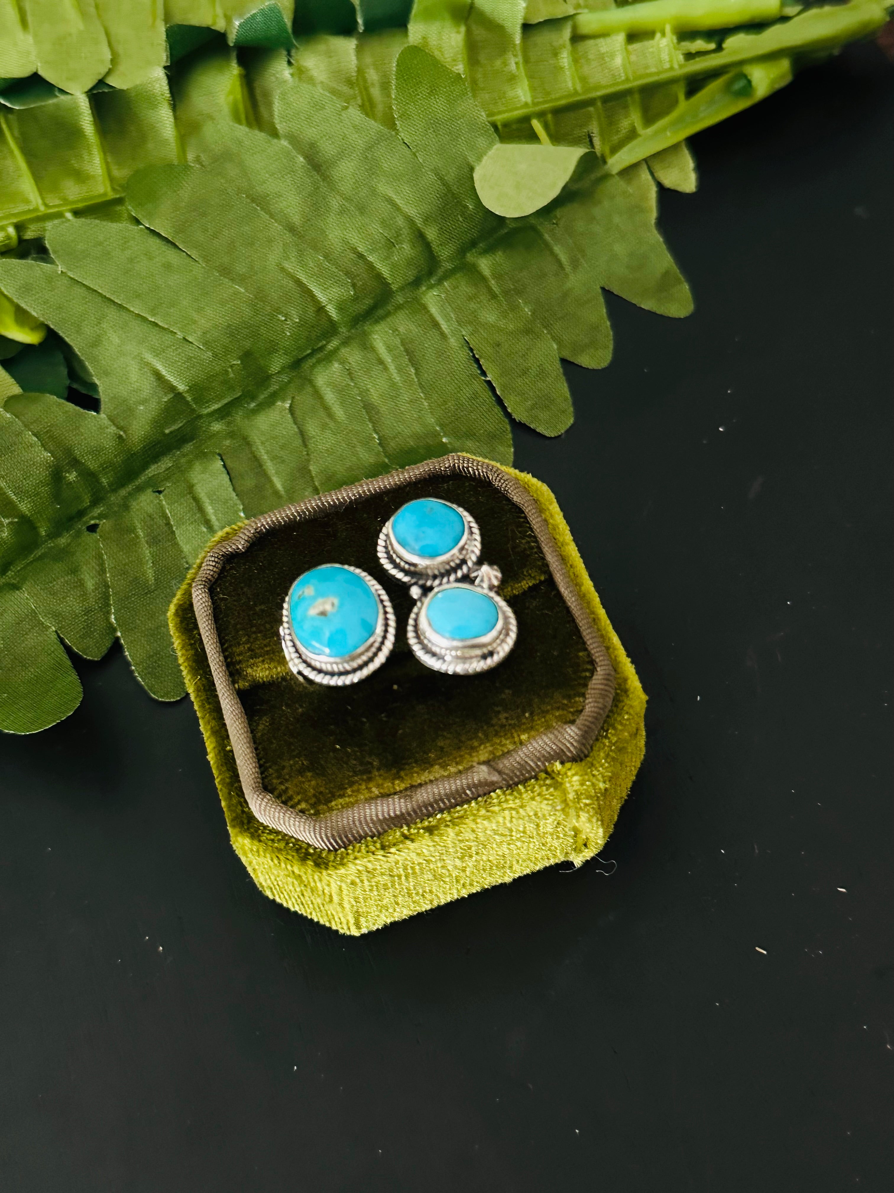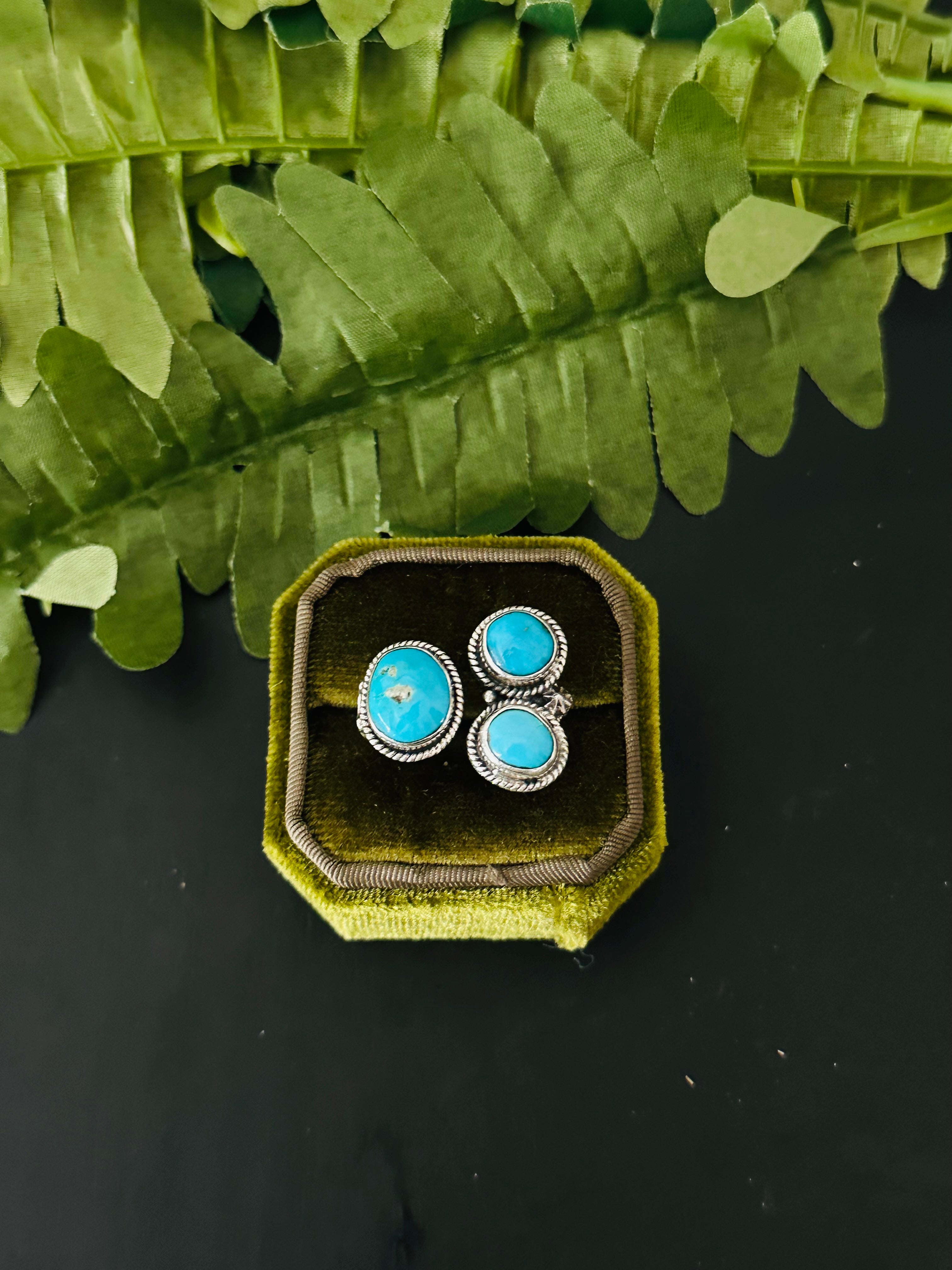 Beautiful ring. Navajo Made Kingman Turquoise & Sterling Silver Cluster Adjustable Ring. It measures 3/4 of an inch long and 1 inch wide. Stamped sterling silver and signed. Stones will differ due to natural stones.d