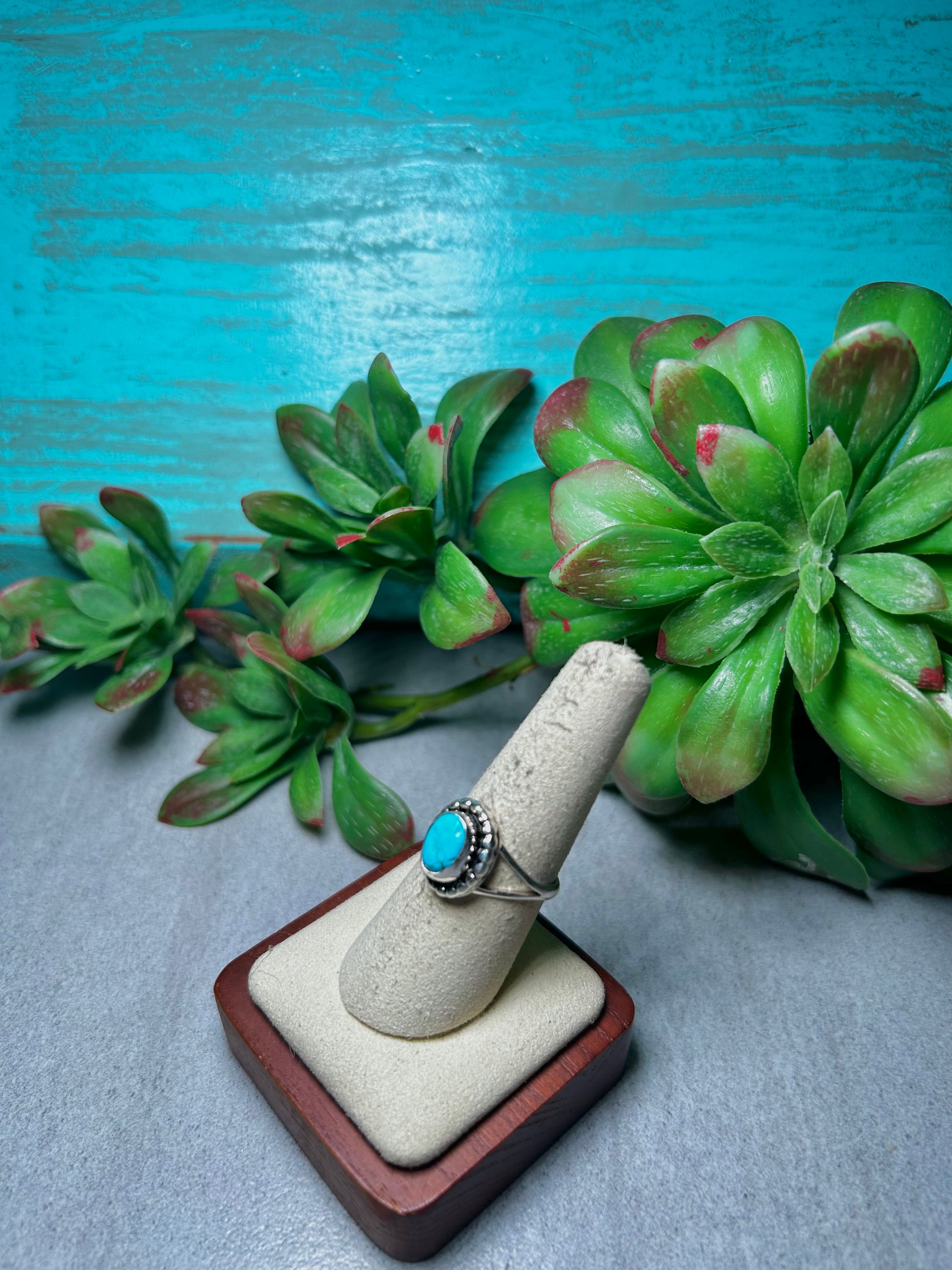 Navajo Made Kingman Turquoise & Sterling Silver Cluster Ring Size 7.75. It measures 5/8 of an inch long and 1/2 of an inch wide. Signed by the artist and stamped sterling silver.