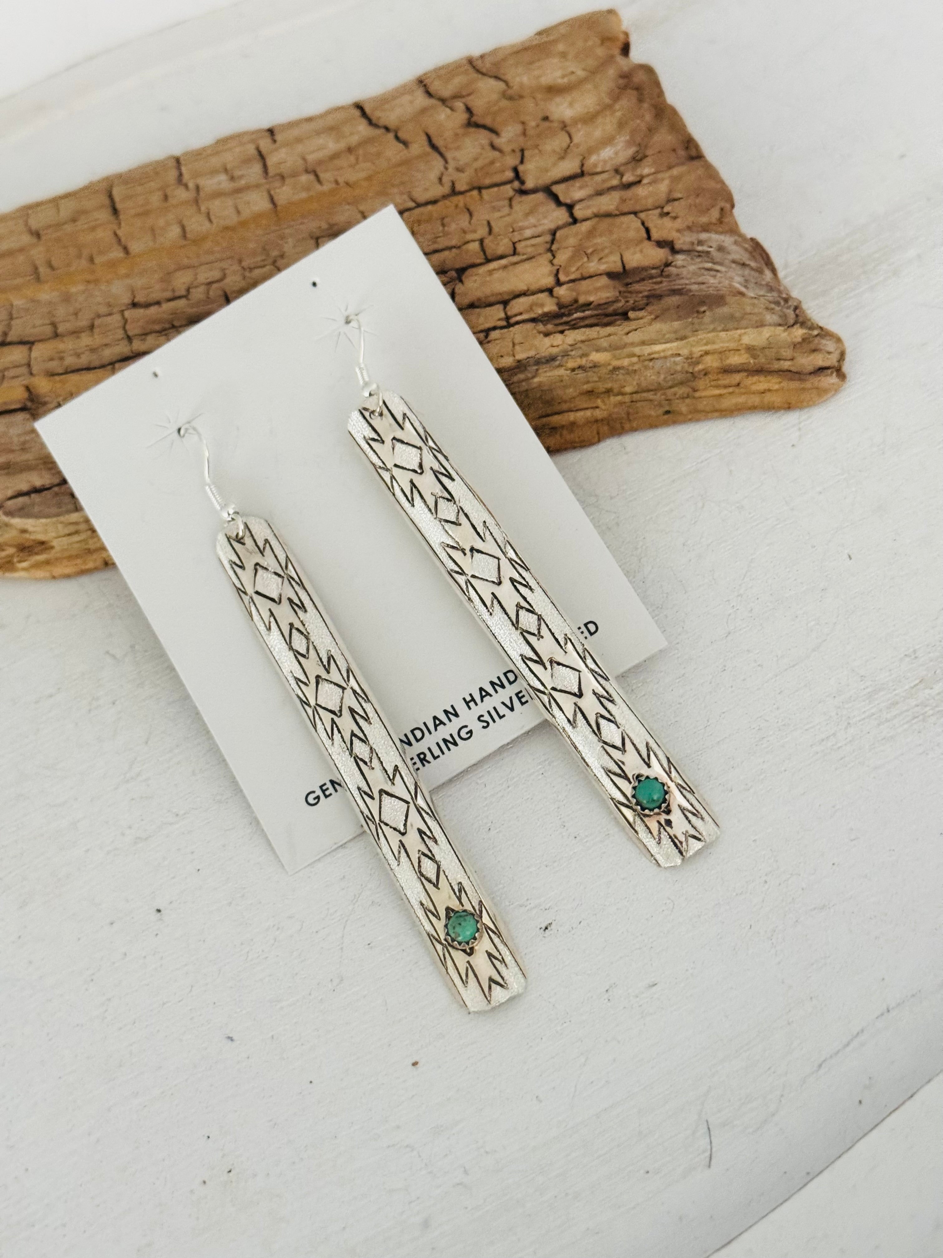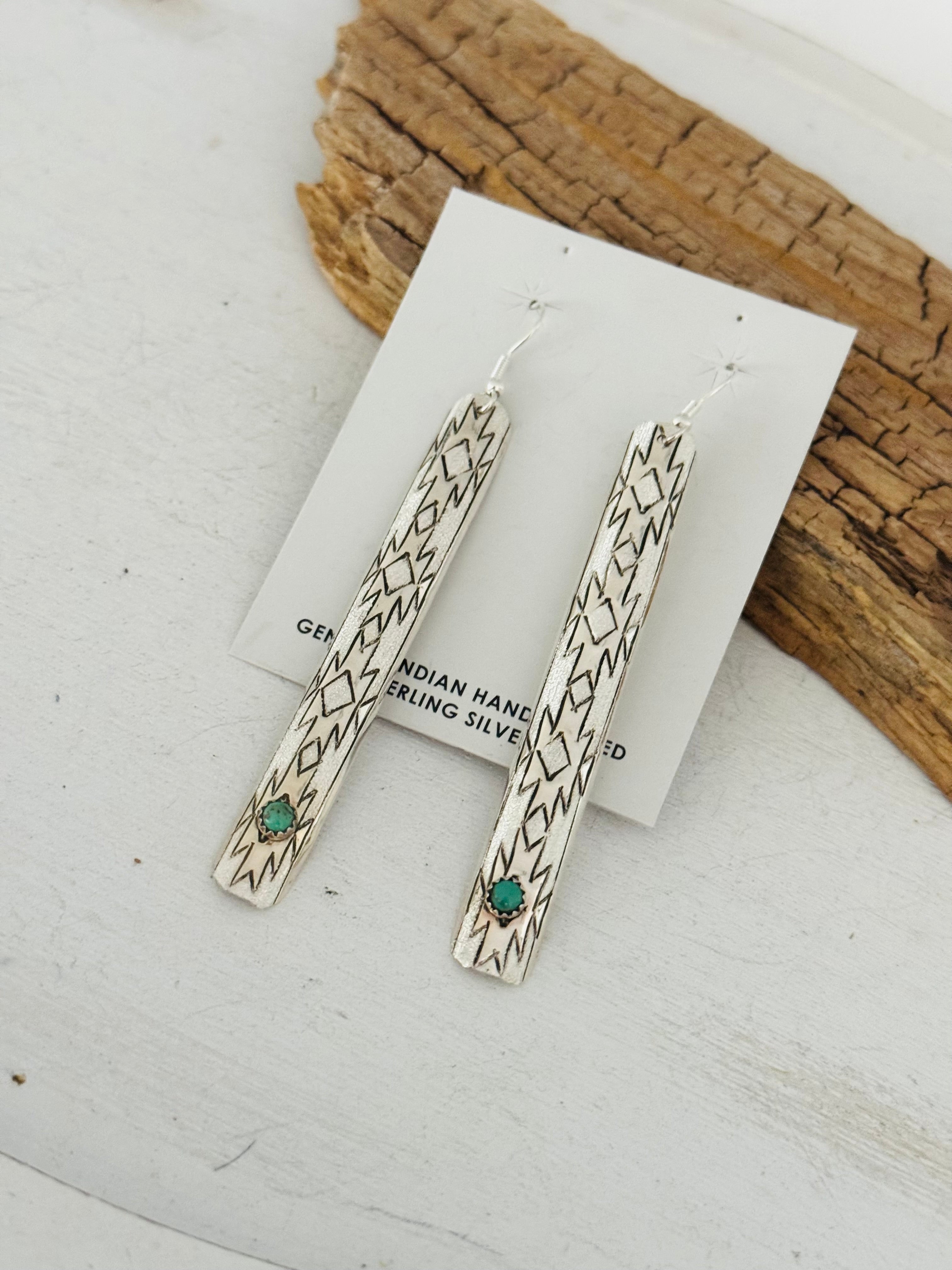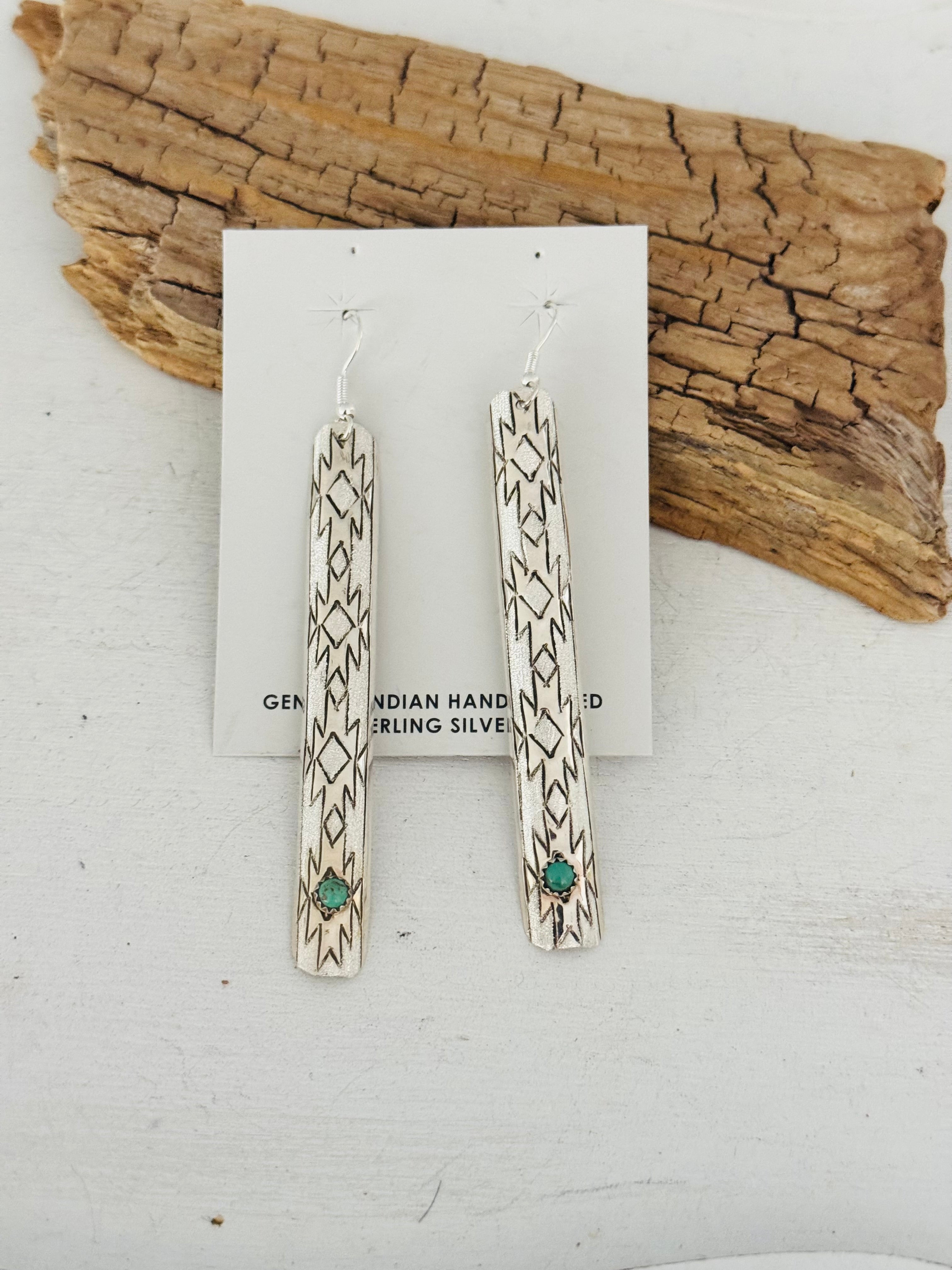 Beautiful dangle earrings. Navajo Made Kingman Turquoise & Sterling Silver Dangle Earrings. It measures 3 3/4 inches long and 3/8 of an inch wide . Signed and stamped.