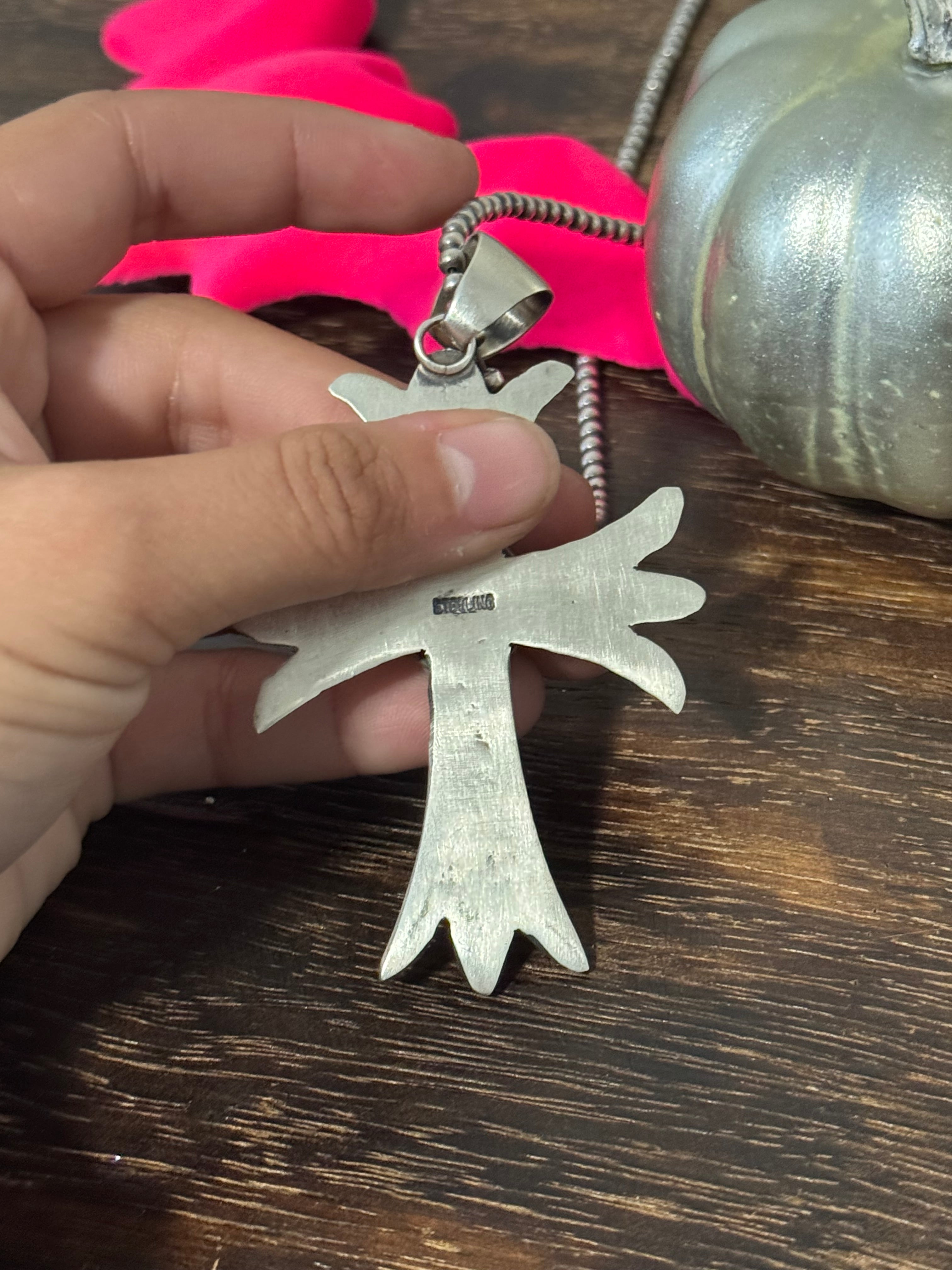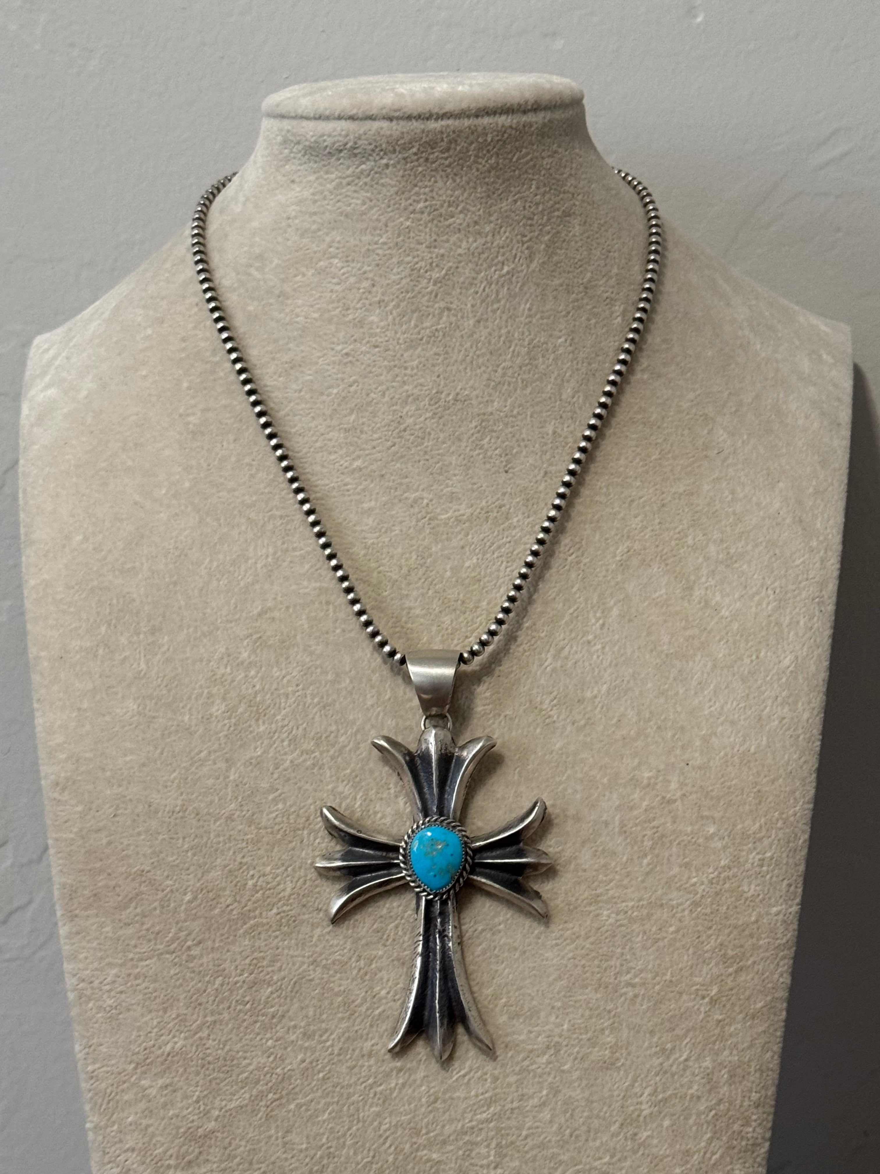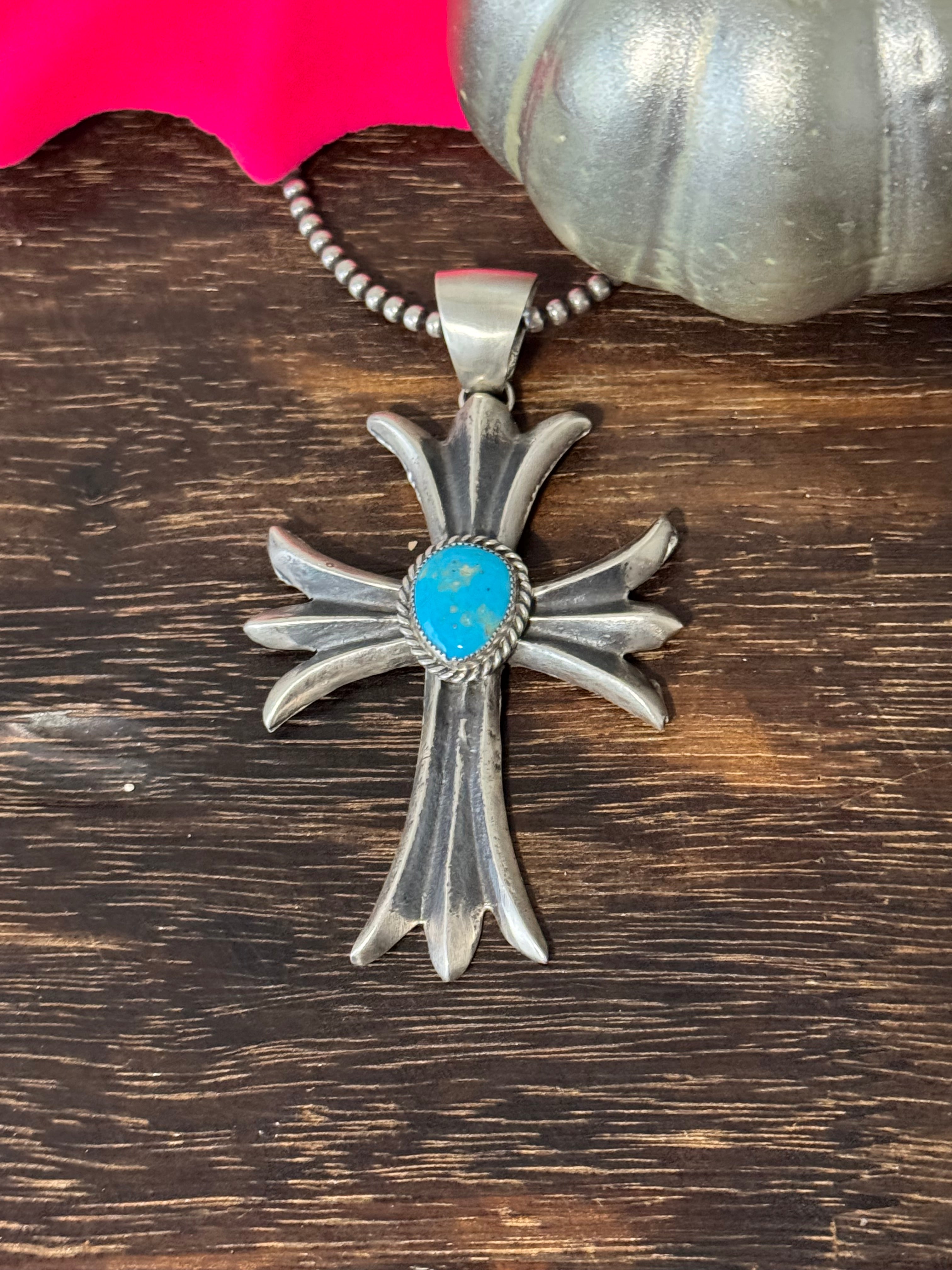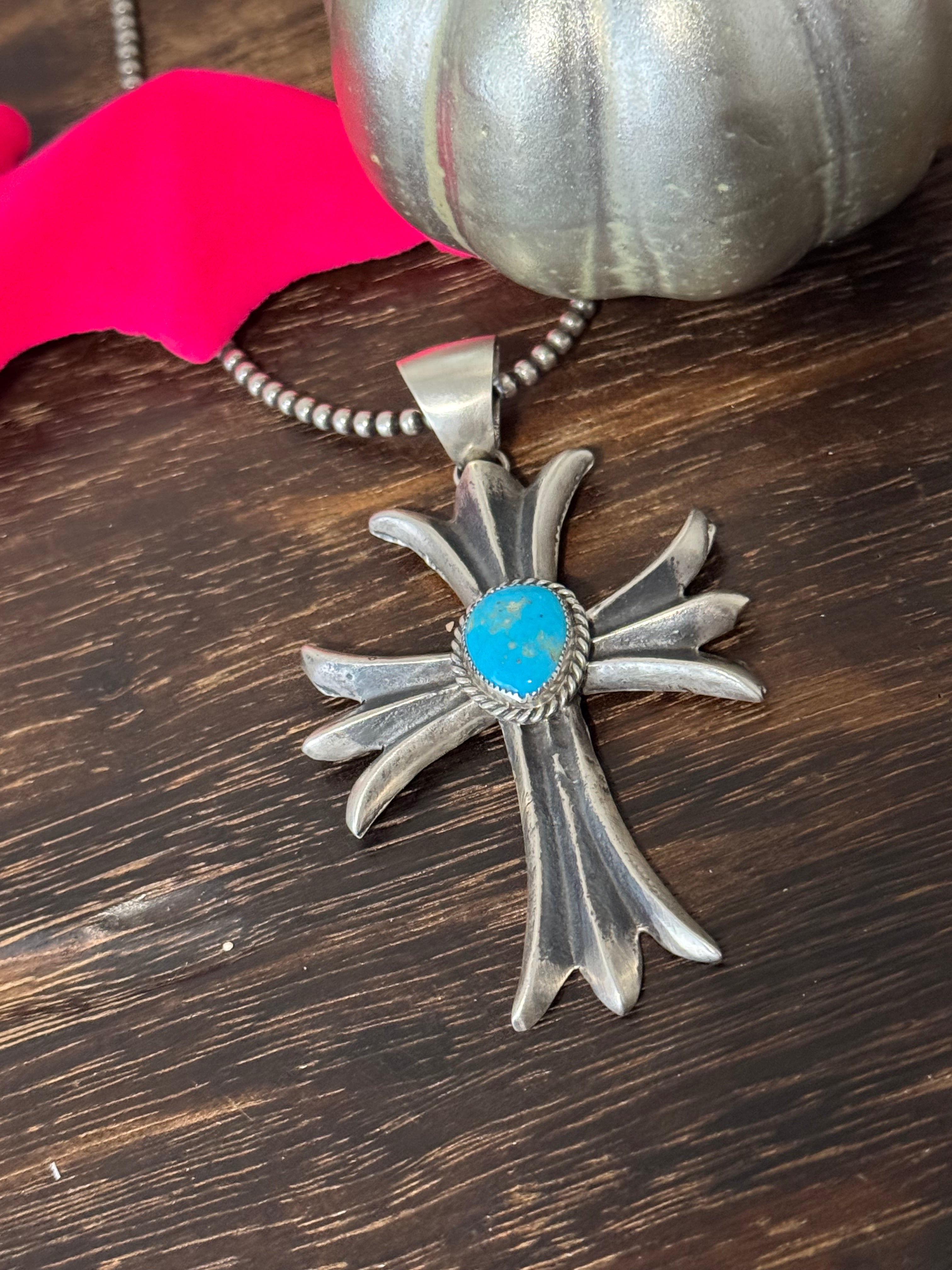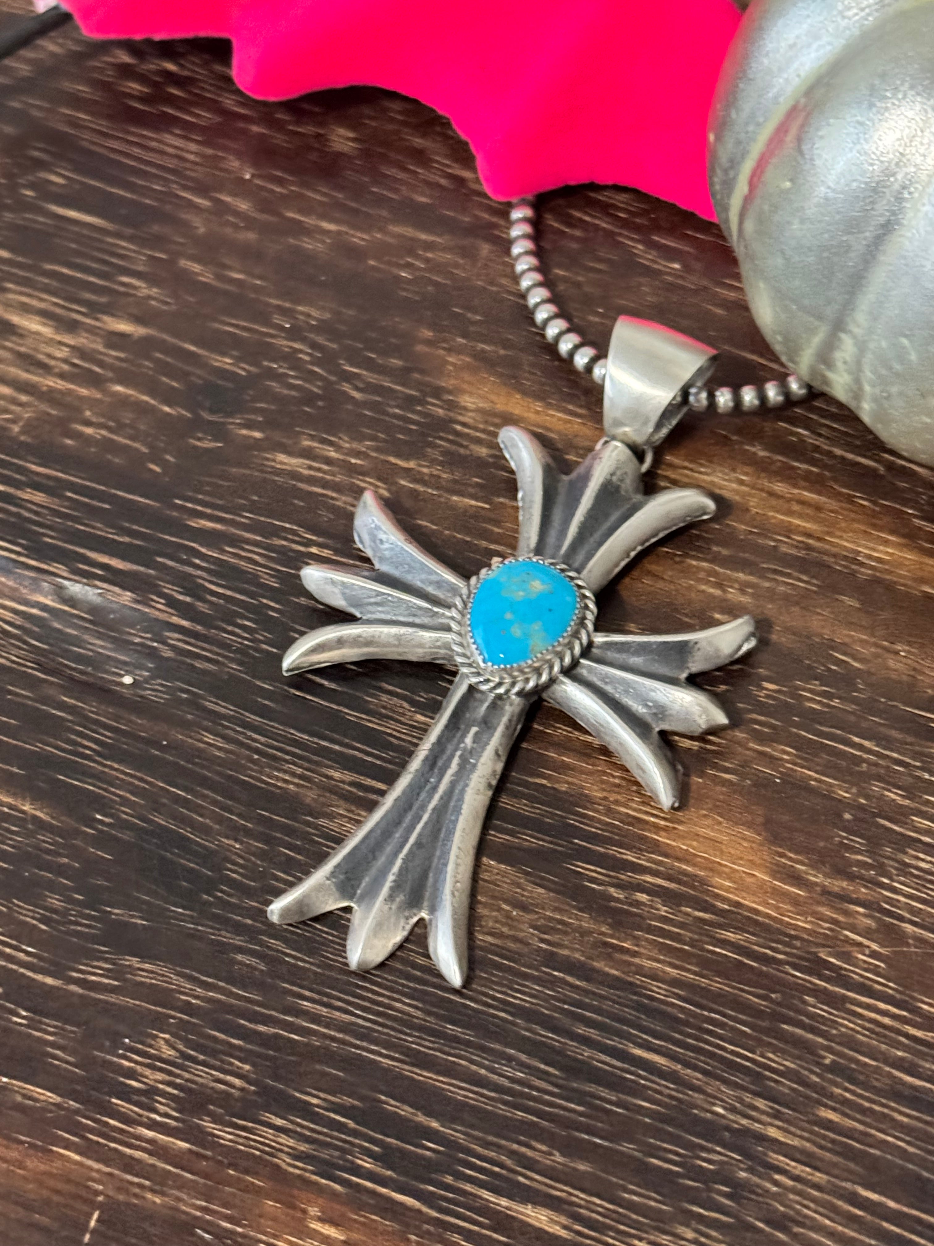 Navajo Made Kingman Turquoise & Sterling Silver Cross Pendant