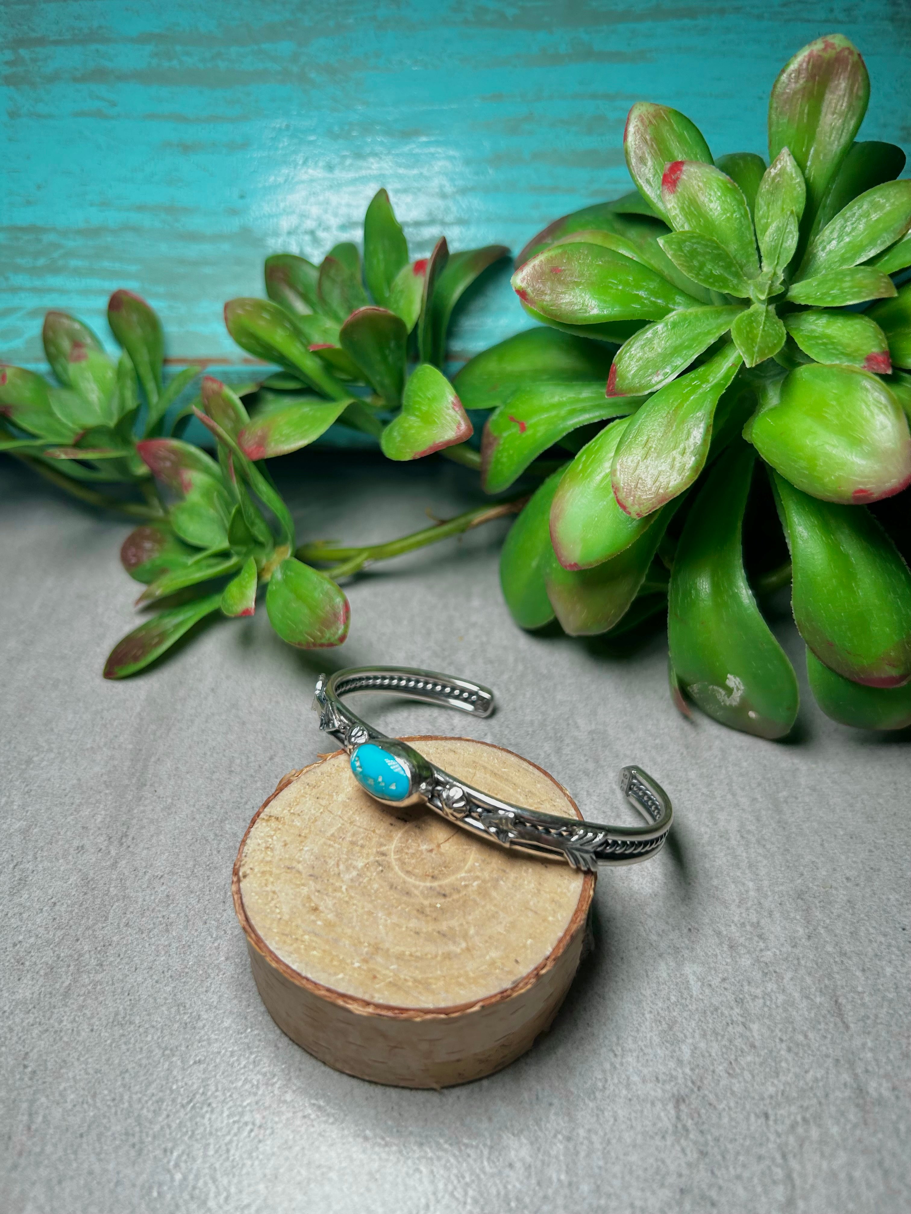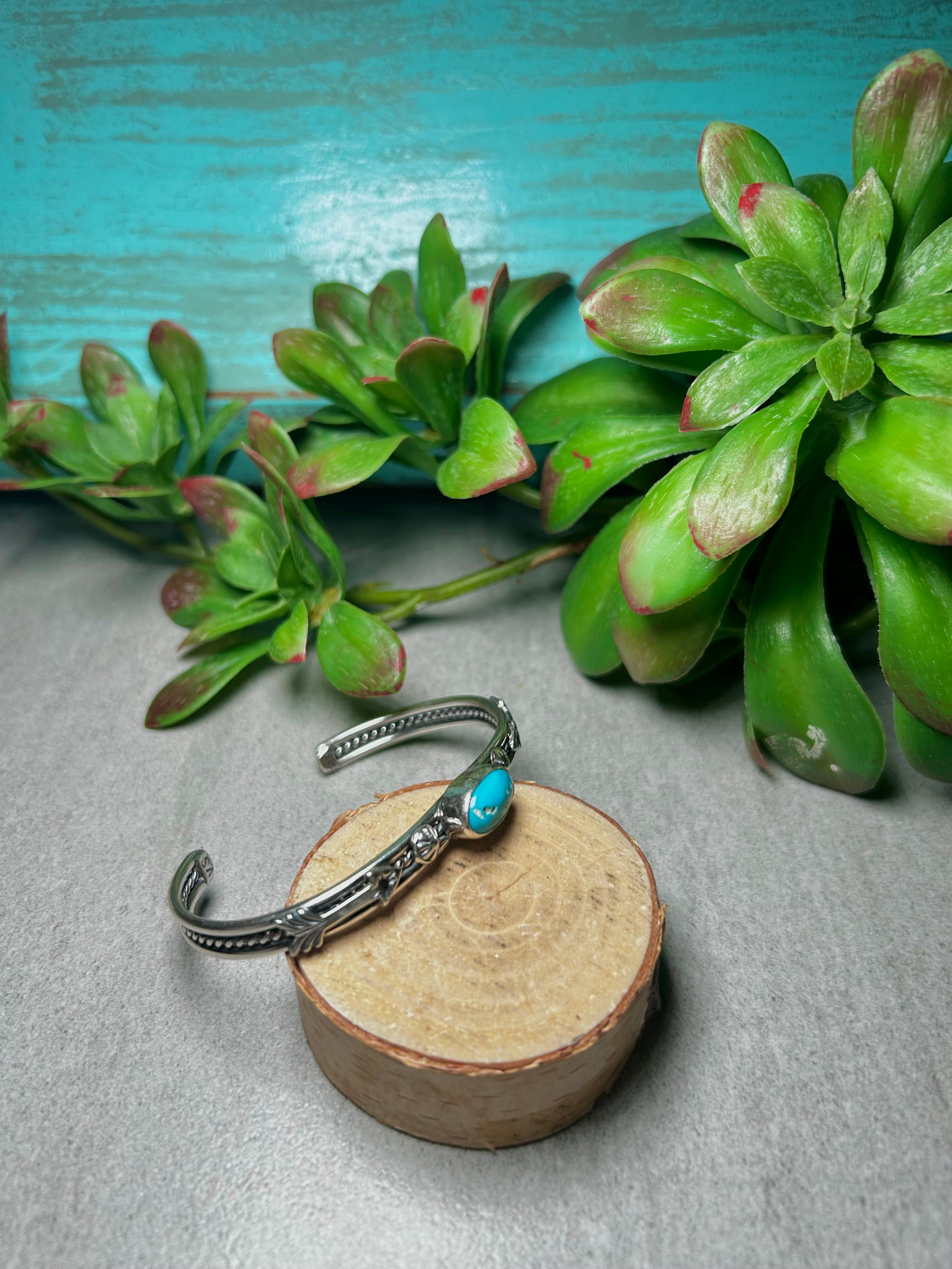 Navajo Made Kingman Turquoise & Sterling Silver Cuff Bracelet. It measures 3/8 of an inch wide with an inside circumference of 5 1/4 inches and a gap of 1 1/8 inch. Signed by the artist and stamped sterling silver.