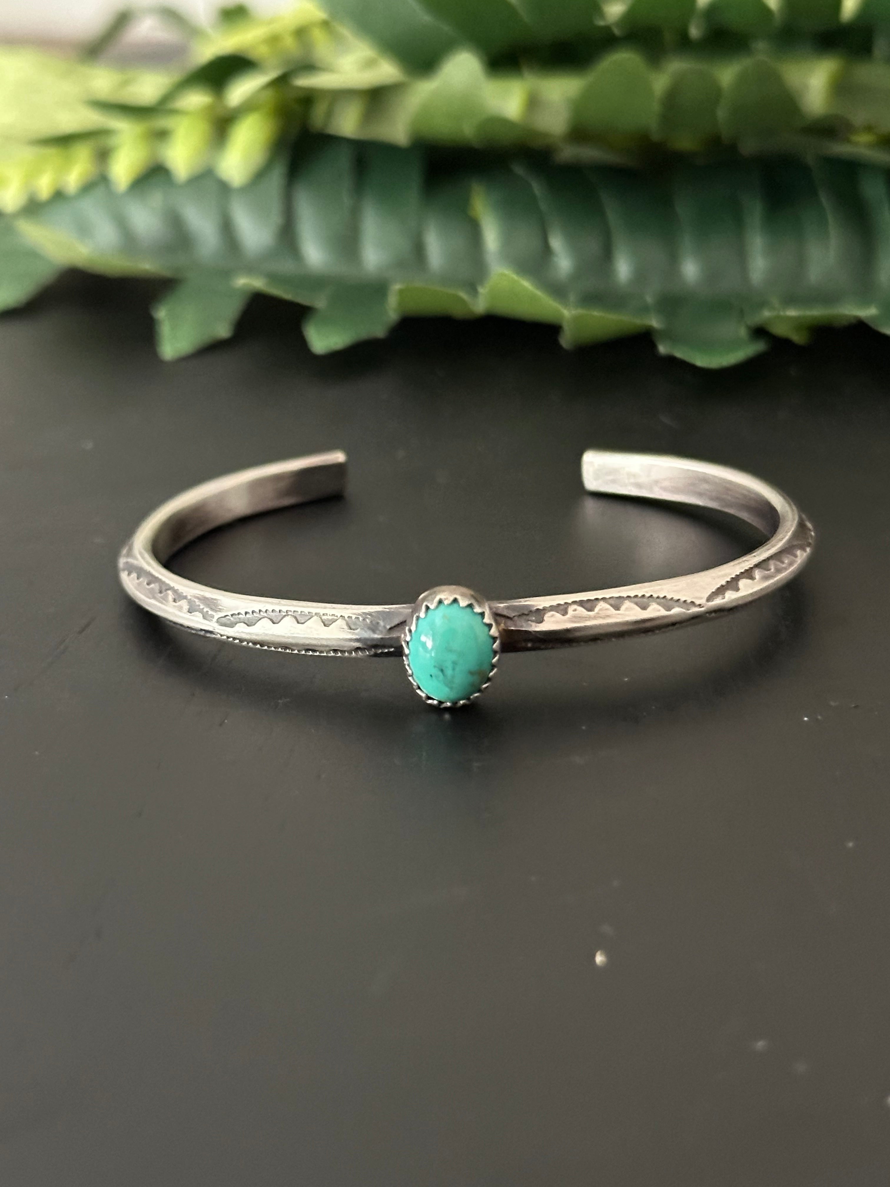 Navajo Made Kingman Turquoise & Sterling Silver Cuff Bracelet. It measures 3/8 of an inch wide with an inside circumference of 5 1/4 inches and a gap of 1 inch. Signed by the artist and stamped sterling silver.