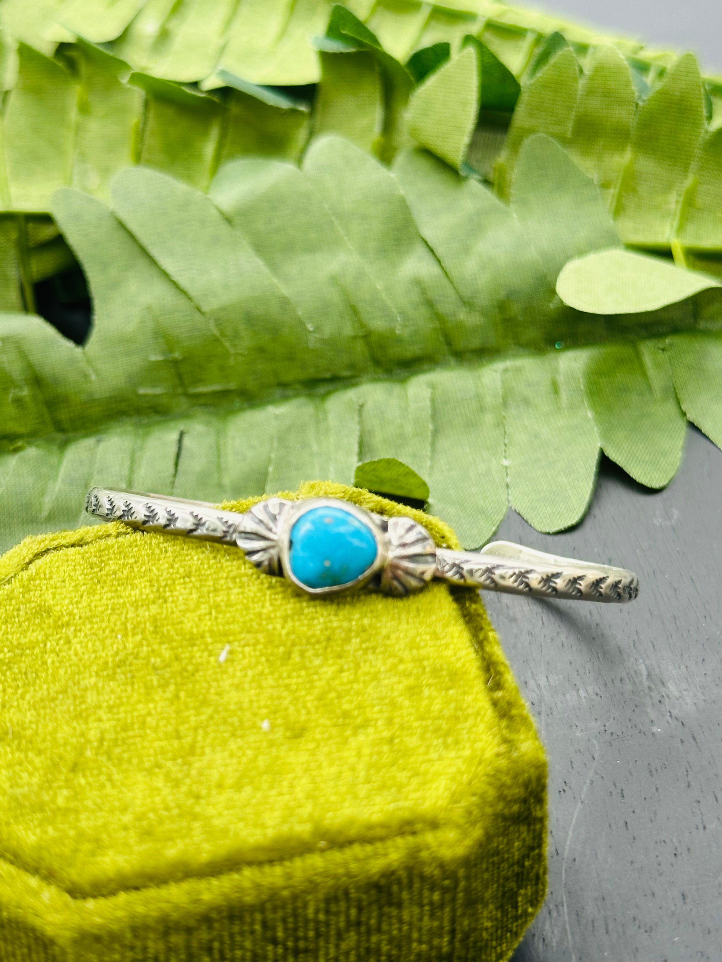 Navajo Made Kingman Turquoise & Sterling Silver Cuff Bracelet. It measures 3/8 of an inch wide with an inside circumference of 5 1/8 inches and a gap of 1 1/8 inches. Signed by the artist and stamped sterling silver.