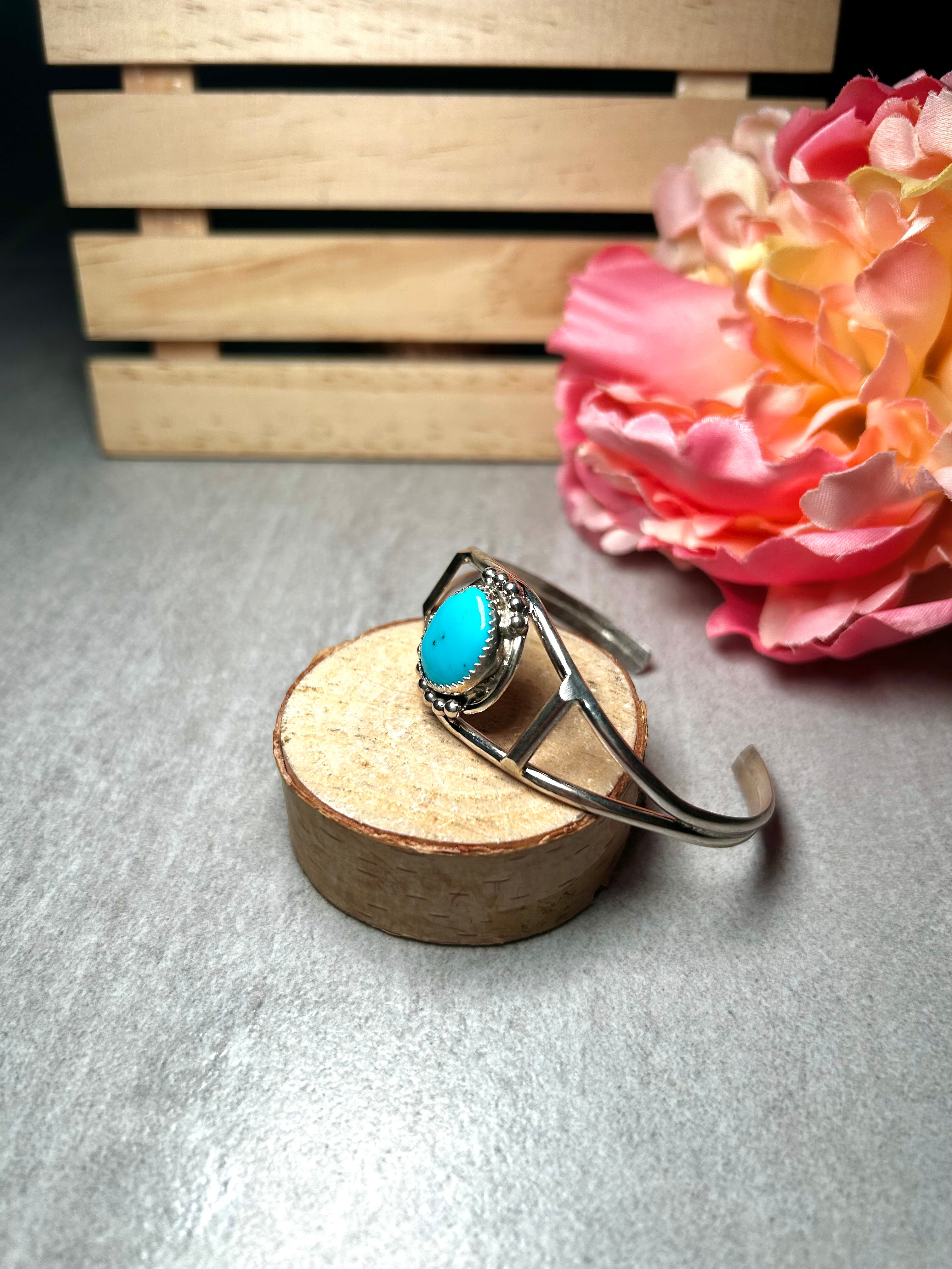 Navajo Made Kingman Turquoise & Sterling Silver Cuff Bracelet. It measures 7/8 of an inch wide with an inside circumference of 5 5/8 inches and a gap of 1 inch. Signed by the artist and stamped sterling silver.