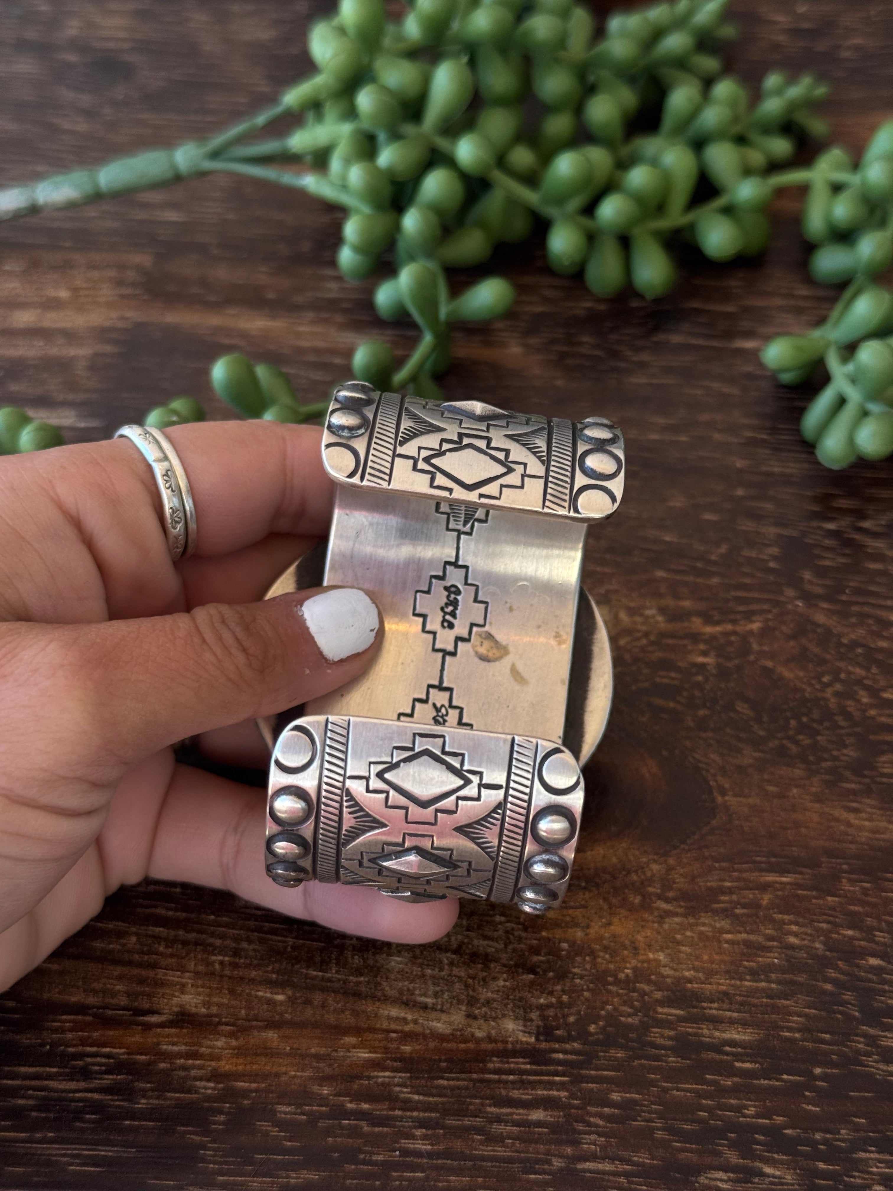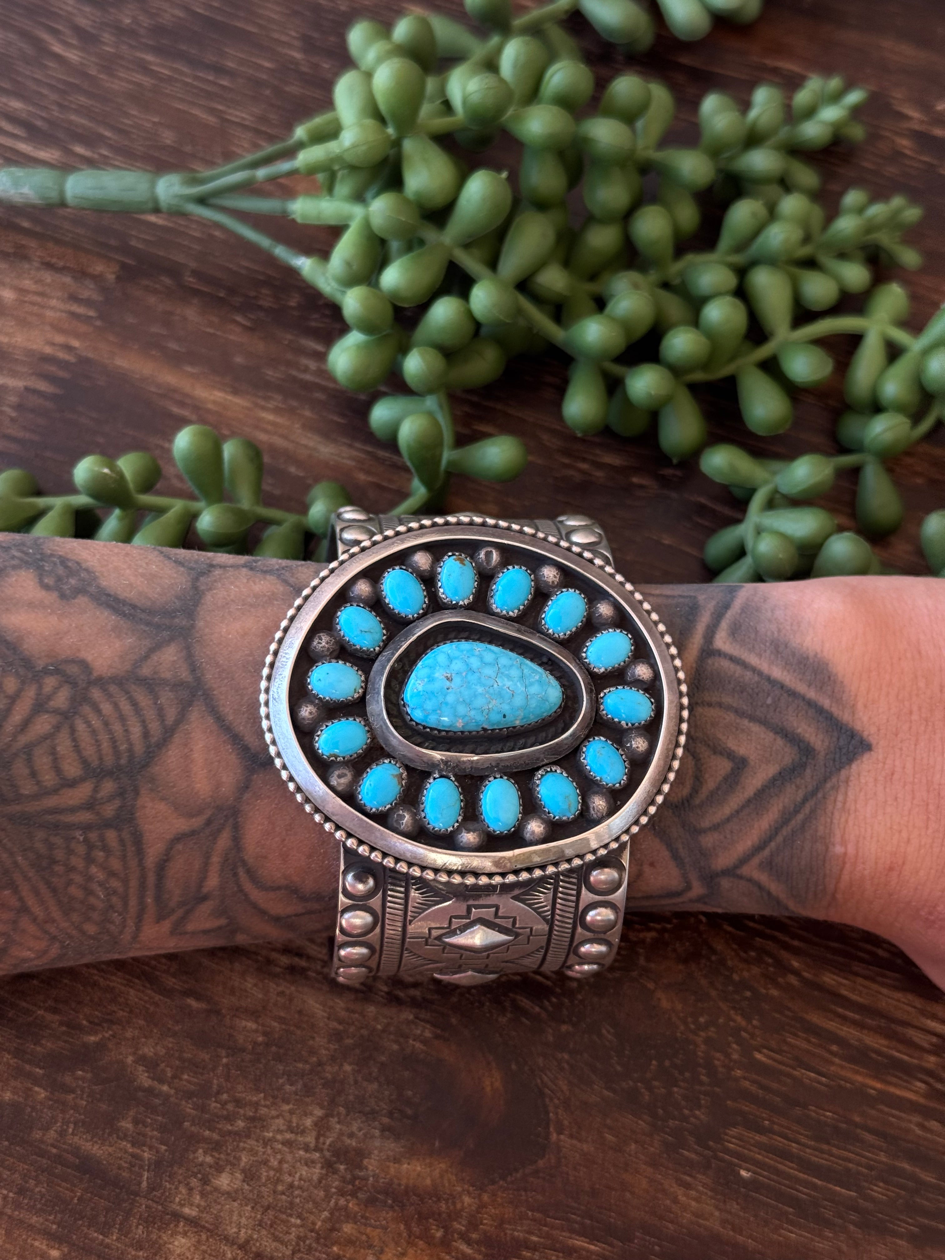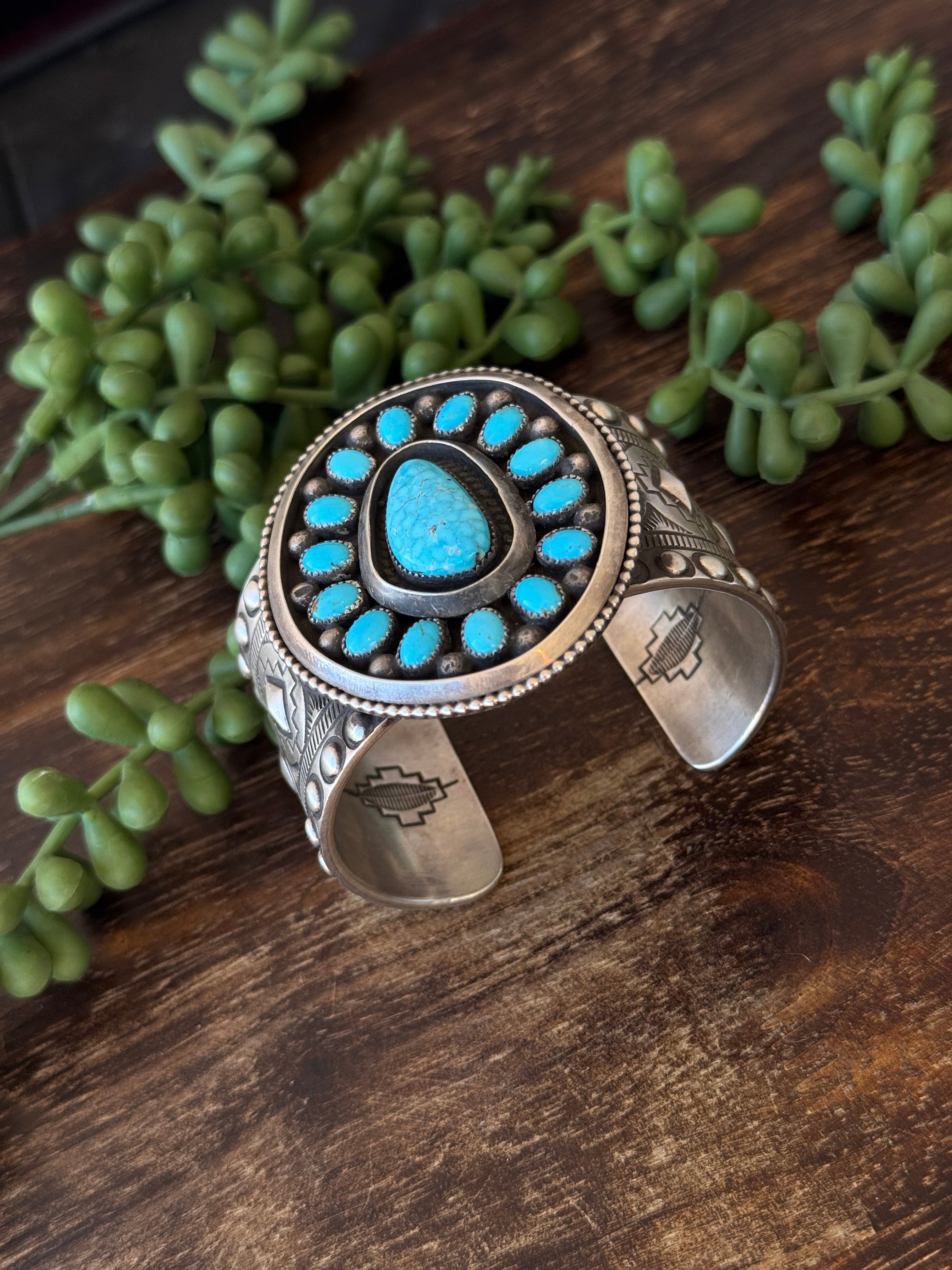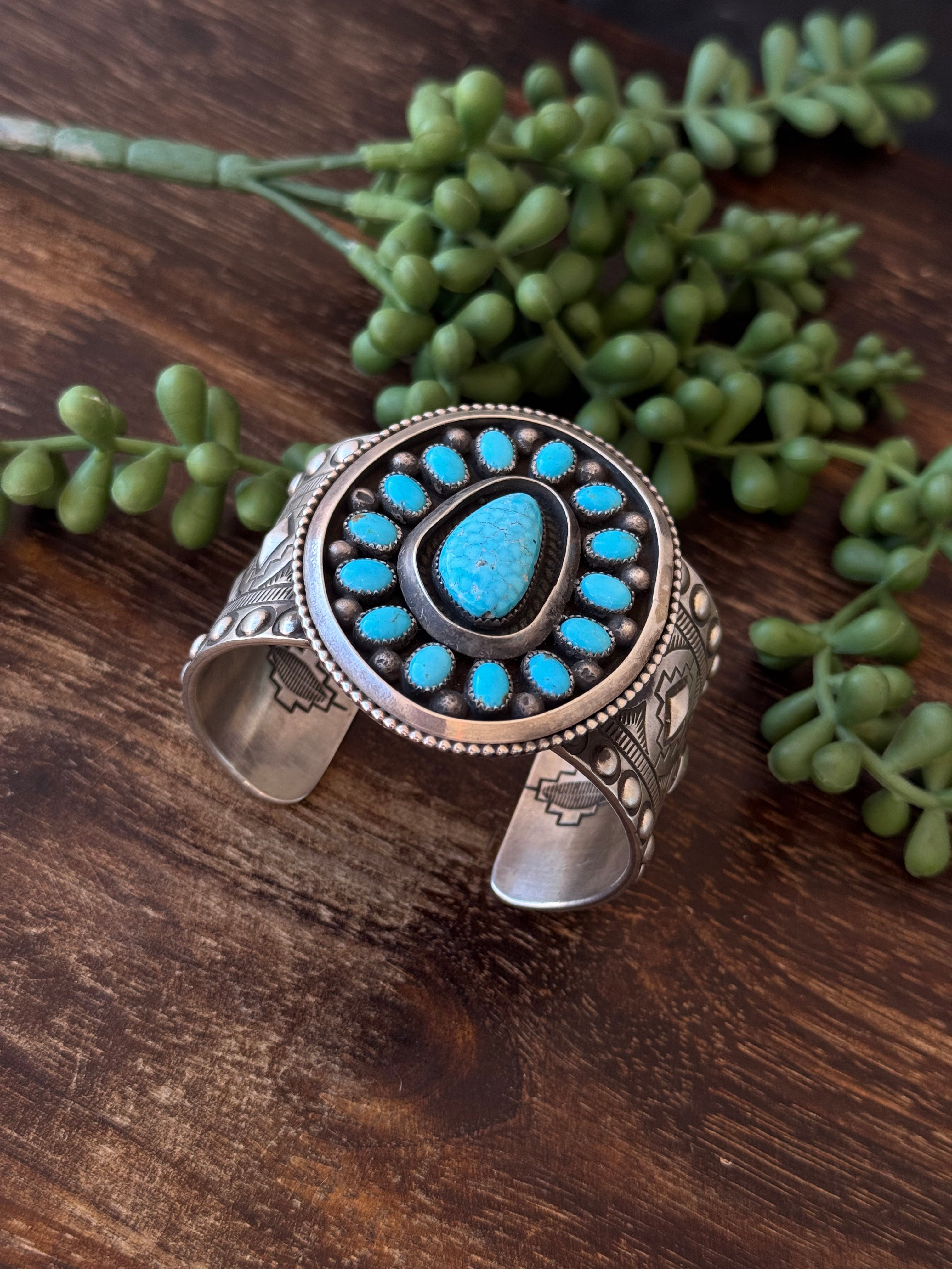 Navajo Made Kingman Turquoise & Sterling Silver Cluster Cuff Bracelet