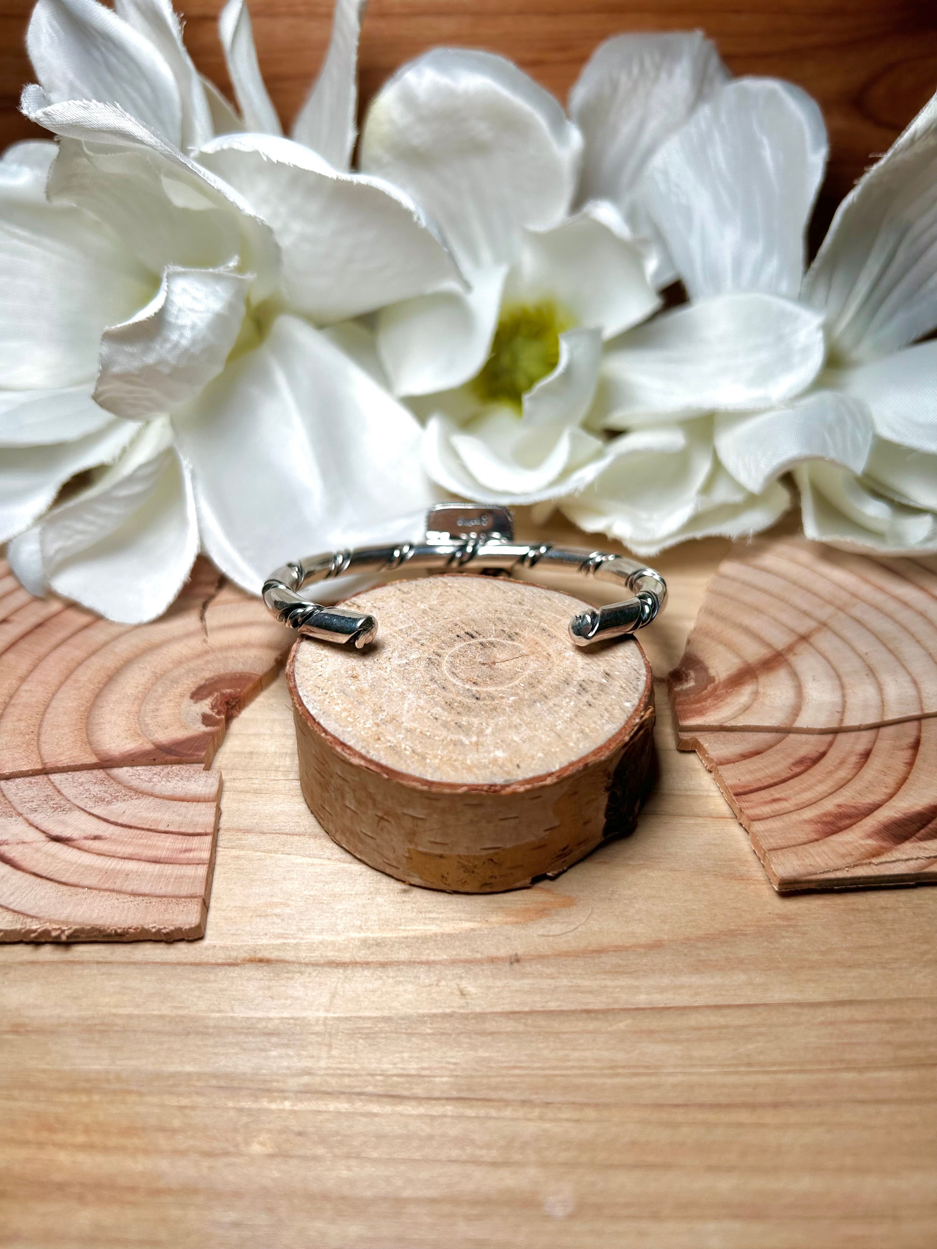 Wydell Billie Kingman Turquoise & Sterling Silver Cuff Bracelet. It measures 5/8 of an inch wide with an inside circumference of 5 1/8 inches and a gap of 1 1/8 inches. Signed by the artist and stamped sterling silver.