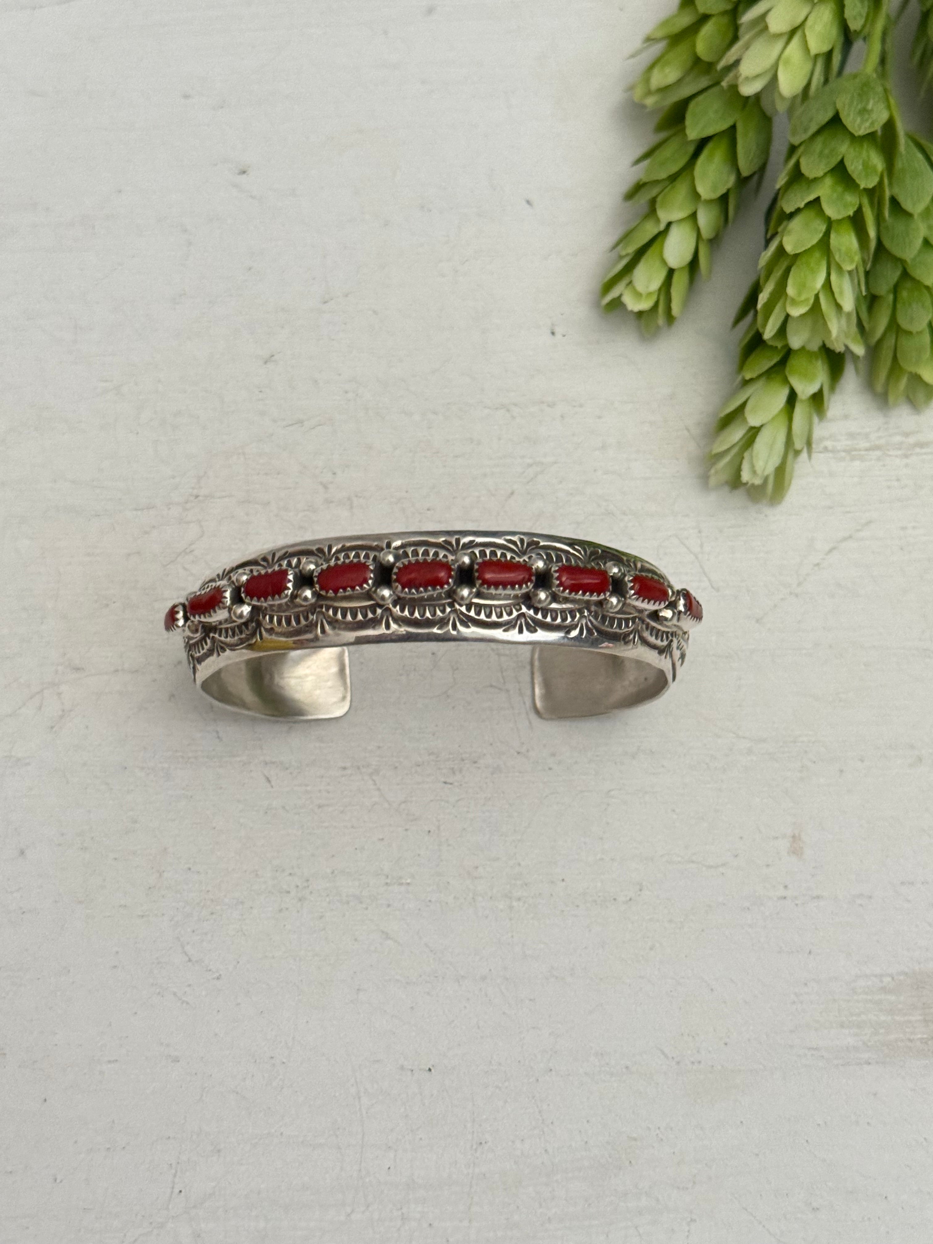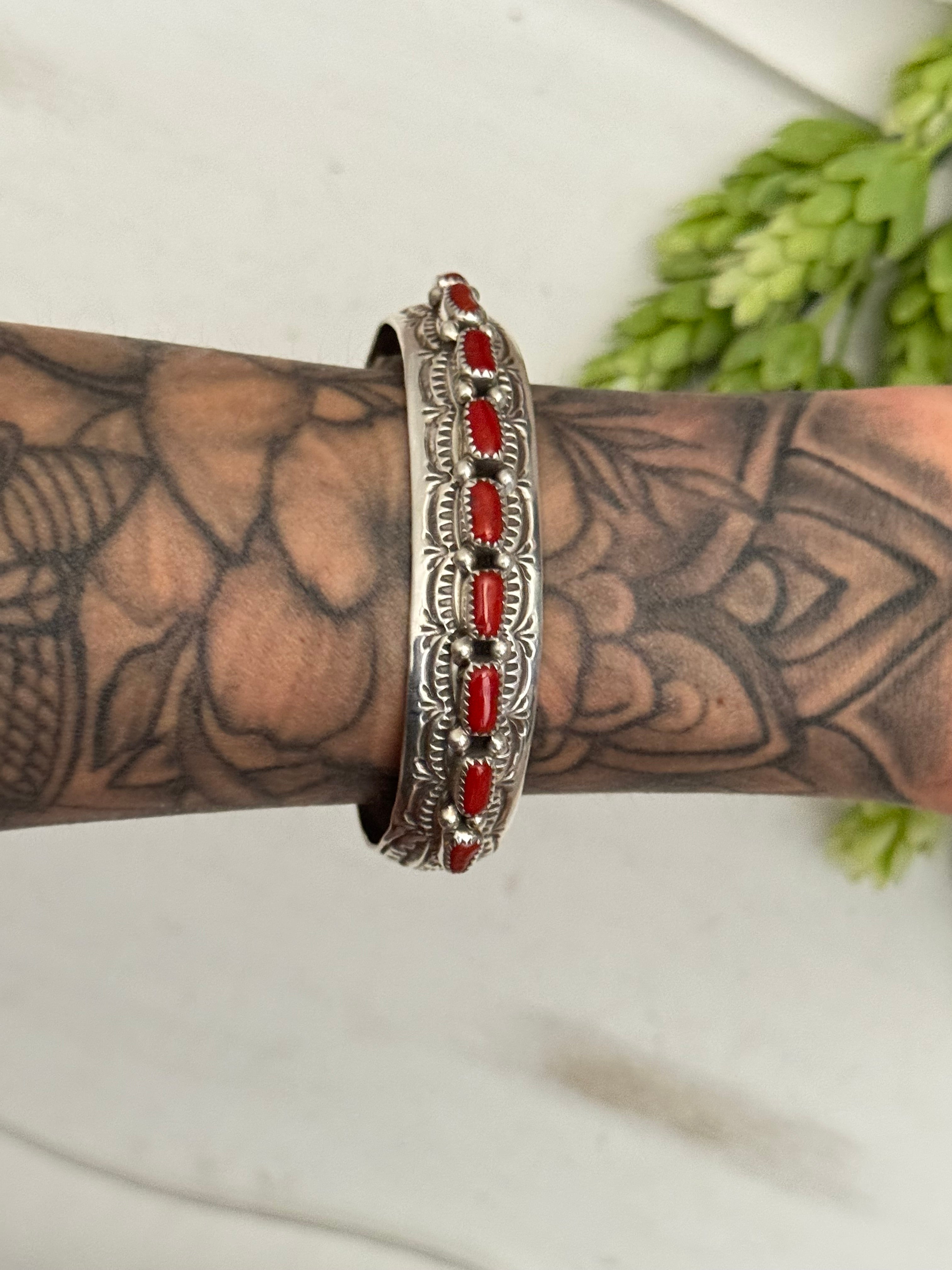 Navajo Made Coral & Sterling Silver Cuff Bracelet