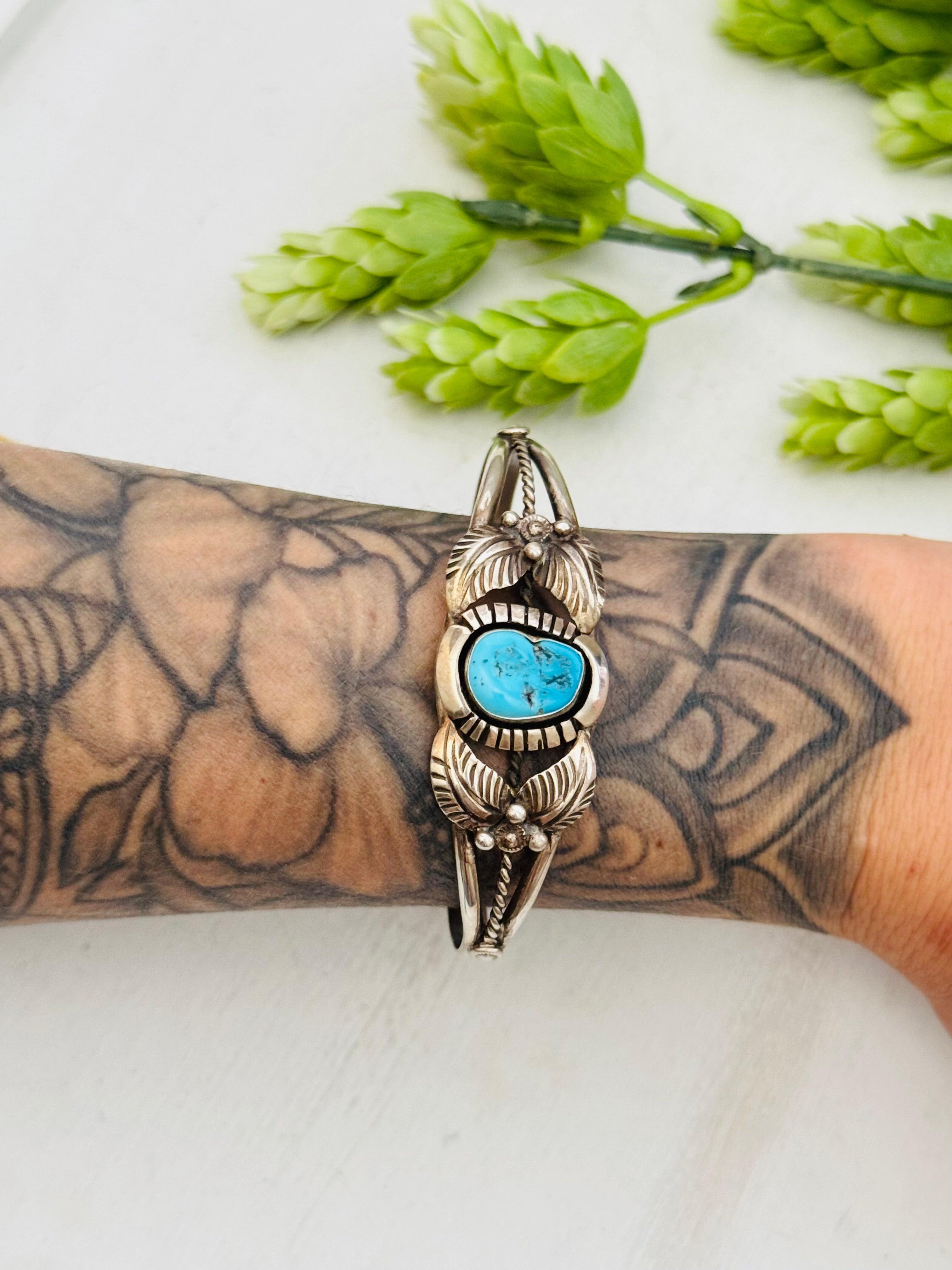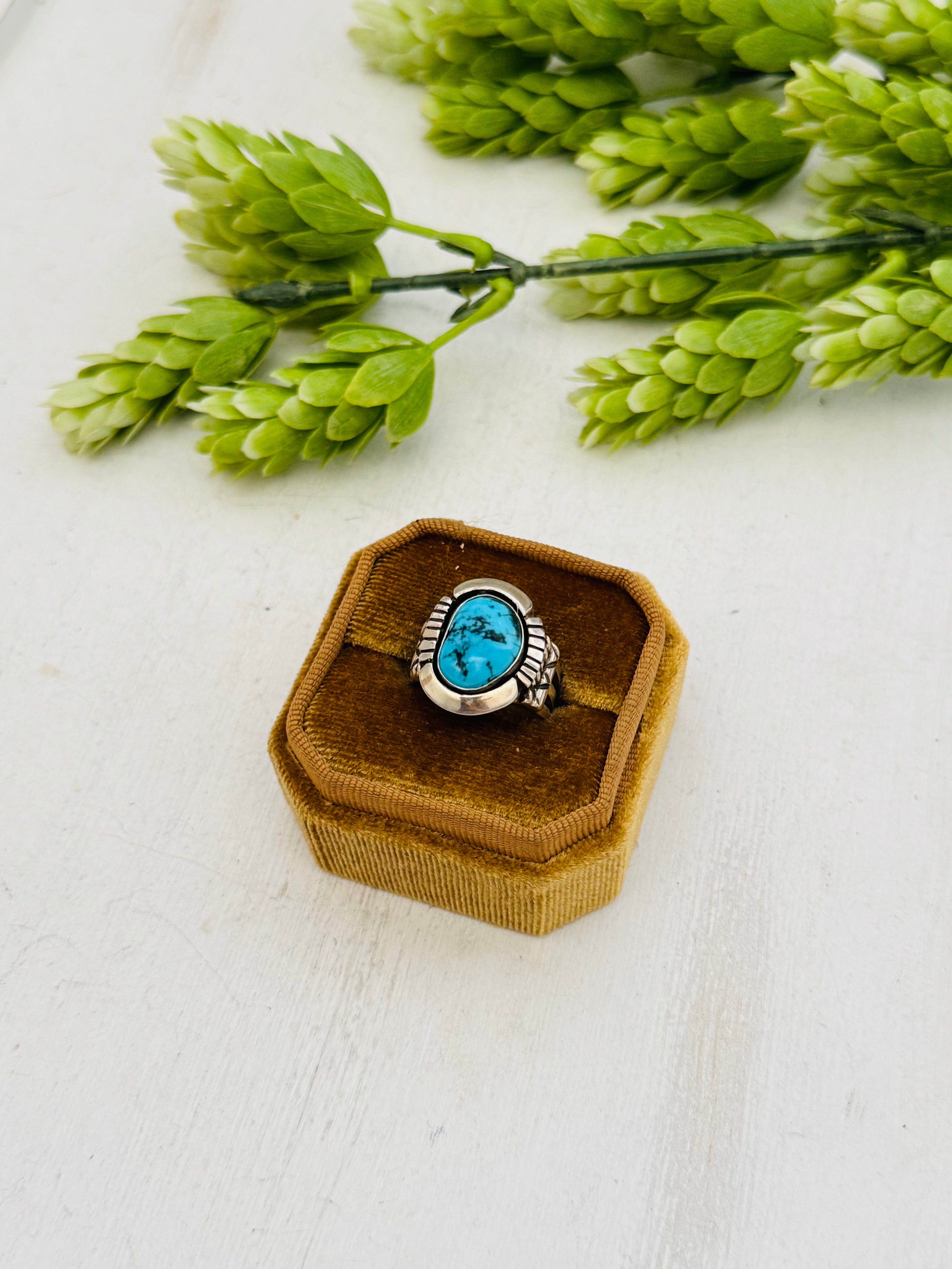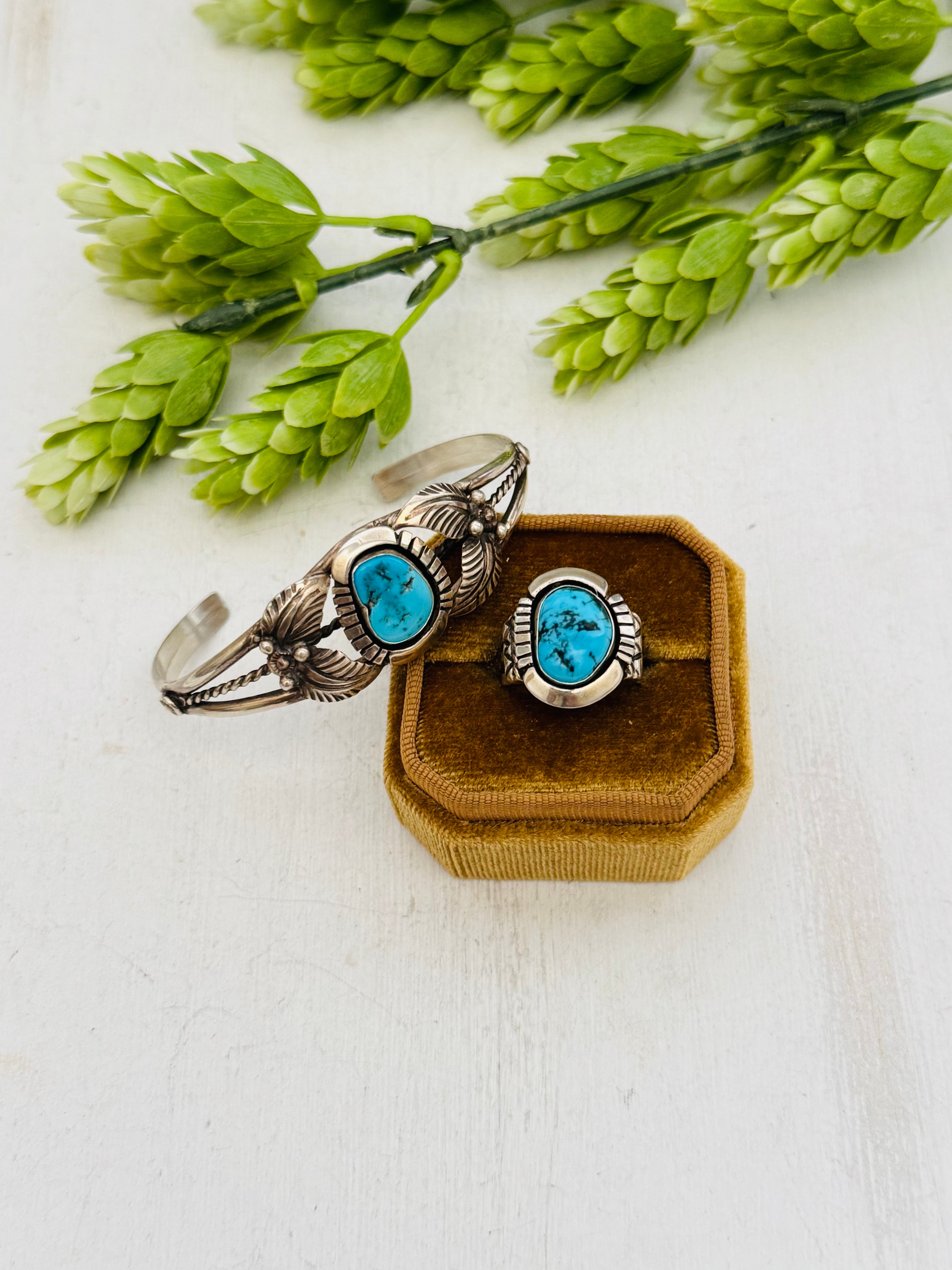 Navajo Made Kingman Turquoise & Sterling Silver Cuff Bracelet & Ring Size 7.5