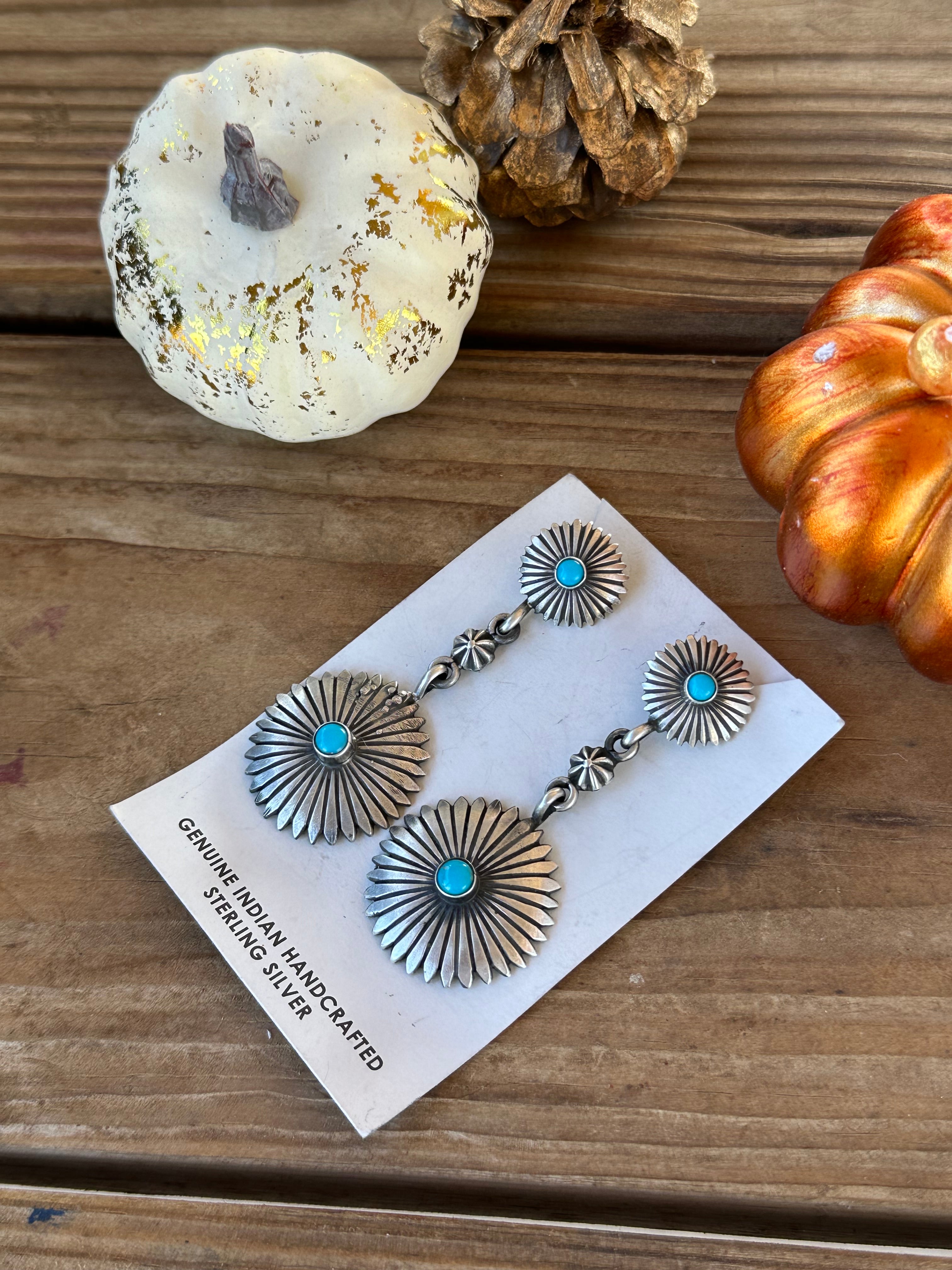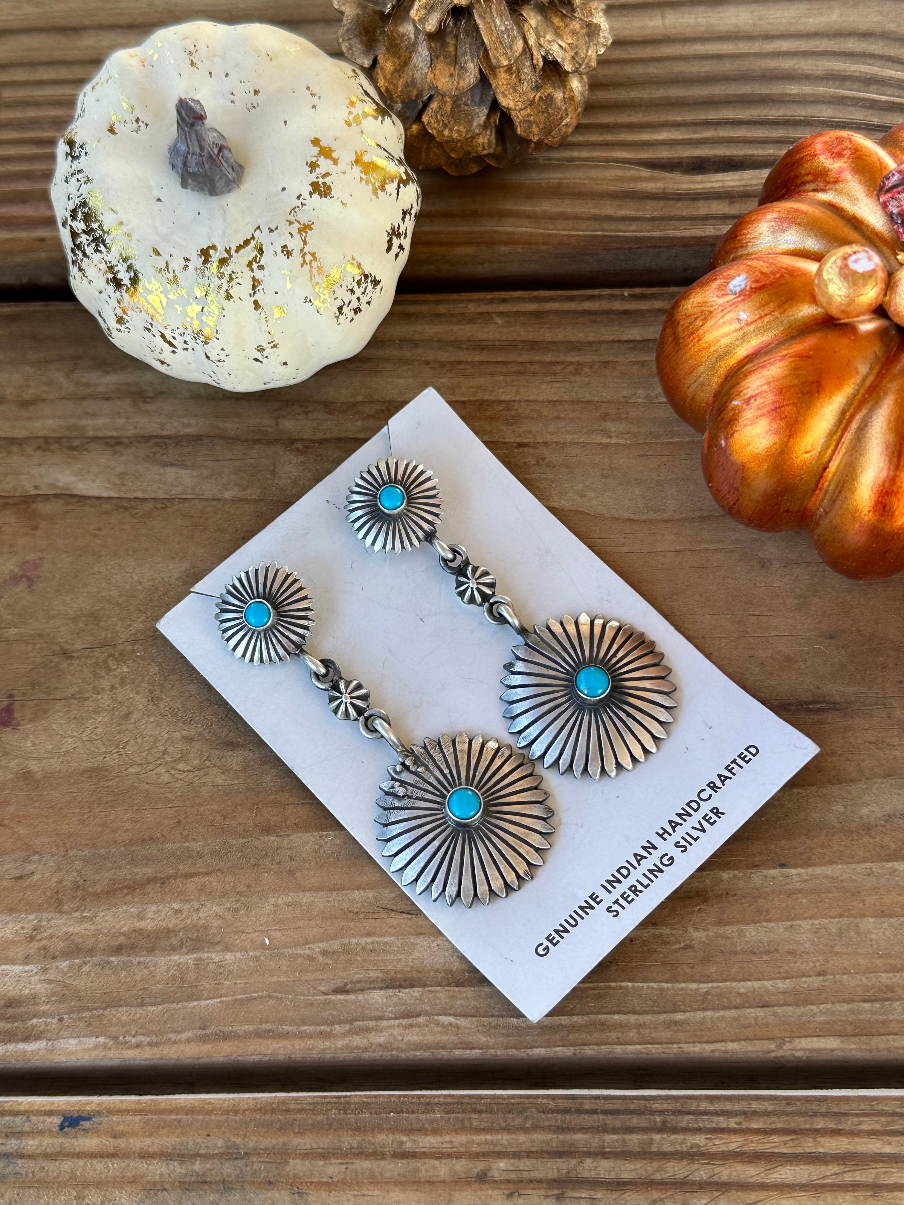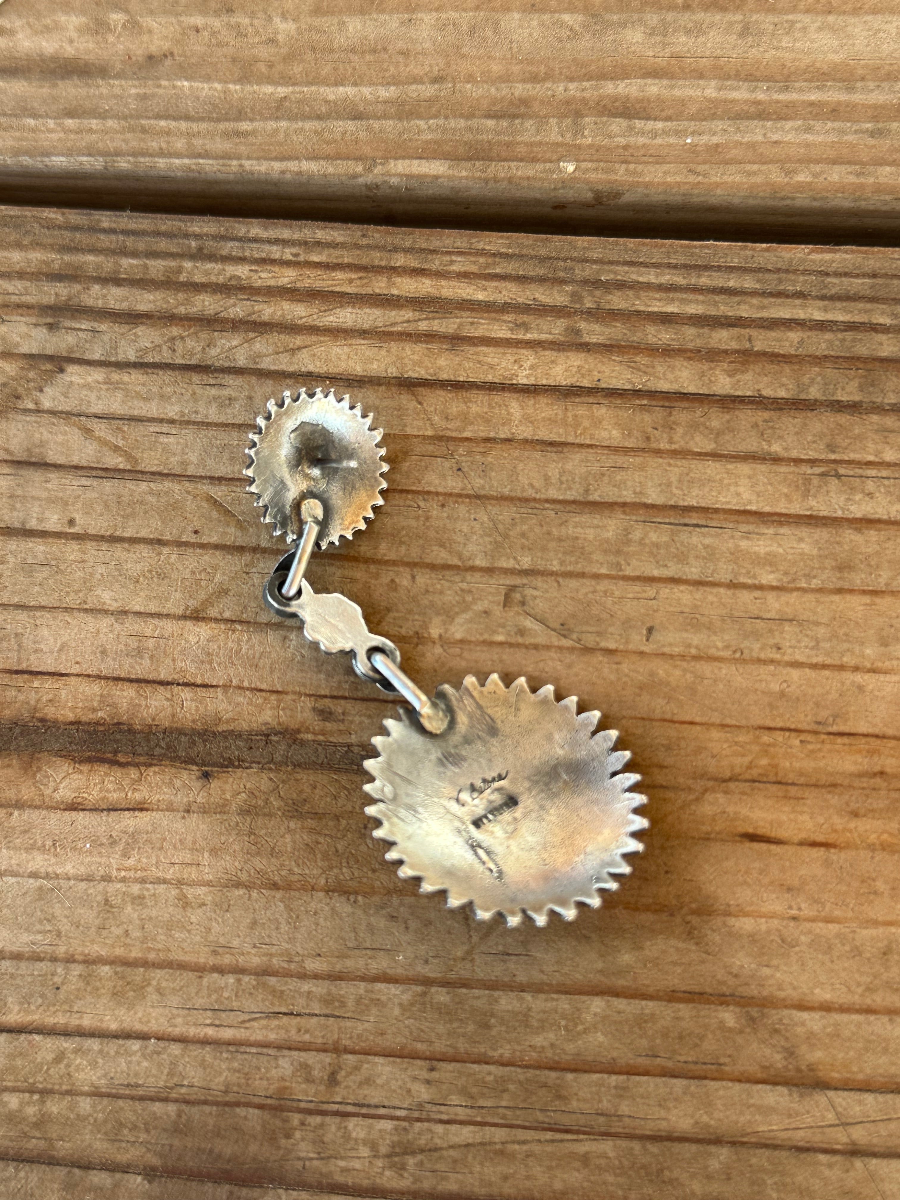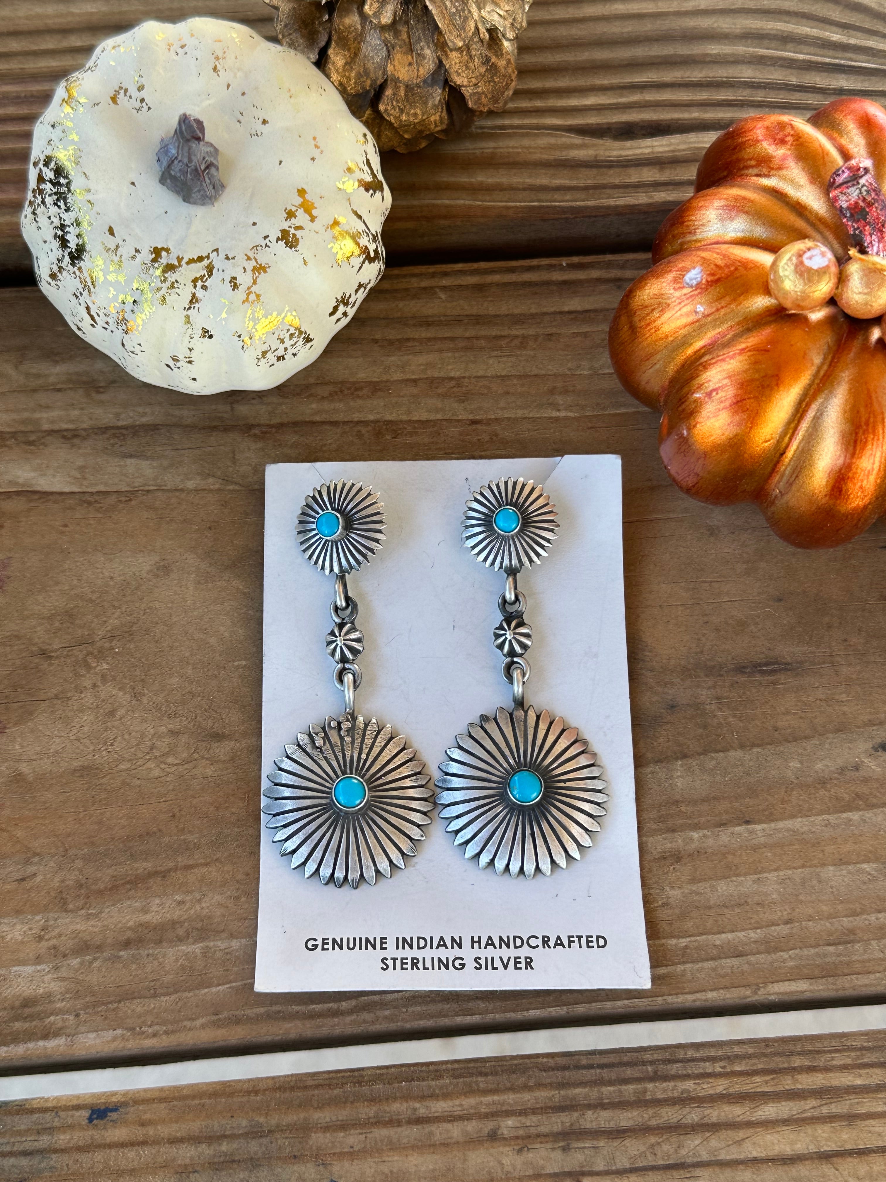 Navajo Made Kingman Turquoise & Sterling Silver Dangle Concho Earrings