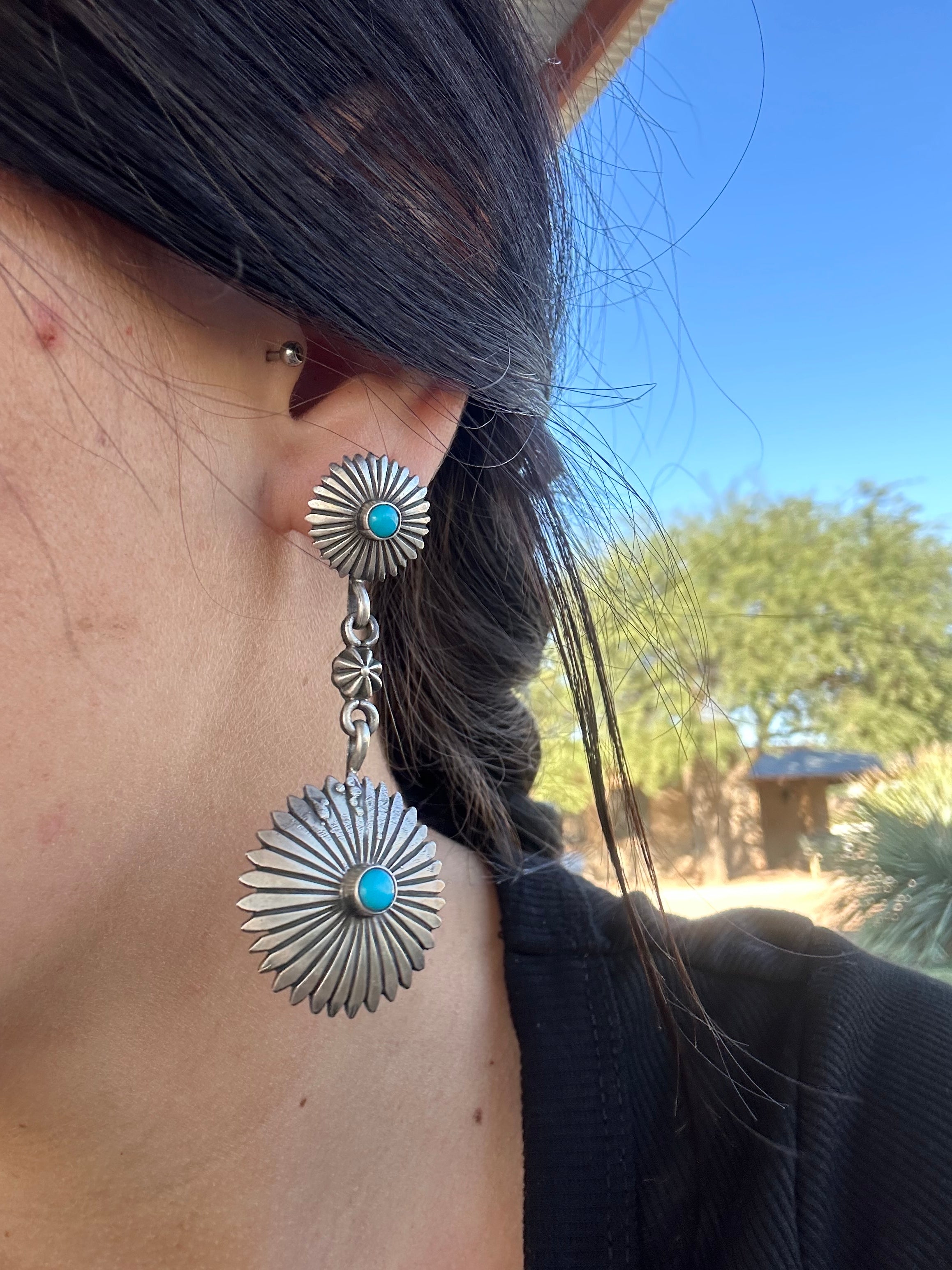 In love with these everyday dangle earrings. Navajo Made Kingman Turquoise & Sterling Silver Dangle Concho Earrings. It measures 2 1/2 inches long and just over 1 inch wide. Stamped and signed.