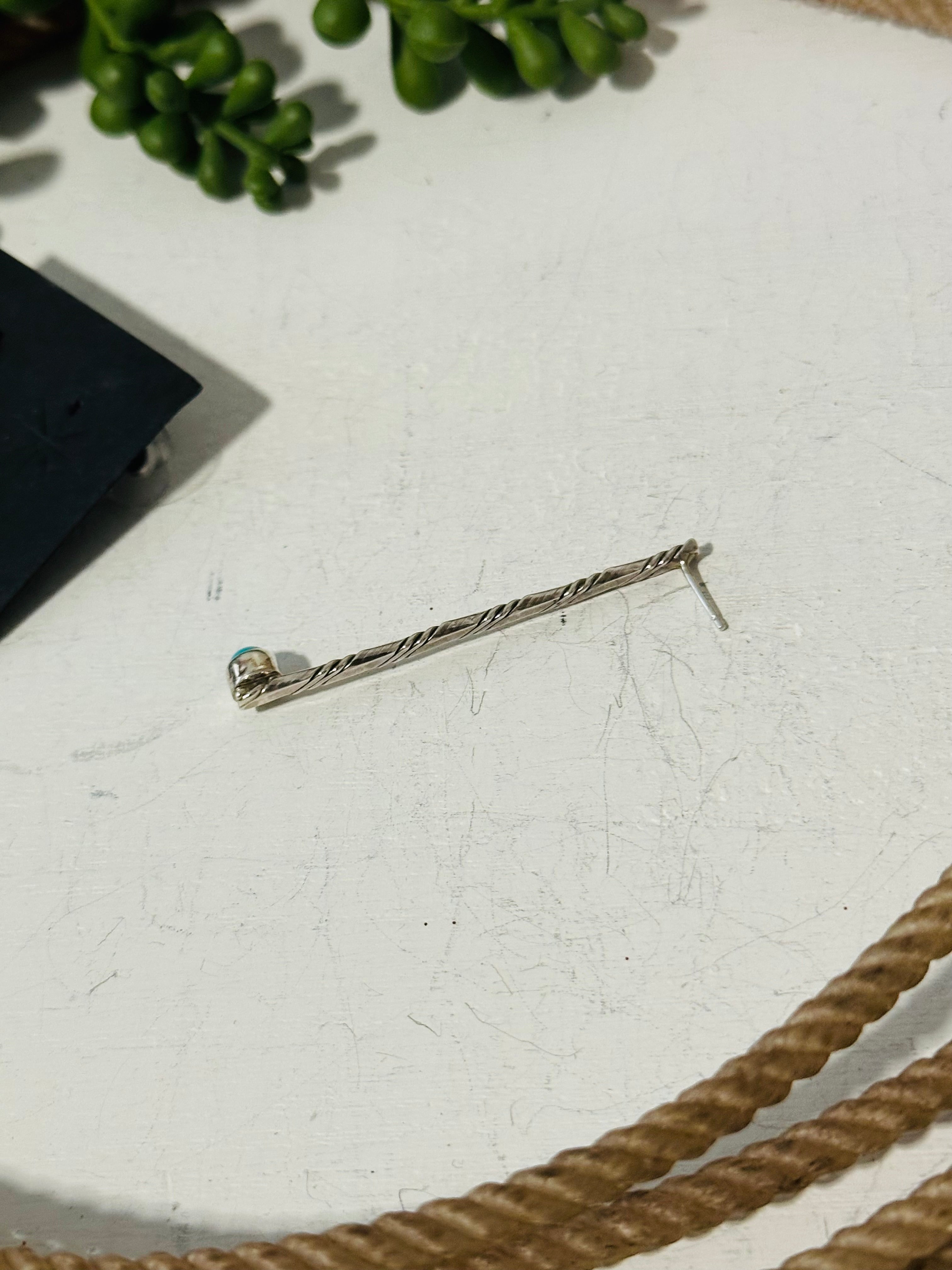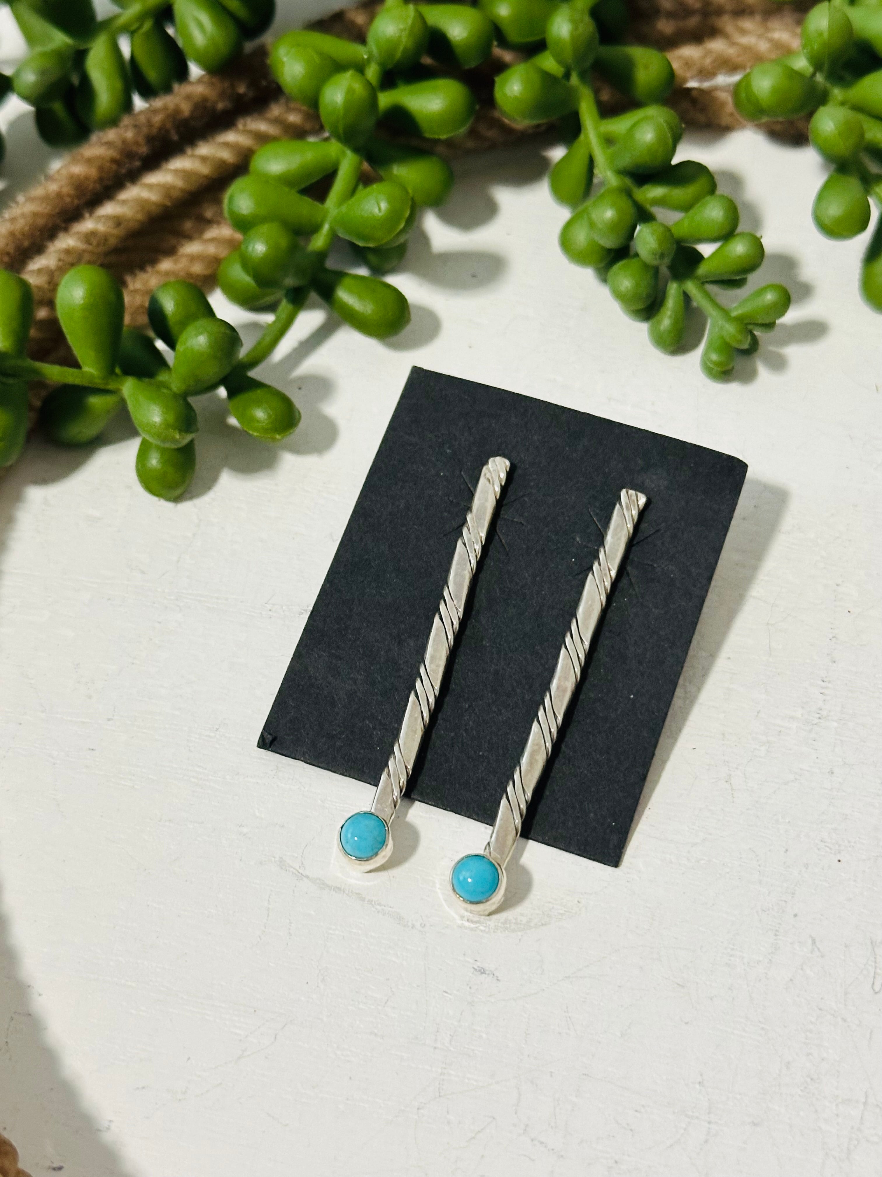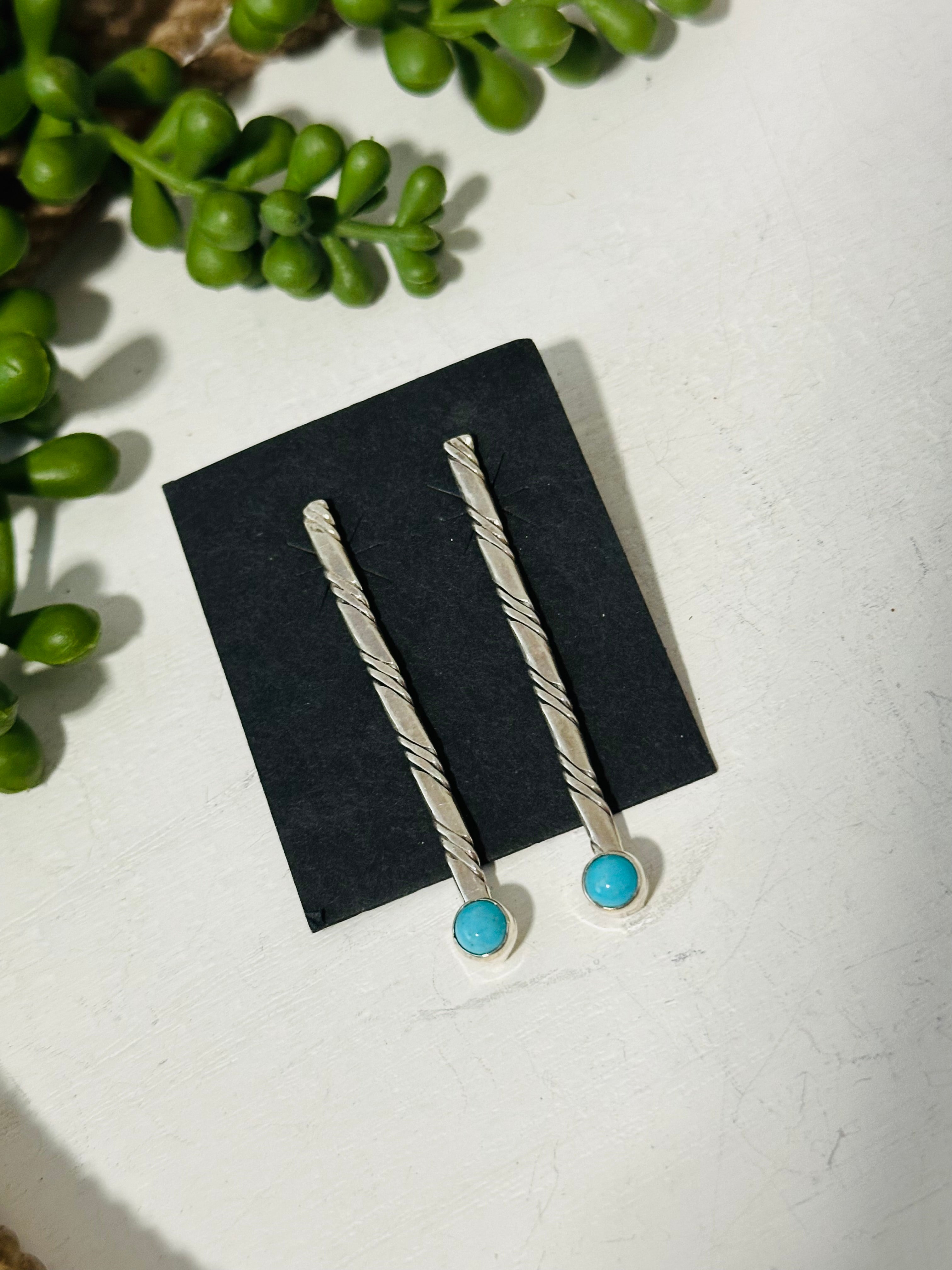 Beautiful dangle earrings. Navajo Made Kingman Turquoise & Sterling Silver Dangle Earrings. It measures 2 1/8 inches long and 1/8 of an inch wide . Signed and stamped.