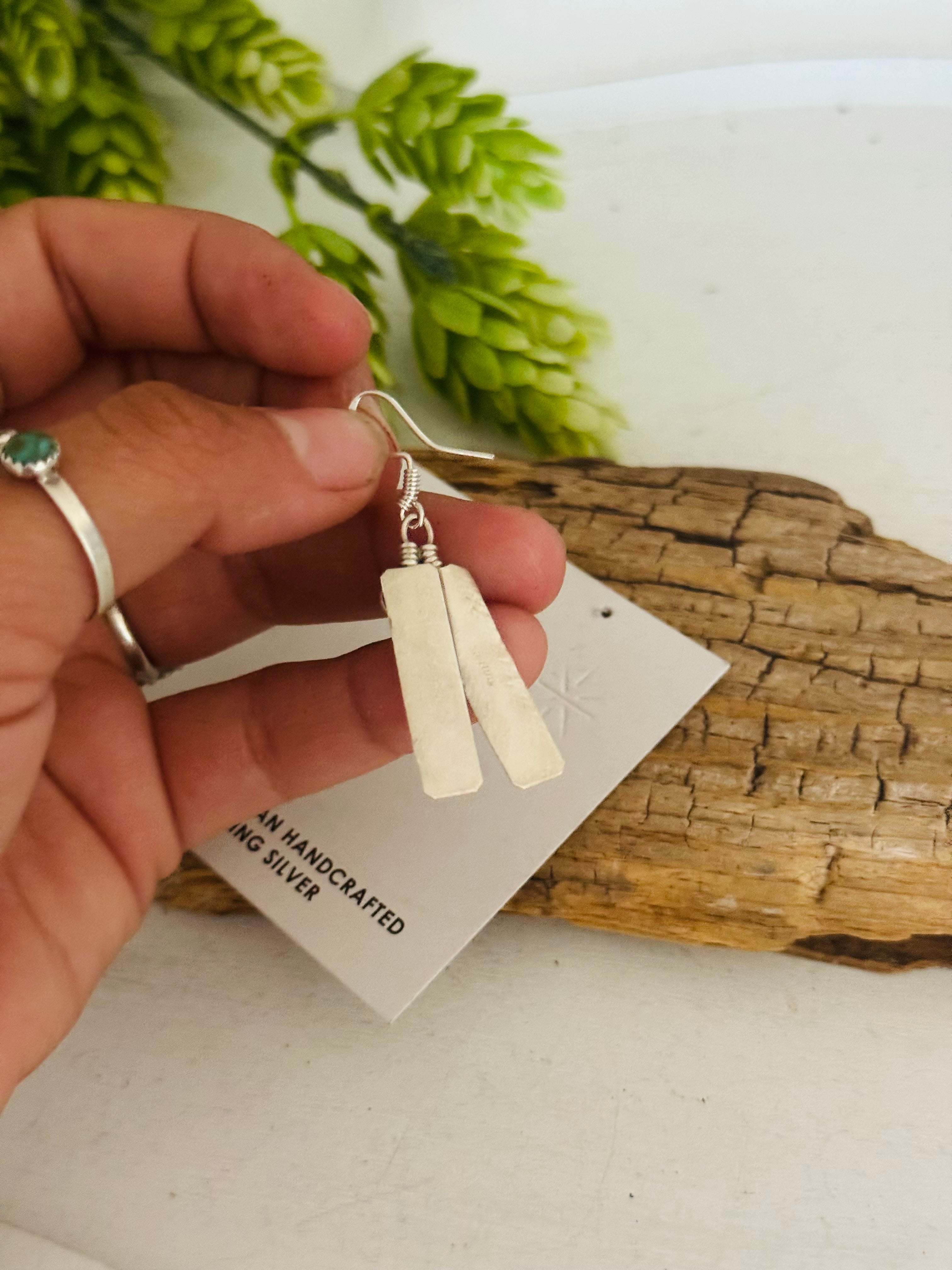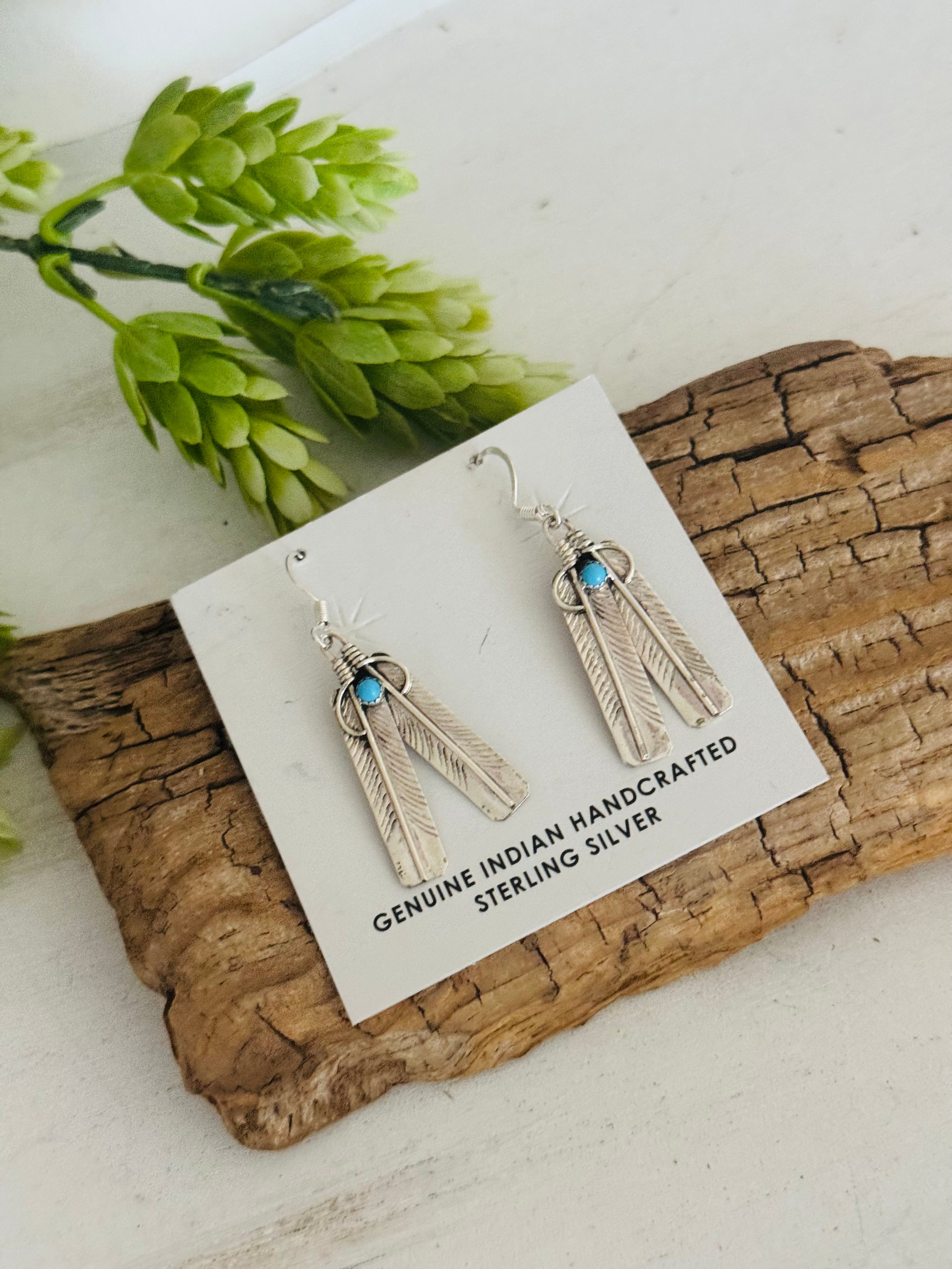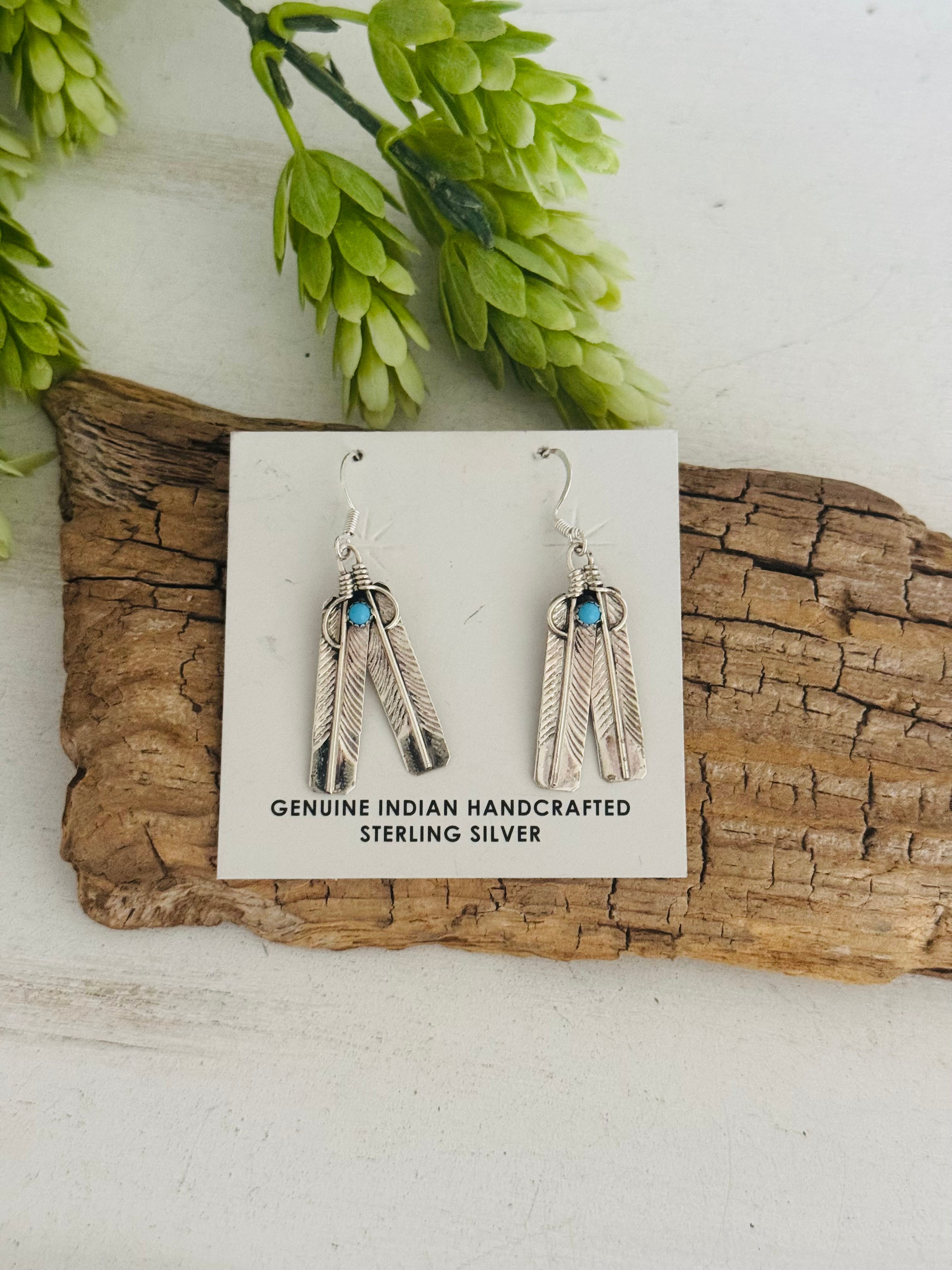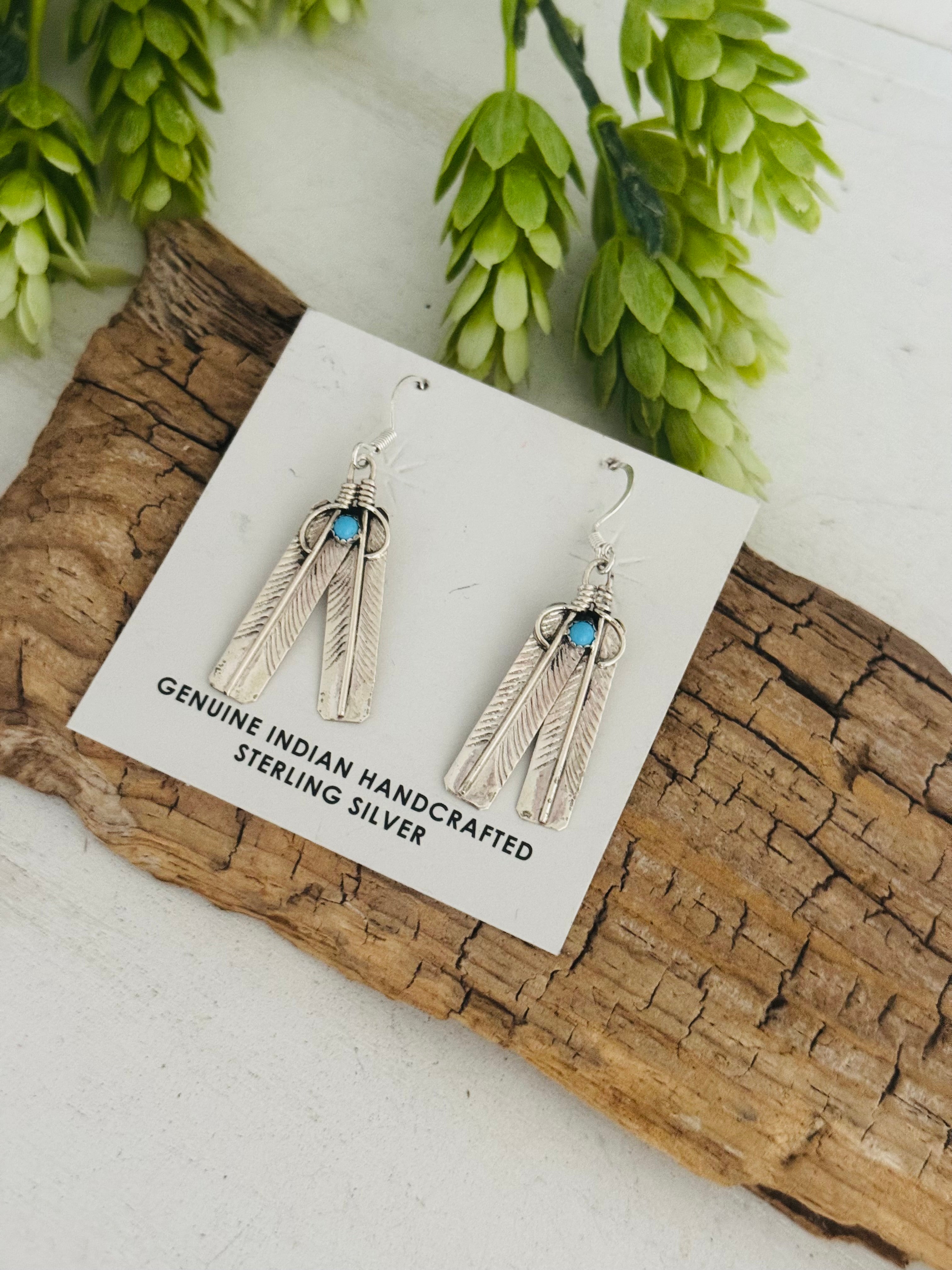 Navajo Made Kingman Turquoise & Sterling Silver Dangle Feather Earrings