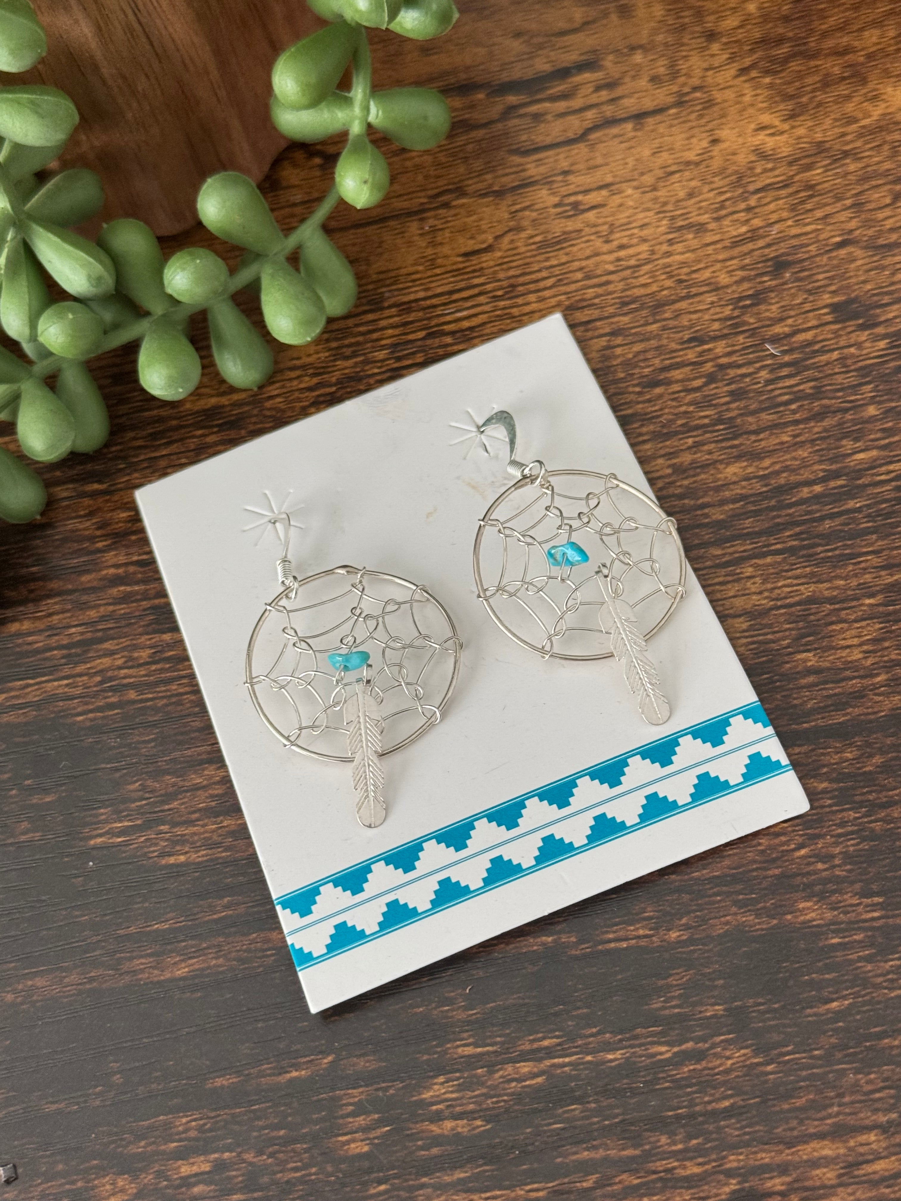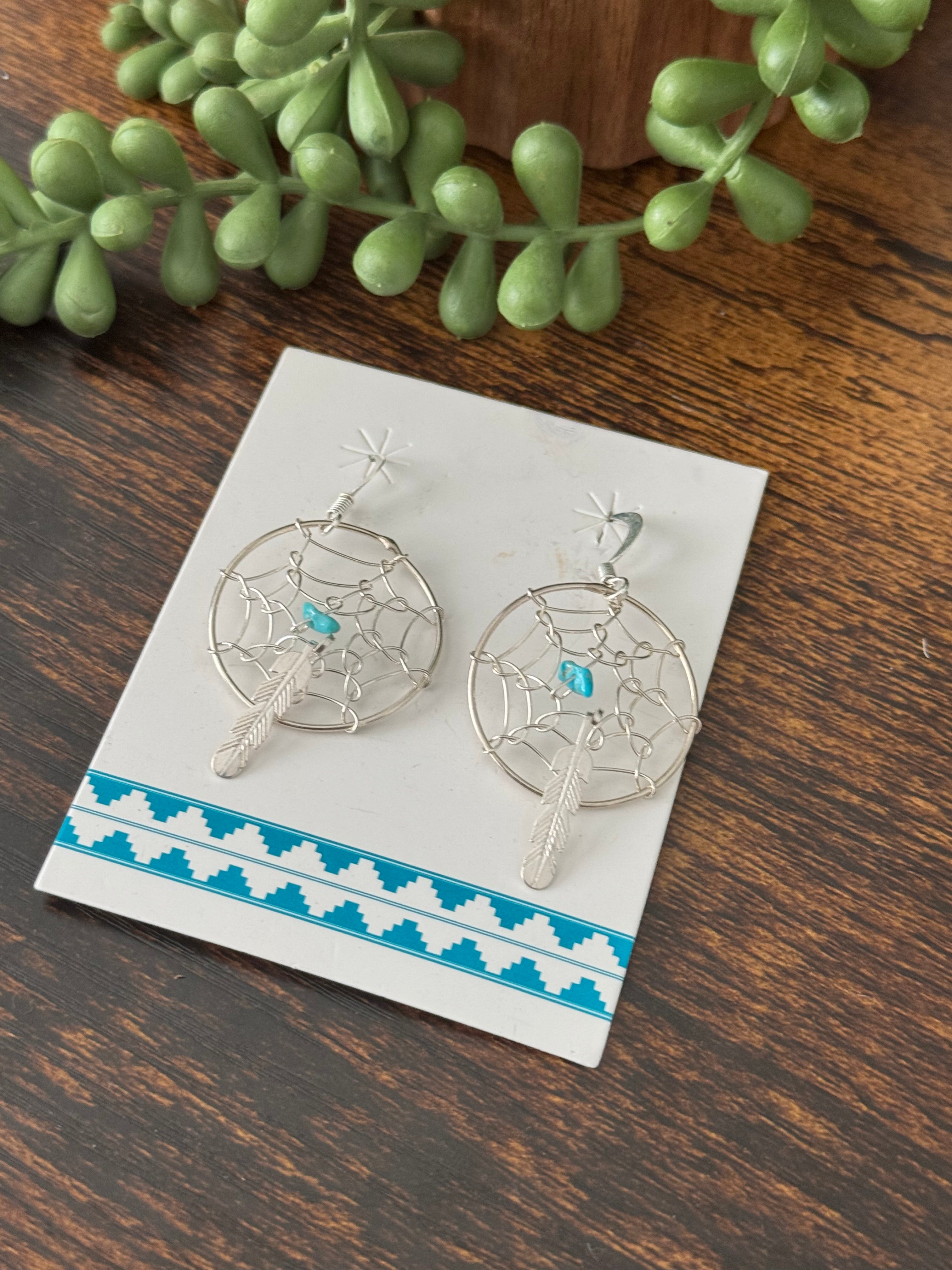 Navajo Made Turquoise & Sterling Silver Dream Catcher Dangle Earrings