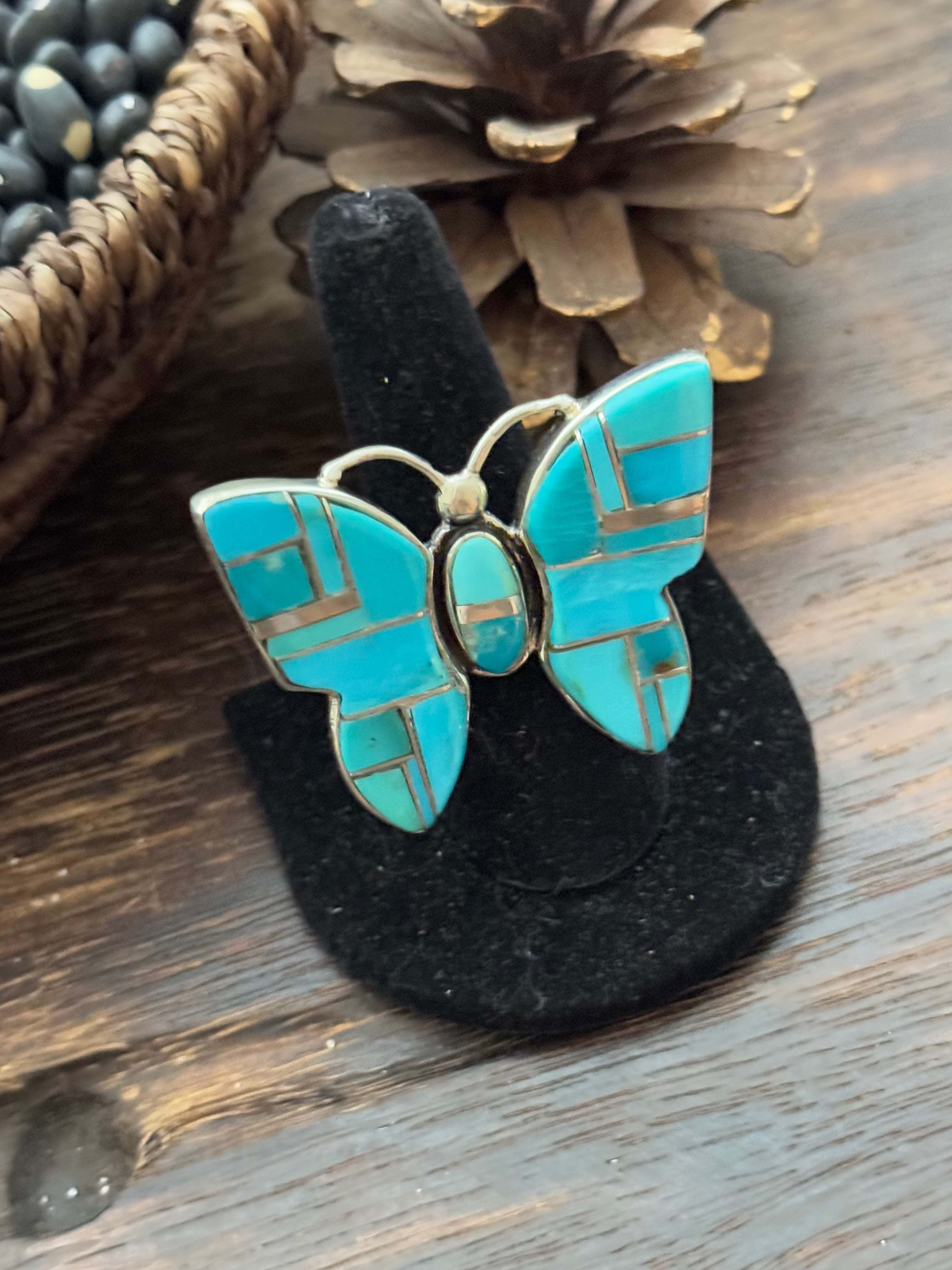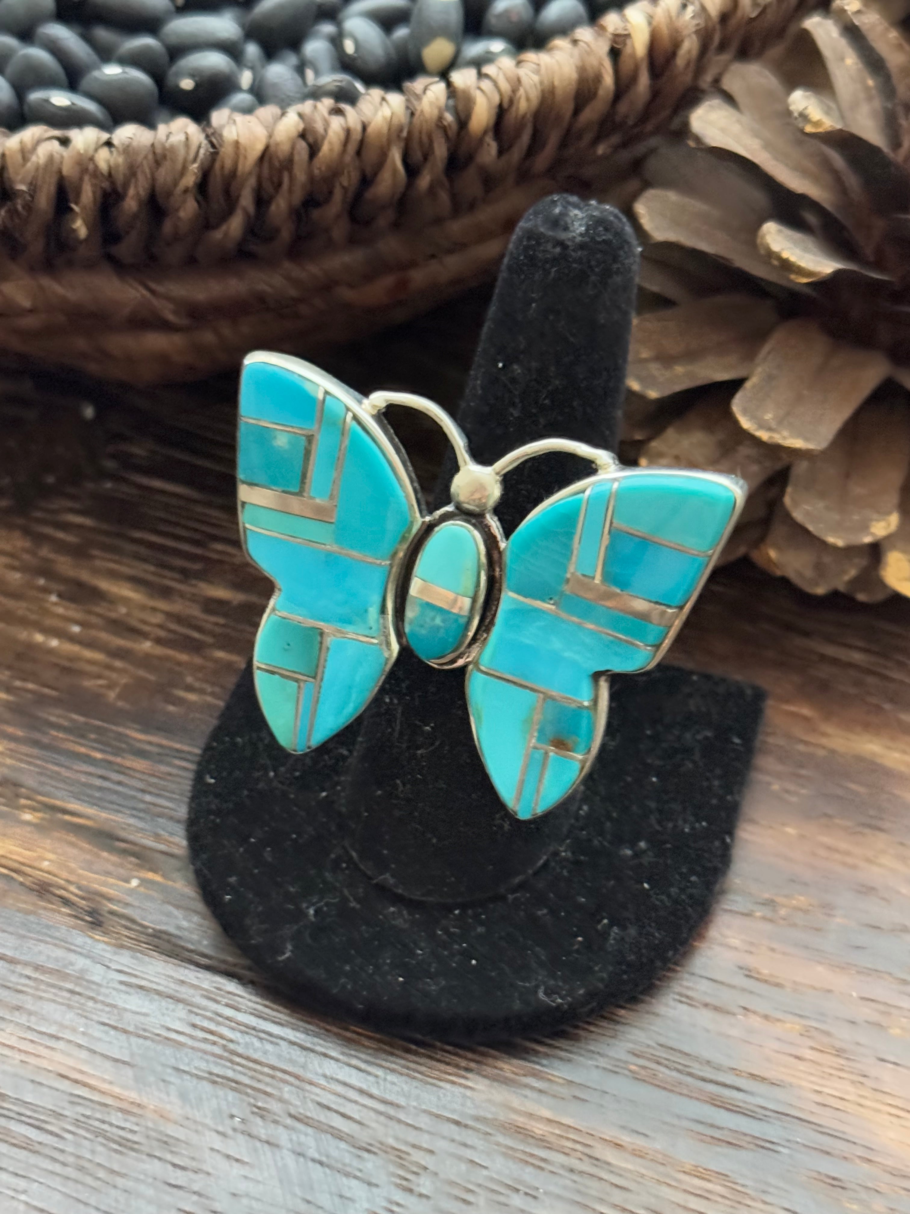 Navajo Made Kingman Turquoise & Sterling Silver Inlay Adjustable Butterfly Ring