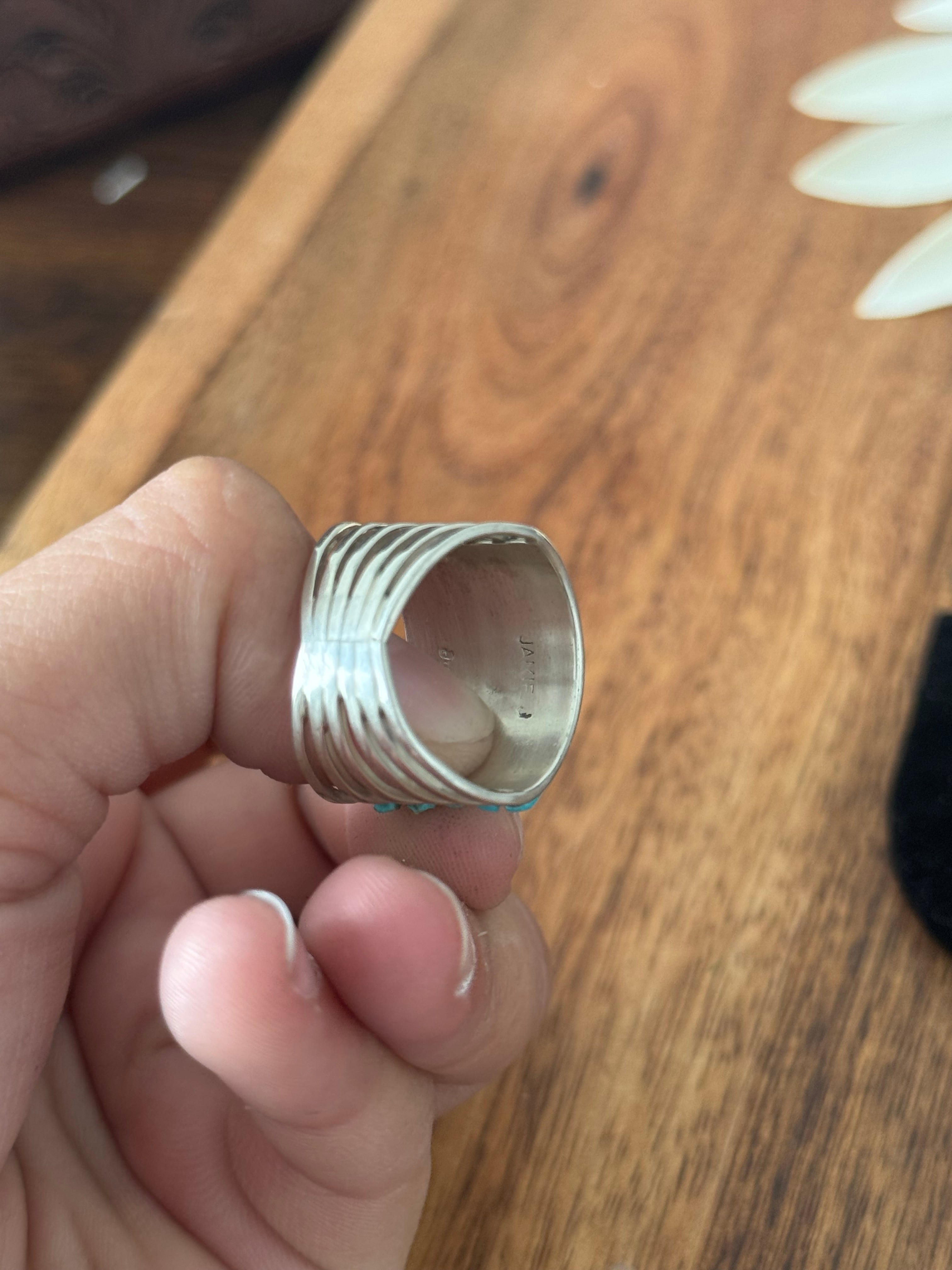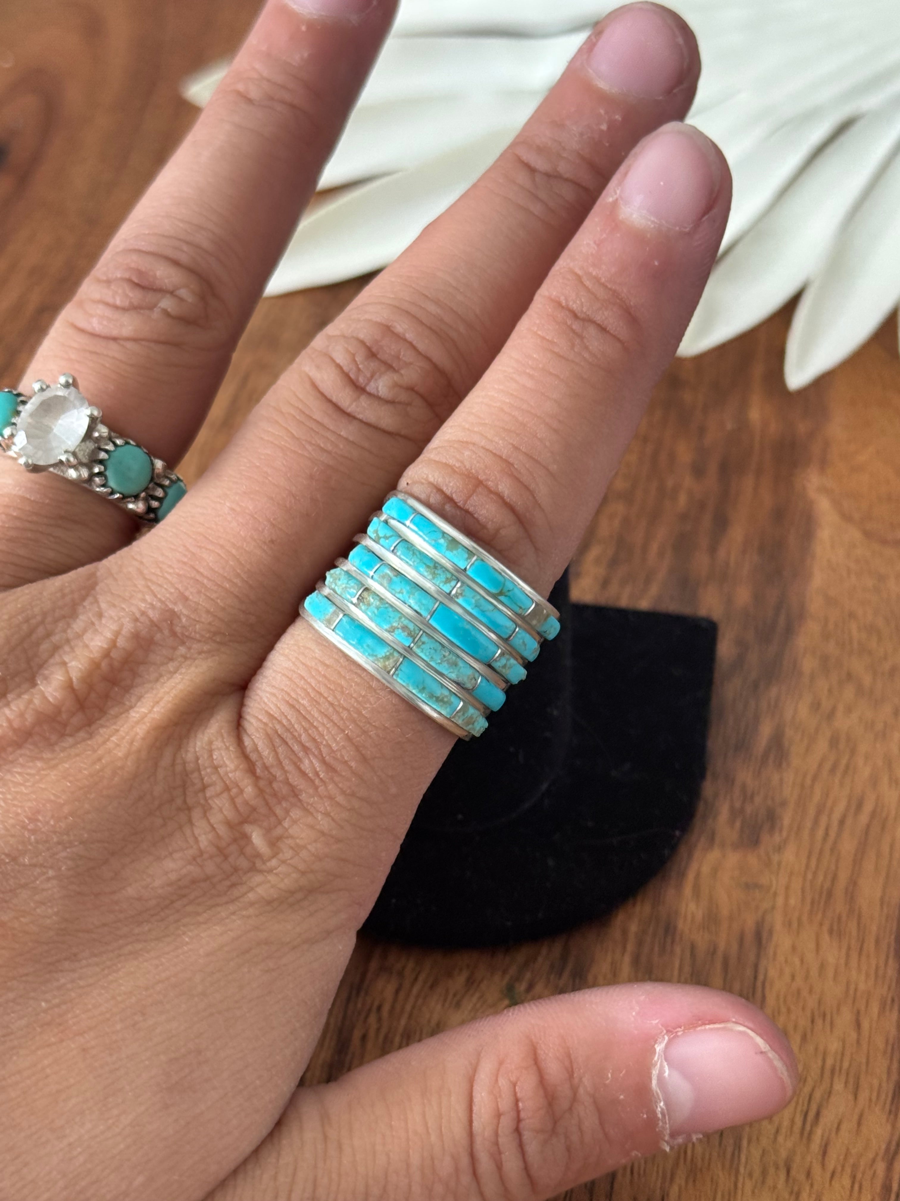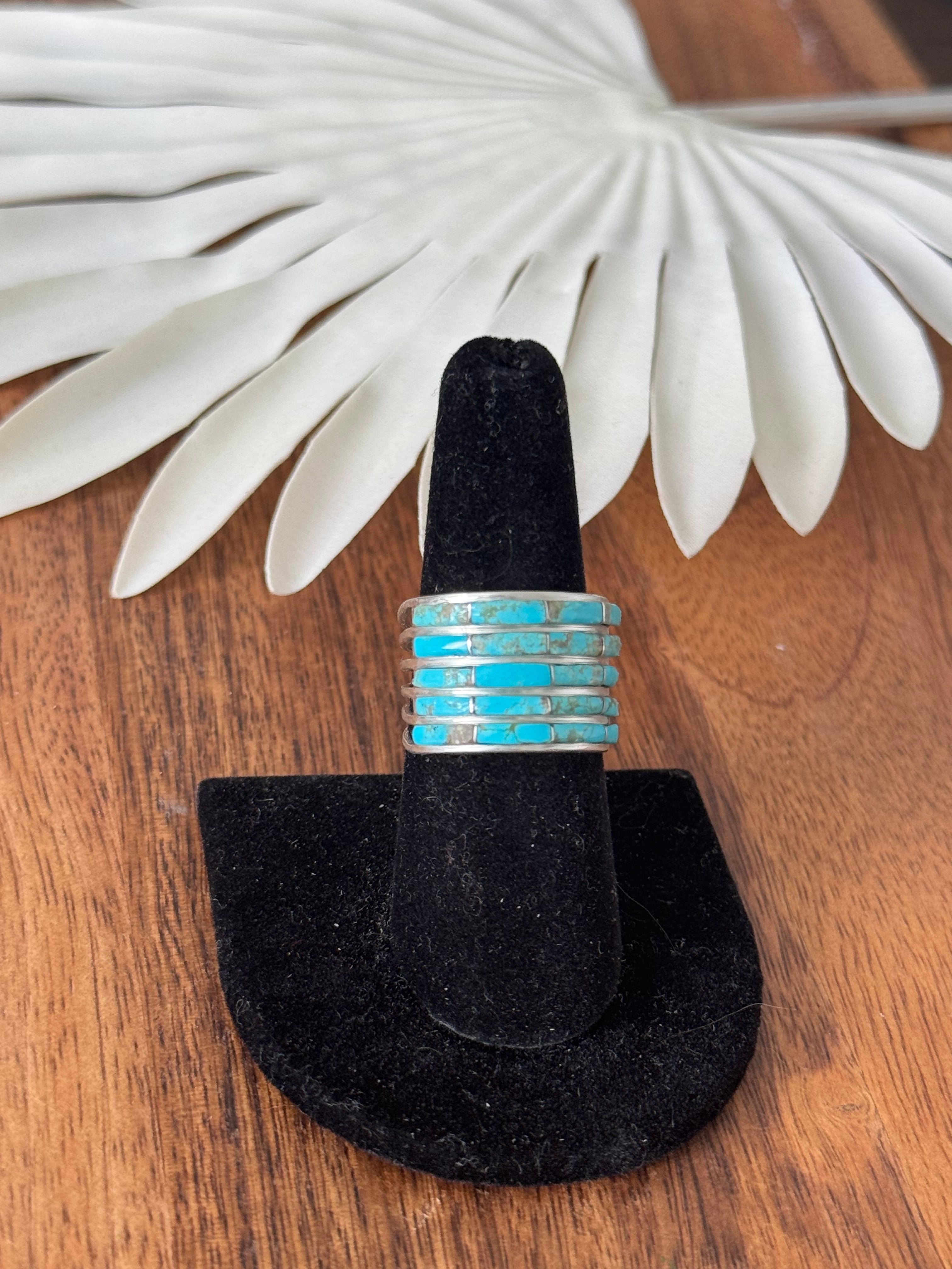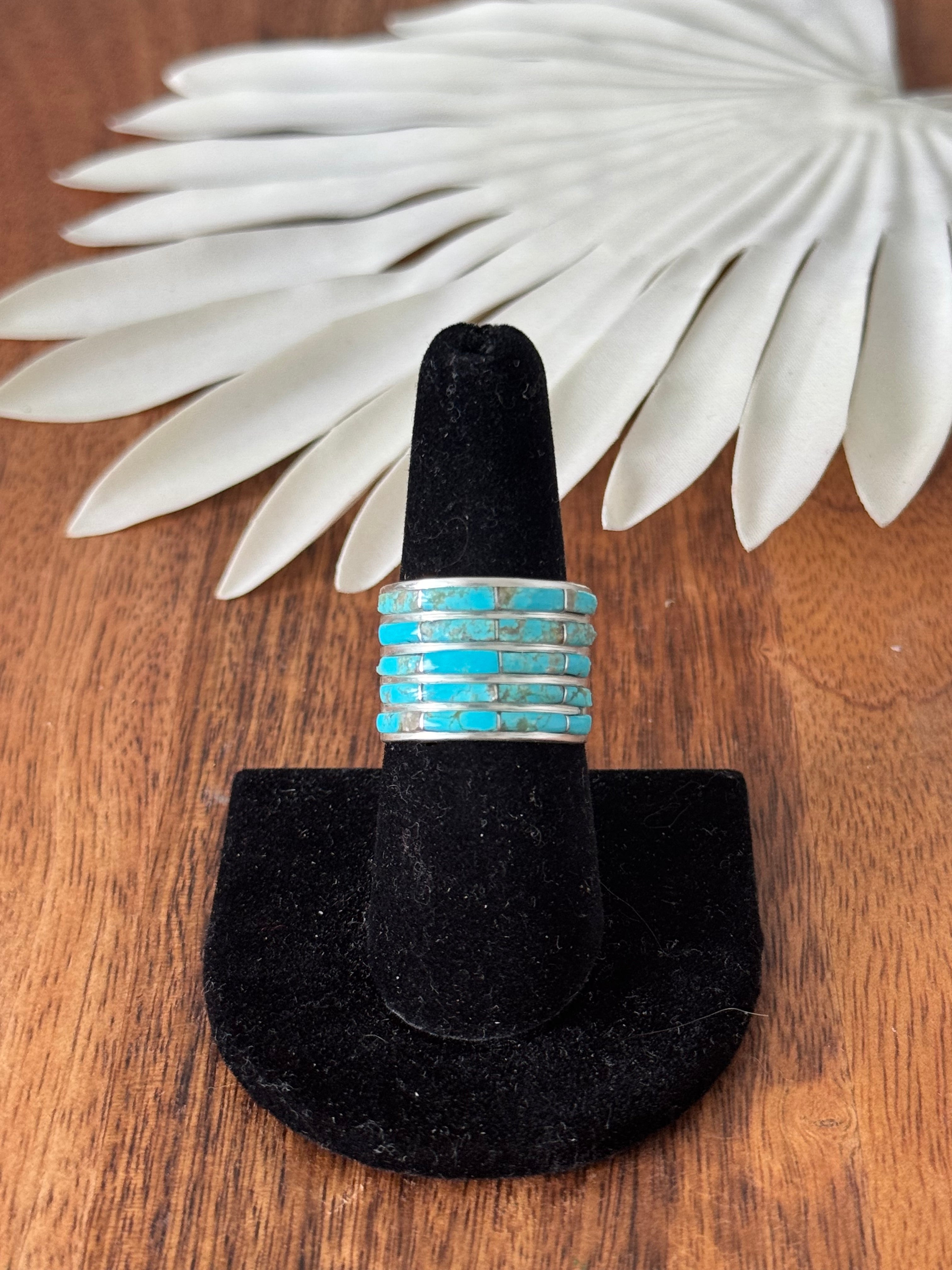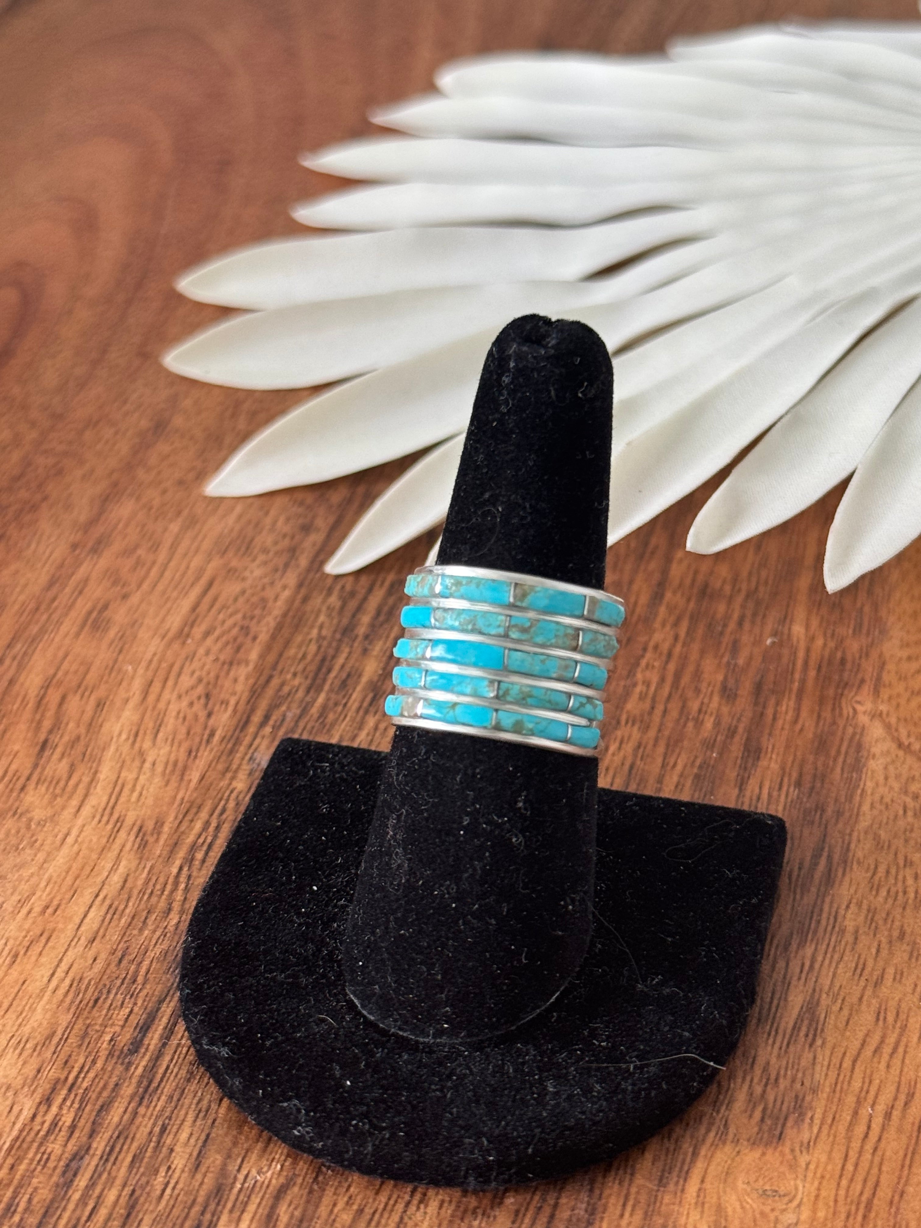 This is an awesome ring. Navajo Made Kingman Turquoise & Sterling Silver Inlay Ring. It measures 5/8 of an inch long. Stamped and signed. Stones will vary due to natural stones.
