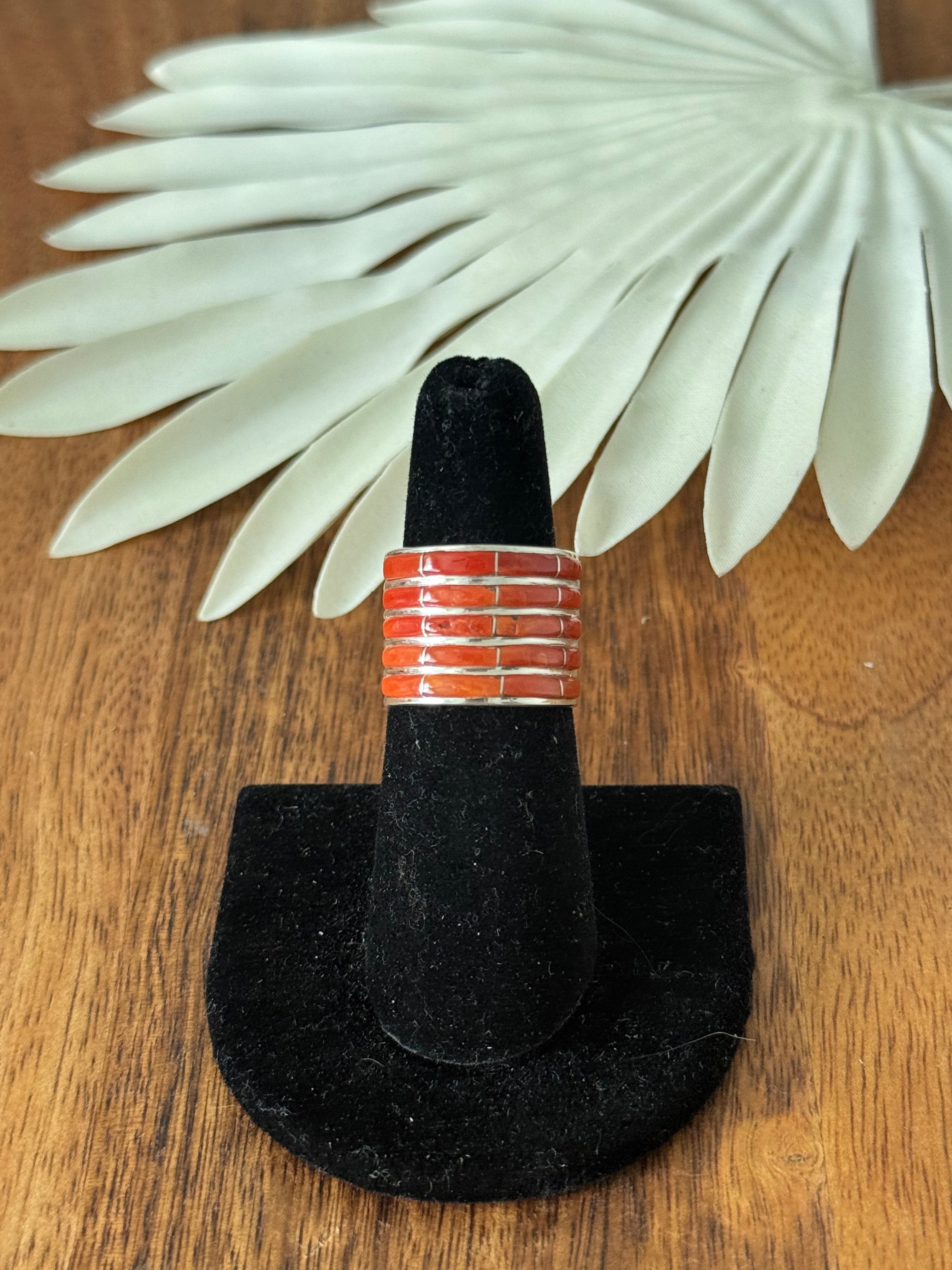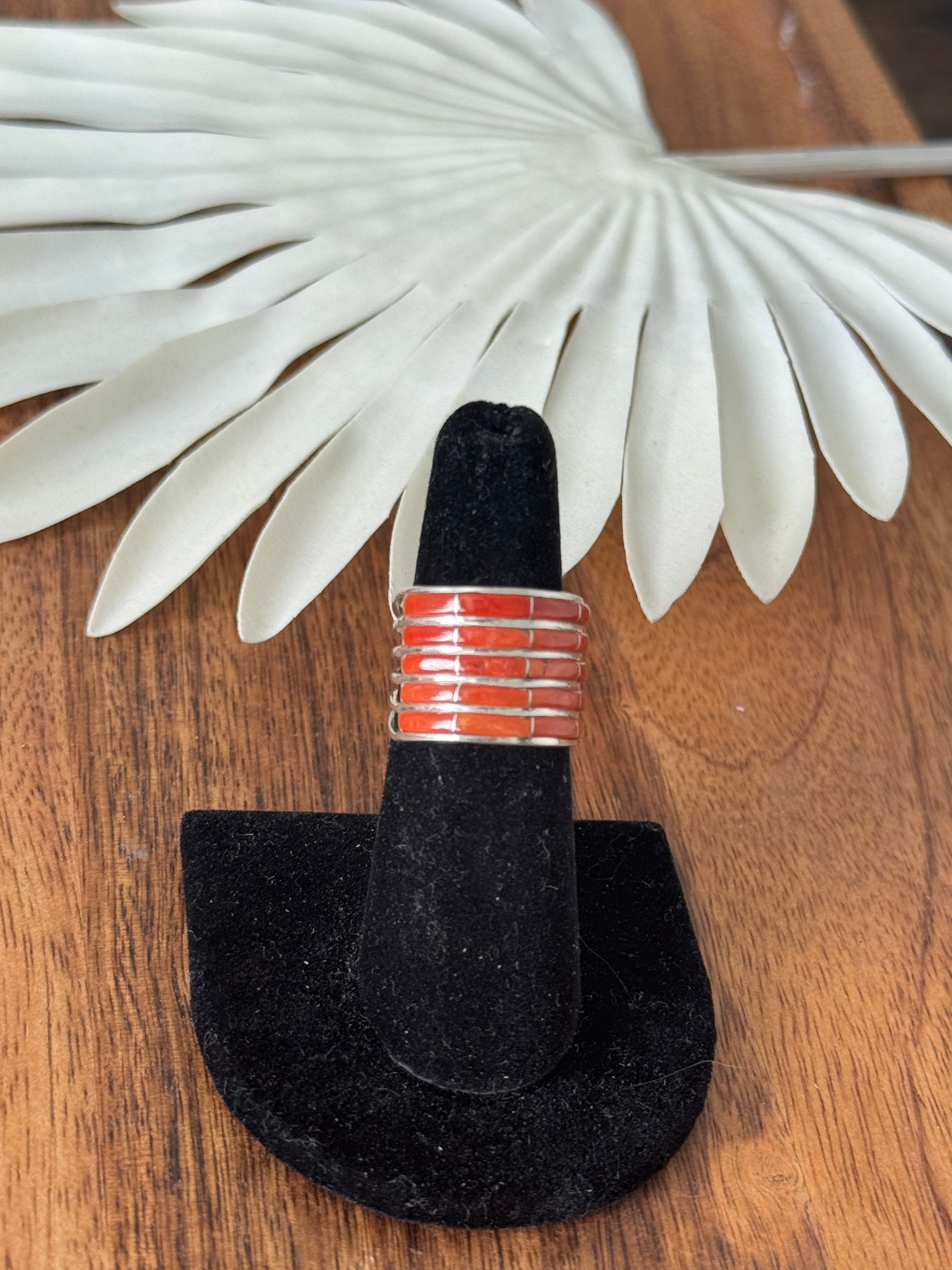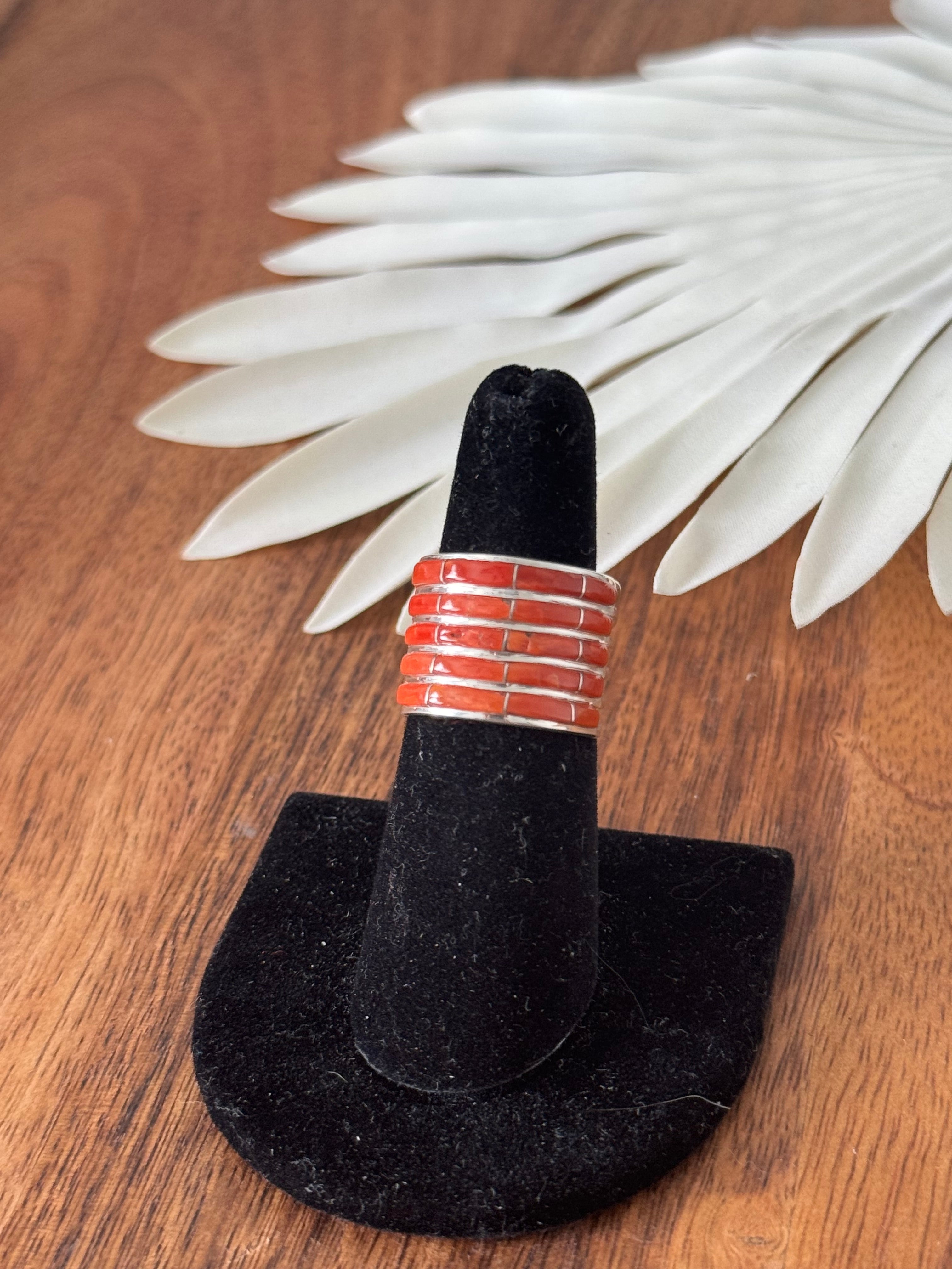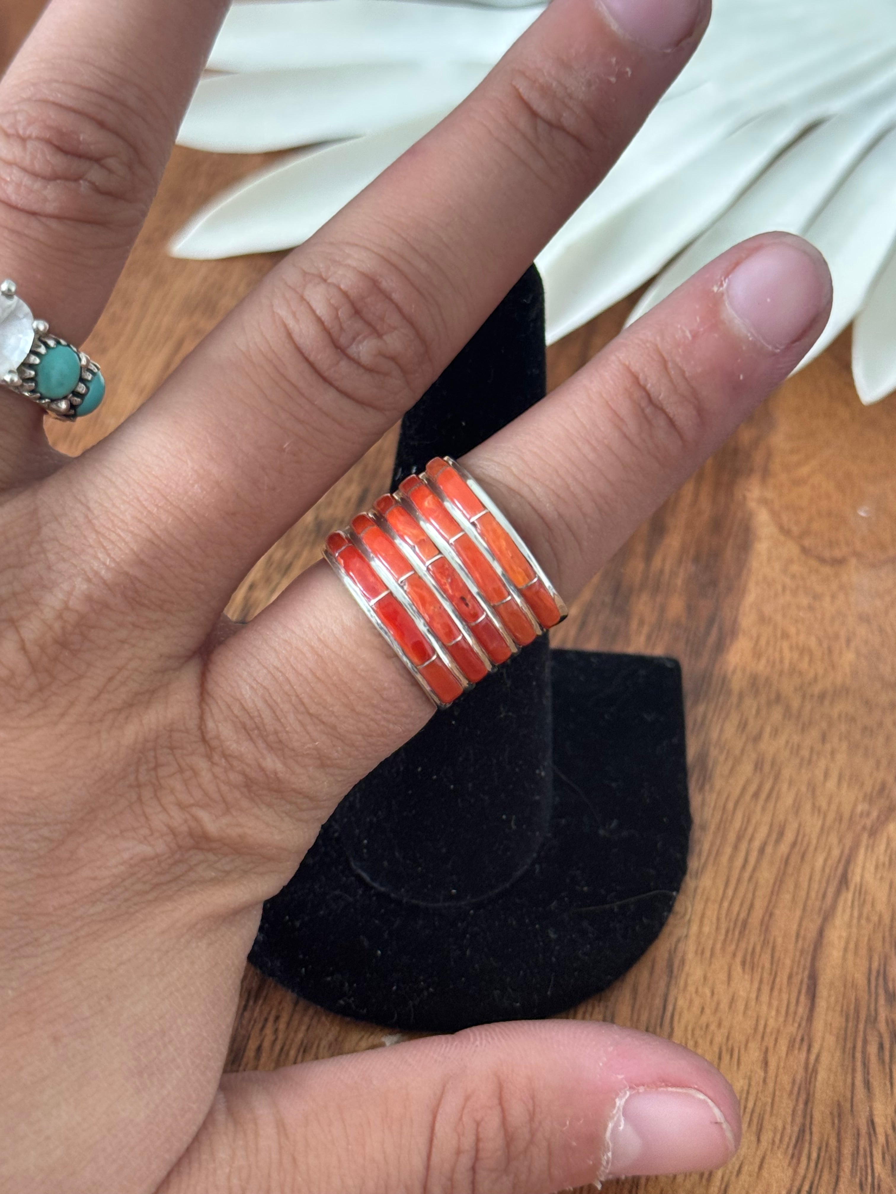 This is an awesome ring. Navajo Made Red Coral & Sterling Silver Inlay Ring. It measures 5/8 of an inch long. Stamped and signed. Stones will vary due to natural stones.