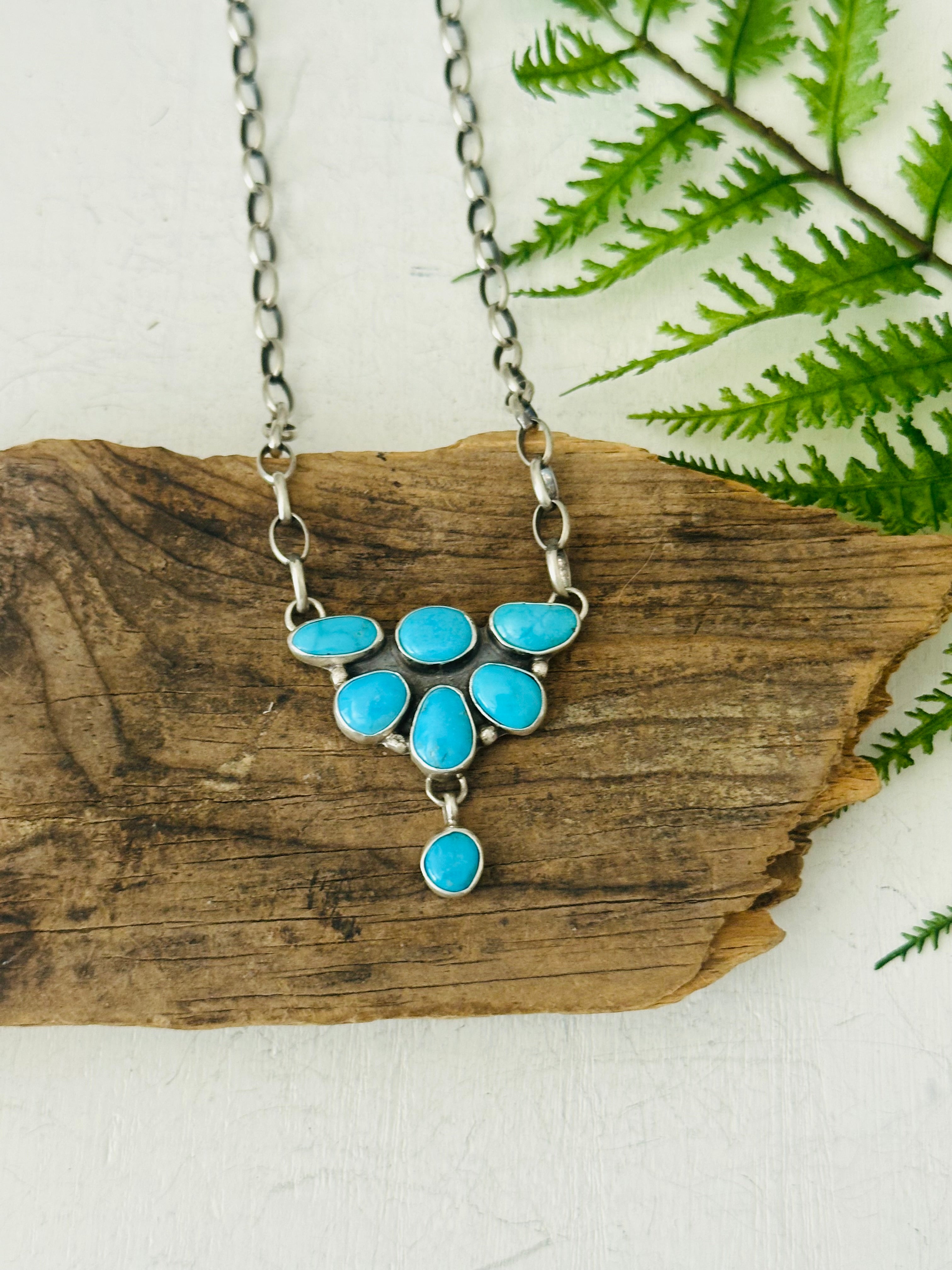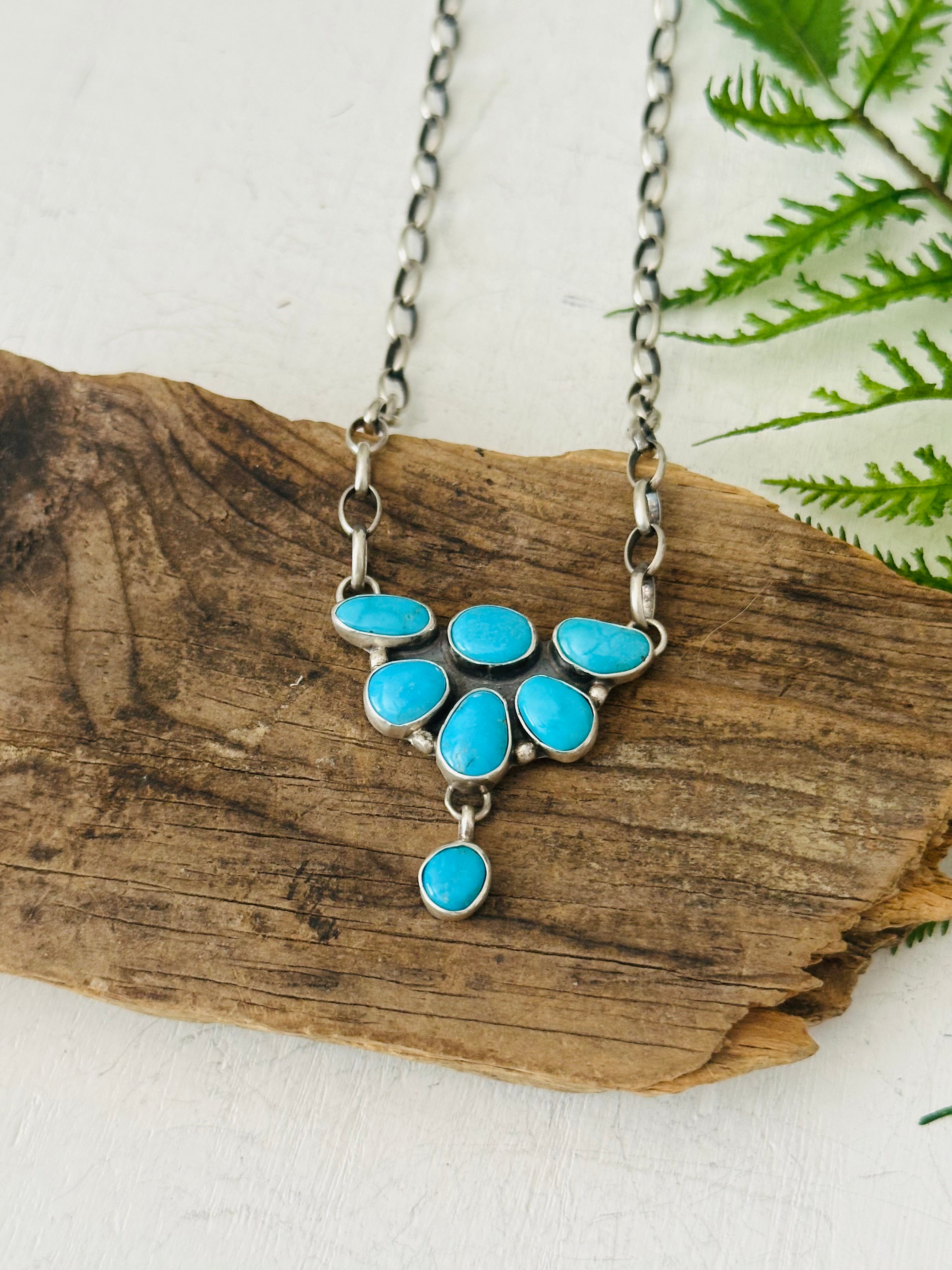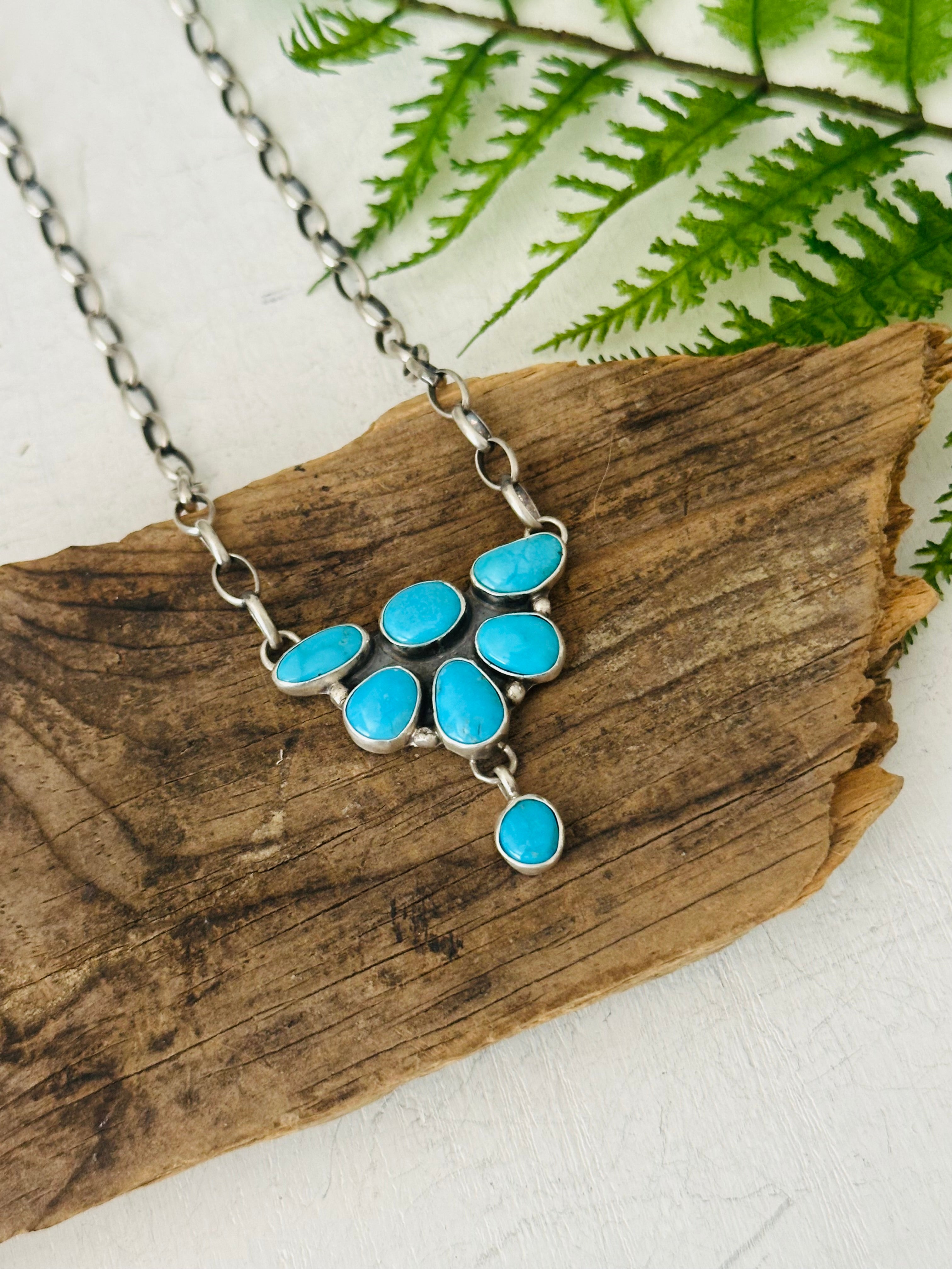 Beautiful Necklace. Navajo Made Kingman Turquoise & Sterling Silver Necklace. It measures 21 inches long with hang while the chain measures 18 inches long. Signed by the artist and stamped sterling silver. Stones will differ due to natural stones.