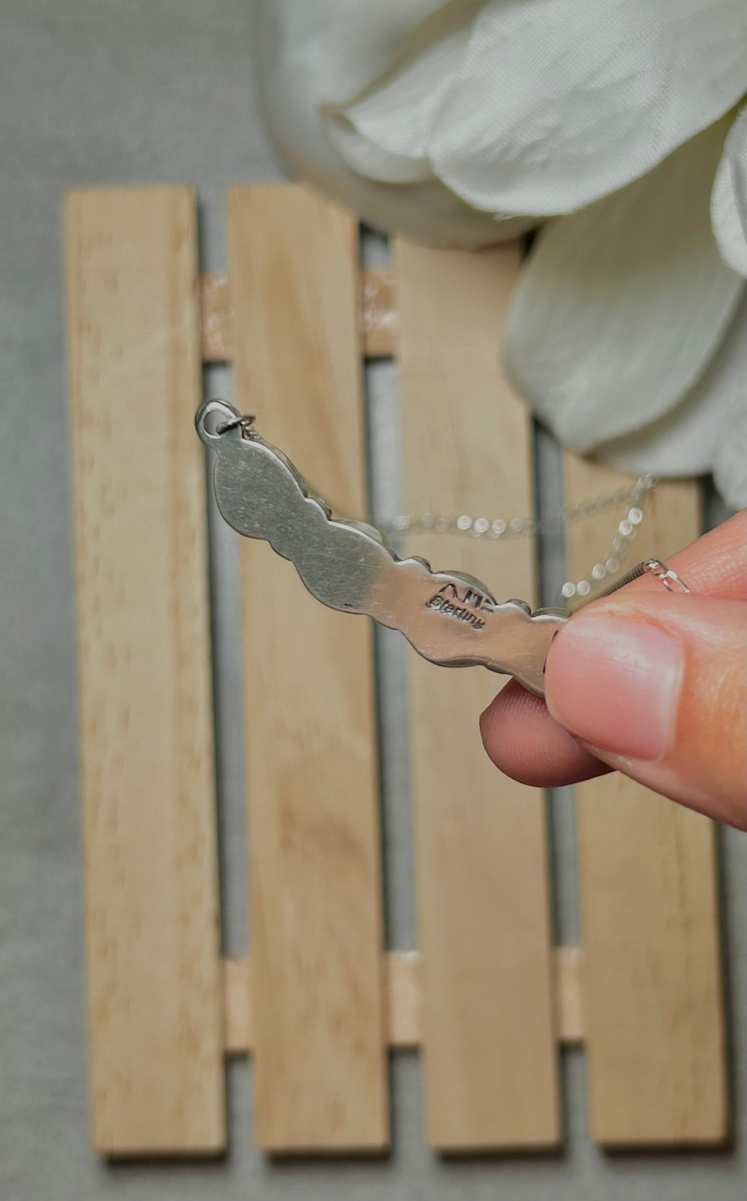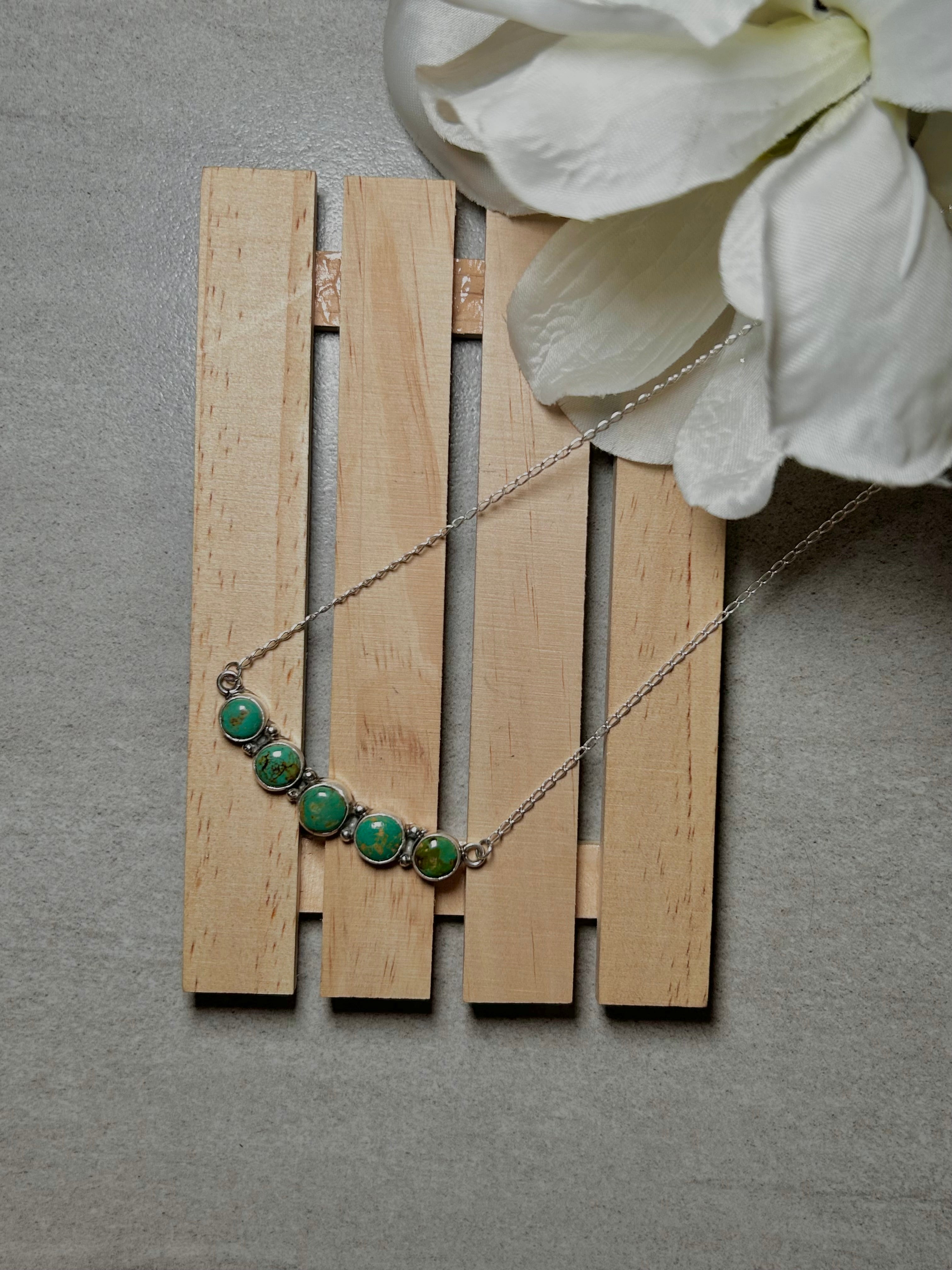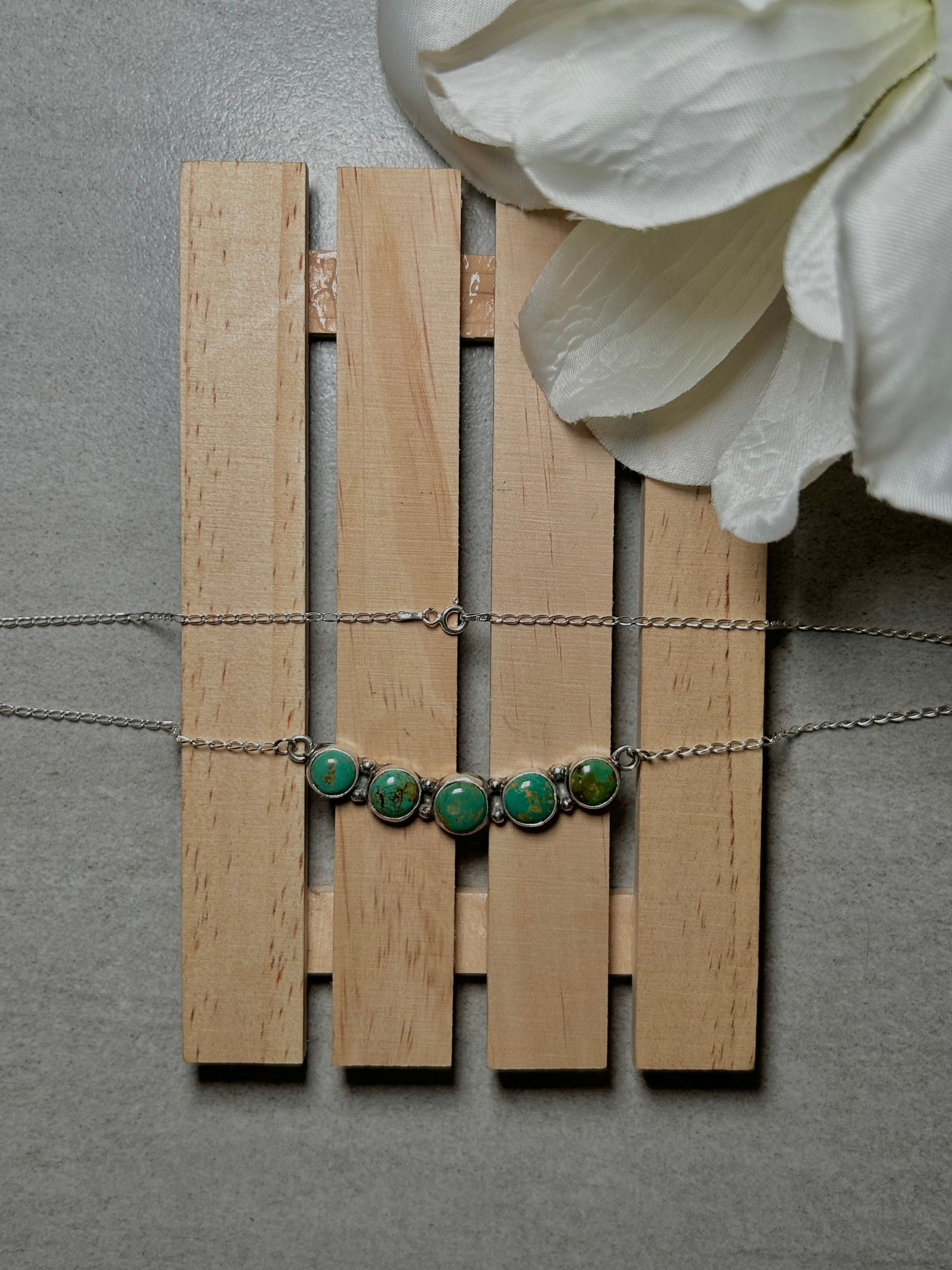 Navajo Made Kingman Turquoise and Sterling Silver Necklace. It measures 17 1/4 inches long with hang while the chain measures 16 1/4 inches long. Signed by the artist and stamped sterling silver.