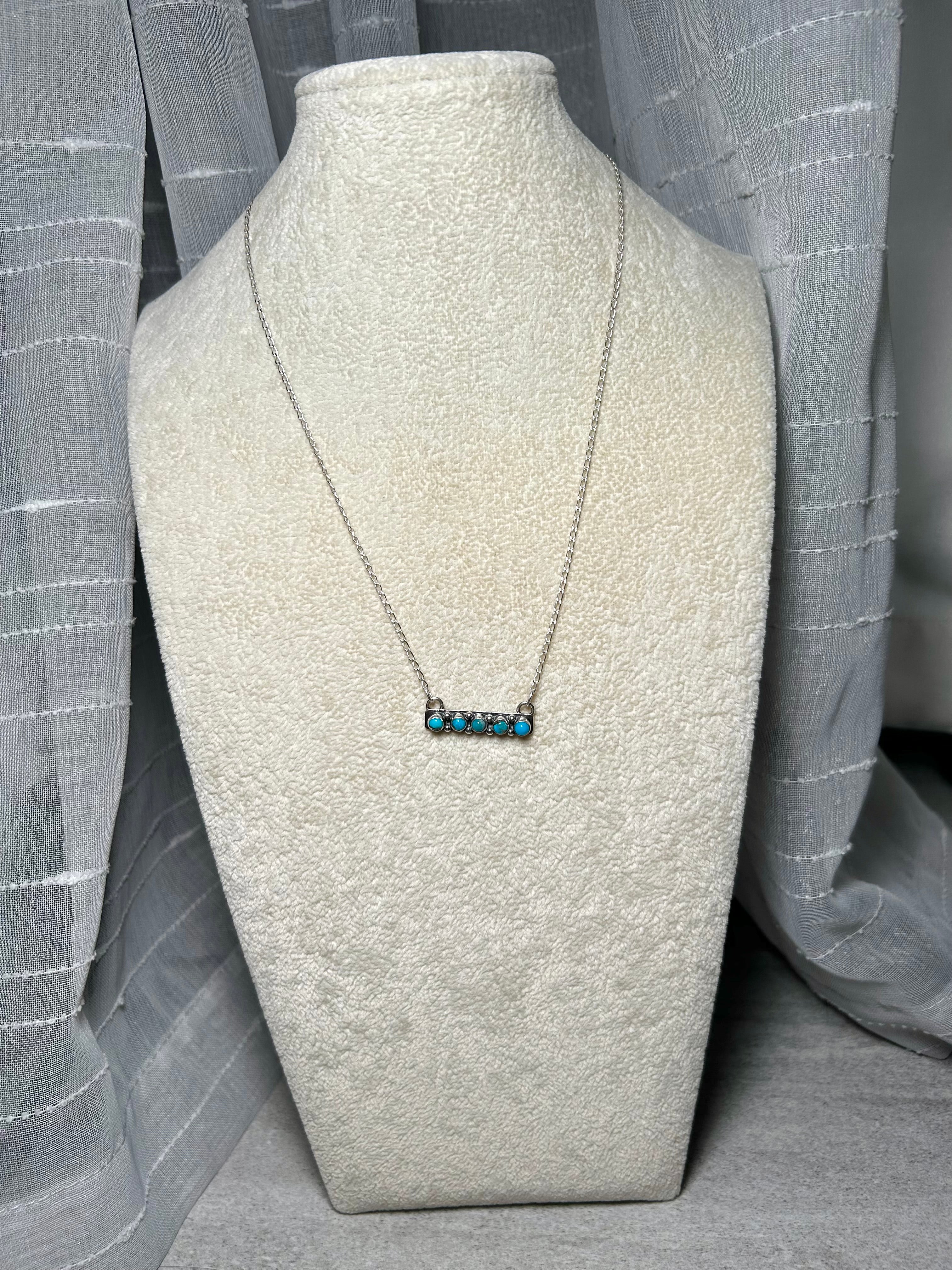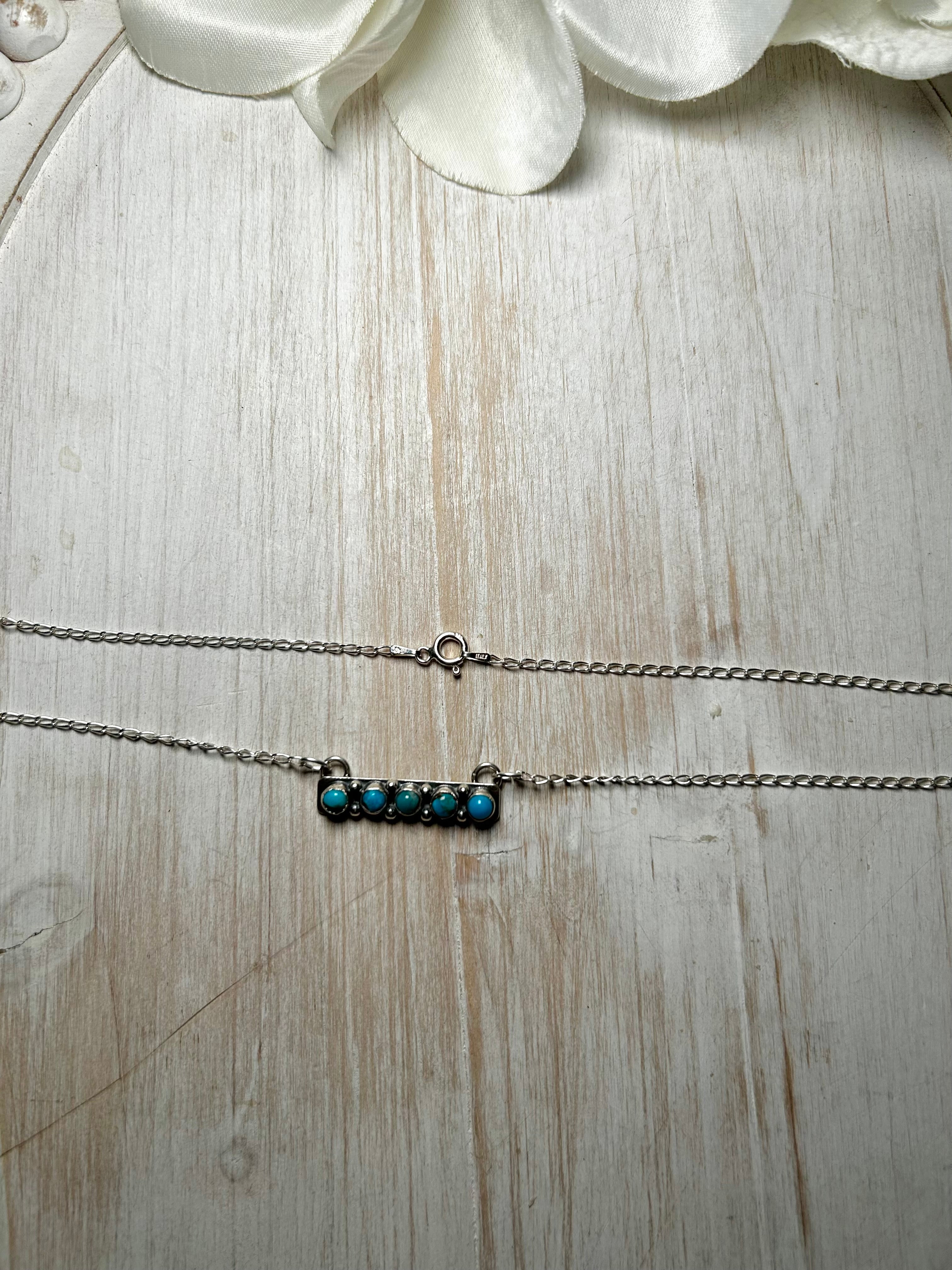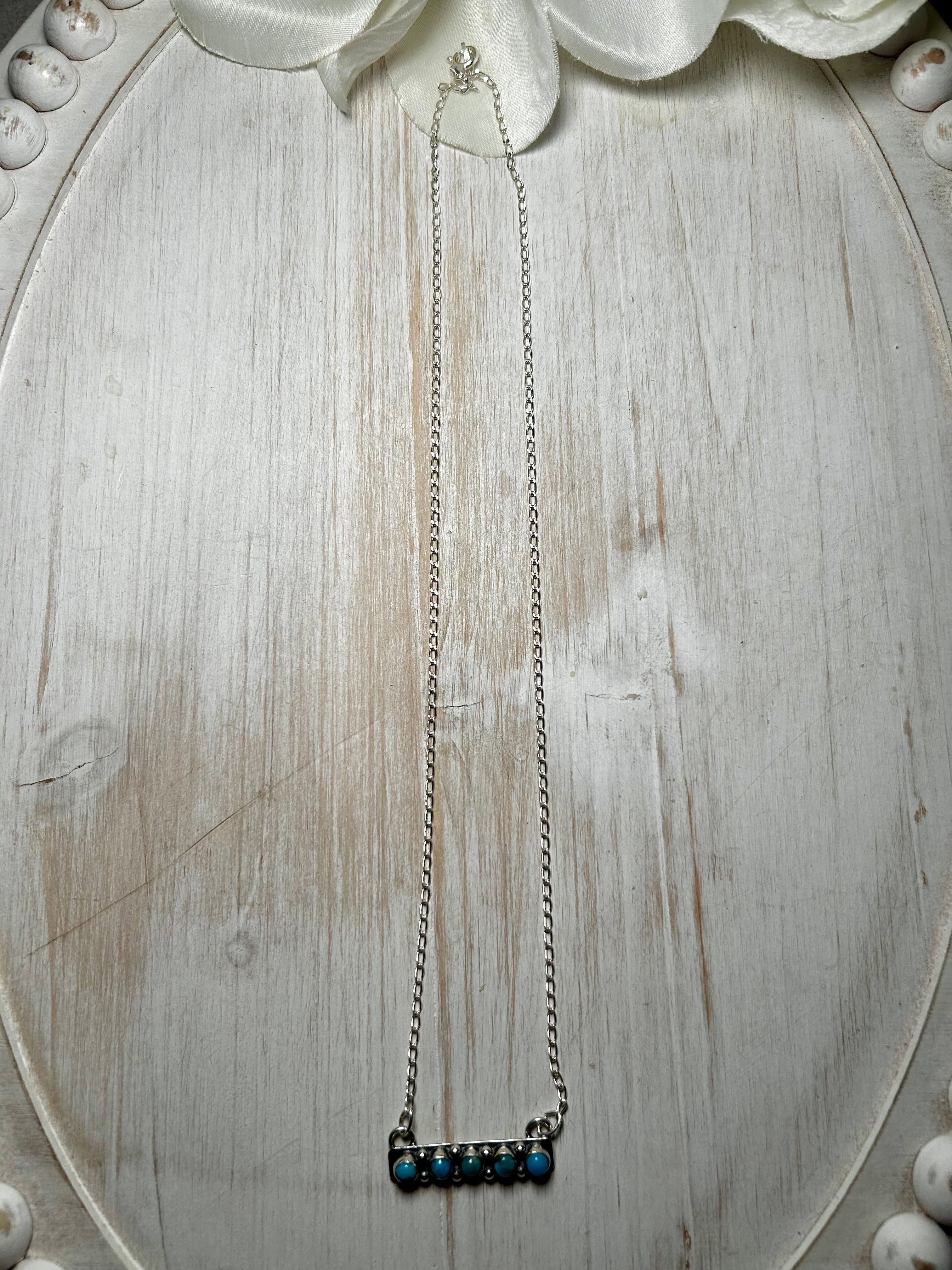 Navajo Made Kingman Turquoise & Sterling Silver Necklace. It measures 19 inches long with hang while the chain measures 18 inches long. Signed by the artist and stamped sterling silver. Stones will differ due to natural stones.