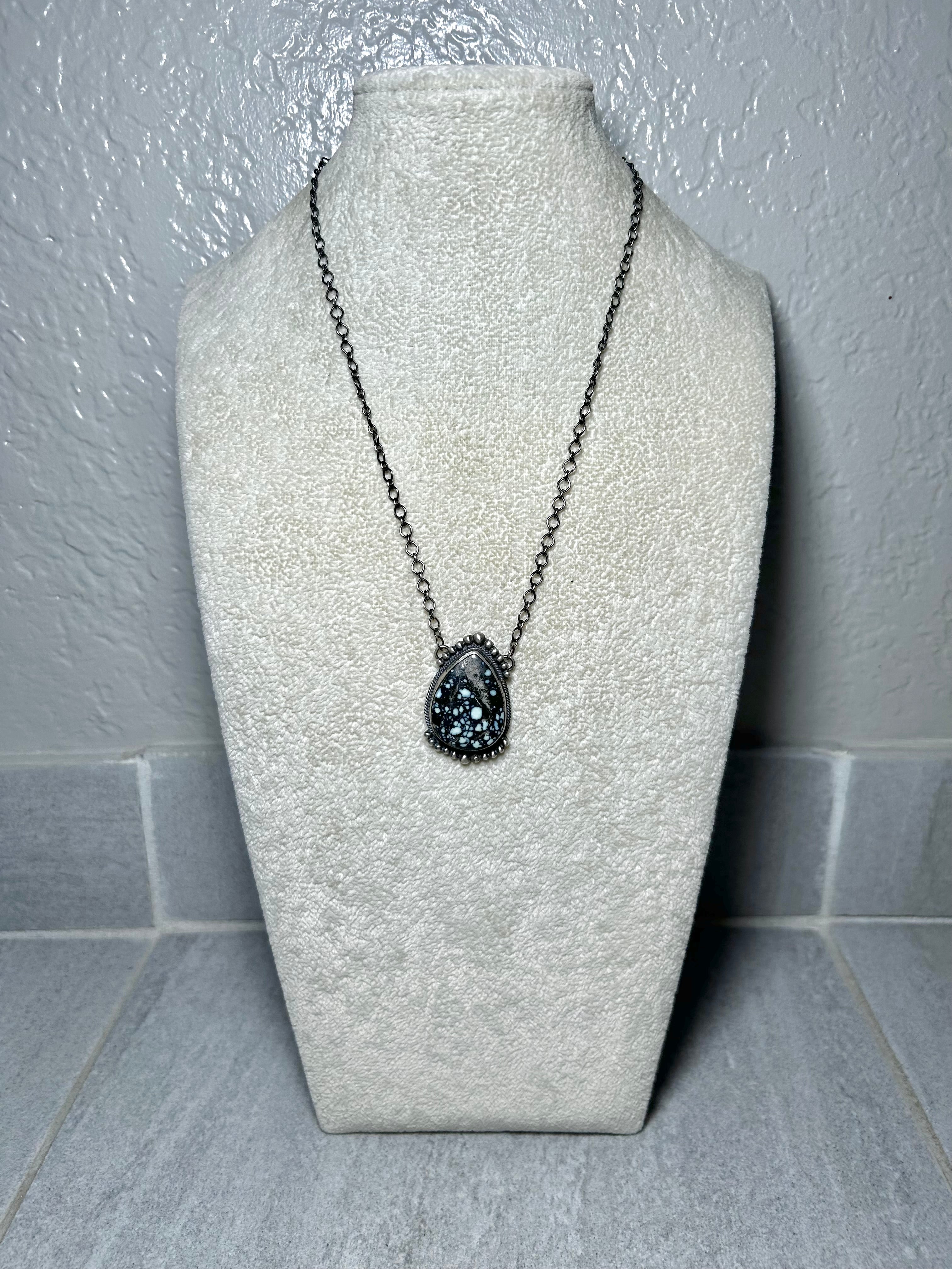 Navajo Made New Lander Variscite & Sterling Silver Necklace. It measures 20 inches long with hang while the chain measures 17 1/2 inches long. Signed by the artist and stamped sterling silver.