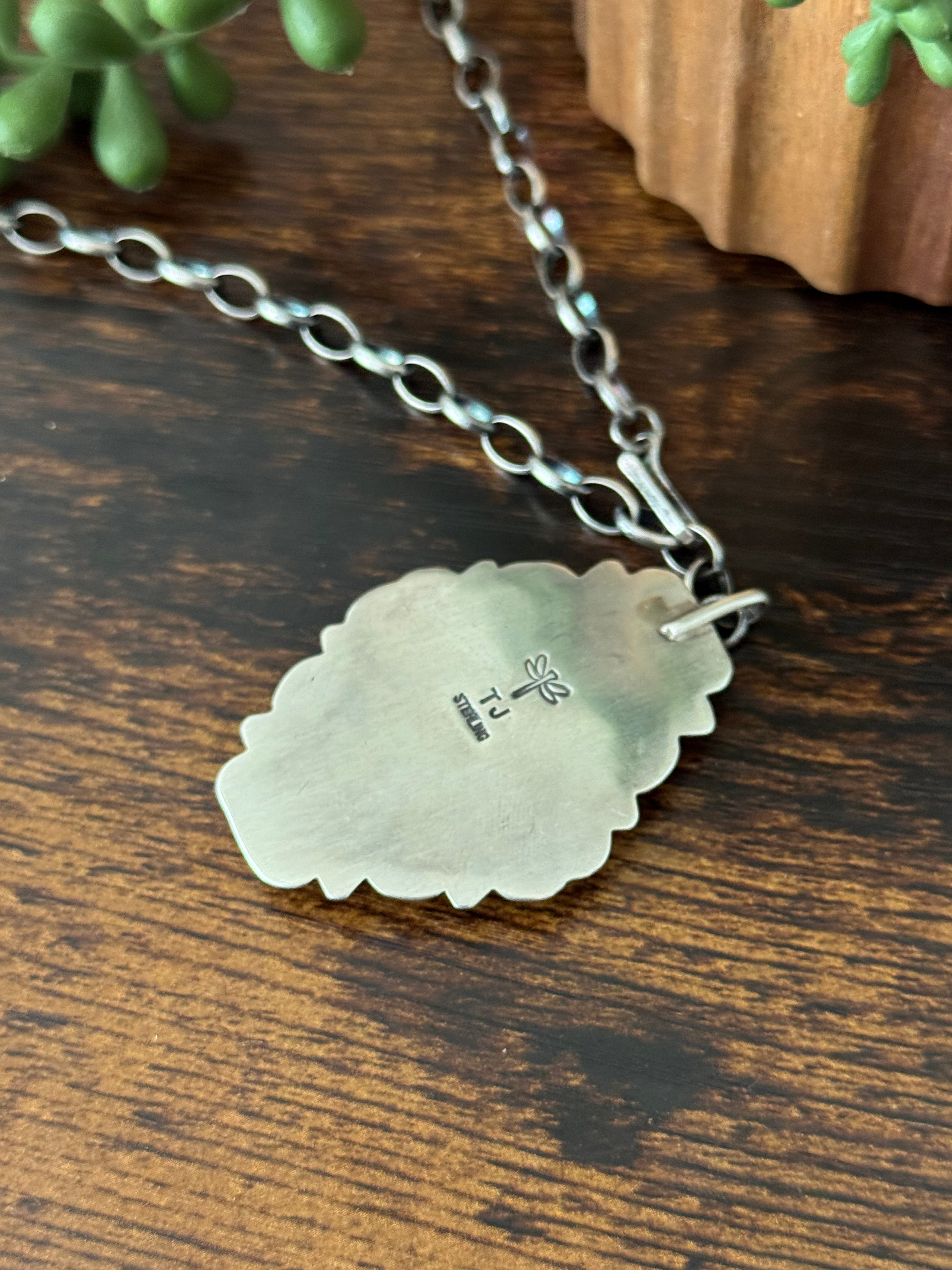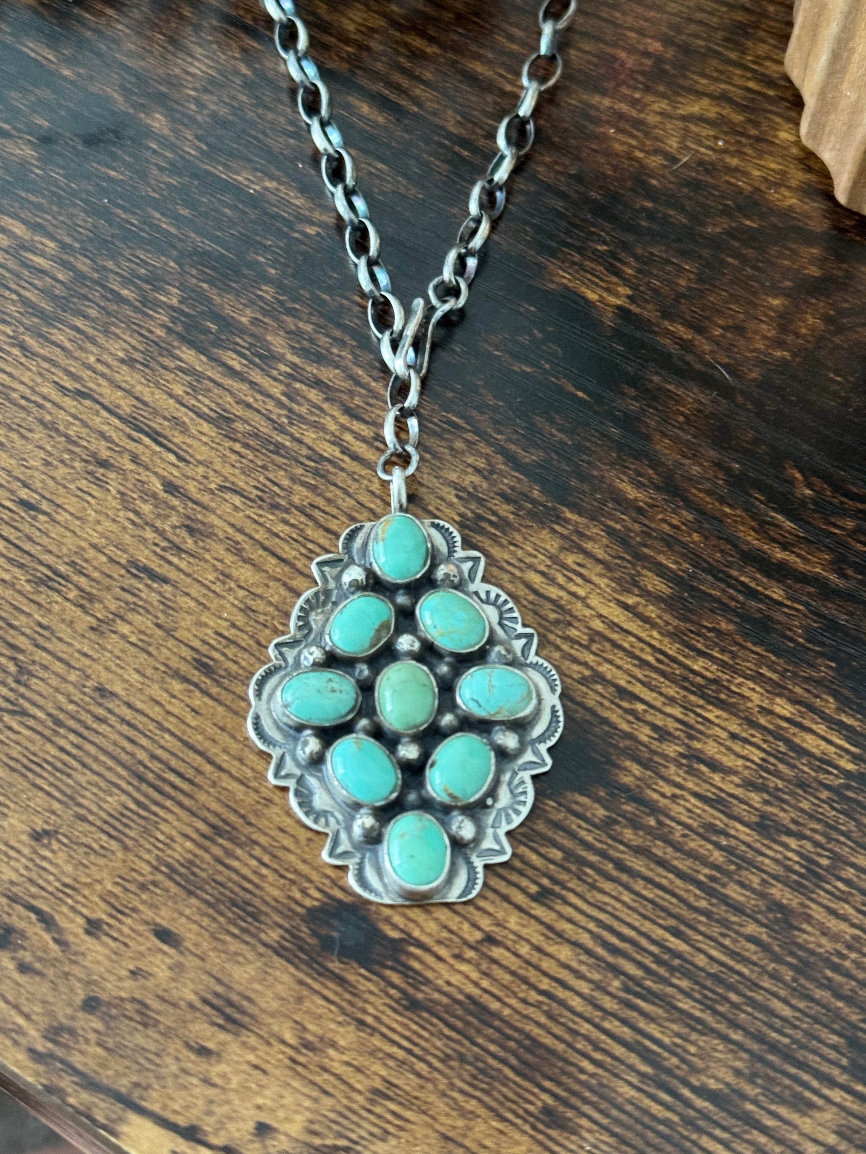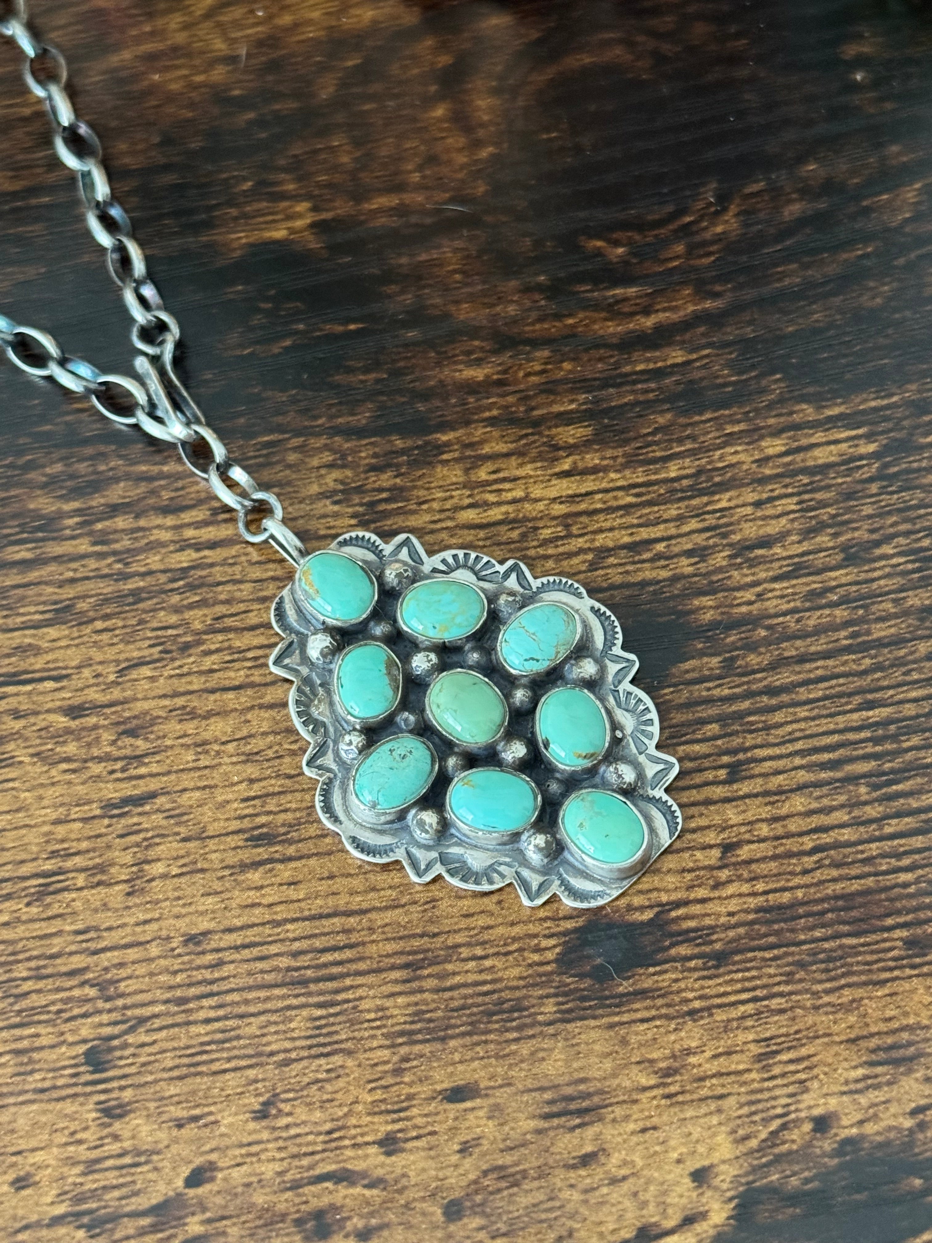 Beautiful Necklace. Navajo Made Kingman Turquoise & Sterling Silver Necklace. It measures 33 1/4 inches long with hang while the chain by itself measures 31 inches long. Signed by the artist and stamped sterling silver.