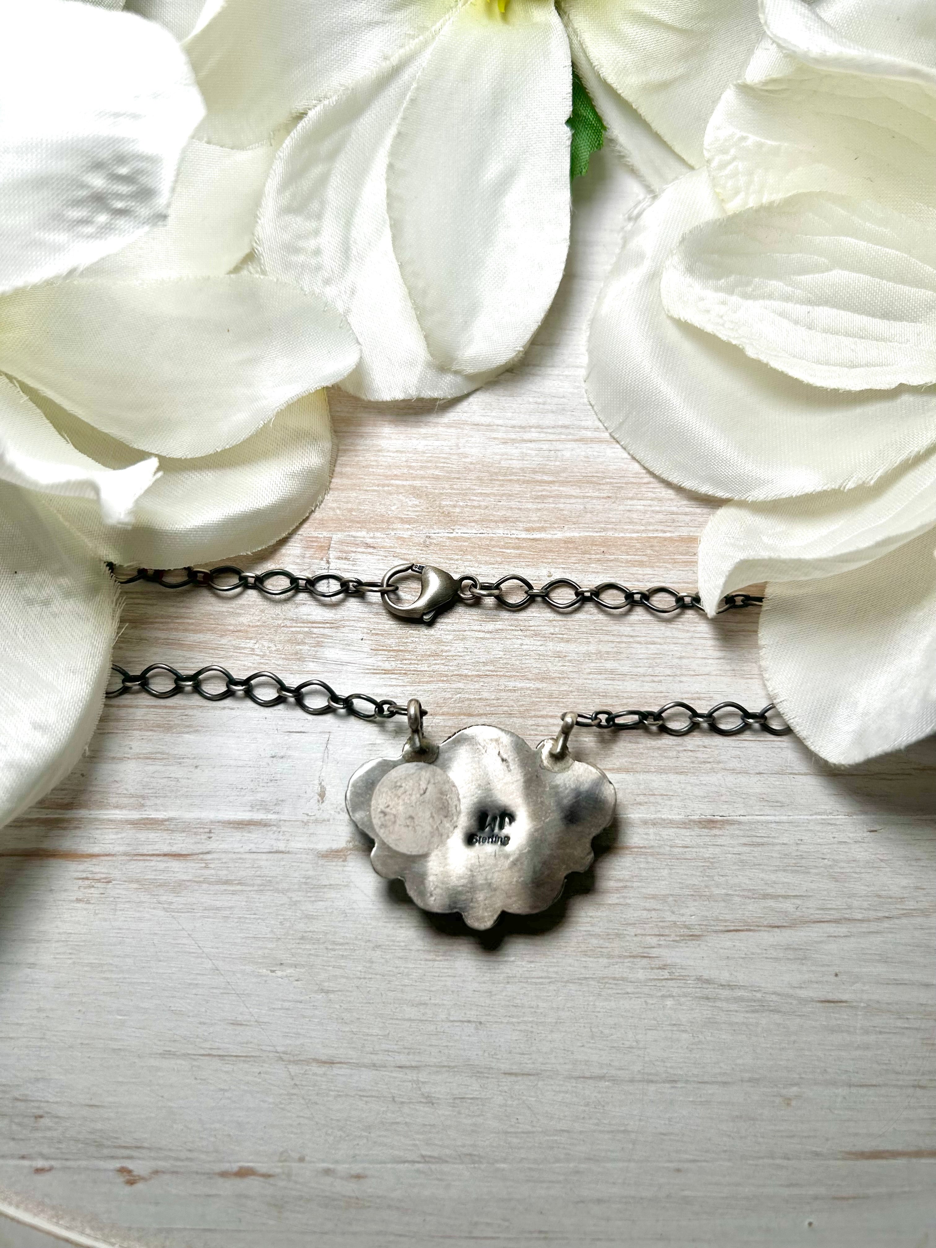Navajo Made Kingman Turquoise & Sterling Silver Necklace. It measures 23 1/4 inches long with hang while the chain measures 19 inches long. Signed by the artist and stamped sterling silver.