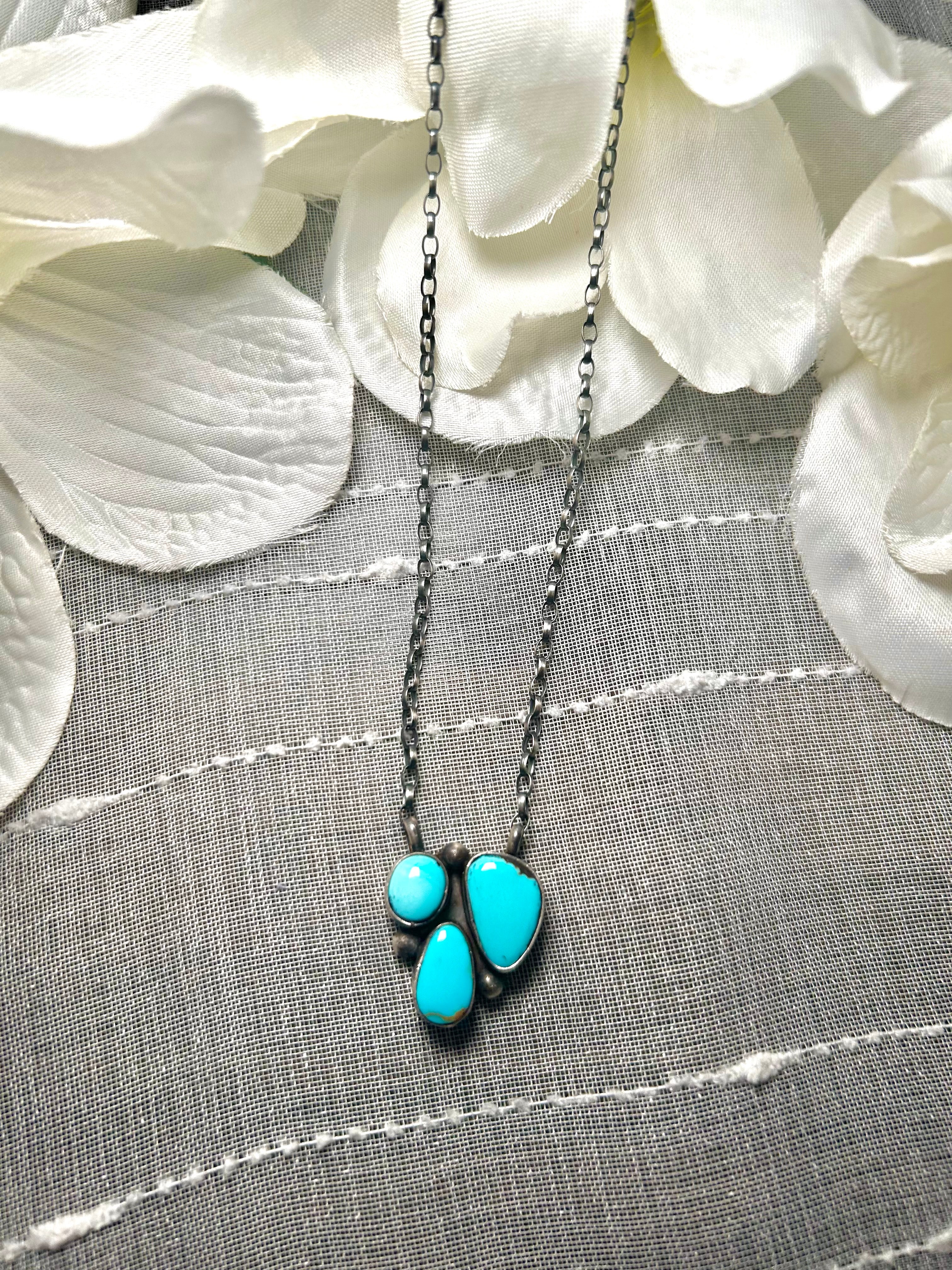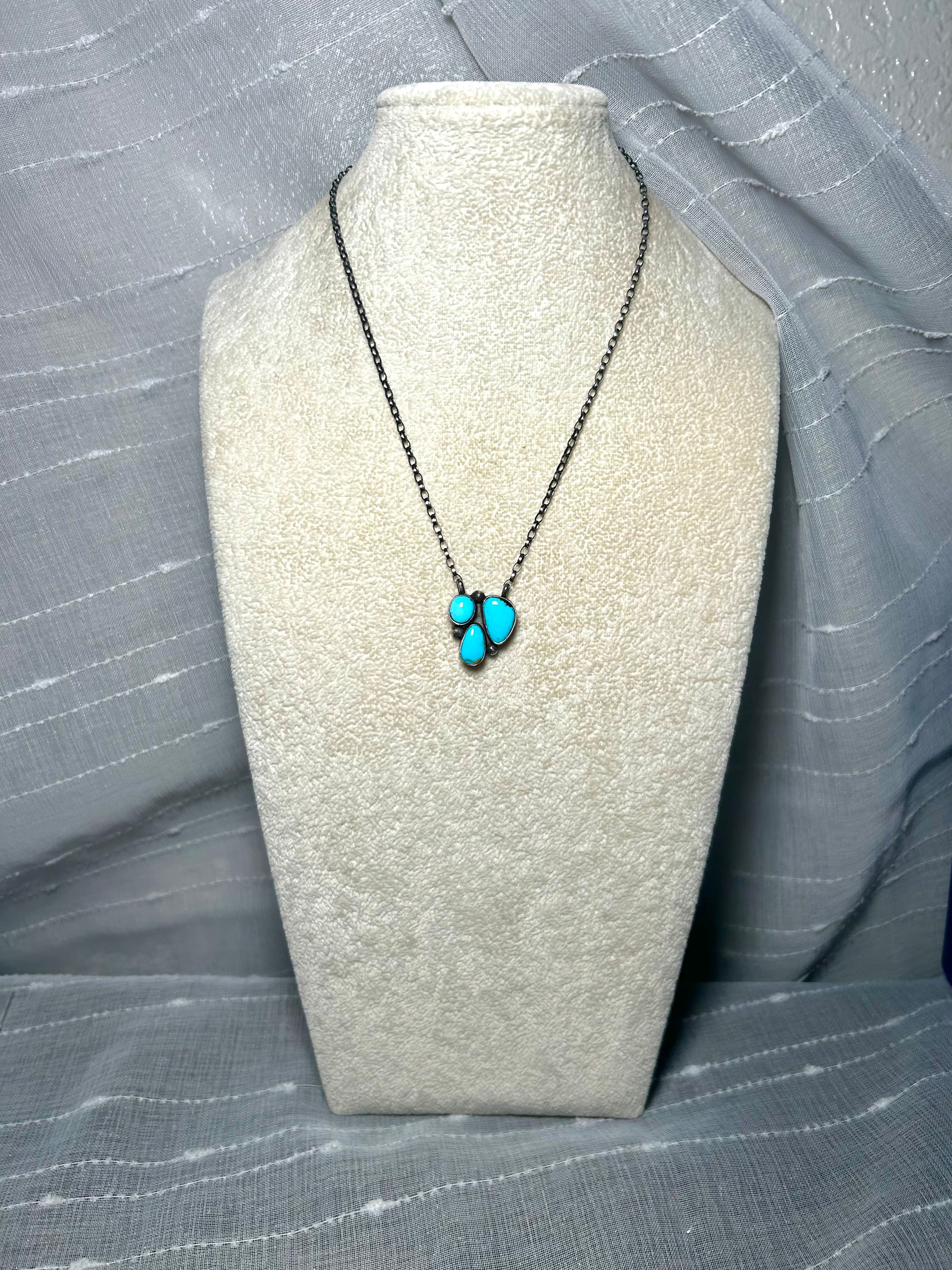 Navajo Made Kingman Turquoise & Sterling Silver Necklace. It measures 18 1/4 inches long with hang while the chain measures 16 1/2 inches long. Signed by the artist and stamped sterling silver.