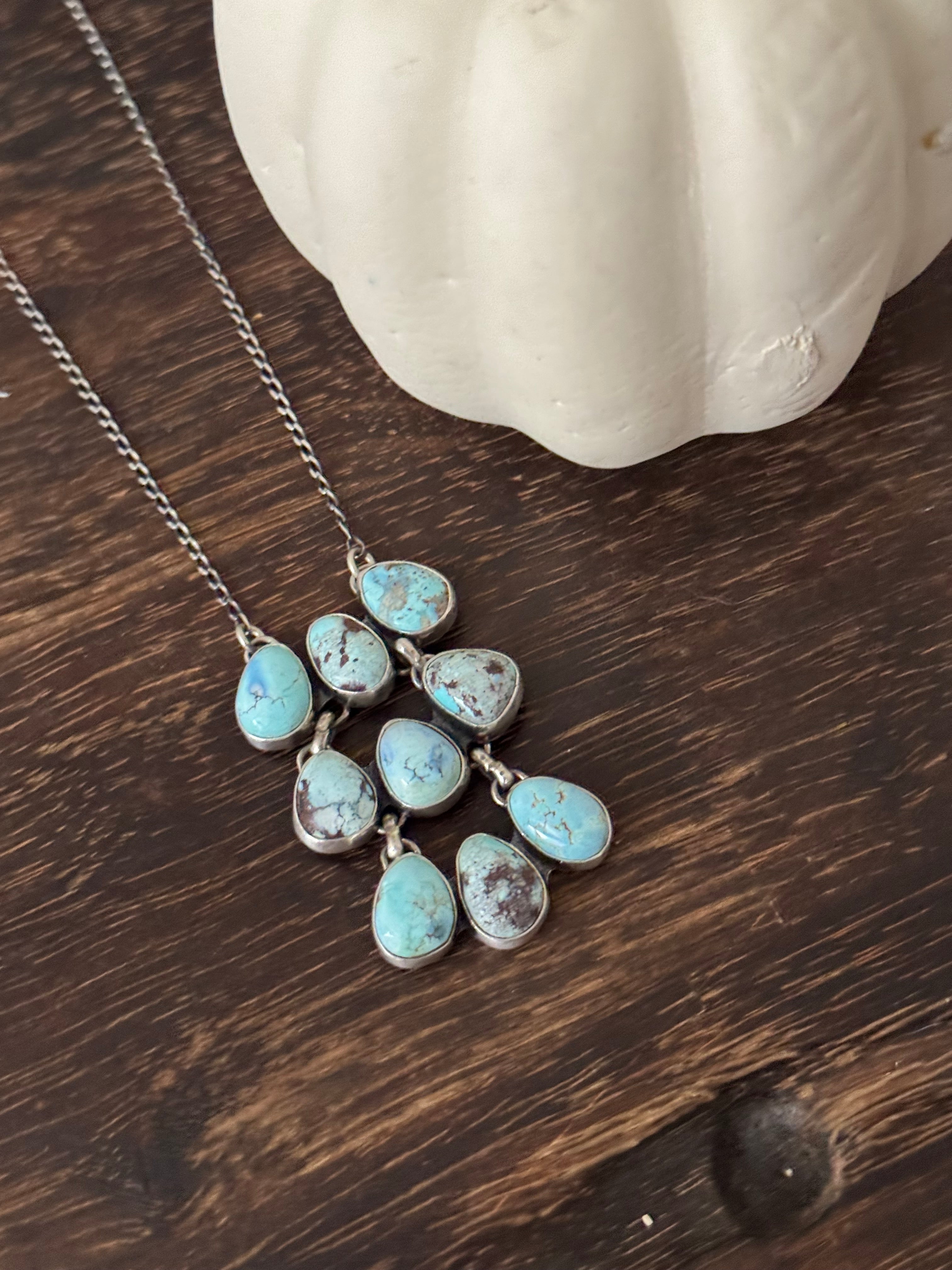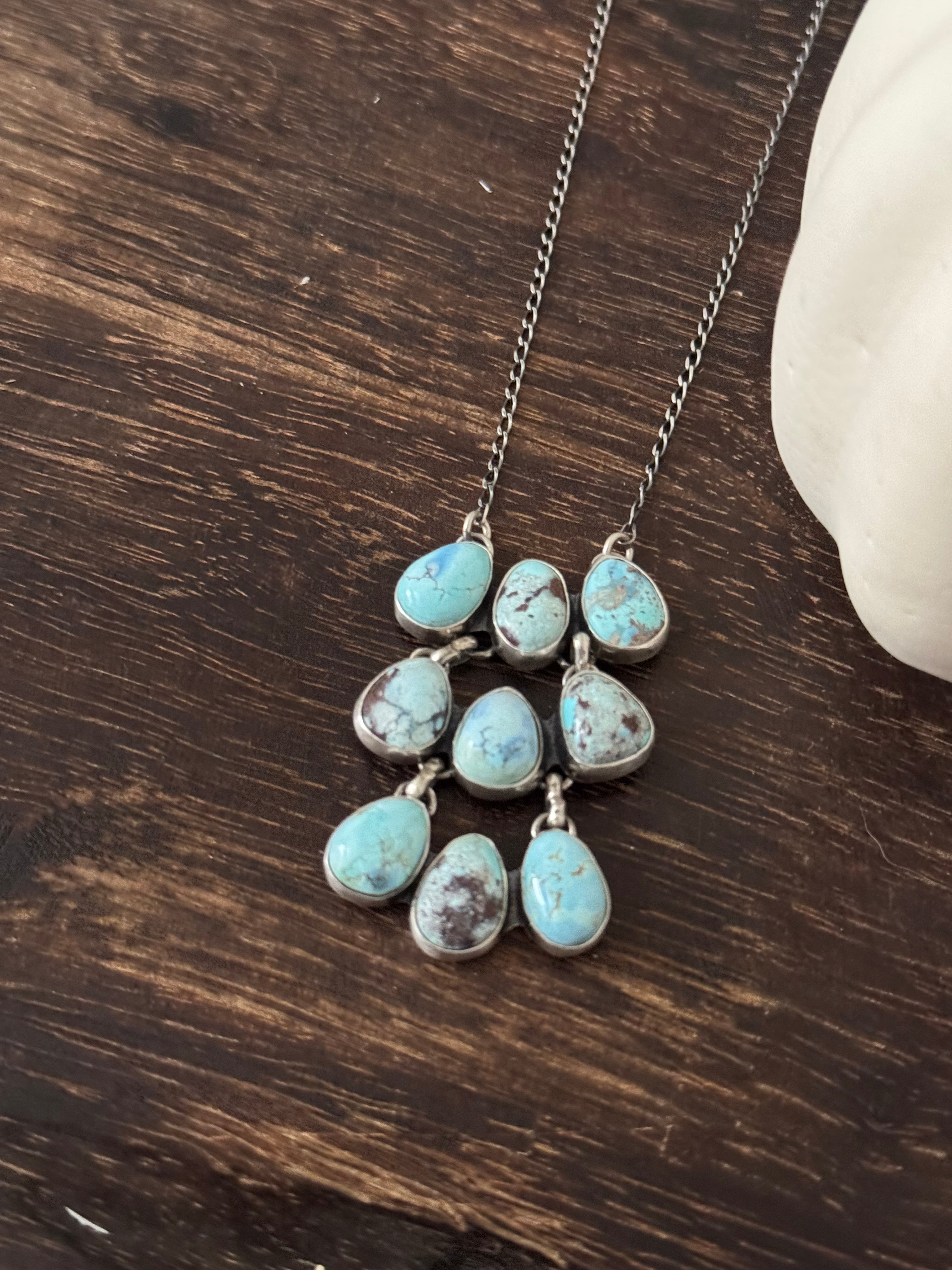 Beautiful Necklace. Navajo Made Golden Hills Turquoise & Sterling Silver Necklace. It measures 24 inches long with hang while the chain measures 20 1/2 inches long. Signed by the artist and stamped sterling silver.