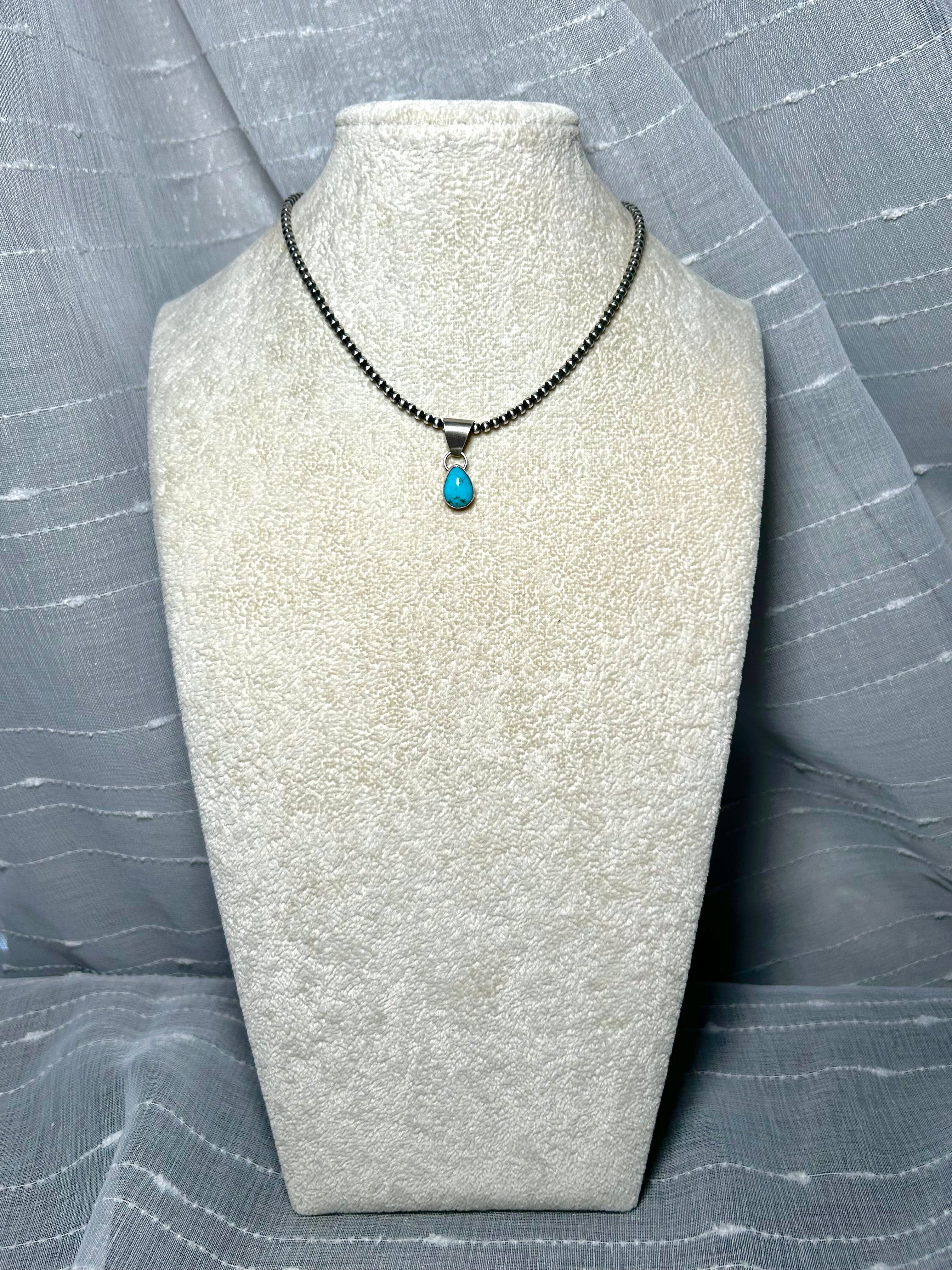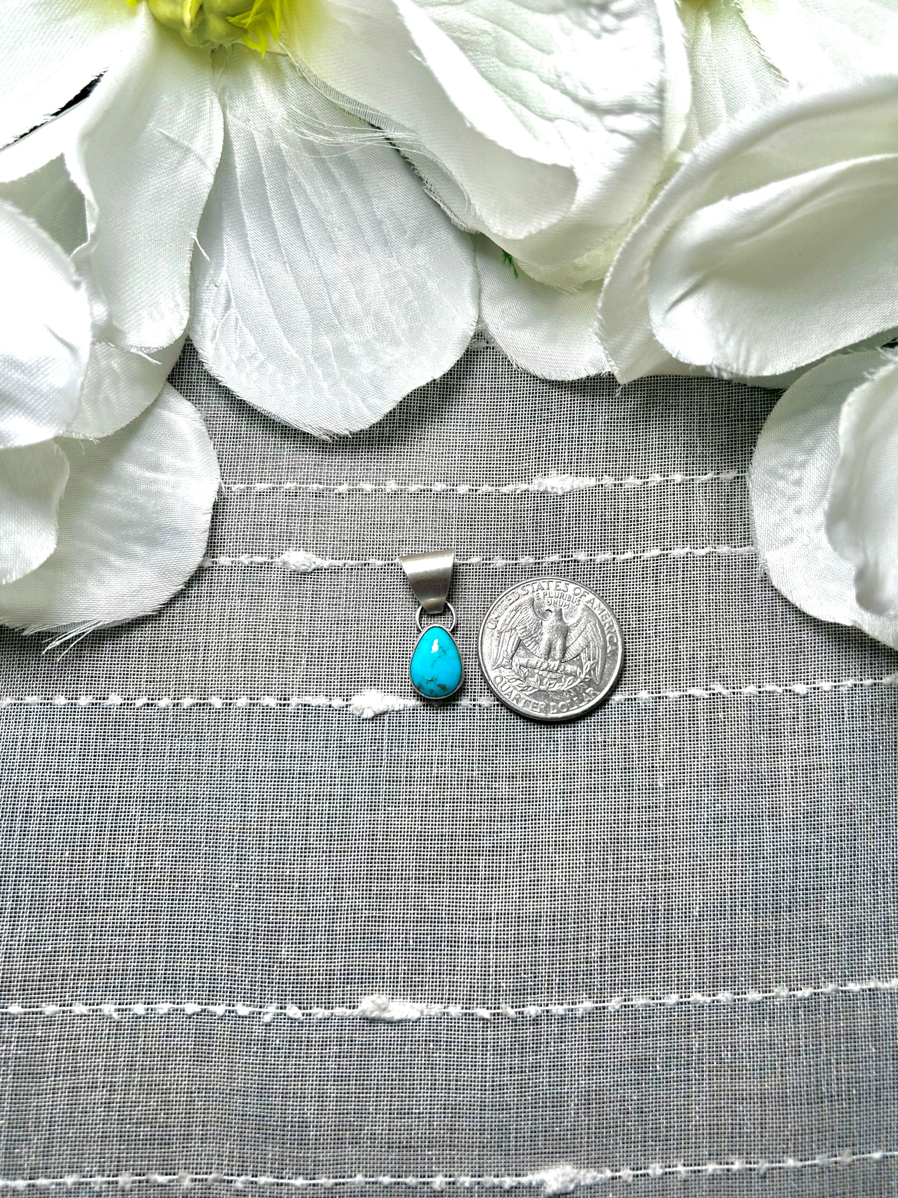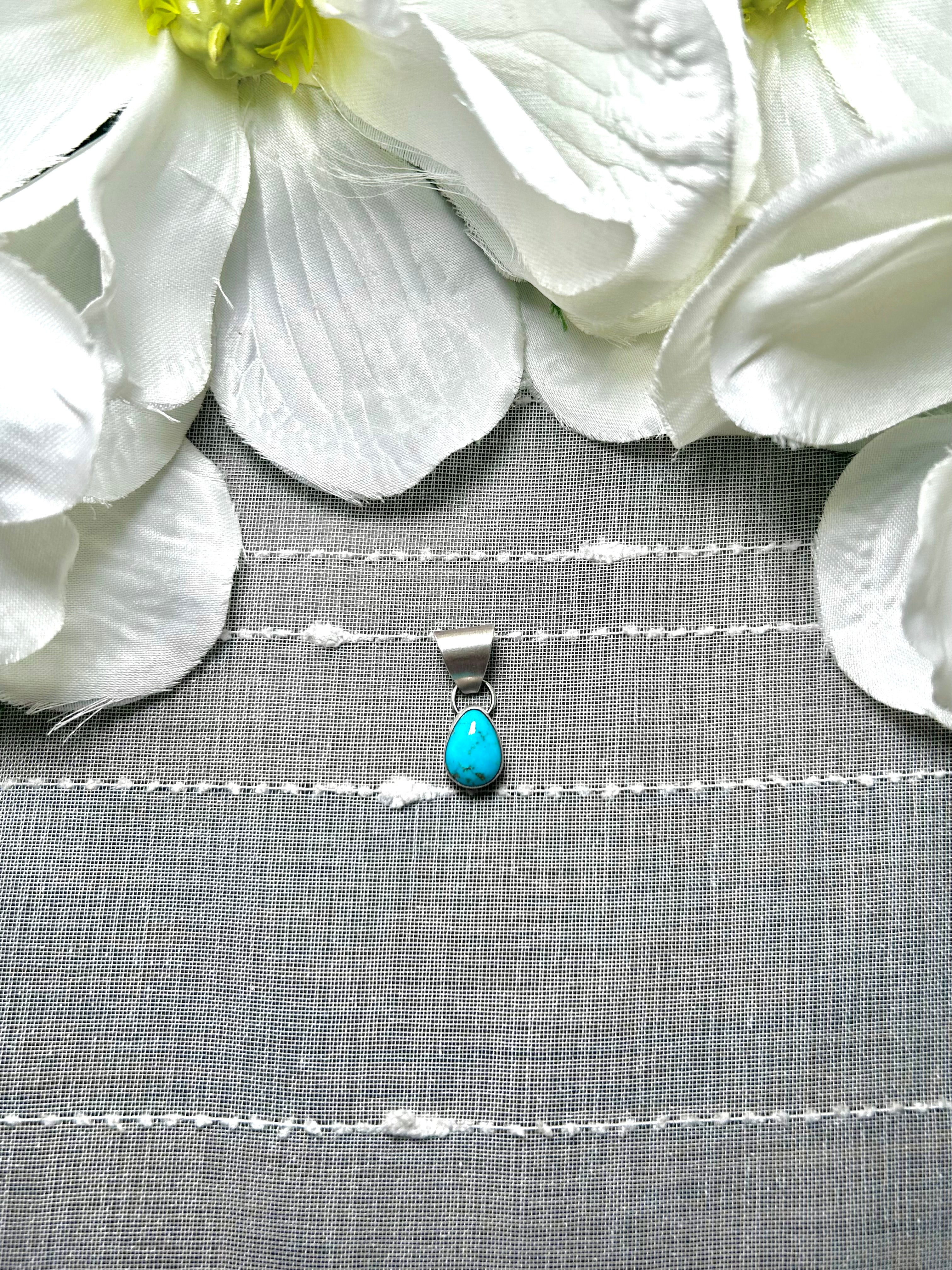 Navajo Made Kingman Turquoise & Sterling Silver Pendant. It measures 1 inch long and 3/8 of an inch wide. Pendant Only! Signed by the artist and stamped sterling silver.