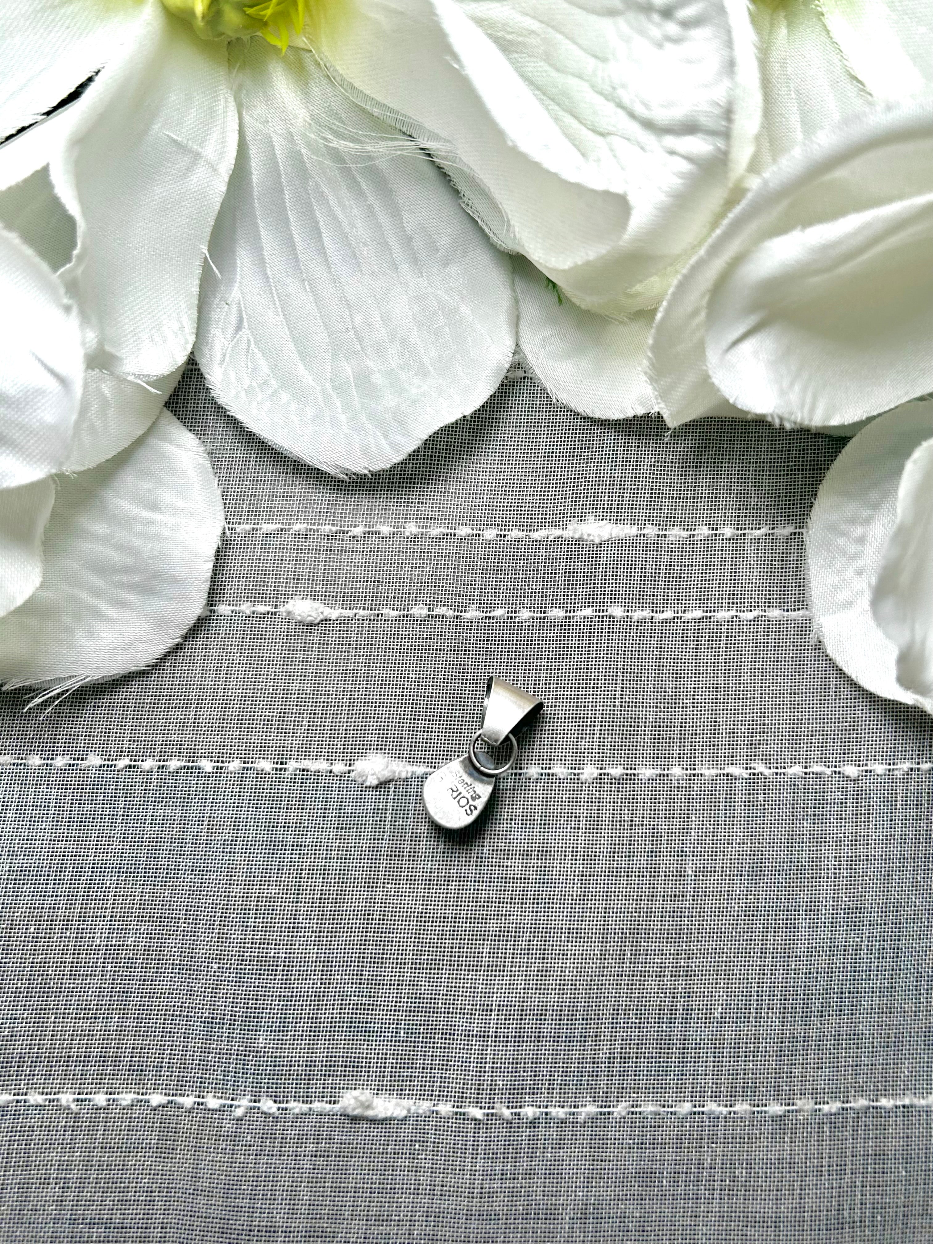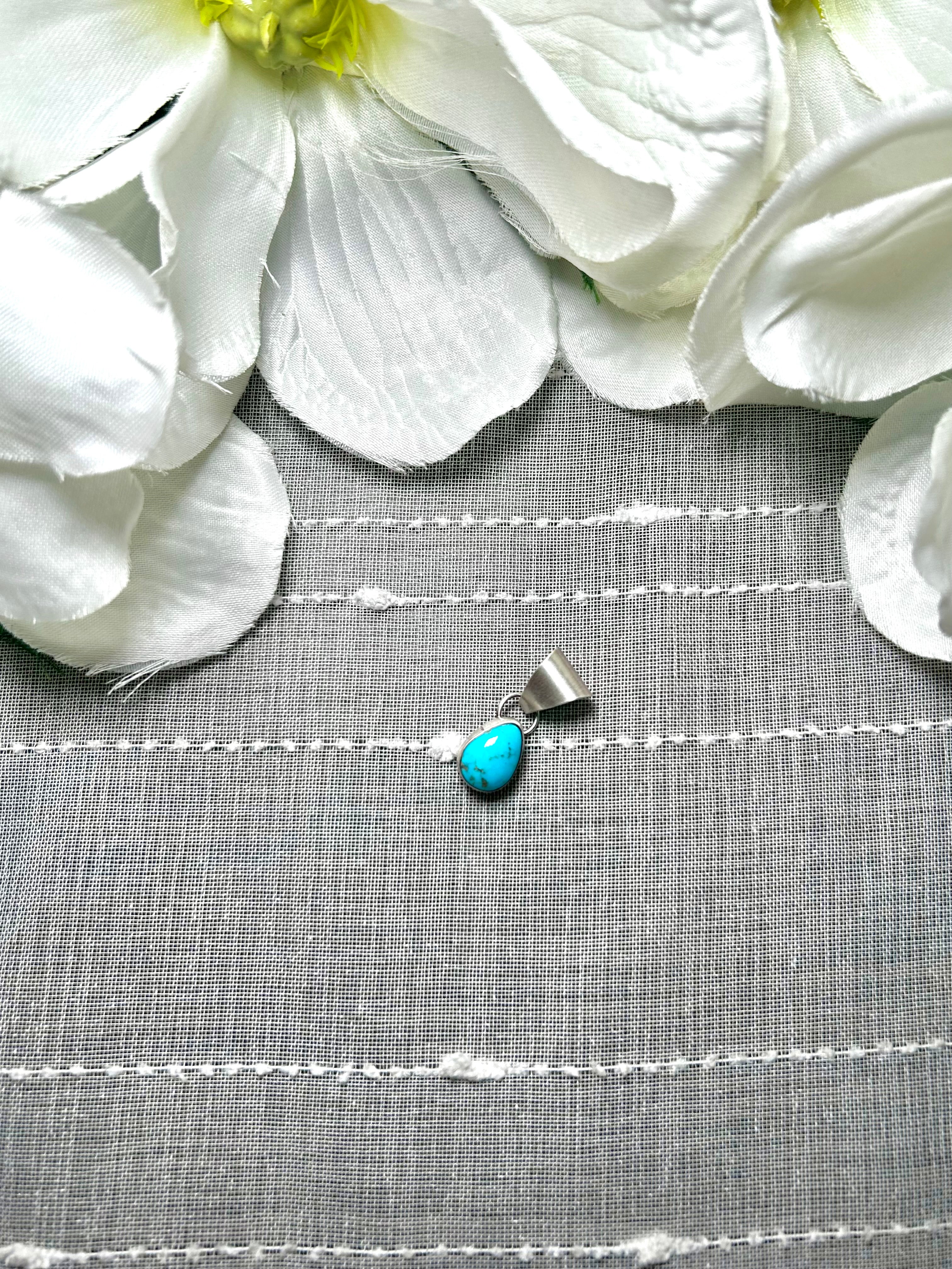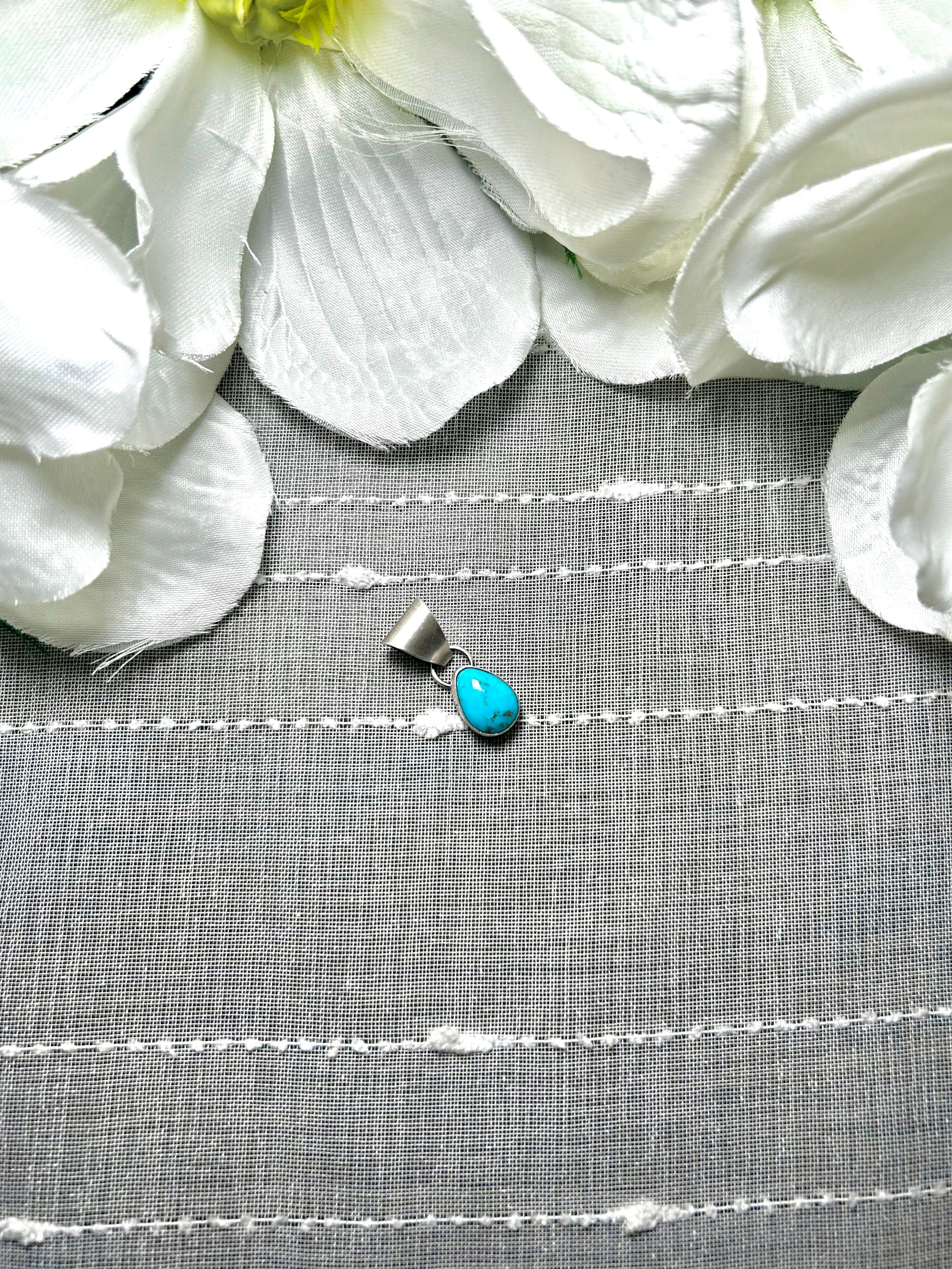 Navajo Made Kingman Turquoise & Sterling Silver Pendant. It measures 1 inch long and 3/8 of an inch wide. Pendant Only! Signed by the artist and stamped sterling silver.