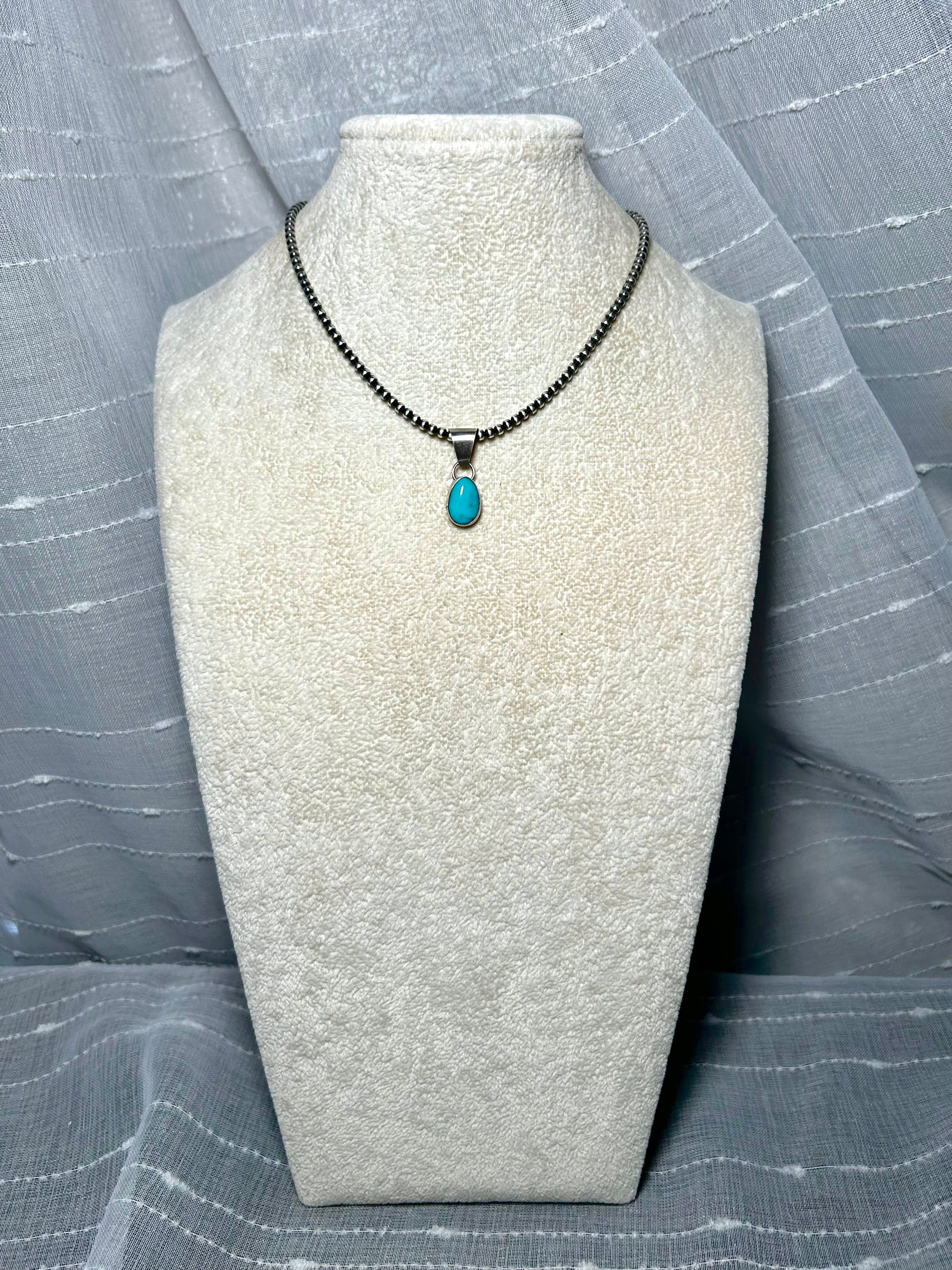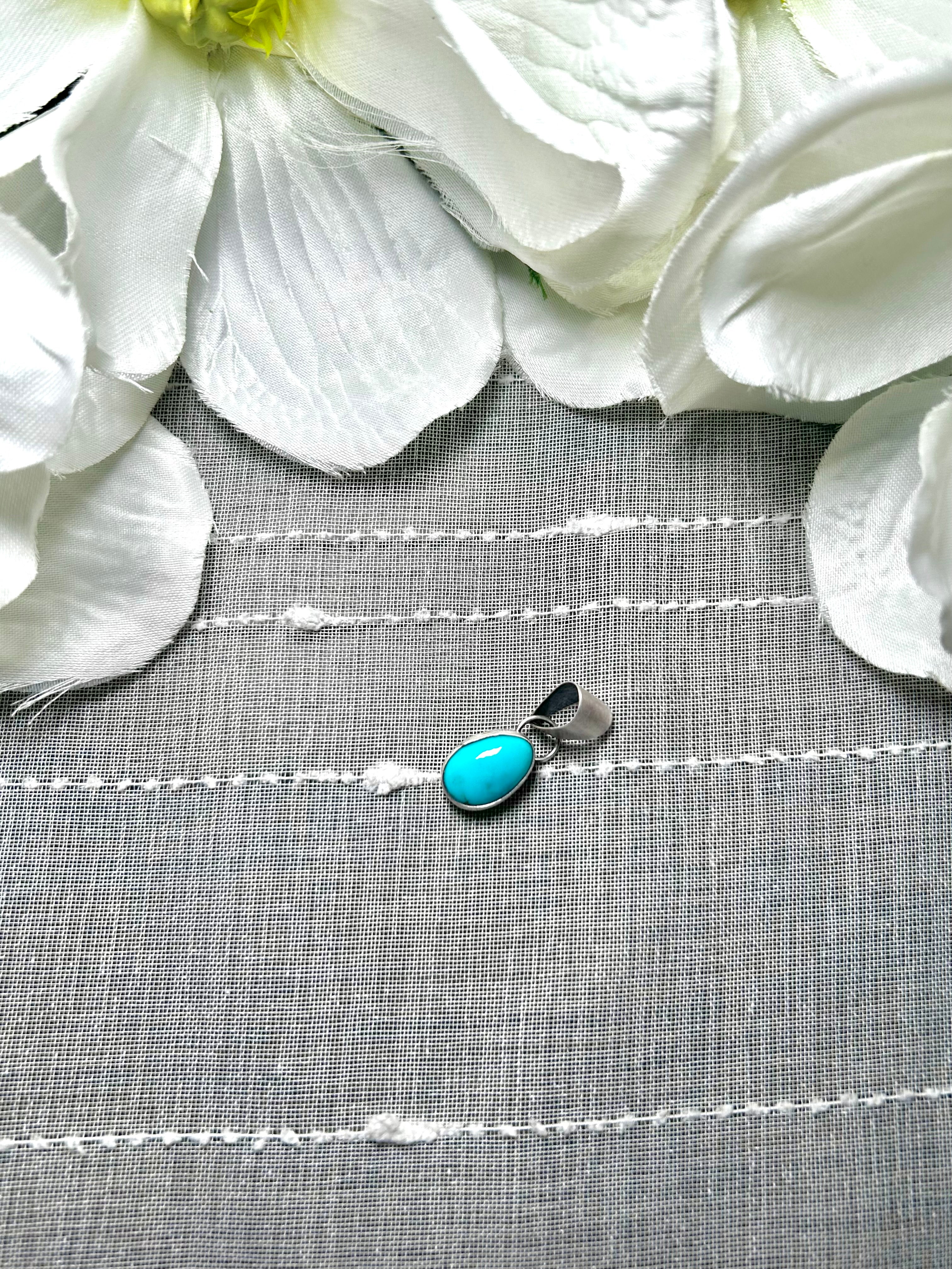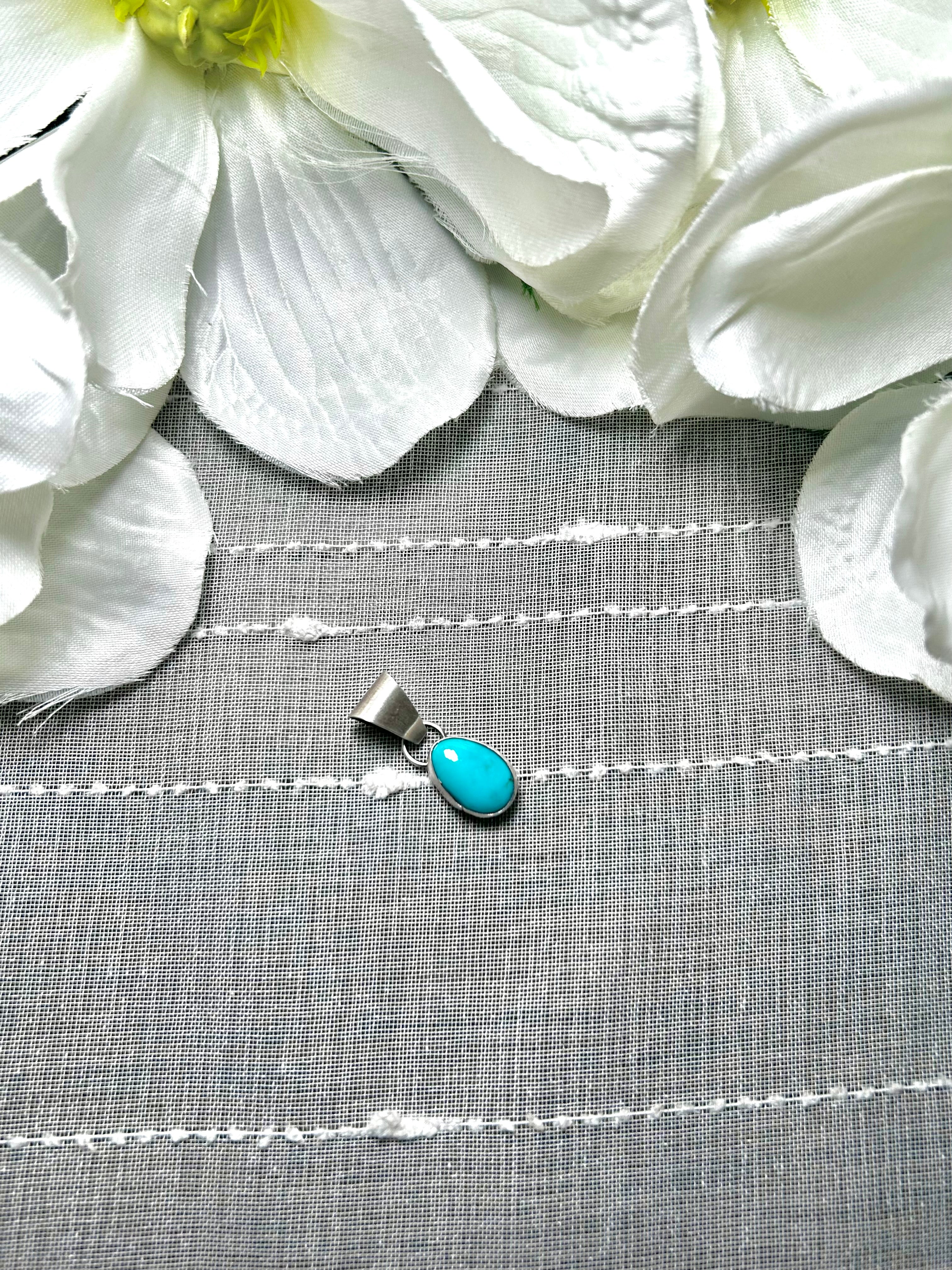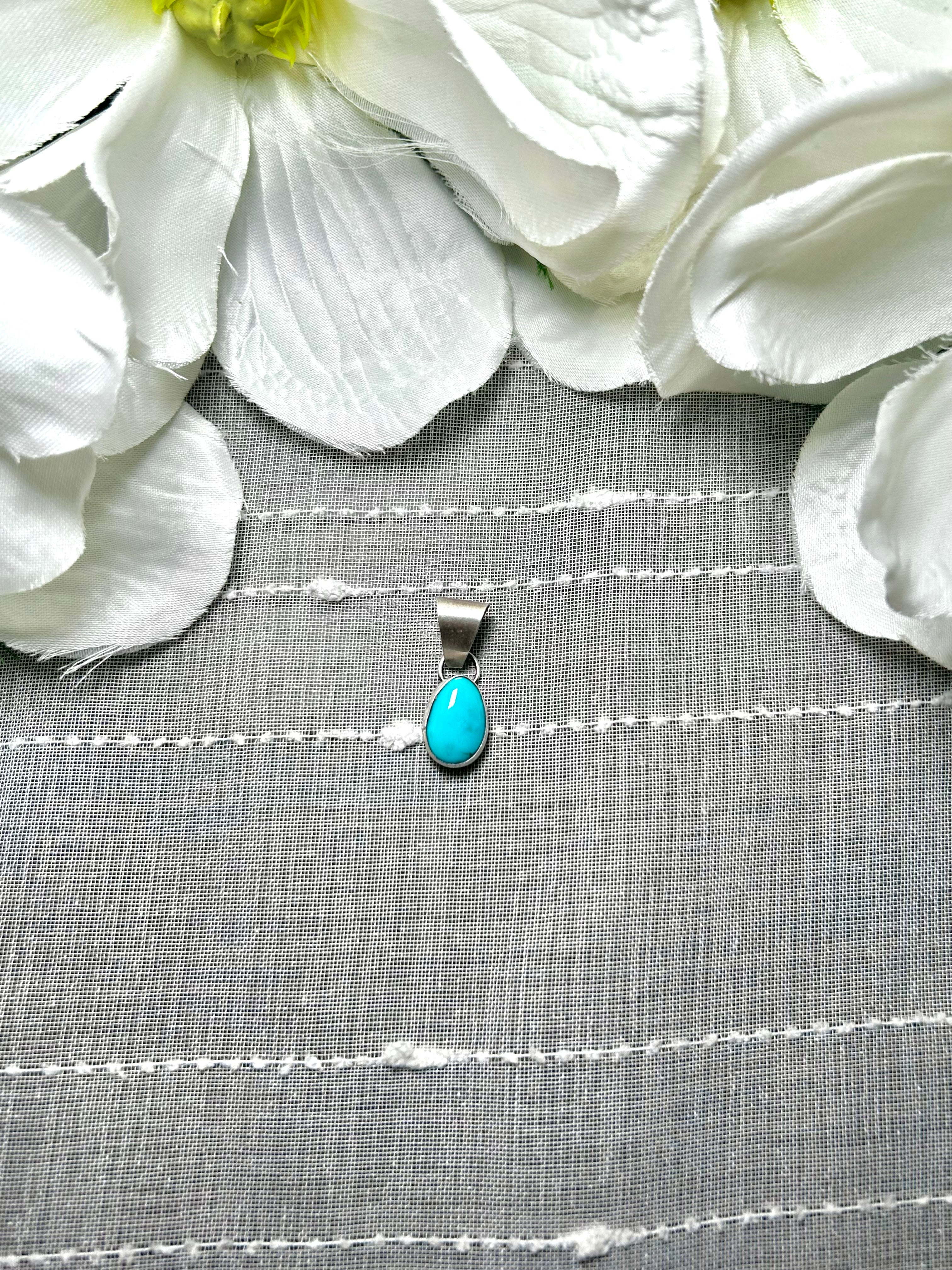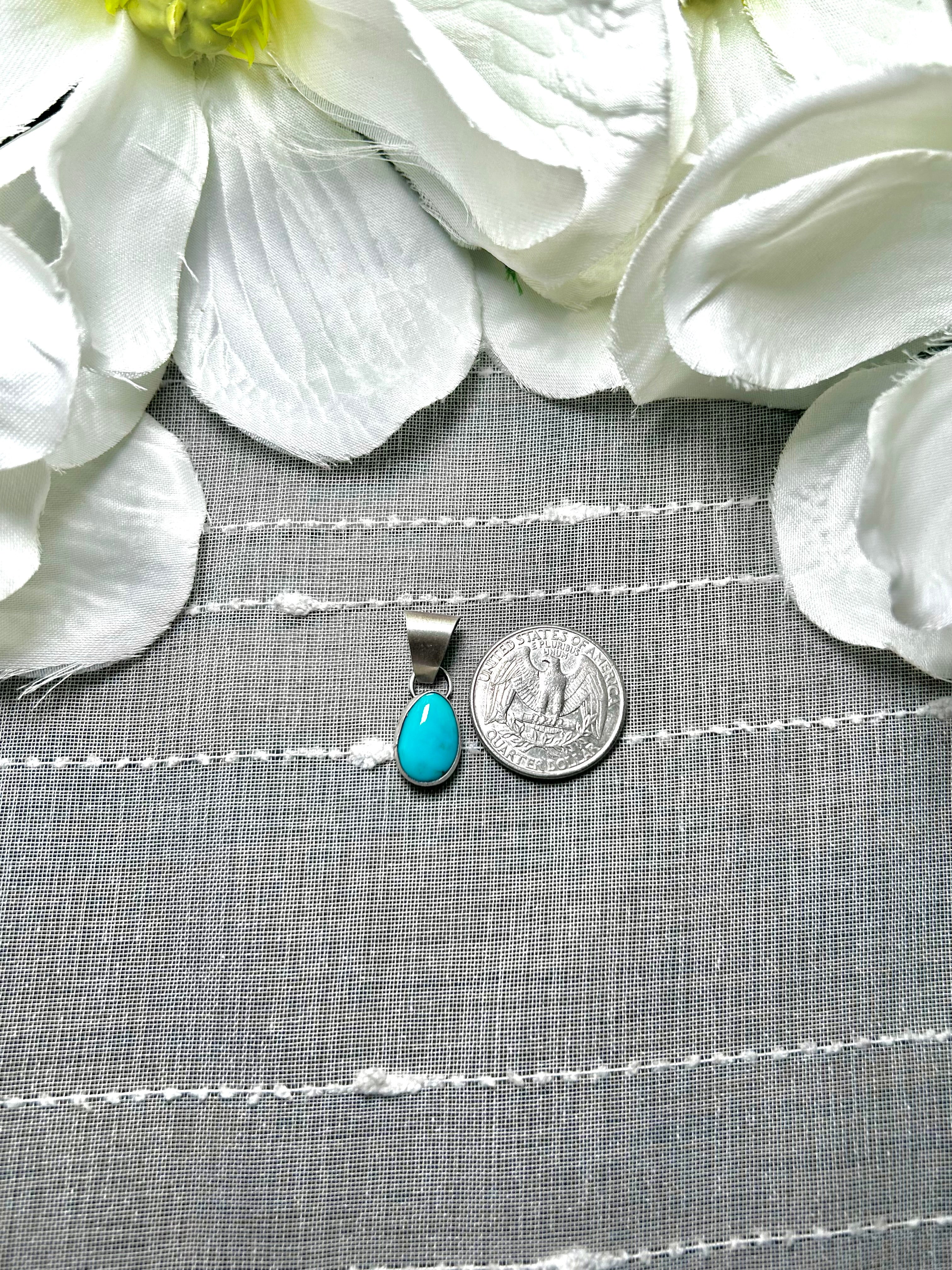 Navajo Made Kingman Turquoise & Sterling Silver Pendant. It measures 1 inch long and 3/8 of an inch wide. Pendant Only! Signed by the artist and stamped sterling silver.