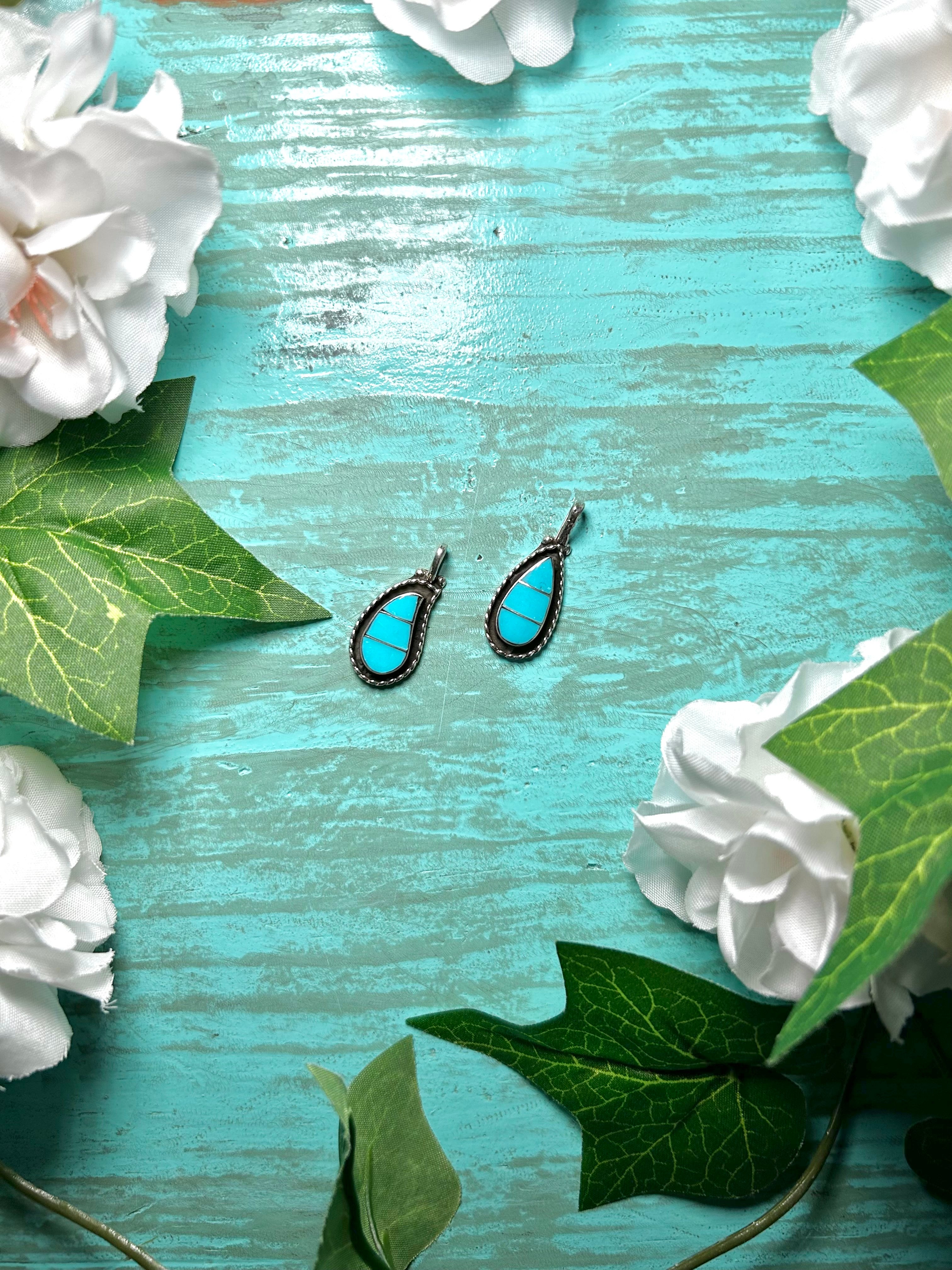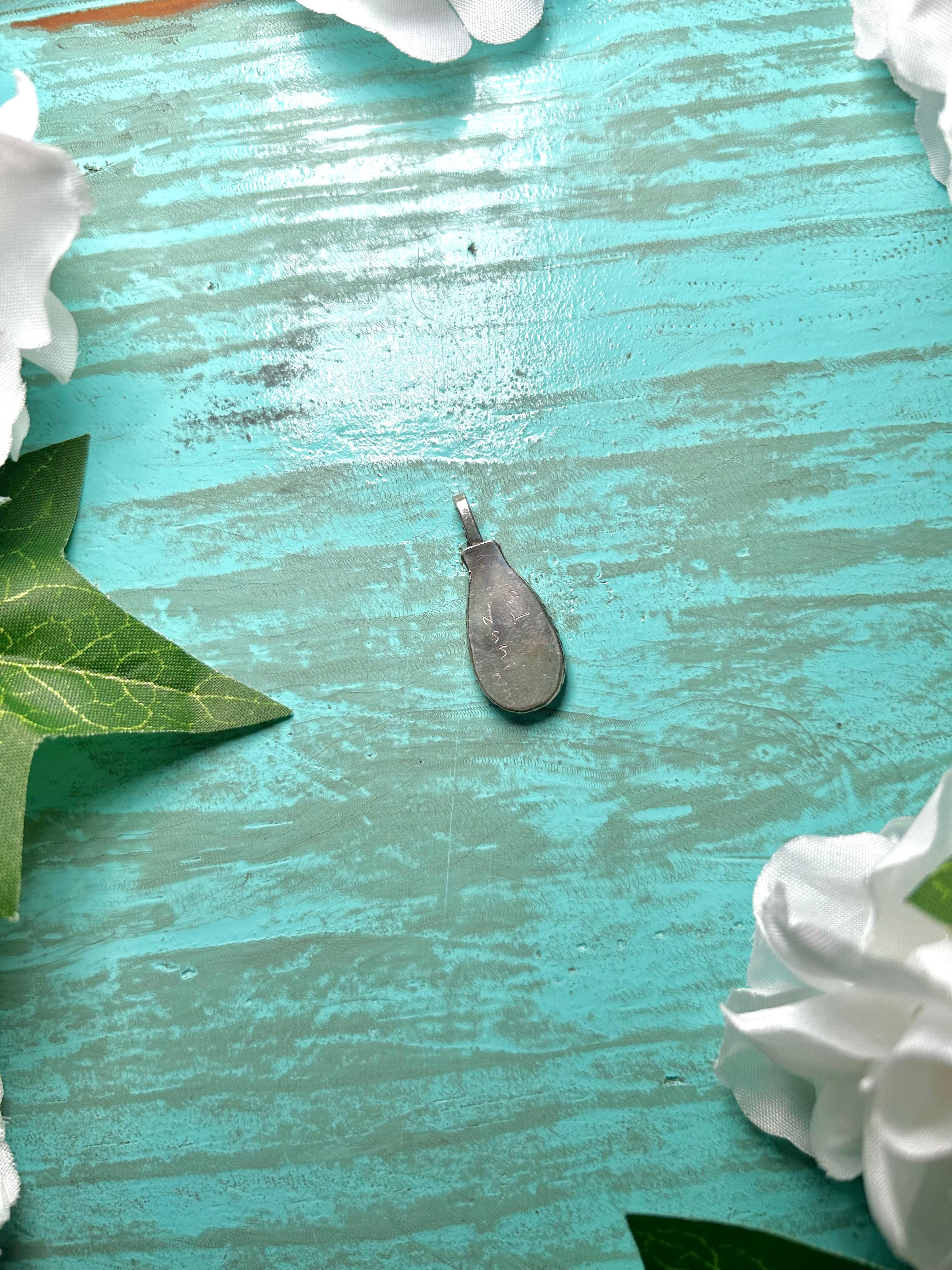 Zuni Made Kingman Turquoise & Sterling Silver Pendant. It measures 1 1/8 inches long and 1/2 of an inch wide. Pendant Only! Signed by the artist and stamped sterling silver.
