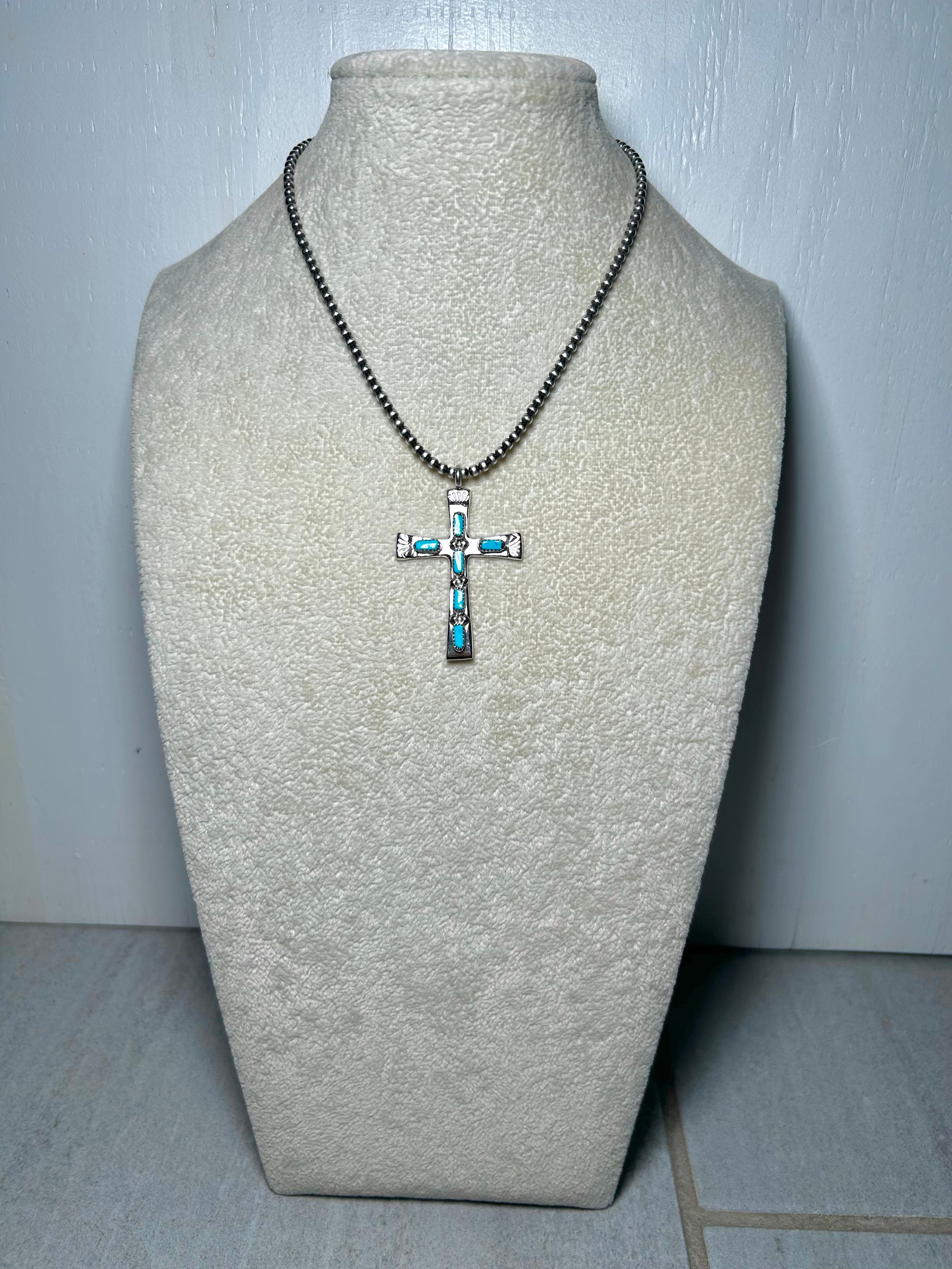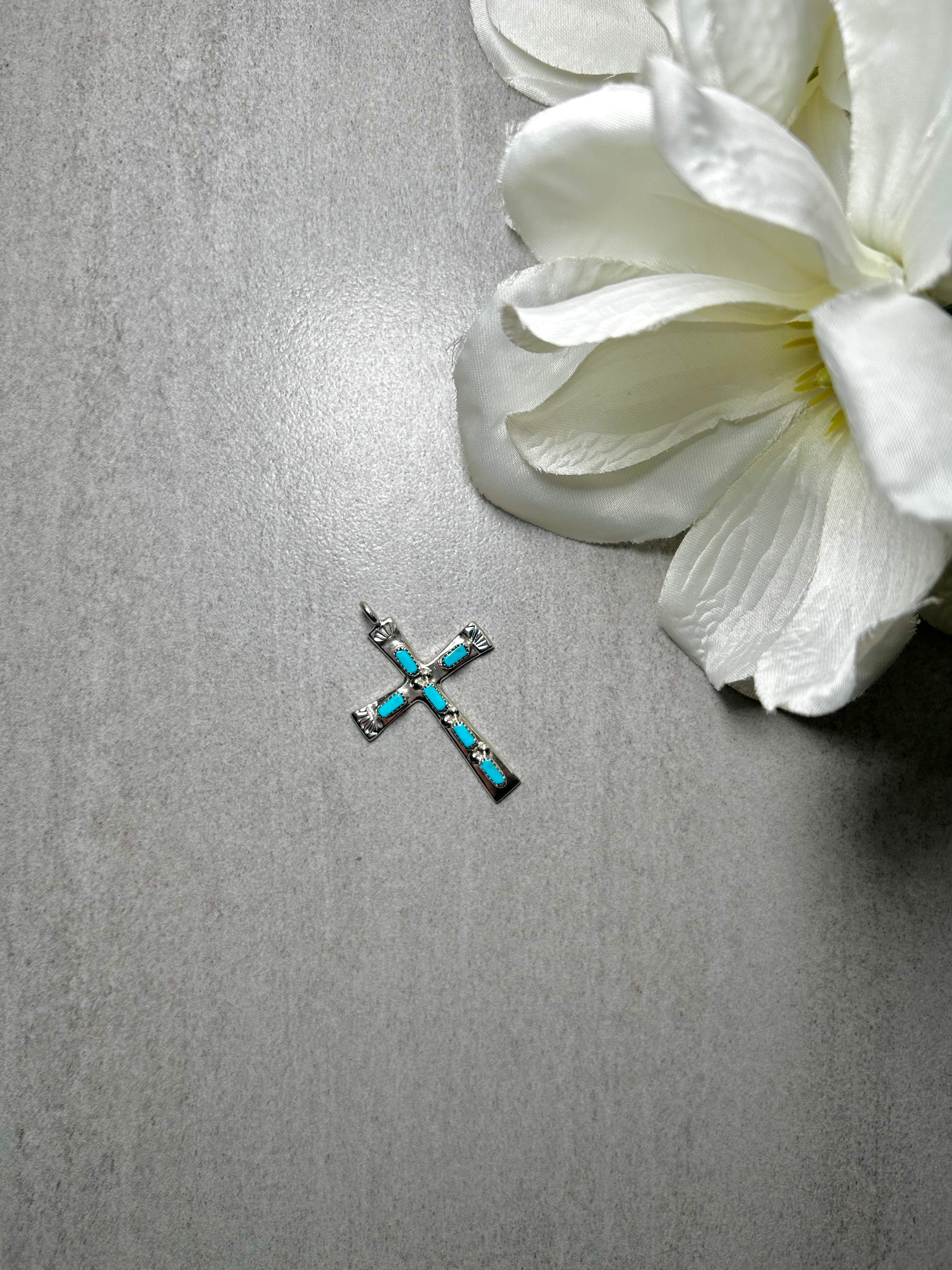Zuni Made Kingman Turquoise & Sterling Silver Cluster Pendant. It measures 2 1/8 inches long and 1 3/8 inches wide. Pendant Only. Signed by the artist and stamped sterling silver.