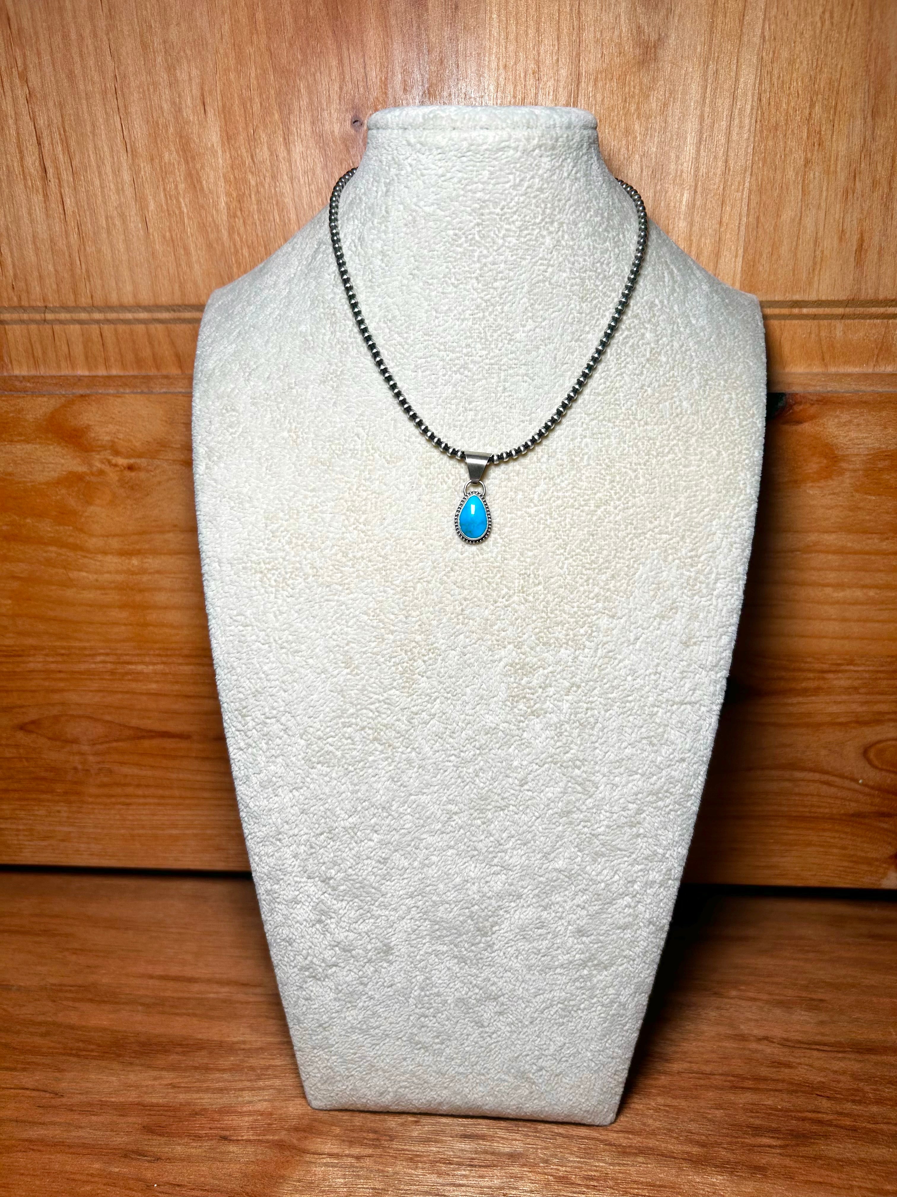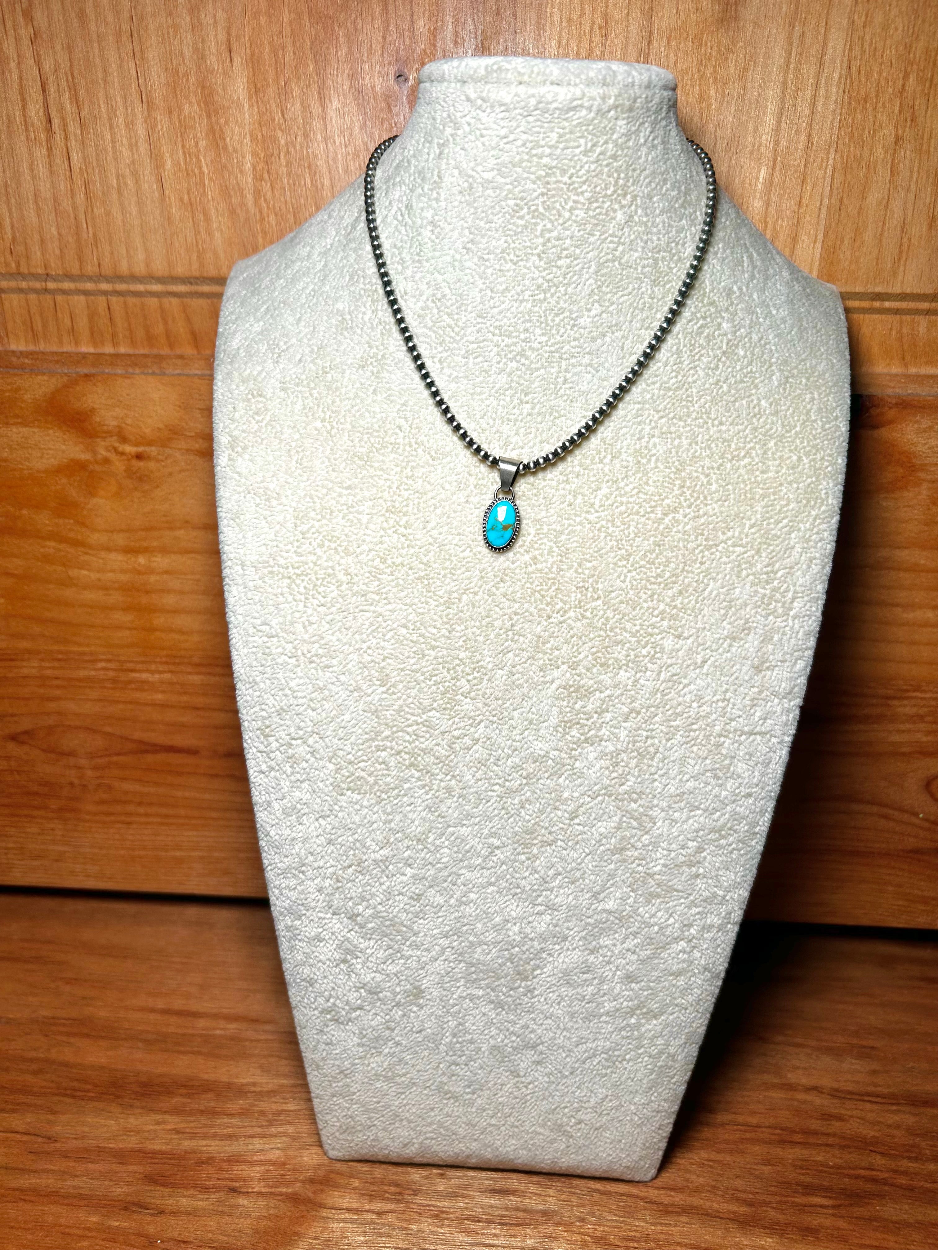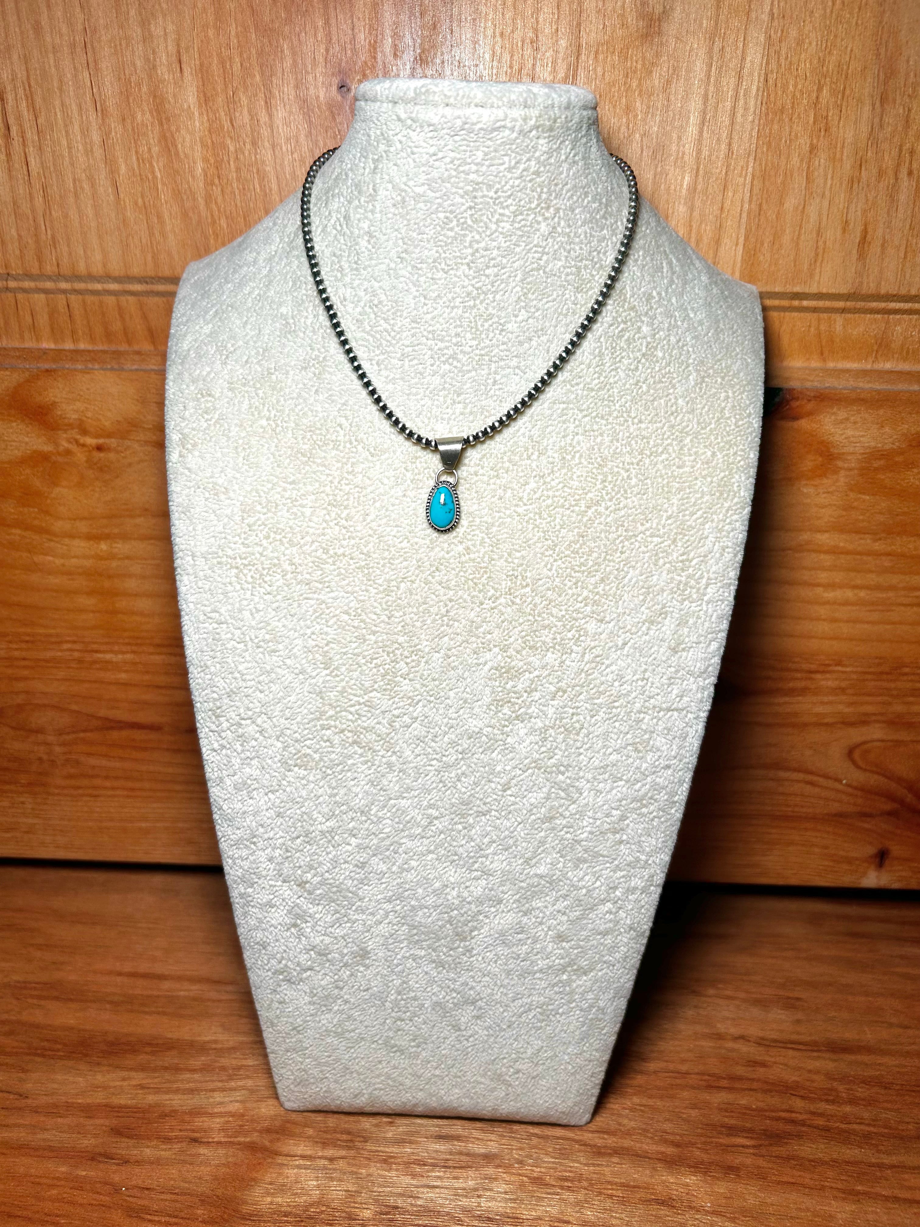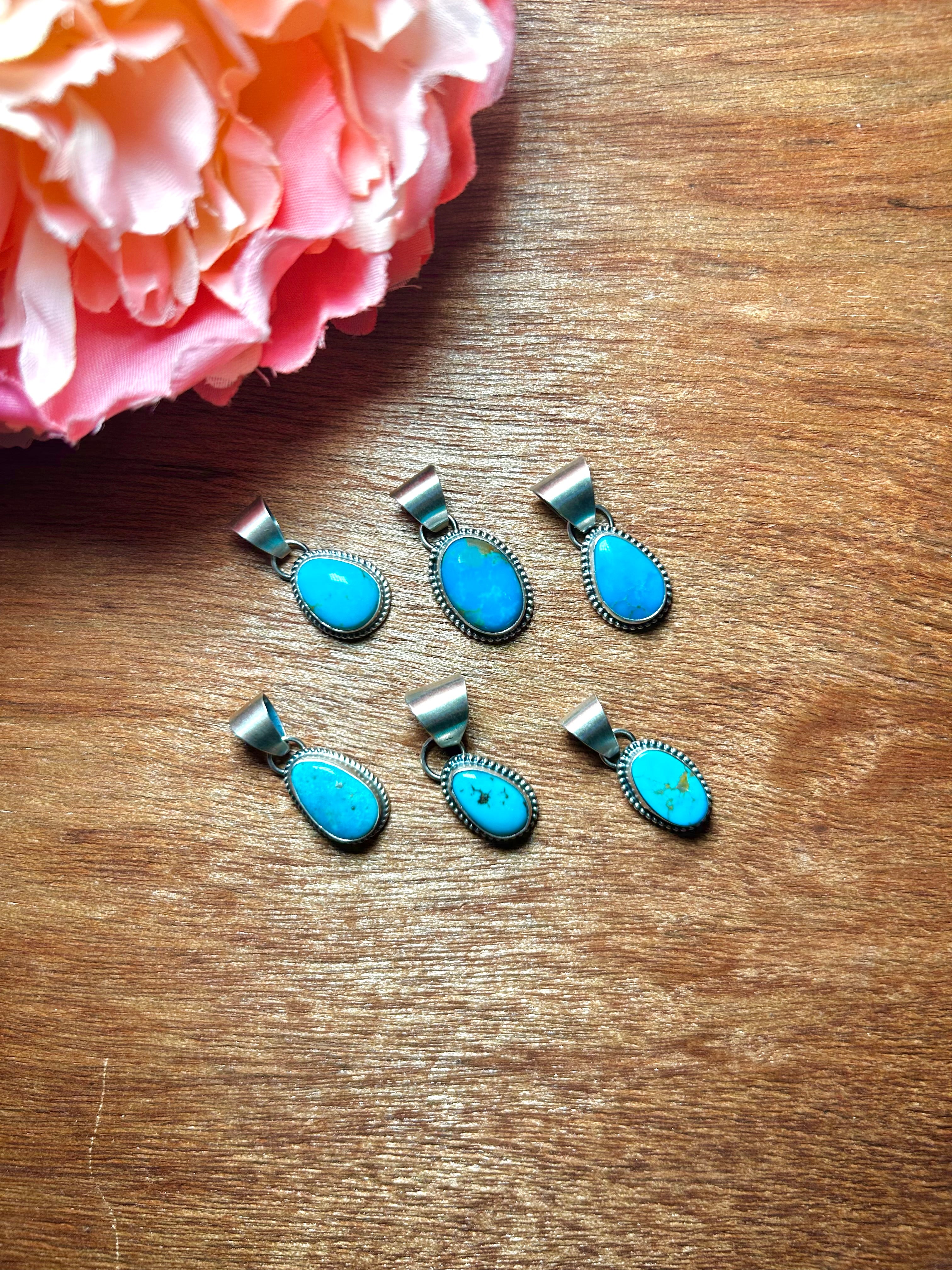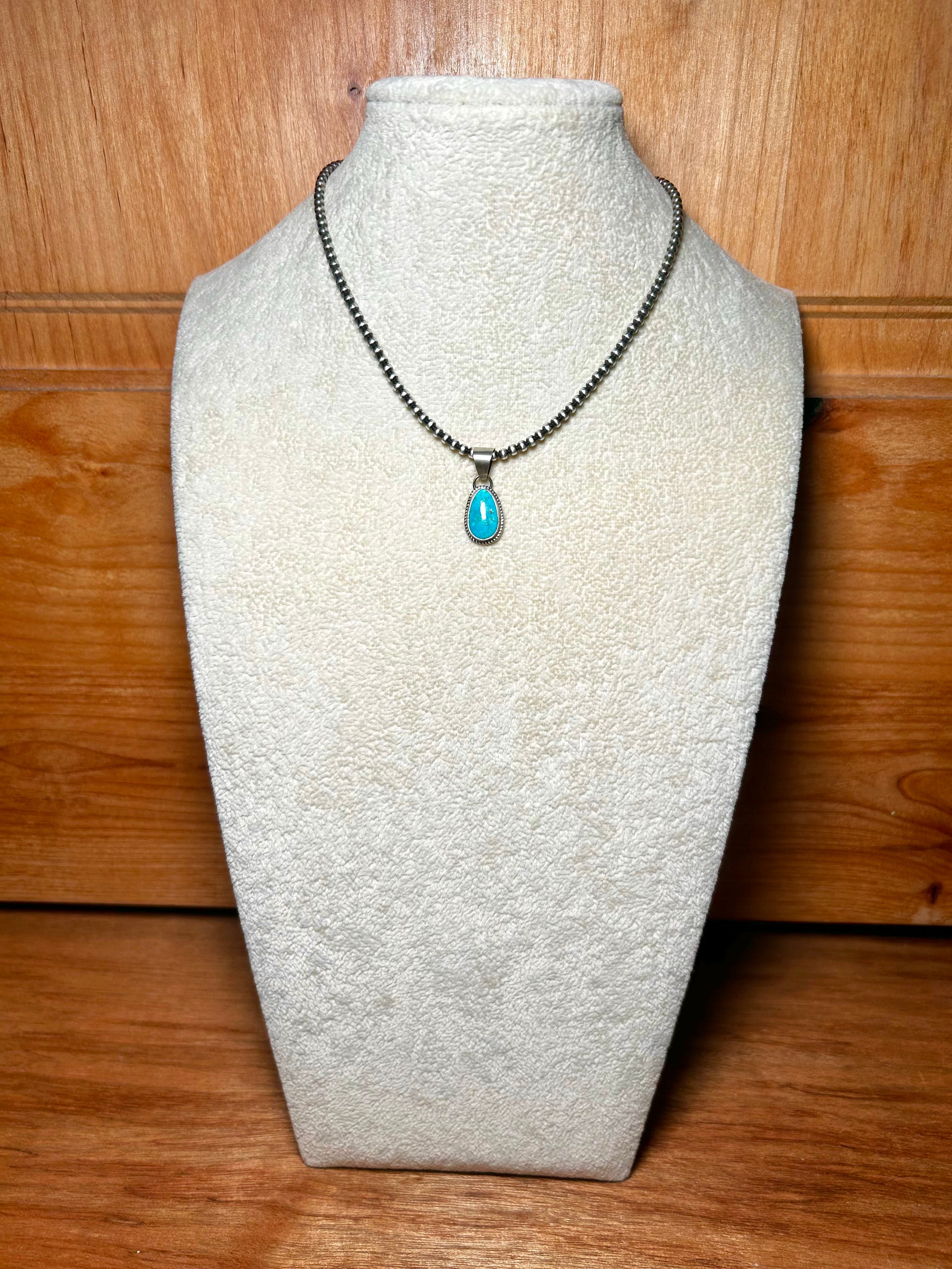 Navajo Made Kingman Turquoise & Sterling Silver Pendant. It measures 1 inch long and 1/2 of an inch wide. Pendant Only. Signed by the artist and stamped sterling silver.