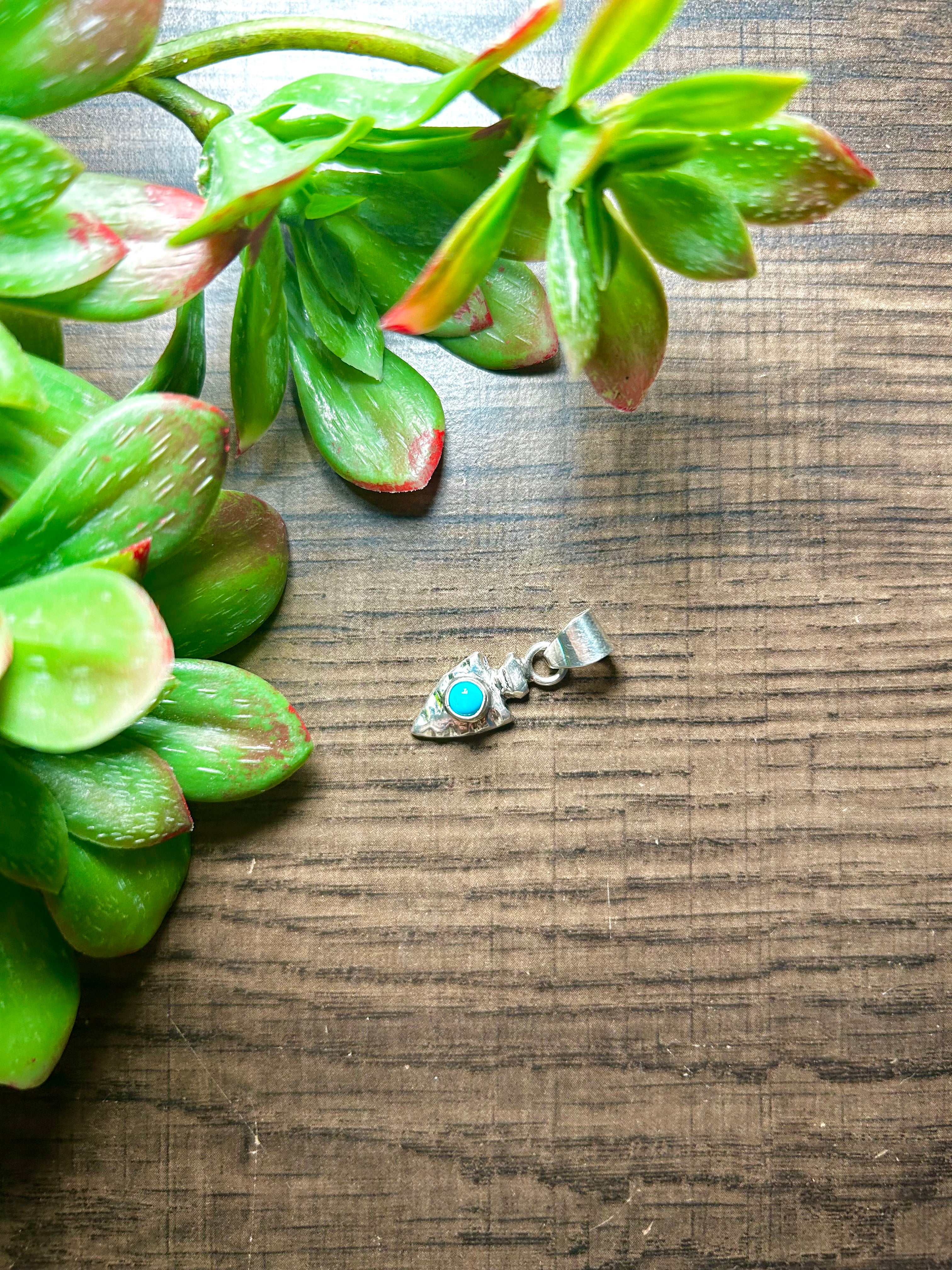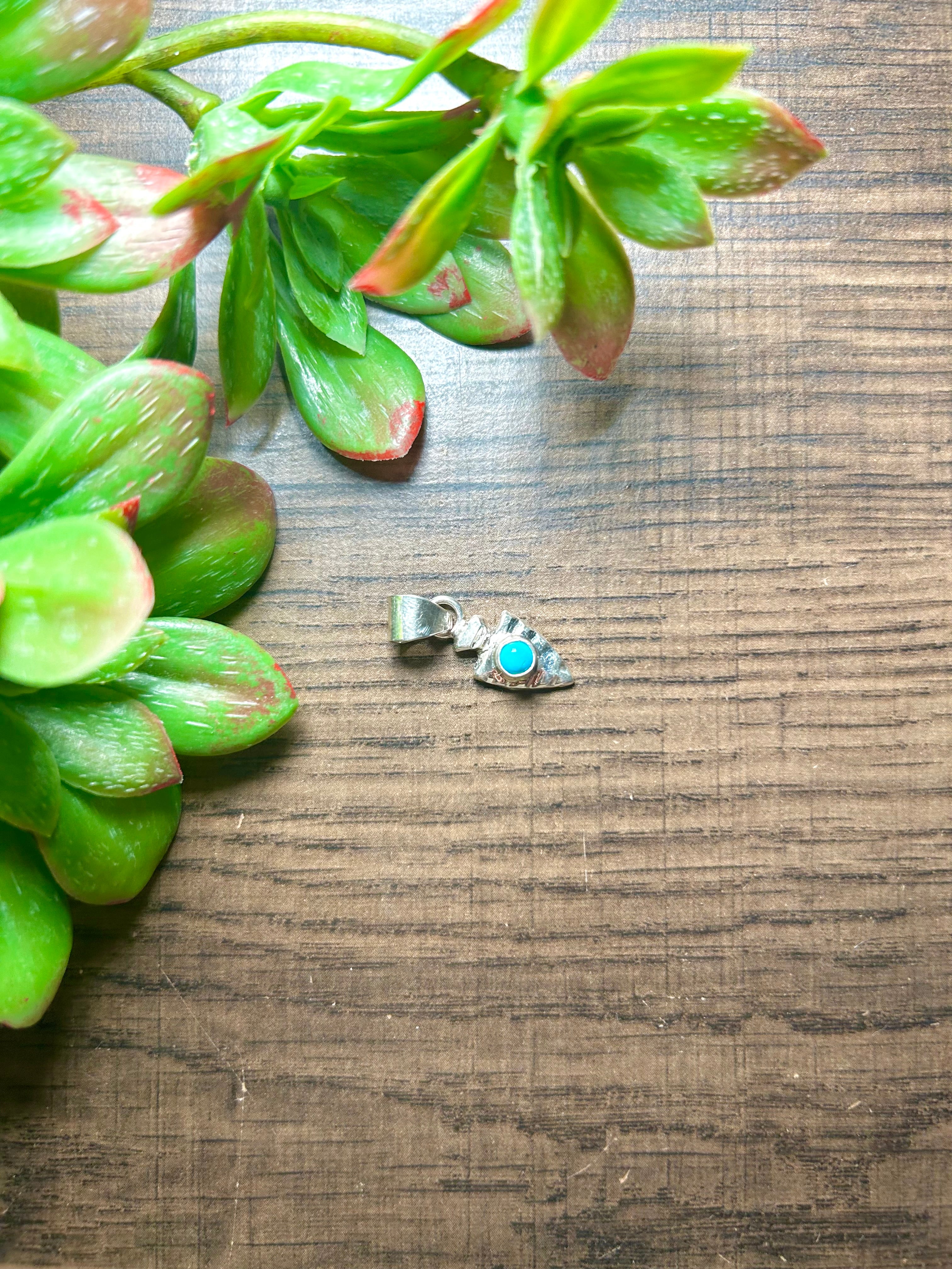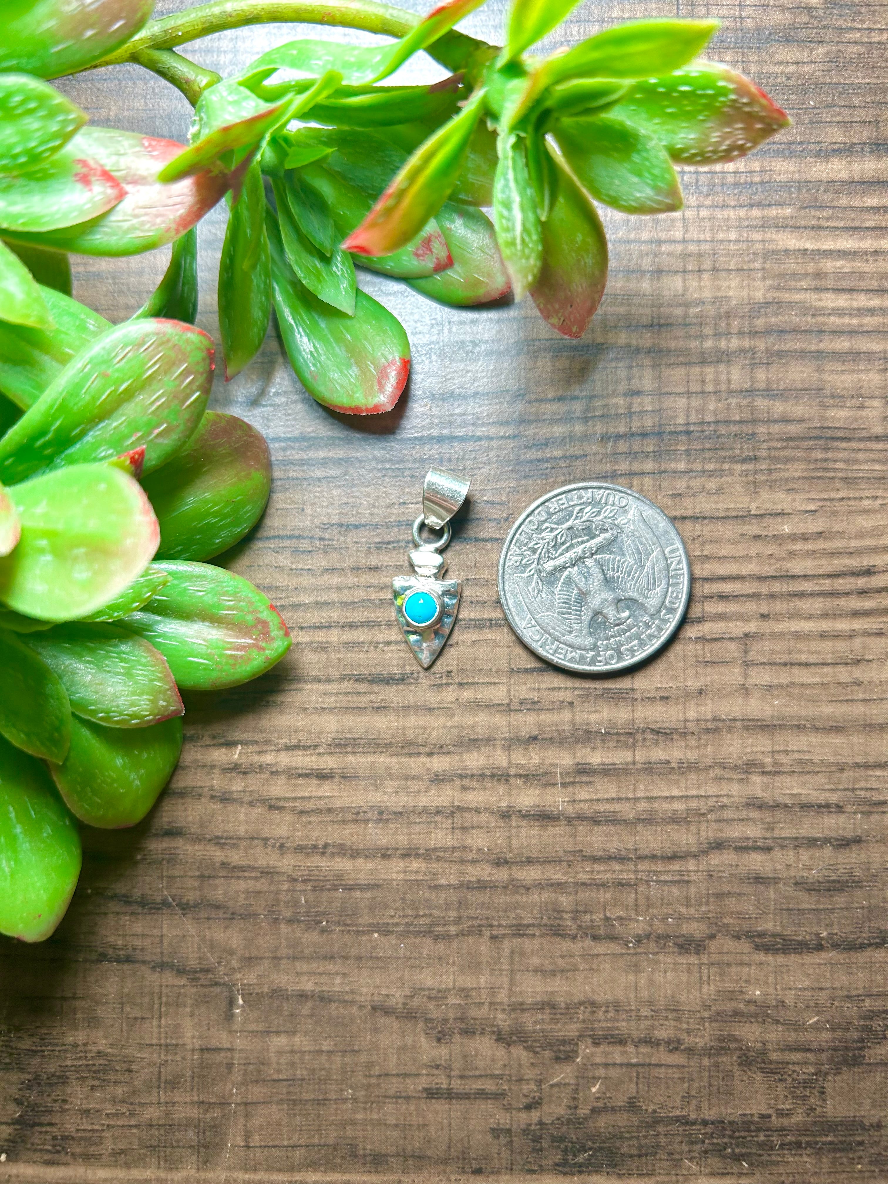 Navajo Made Kingman Turquoise & Sterling Silver Pendant. It measures 1 inch long and 3/8 of an inch wide. Pendant Only! Signed by the artist and stamped sterling silver.