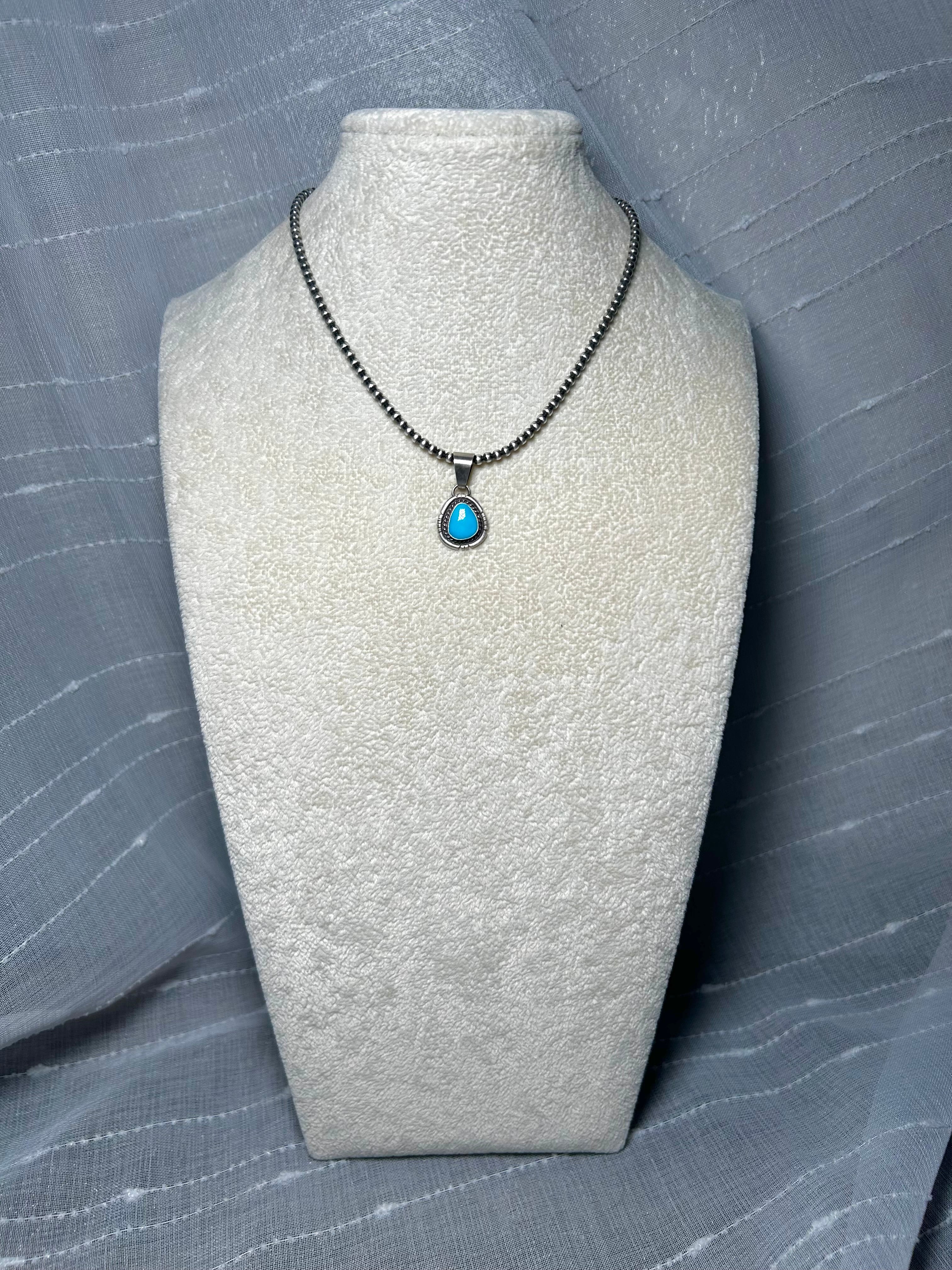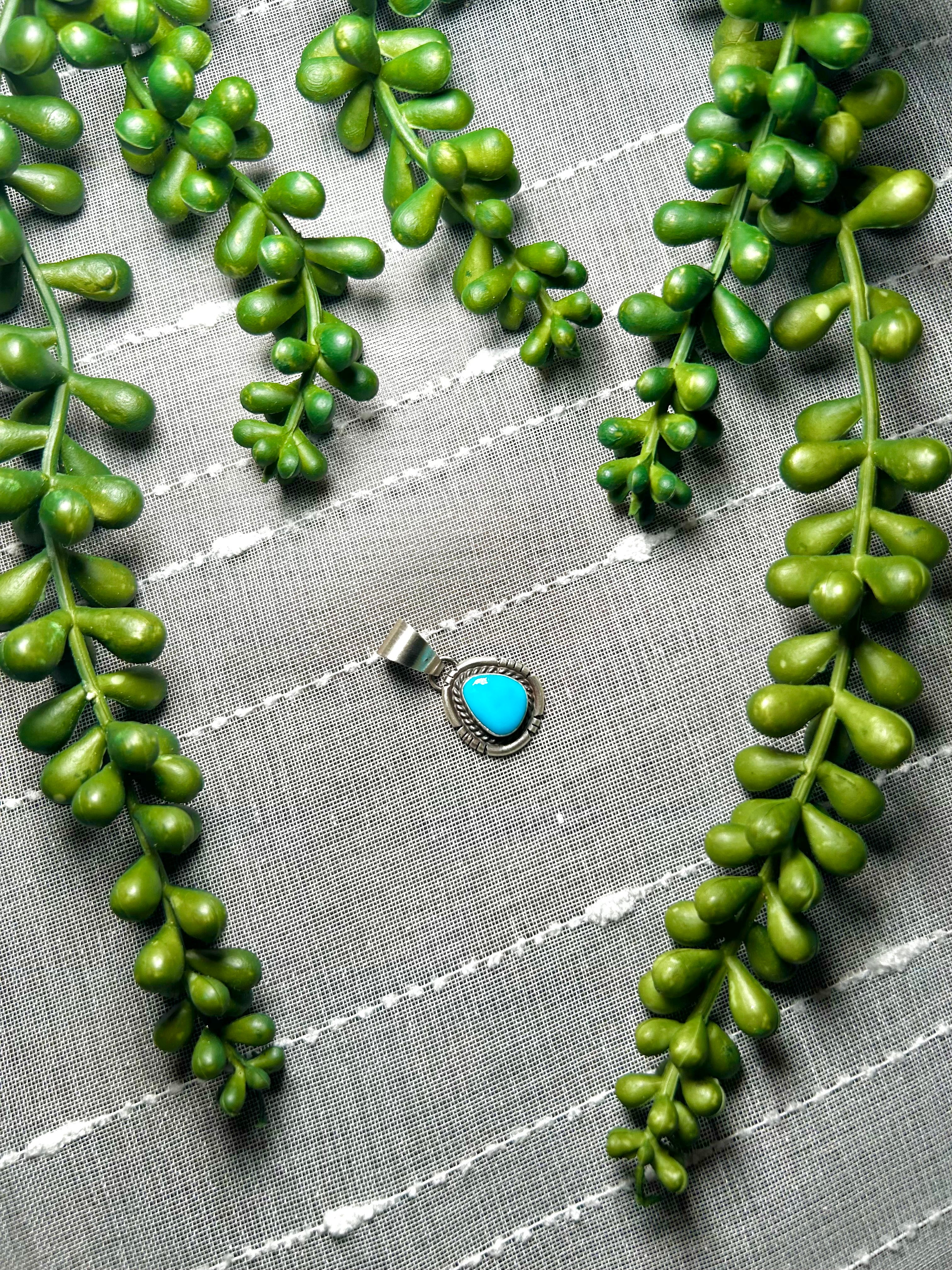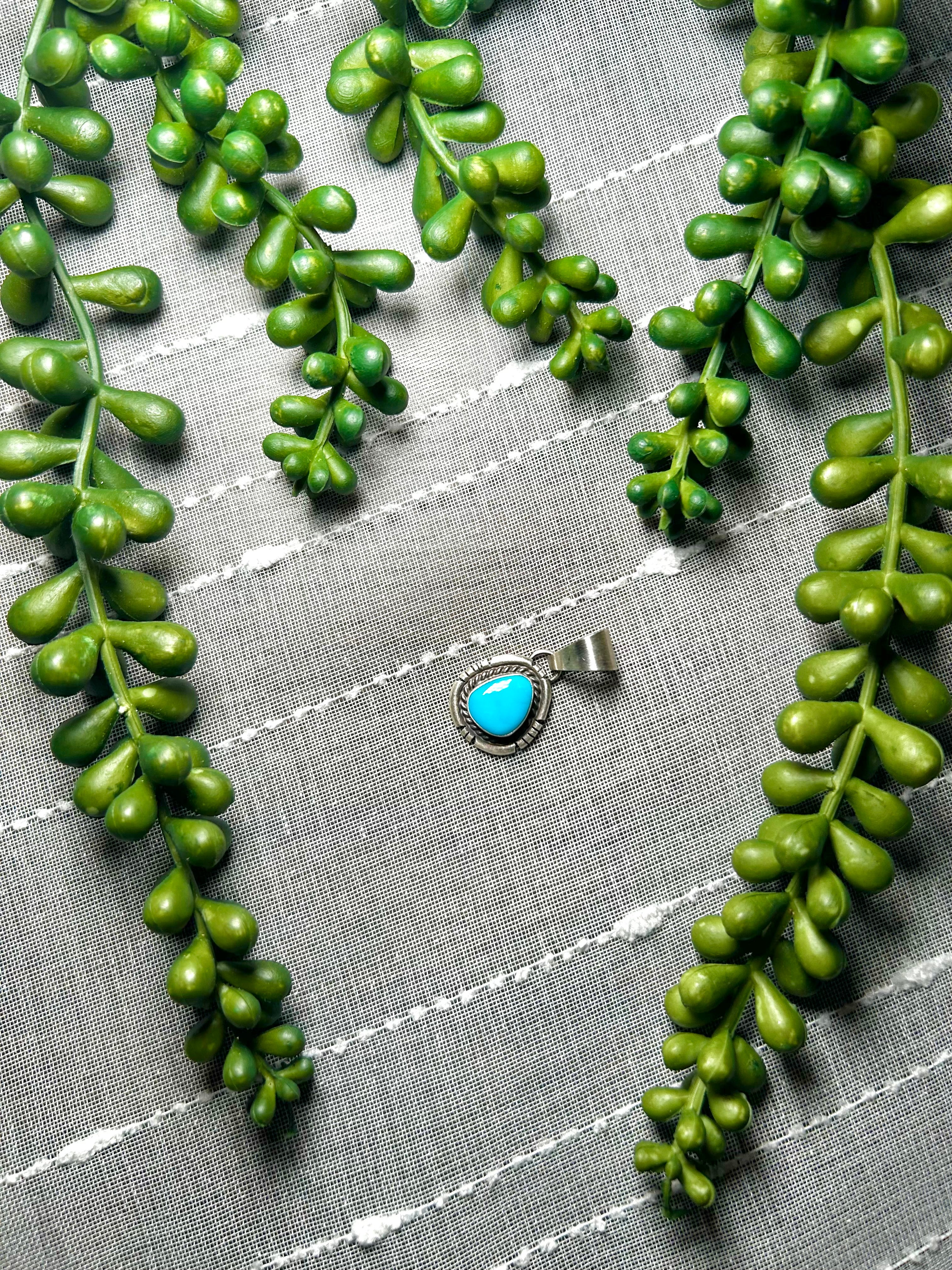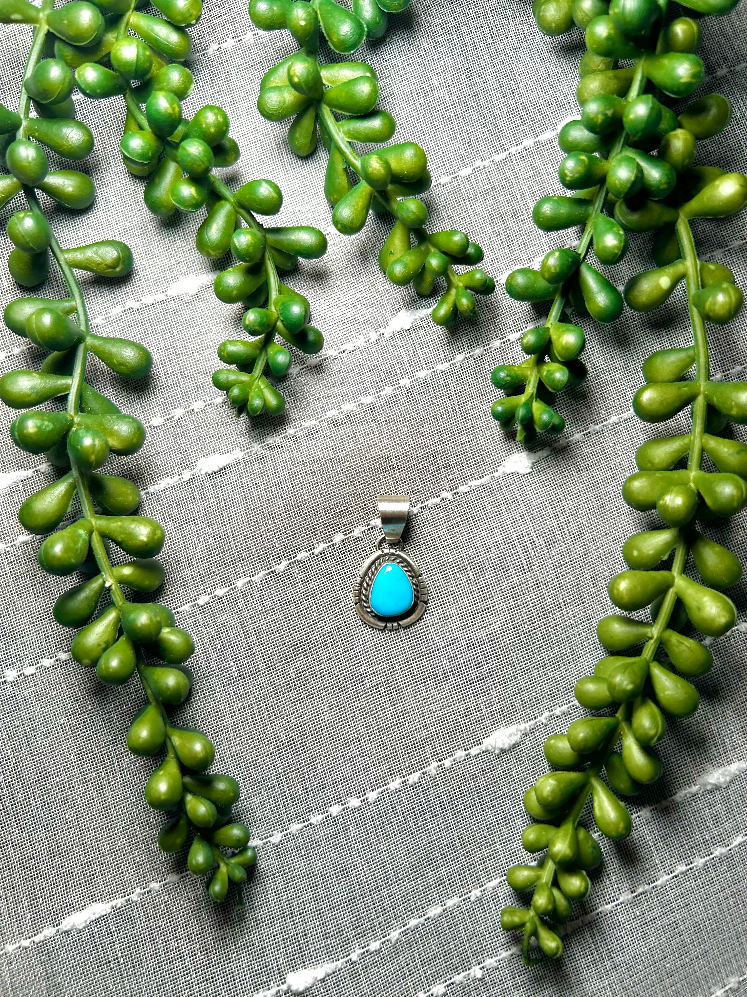 Navajo Made Kingman Turquoise & Sterling Silver Pendant. It measures 1 1/4 inches long and 5/8 of an inch wide. Pendant Only! Signed by the artist and stamped sterling silver.
