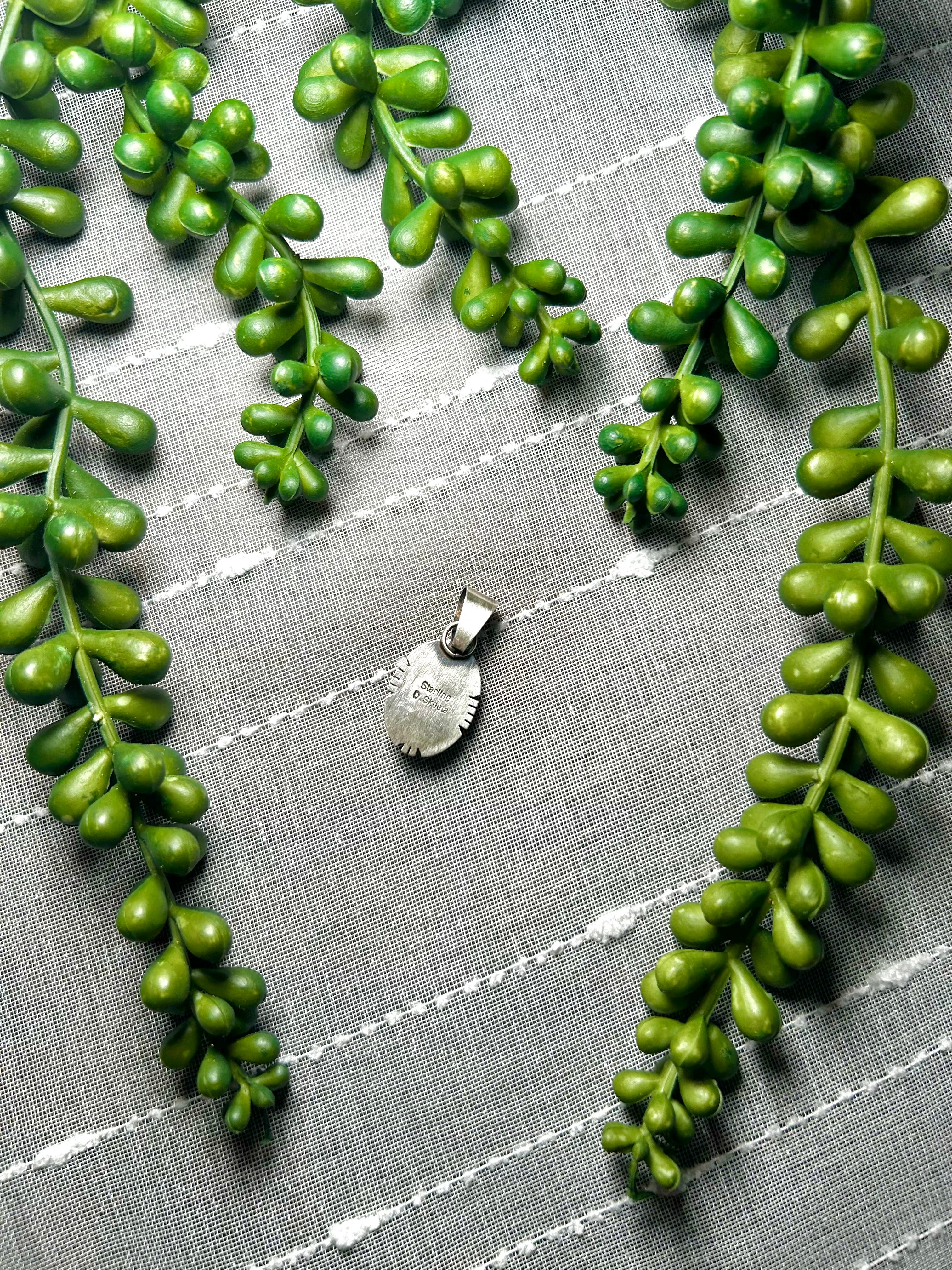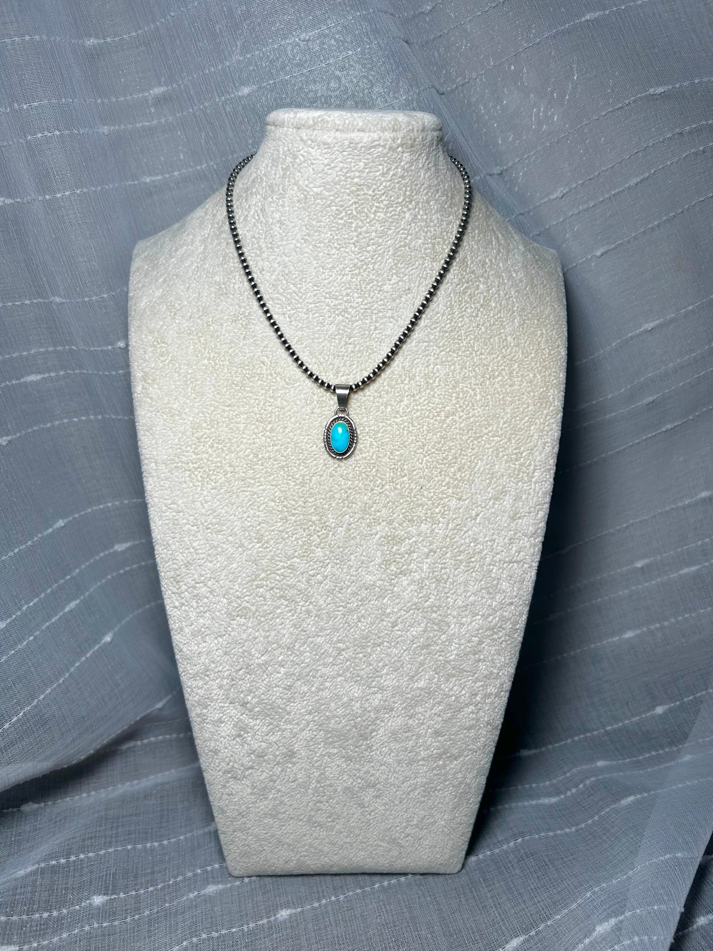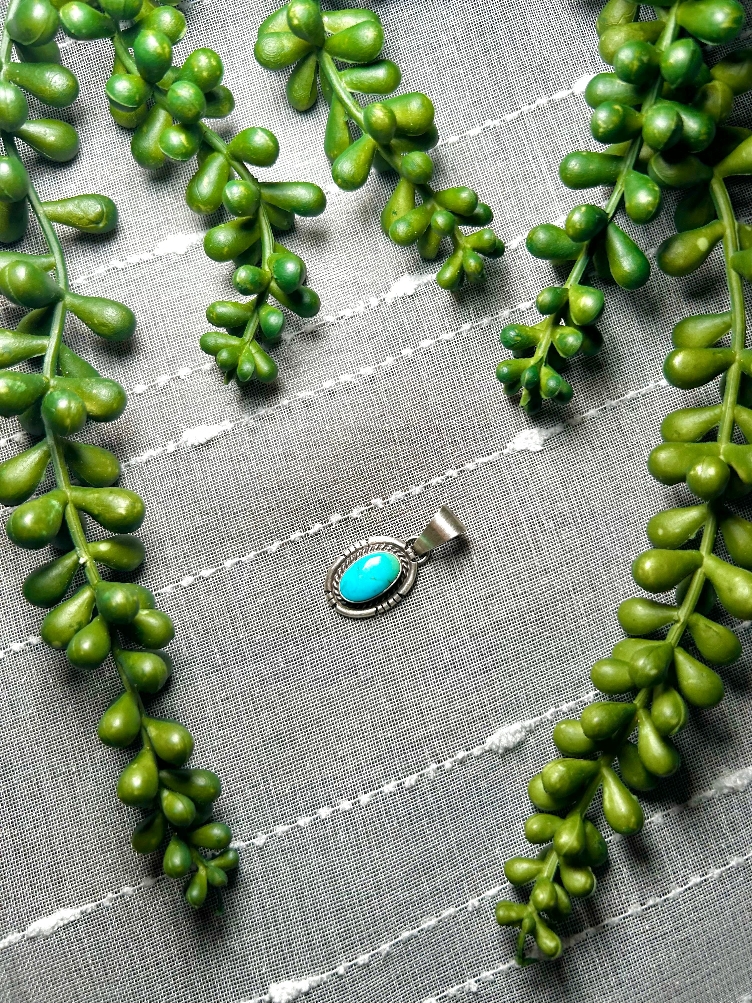 Navajo Made Kingman Turquoise & Sterling Silver Pendant. It measures 1 1/4 inches long and 5/8 of an inch wide. Pendant Only! Signed by the artist and stamped sterling silver. Stones will vary due to natural stones.