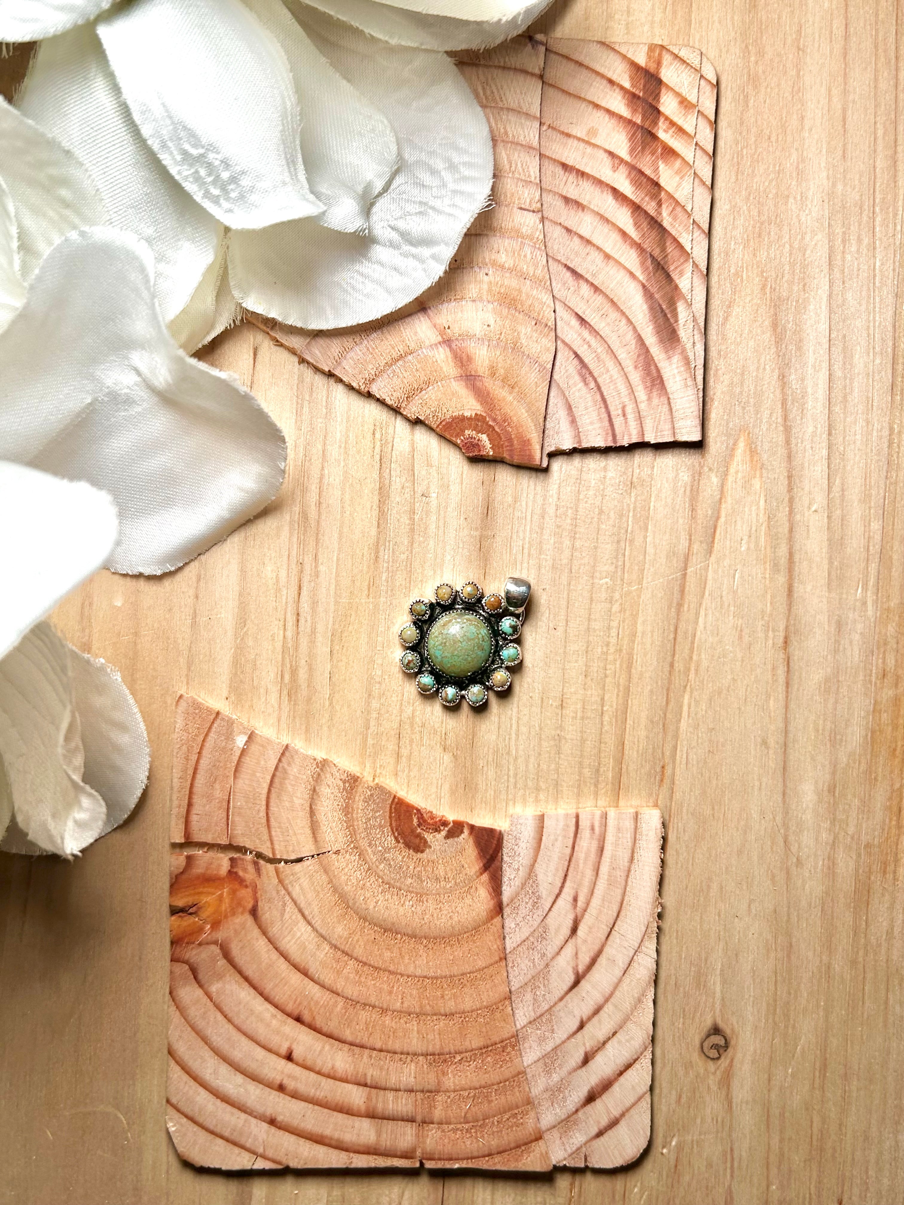 Navajo Made Kingman Turquoise & Sterling Silver Pendant. It measures 1 1/8 inches long and 7/8 of an inch wide. Pendant Only! Signed by the artist and stamped sterling silver.