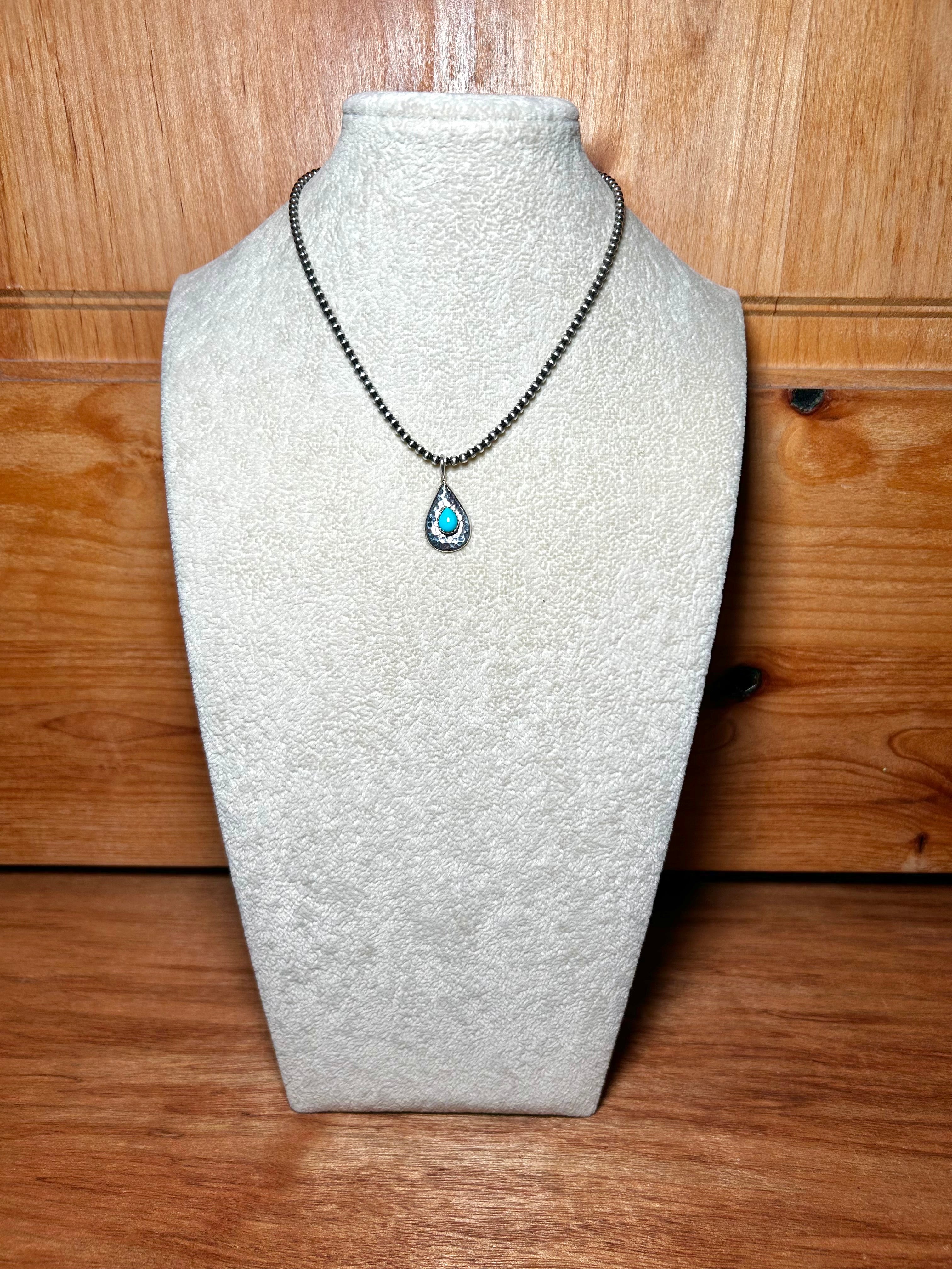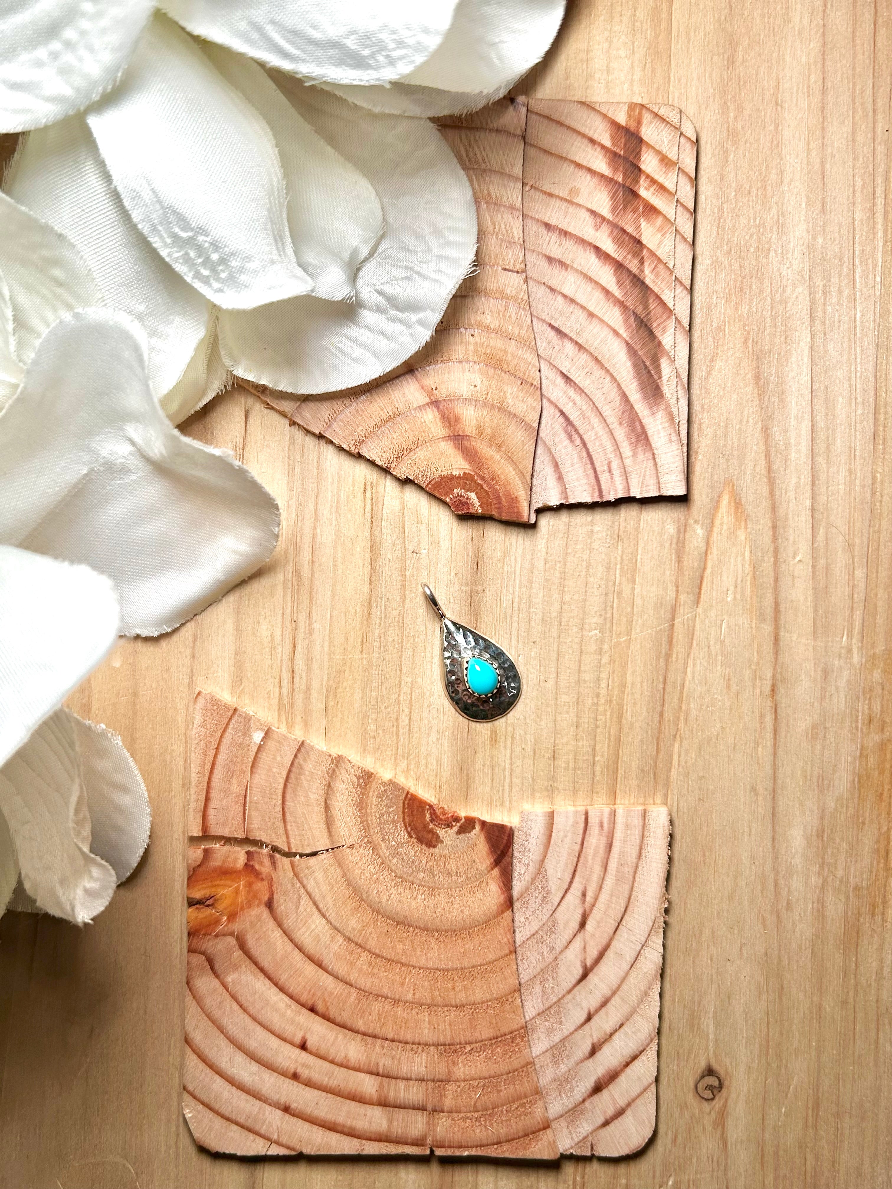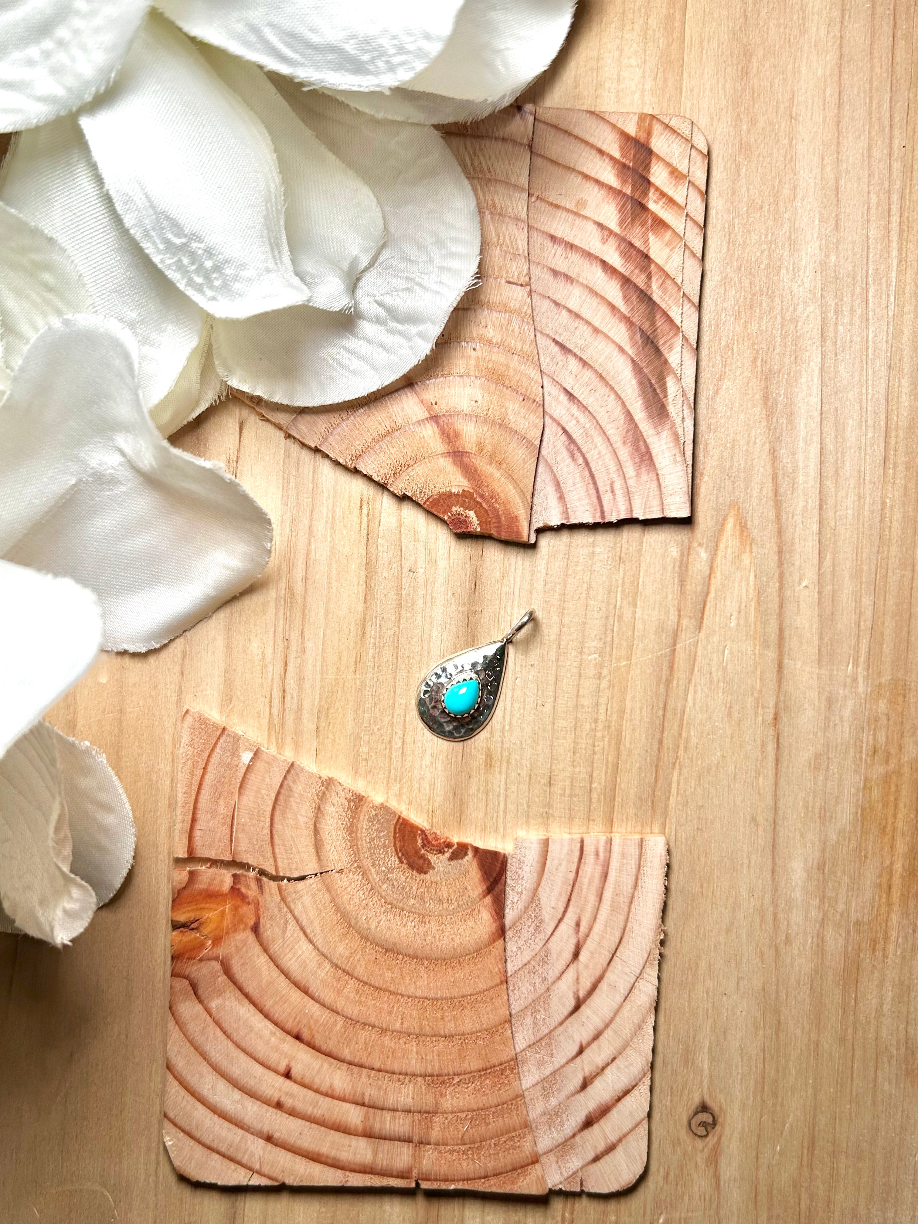 Navajo Made Kingman Turquoise & Sterling Silver Pendant. It measures 1 1/8 inches long and 5/8 of an inch wide. Pendant Only! Signed by the artist and stamped sterling silver.
