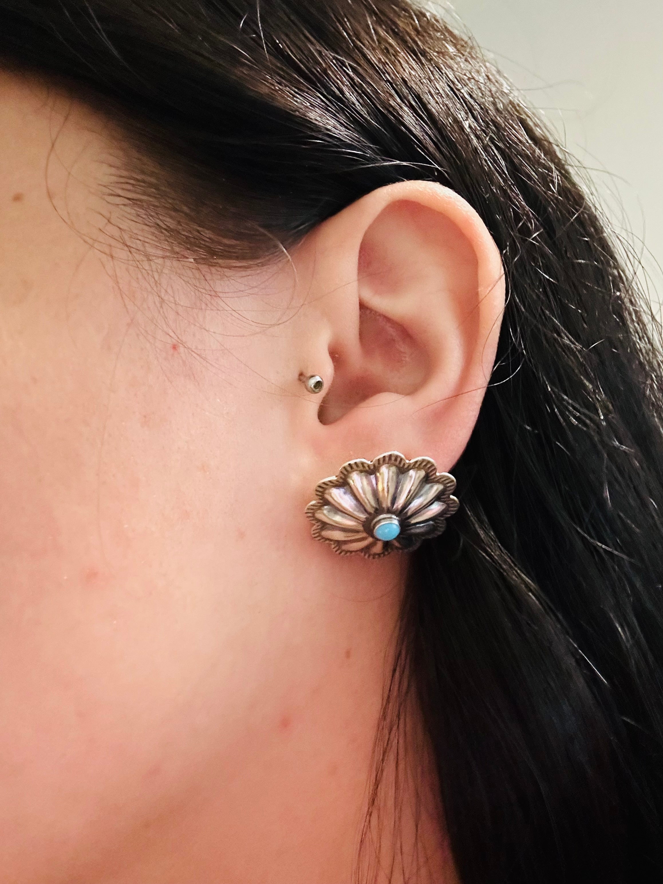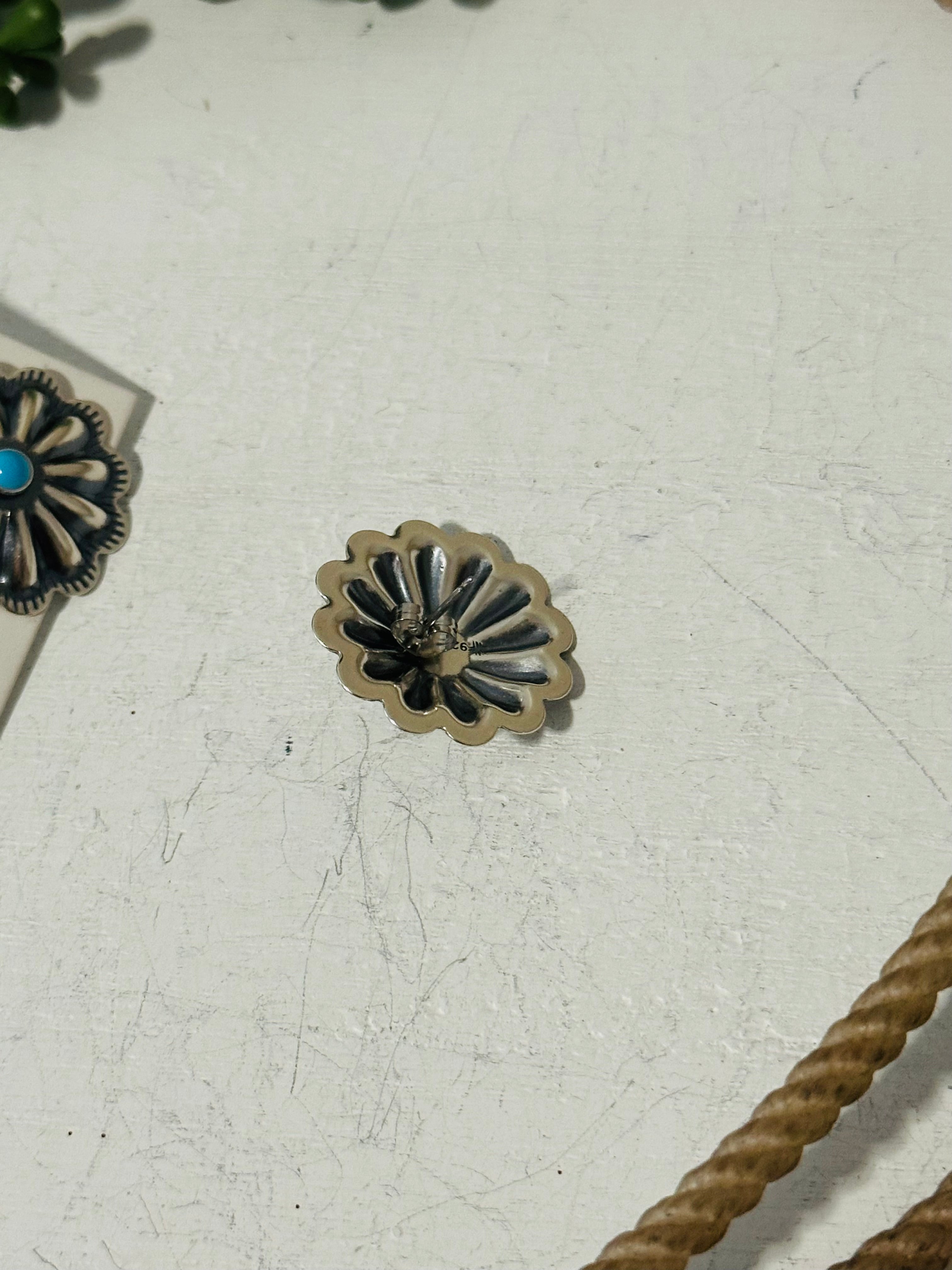 In love with these everyday earrings. Navajo Made Kingman Turquoise & Sterling Silver Post Concho Earrings. It measures 1 inch round. Stamped and signed.