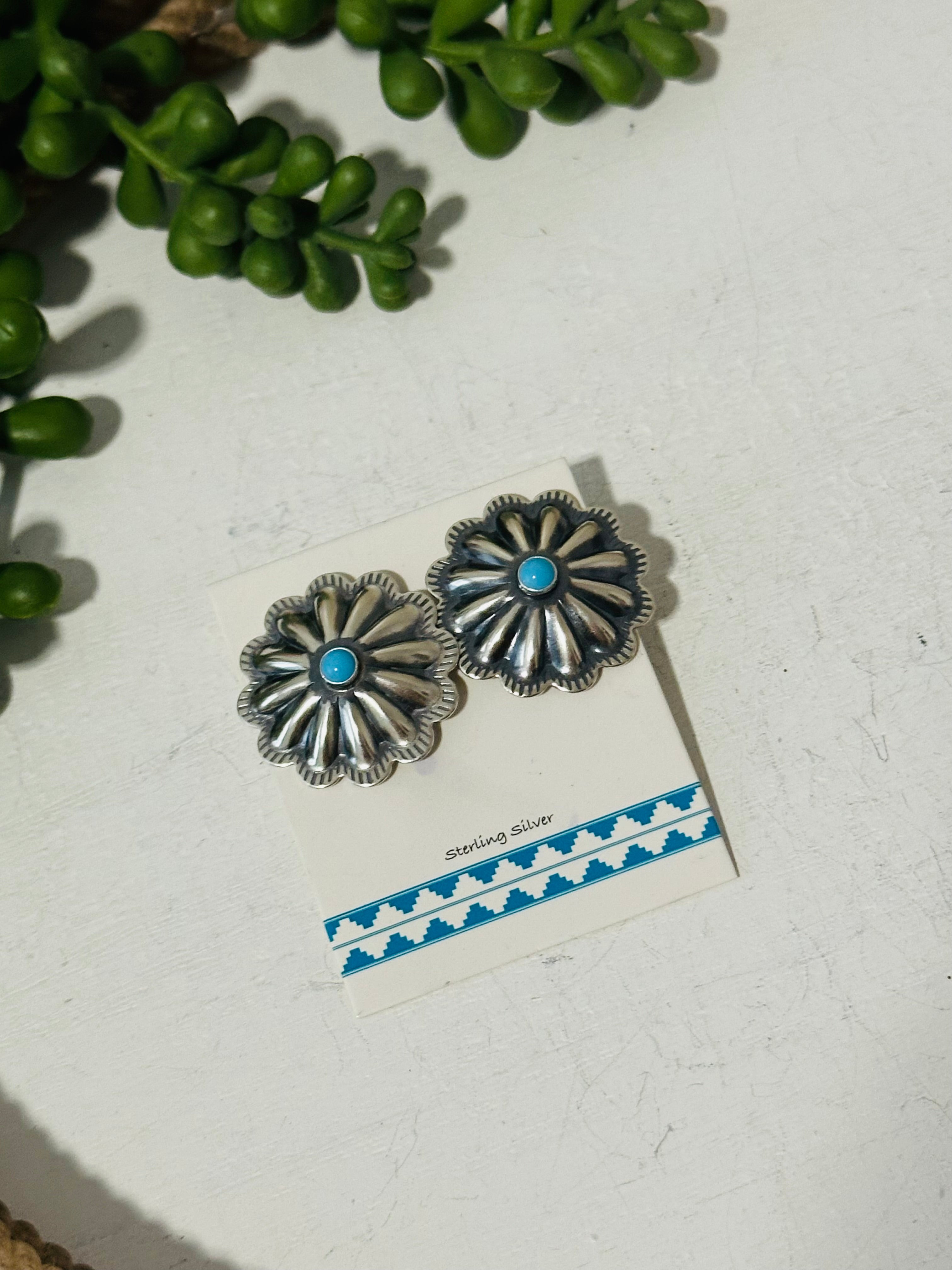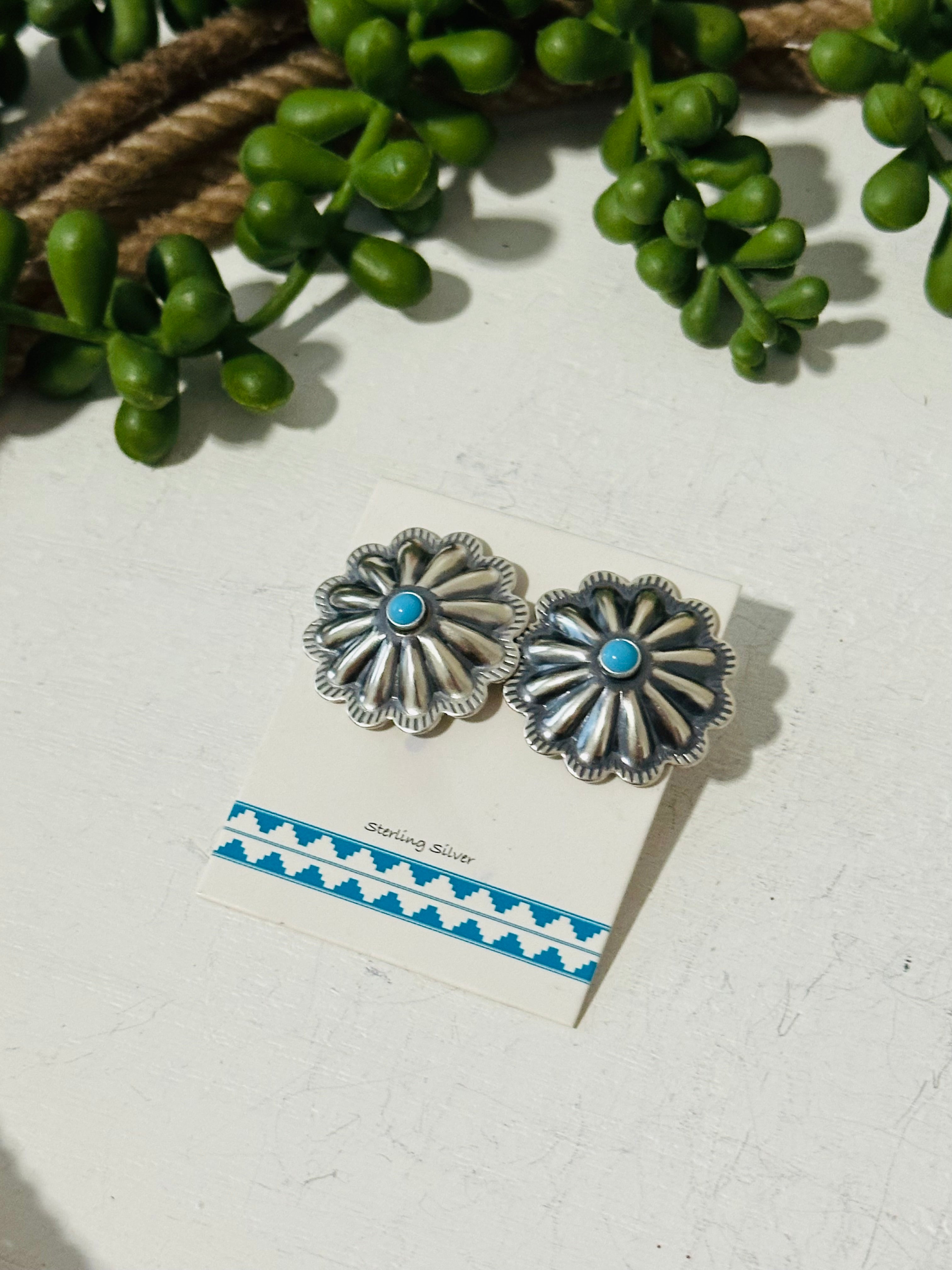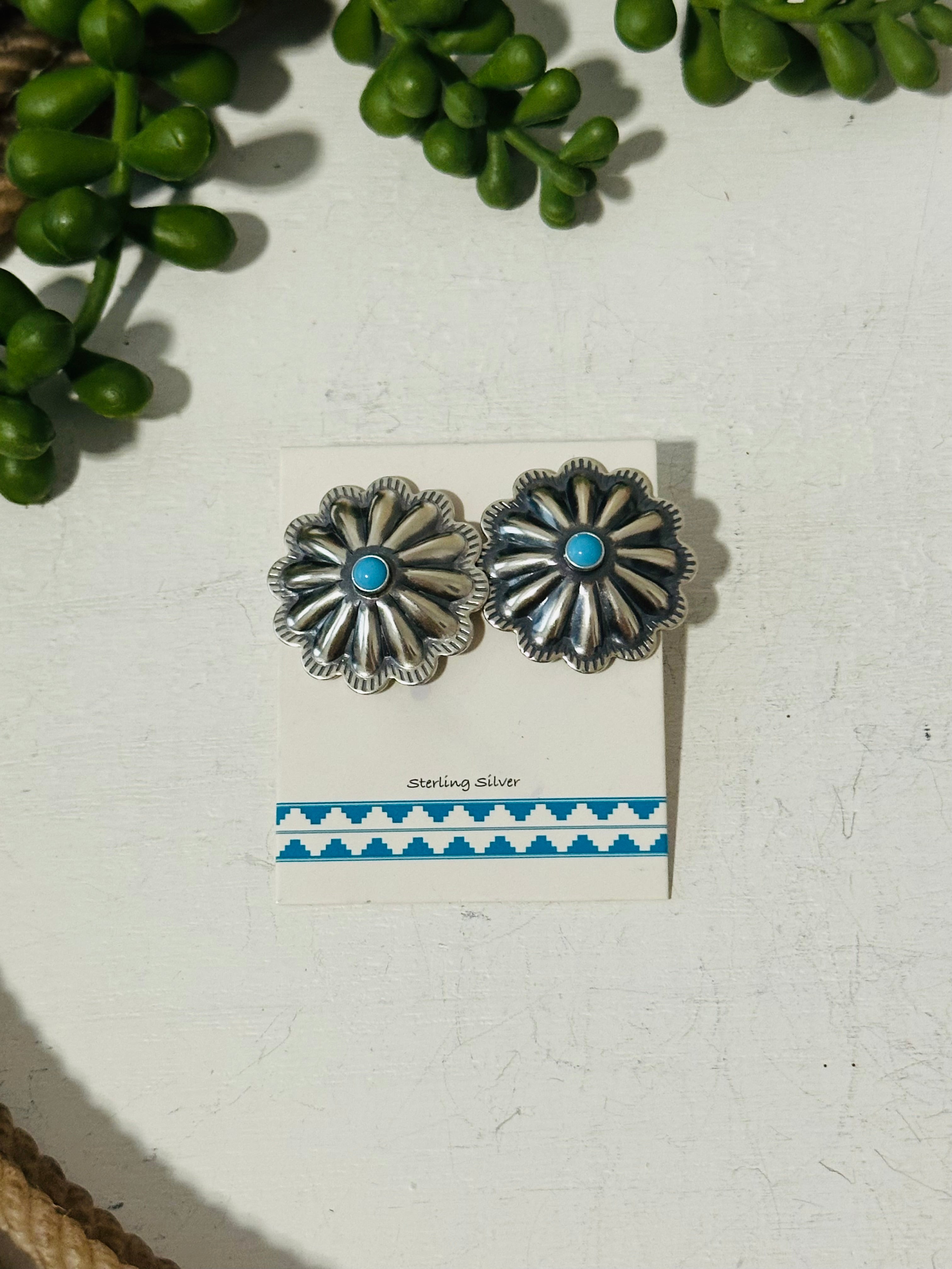 Navajo Made Kingman Turquoise & Sterling Silver Post Concho Earrings