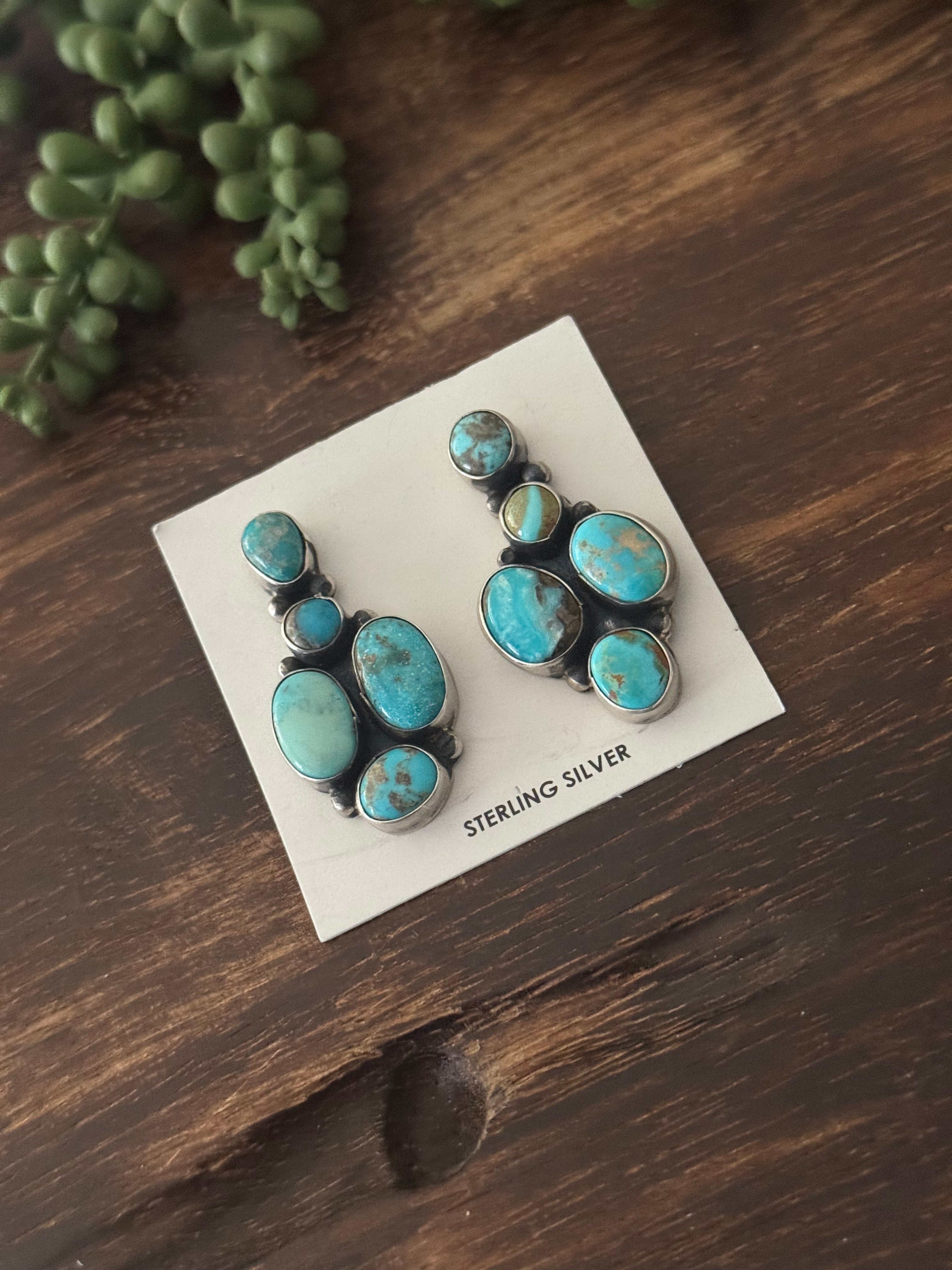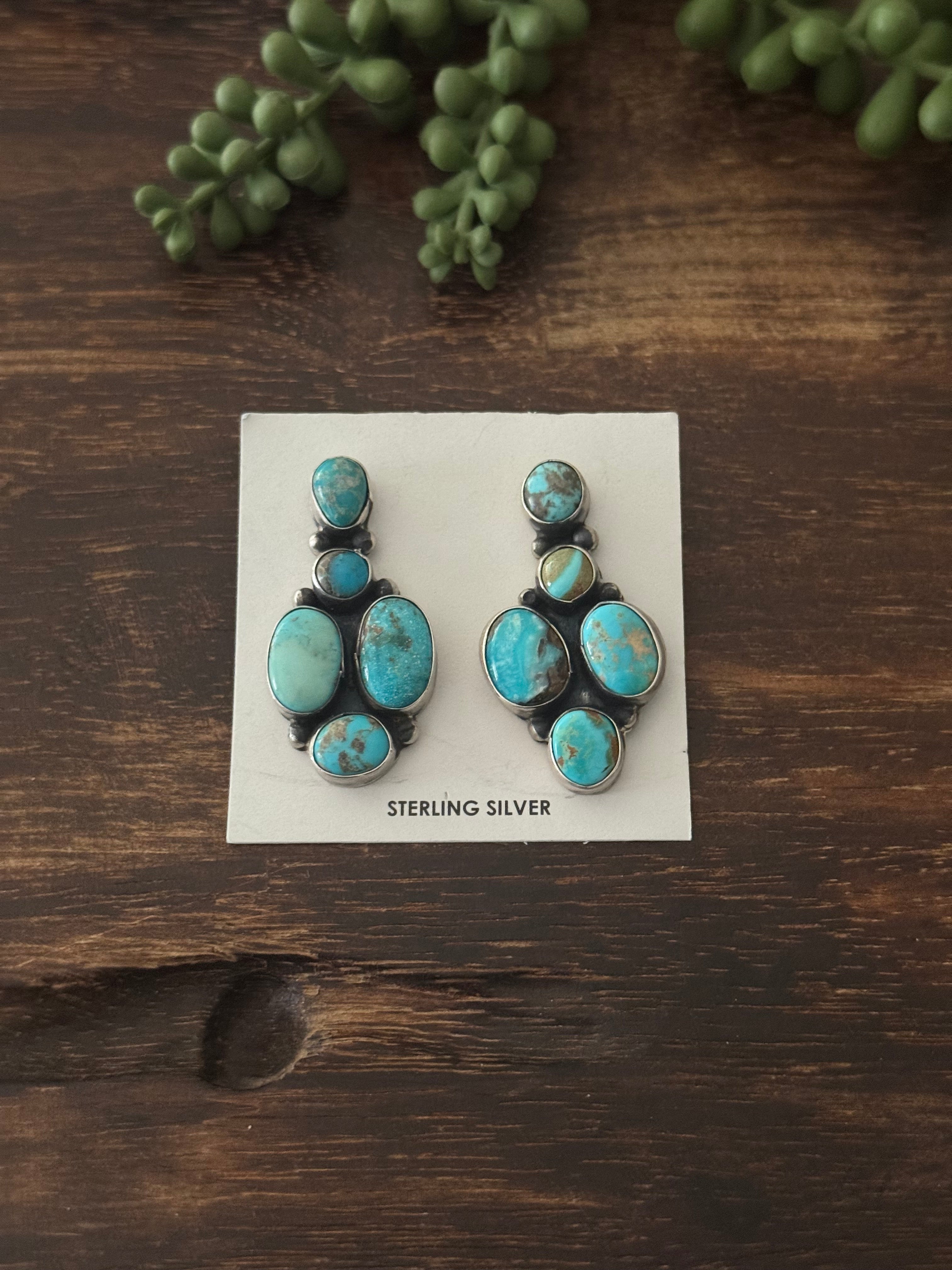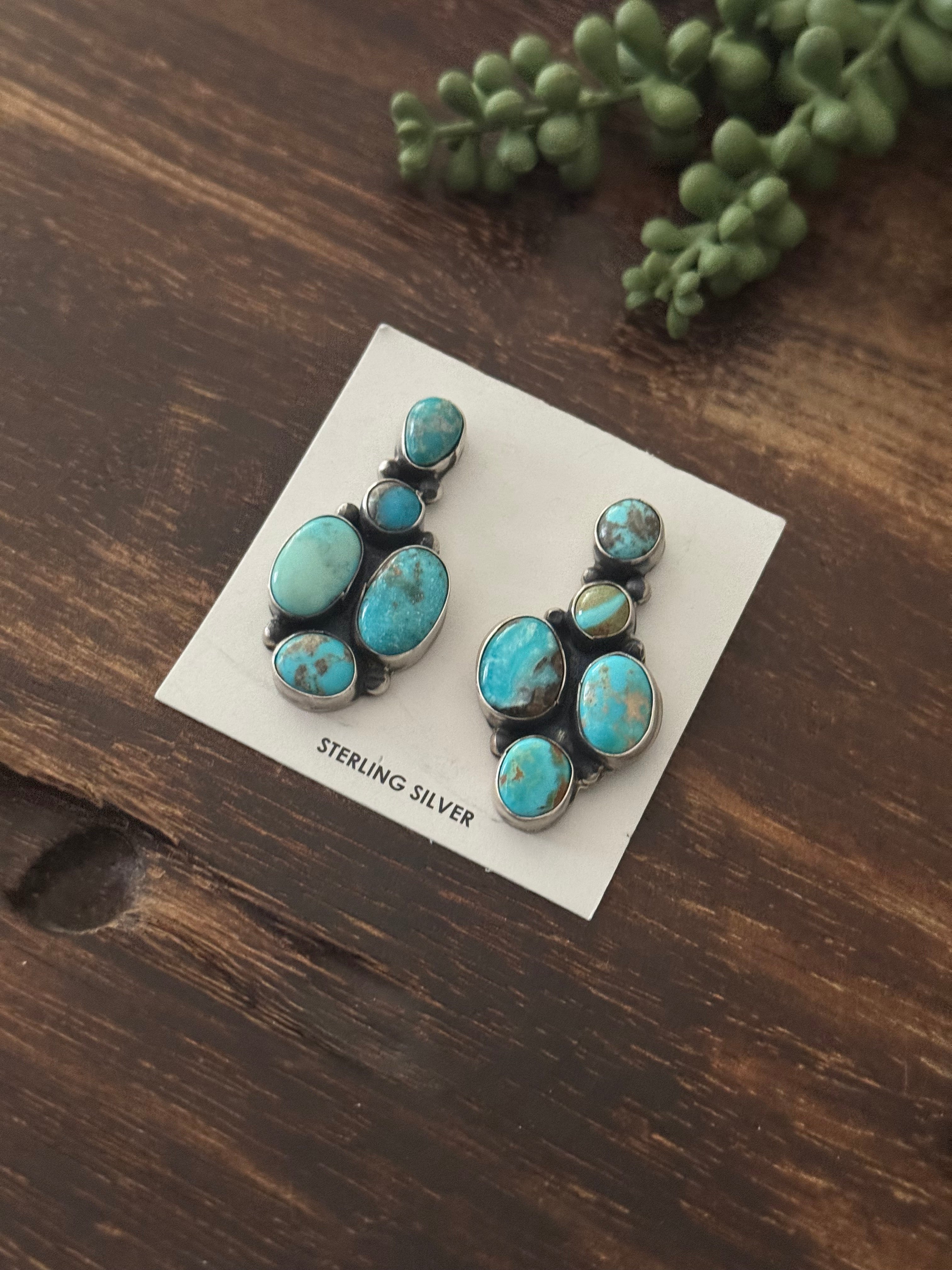 Navajo Made Kingman Turquoise & Sterling Silver Post Dangle Cluster Earrings