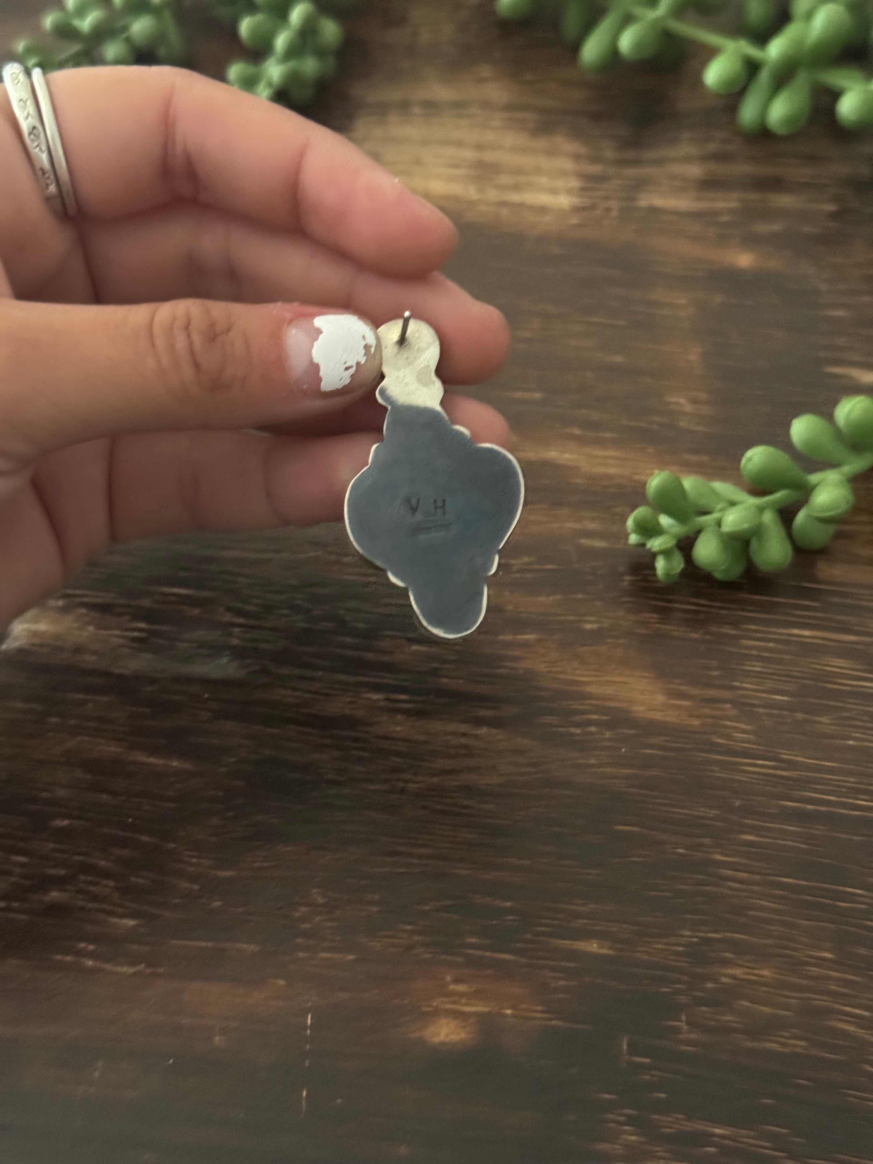 Beautiful dangle earrings. Navajo Made Kingman Turquoise & Sterling Silver Post Dangle Earrings. It measures 1 3/4 inches long and 1 inch wide. Signed and stamped